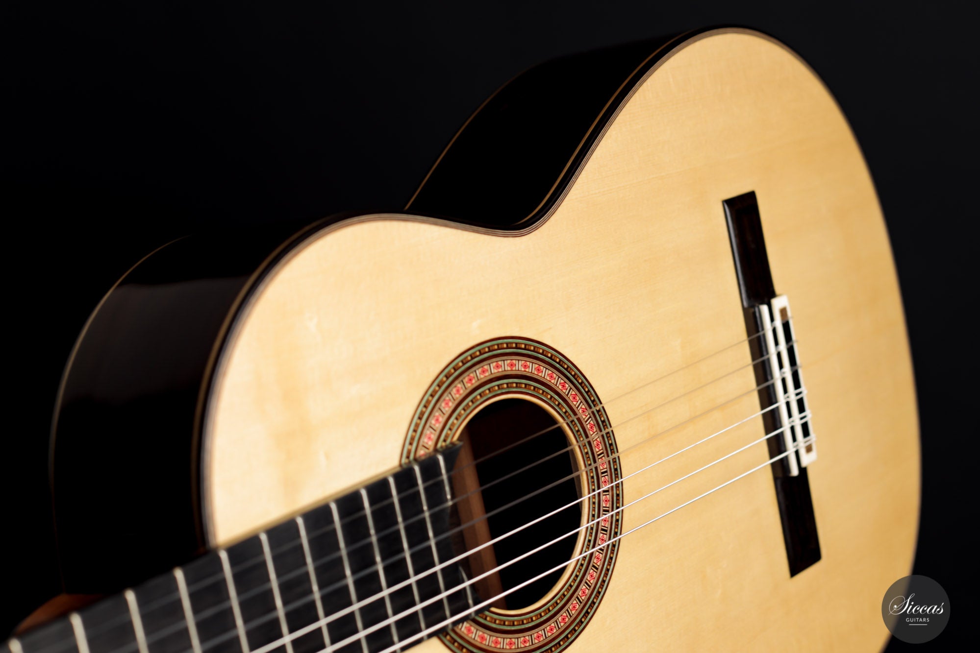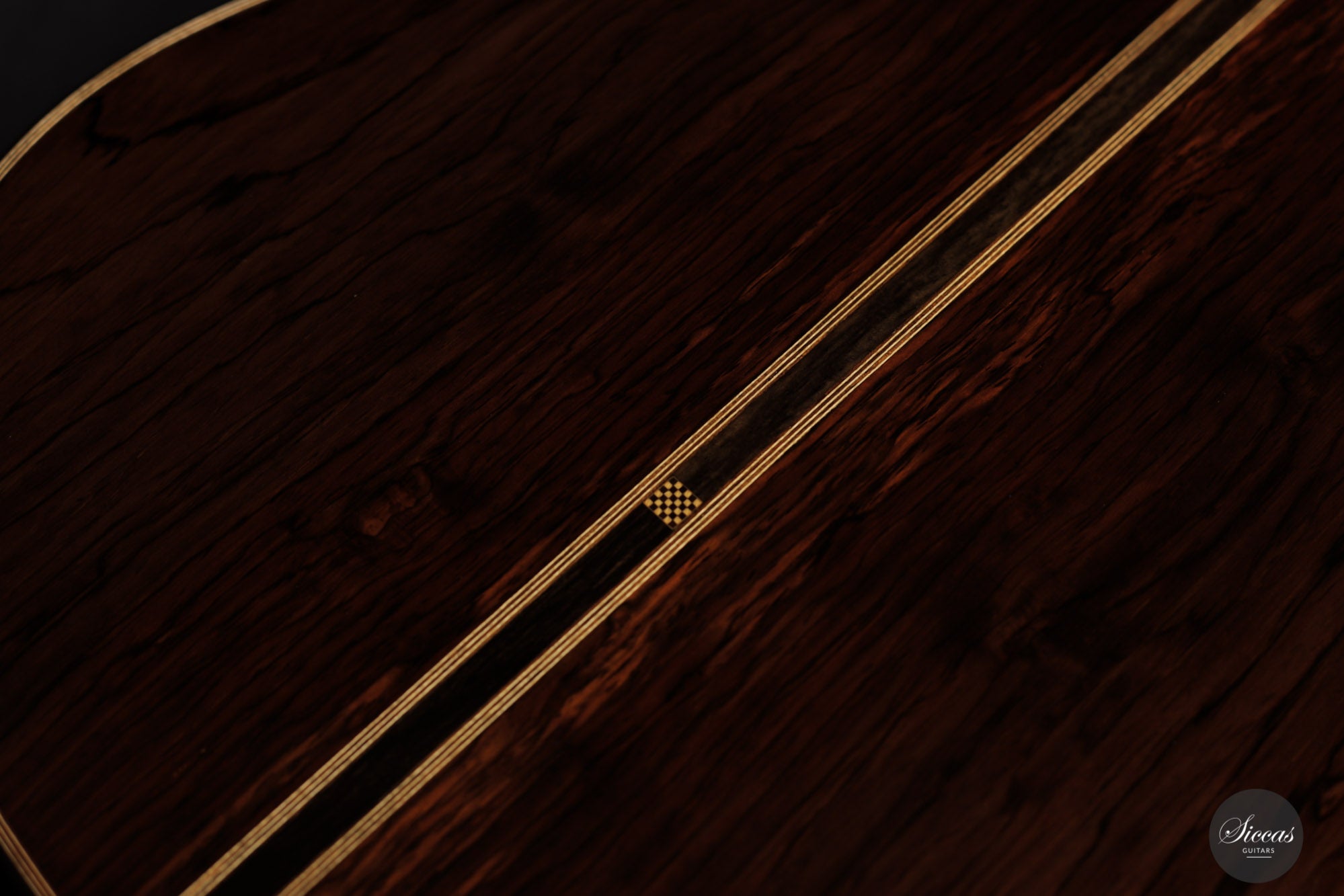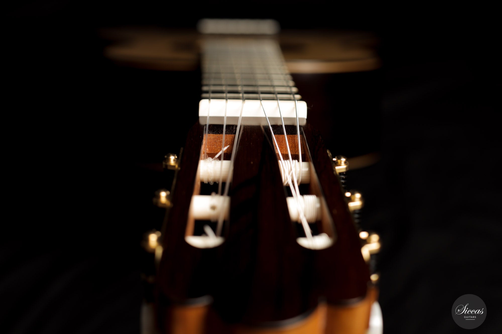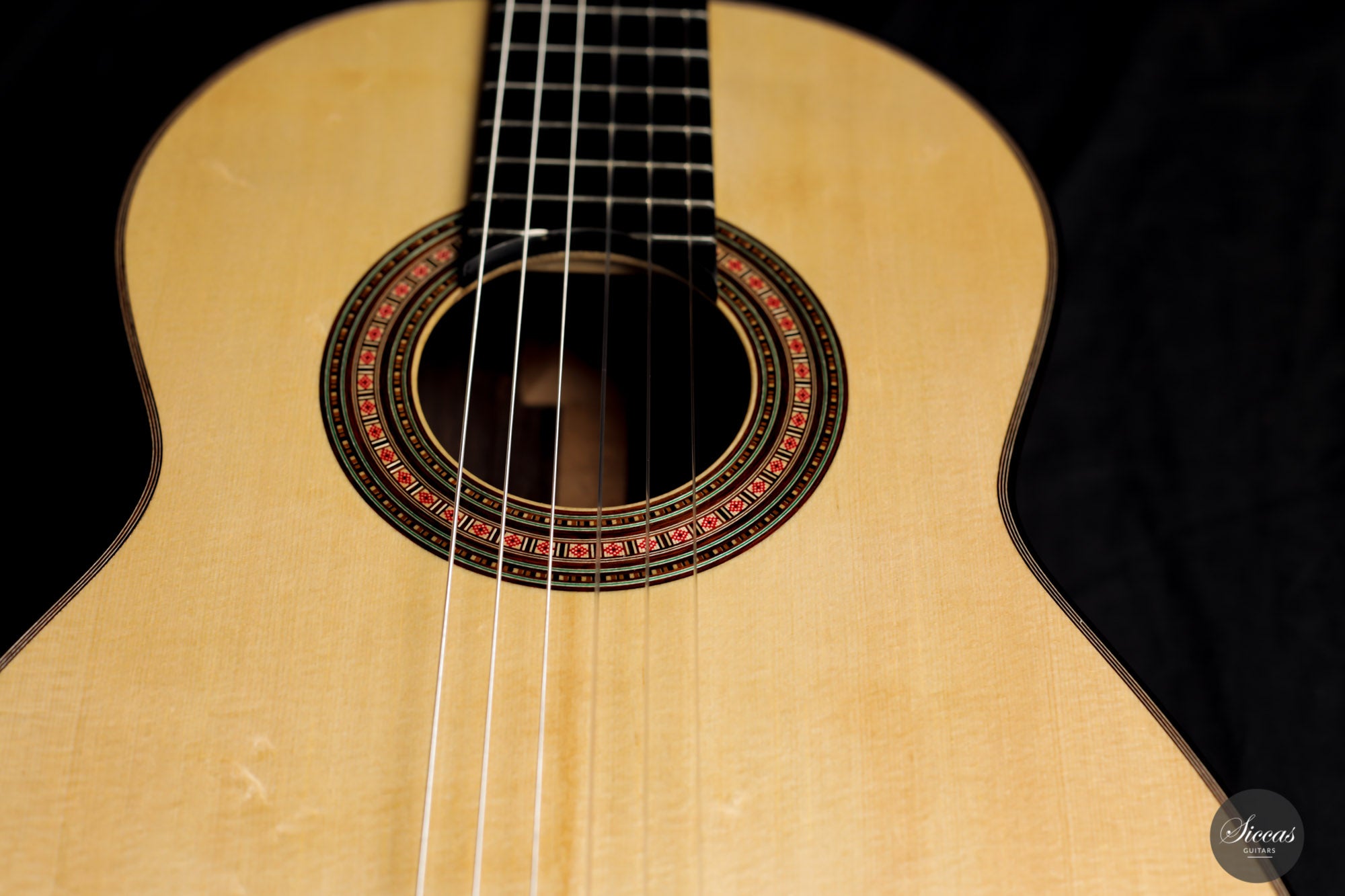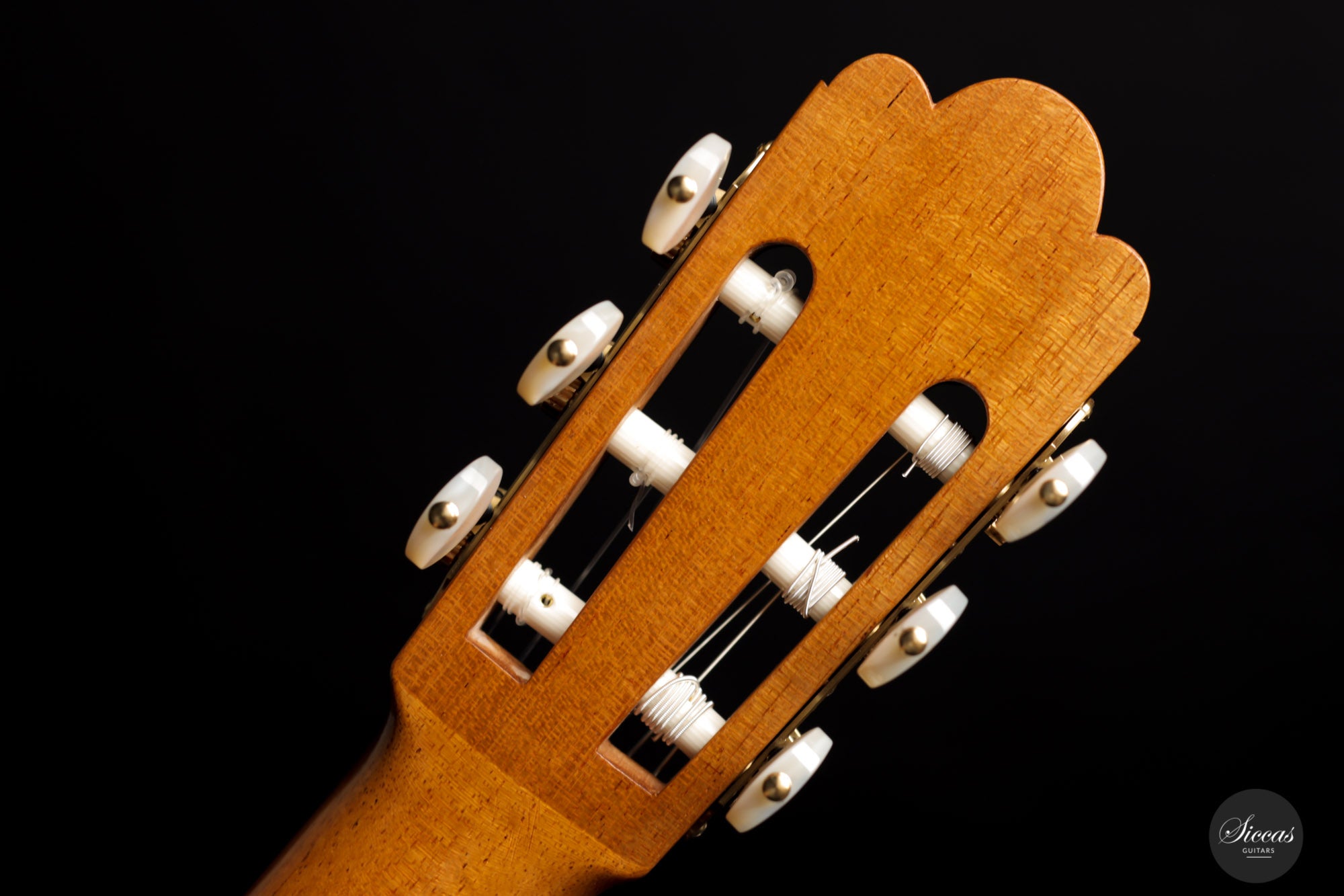 This Margherita special model by Gerhard Oldiges is called "Marieta". Very accurate attention to detail went into the construction and, as always with Gerhard, the result is a true masterpiece. The entire plantilla is reminiscent of Torres' more compact guitars, and a particularly fine set of CITES-certified Rio rosewood was chosen for the back and sides. The latter has a particularly dark color with bright orange veins, making it a true showpiece. For the top, Gerhard Oldiges chose delightful bear claw spruce, and some gorgeous hand-engraved German Scheller tuners perfectly set the mood. The marquetry work is also of great elegance. The checkerboard pattern is found on both the bridge and the central ebony part of the back, and the remarkable rosette is proof of the highest craftsmanship.