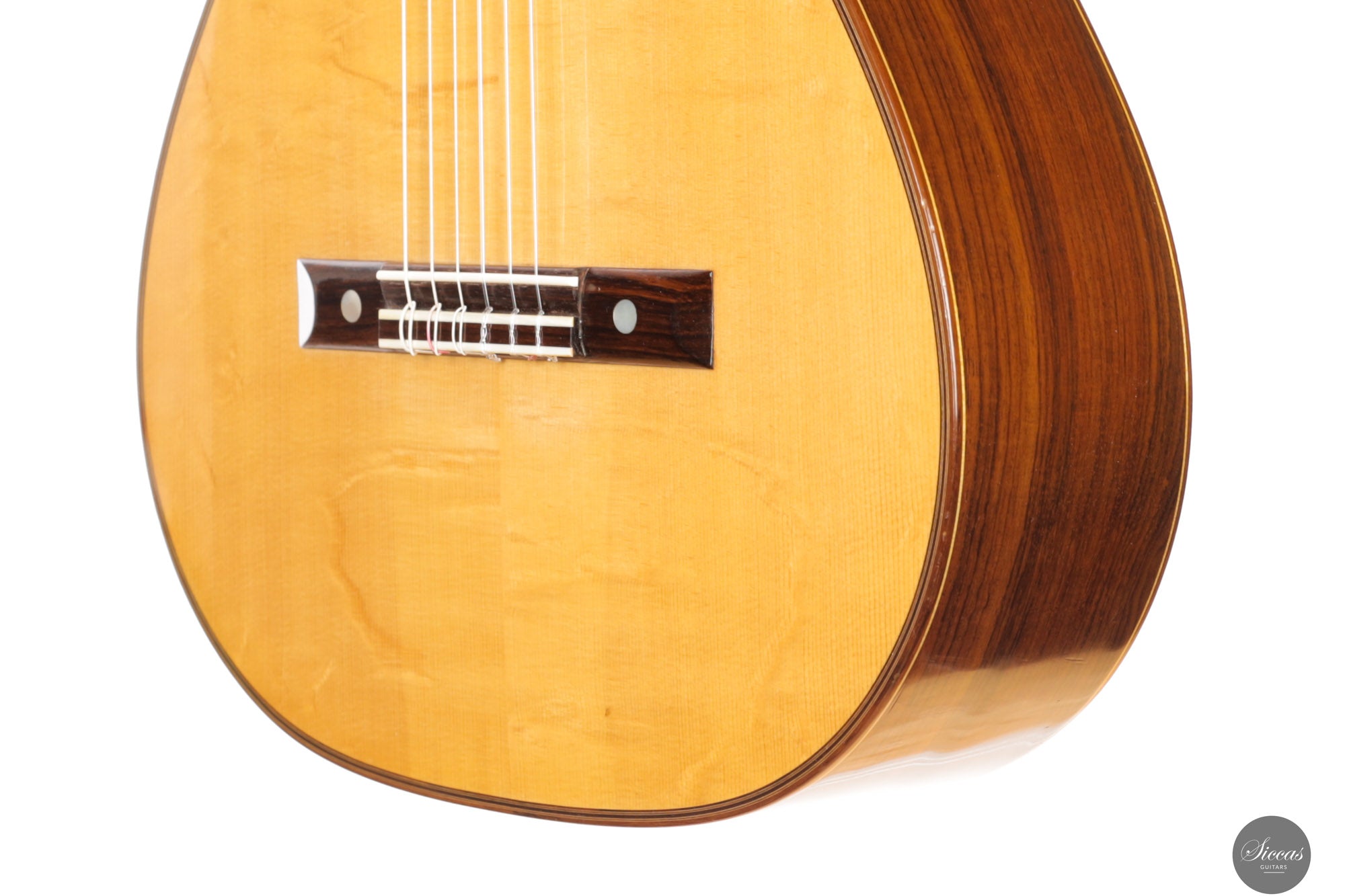 The 2005 guitar “La Prueba” by Gerhard Oldiges is a masterful creation that showcases exceptional artistry and meticulous craftsmanship. This instrument features a beautiful spruce top and fine-grained Indian rosewood for the back and sides, materials chosen for their rich tonal qualities and aesthetic appeal. The guitar is adorned with elegant marquetry, adding a touch of classic elegance to its design. “La Prueba” delivers a breathtaking auditory experience. The guitar produces a rich and balanced tonal palette, characterized by deep, silky basses and brilliant trebles that complement each other perfectly. The instrument’s excellent playability and tonal strength make it a true gem, combining modern features with an old-world sound character.Condition