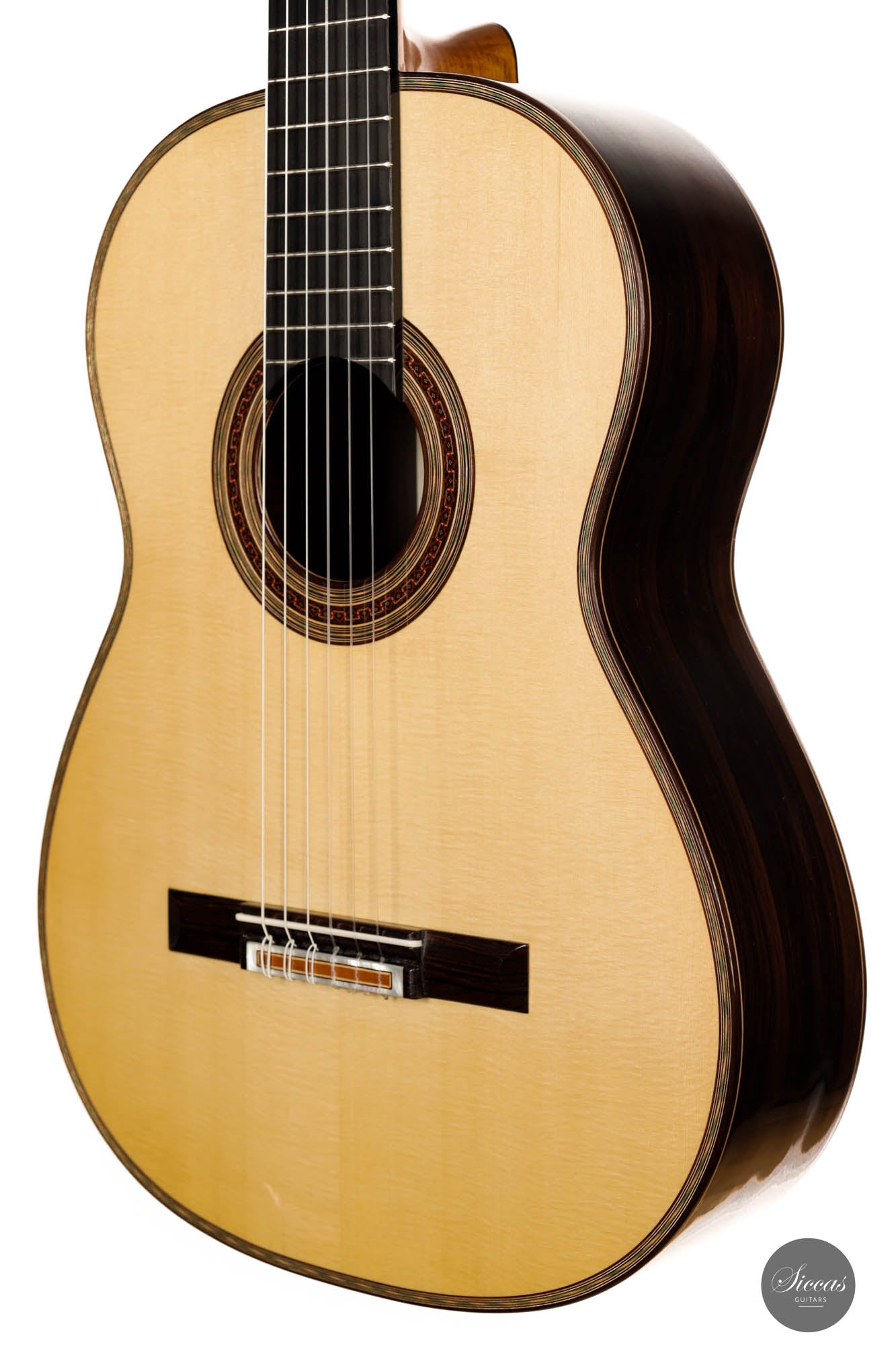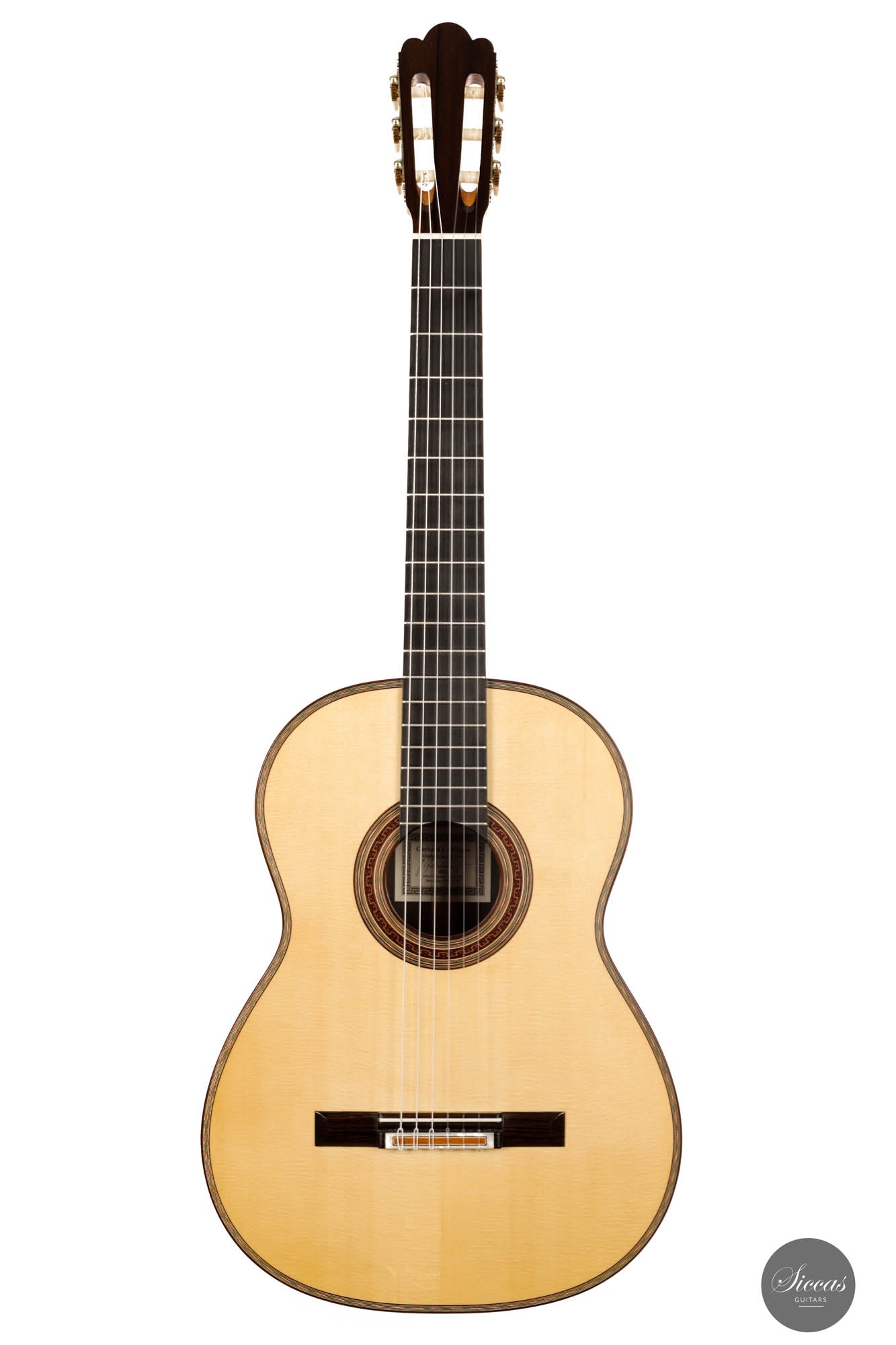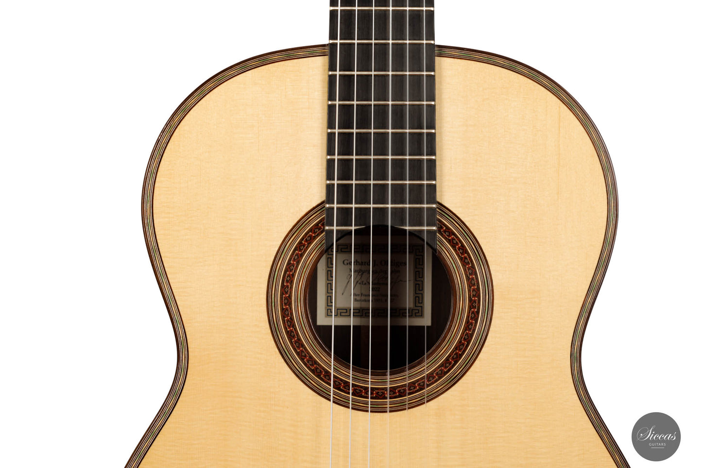 The 2022 Gerhard Oldiges Simplicio Model "La Mimbrera" is a testament to the exceptional artistry and craftsmanship of Gerhard Oldiges. Every detail in the construction of this instrument is meticulously executed, producing a guitar that is nothing short of a masterpiece. The choice of materials showcases a discerning eye for quality and aesthetics. The body of the guitar is adorned with a rare, CITES-certified Brazilian rosewood, noted for its exceptional dark color, streaked with bright orange veins that catch the eye. Complementing this is a top composed of spruce, boasting a delightful grain that adds an organic charm to the instrument. Accents of hand-engraved German Scheller tuners set the tone, adding a touch of classic elegance, while the elegant marquetry work extends the visual appeal. A distinctive checkerboard pattern graces both the bridge and the central ebony section of the back, demonstrating exceptional craftsmanship. A remarkable rosette stands as proof of the highest level of artisanal skill involved in the creation of this guitar. Although freshly crafted in 2022, the guitar bears a small, 25mm superficial crack on the lower bout, an aesthetic flaw that occurred just after the guitar's completion. This defect, while nearly invisible, in no way impacts the sound or playability of the instrument, serving only to add character to its story. As for its tonal qualities, this model defies expectations. Despite its size, the guitar boasts a robust sound, thanks to its double-sided design and responsive spruce top. The sound it produces is voluminous, warm, and rounded. The treble strings, in particular, offer a unique harmonic character with long sustain and balanced tone. The bass strings, on the other hand, captivate listeners with their cello-like sonority. The 2022 Gerhard Oldiges Simplicio Model "La Mimbrera" is not just a master guitar in terms of its sonority, it is also a visual delight that makes a striking impression with its meticulously crafted details and exquisite materials.