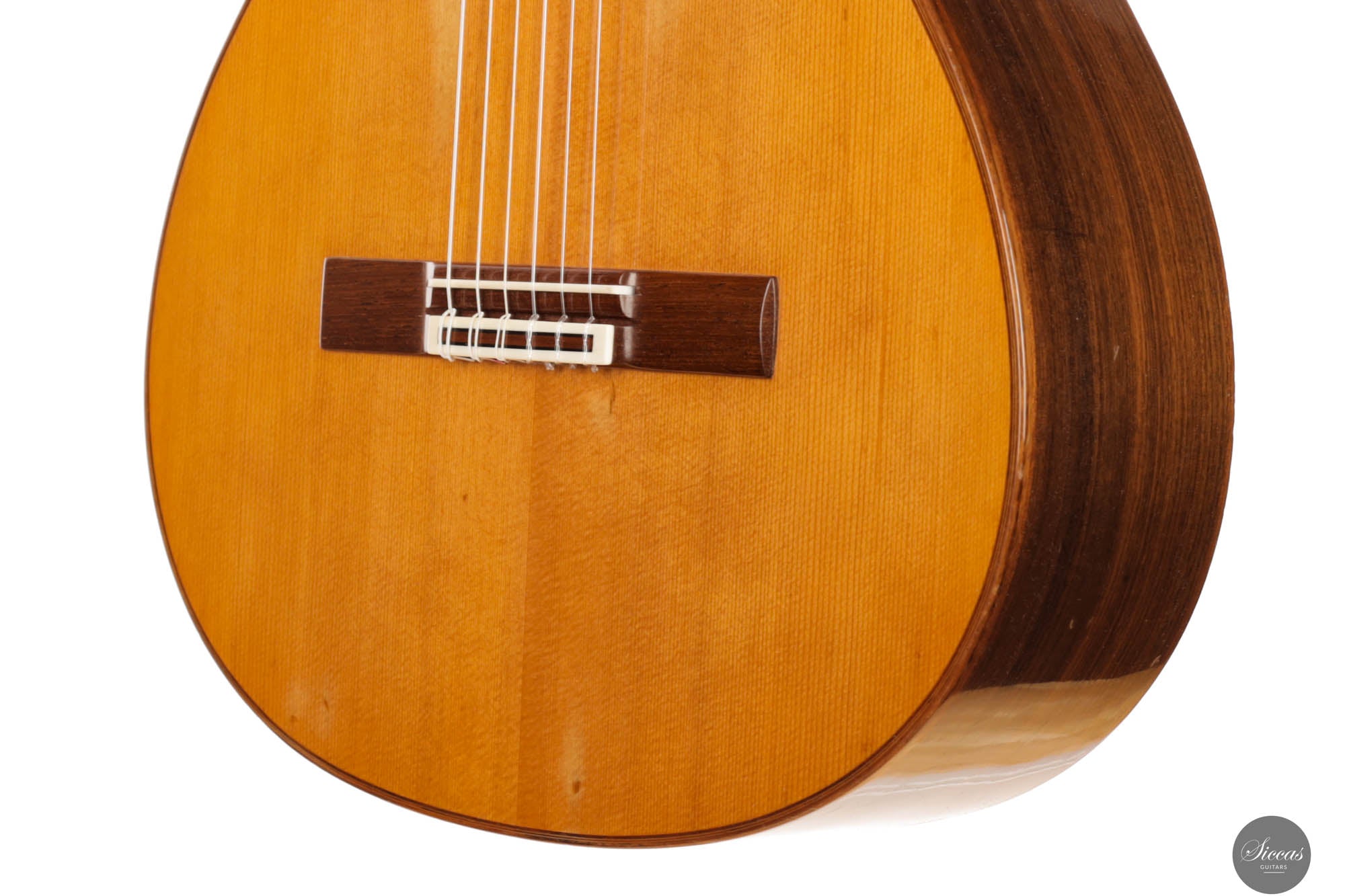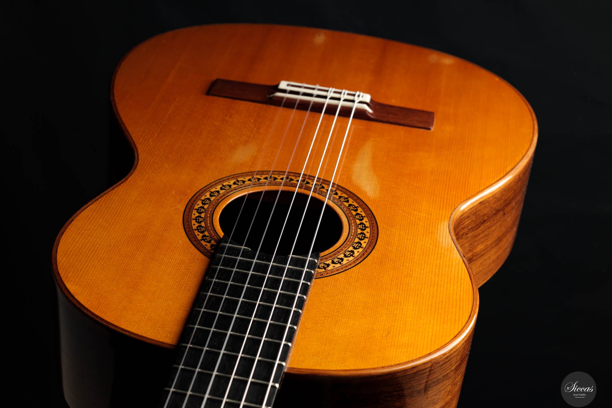 Crafted in 1975 and identified as number 317, this concert model guitar is a fine example of the quality associated with German guitar craftsmanship. It has been kept in exceptionally good condition over the years. The construction is meticulous, featuring a traditional Hannabach design with a notably intricate head plate. The sound it produces is balanced, with an impressive sustain that is particularly noticeable on the first string. As part of Germany's rich guitar-making tradition, this instrument bears playing marks and has had the finish on several spots retouched, yet it remains structurally sound. This guitar reflects the heritage and skill of its makers, embodying the history of German luthiery in its design and sound.