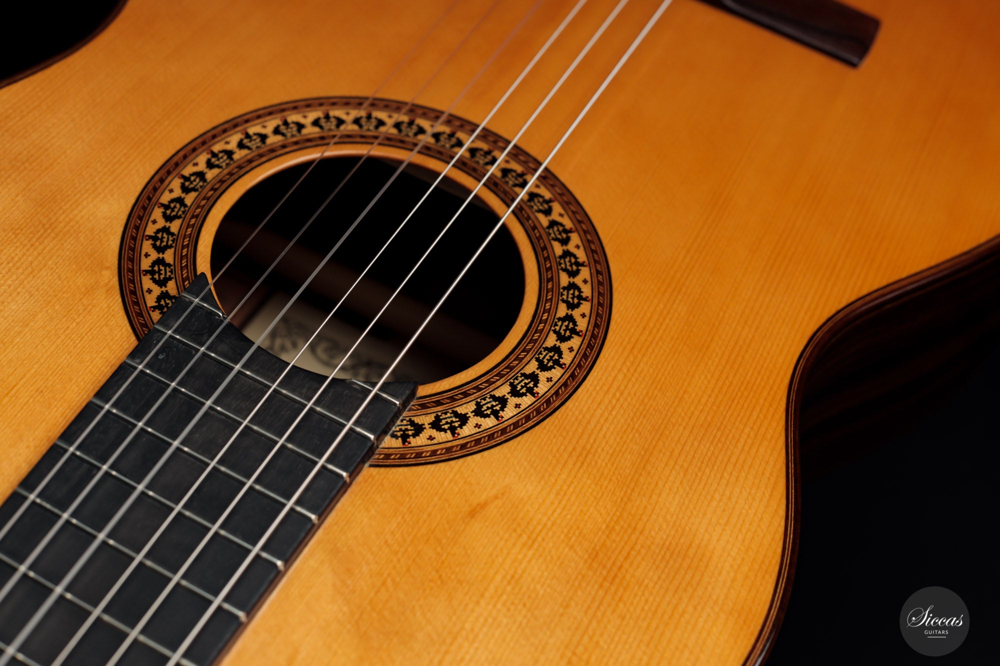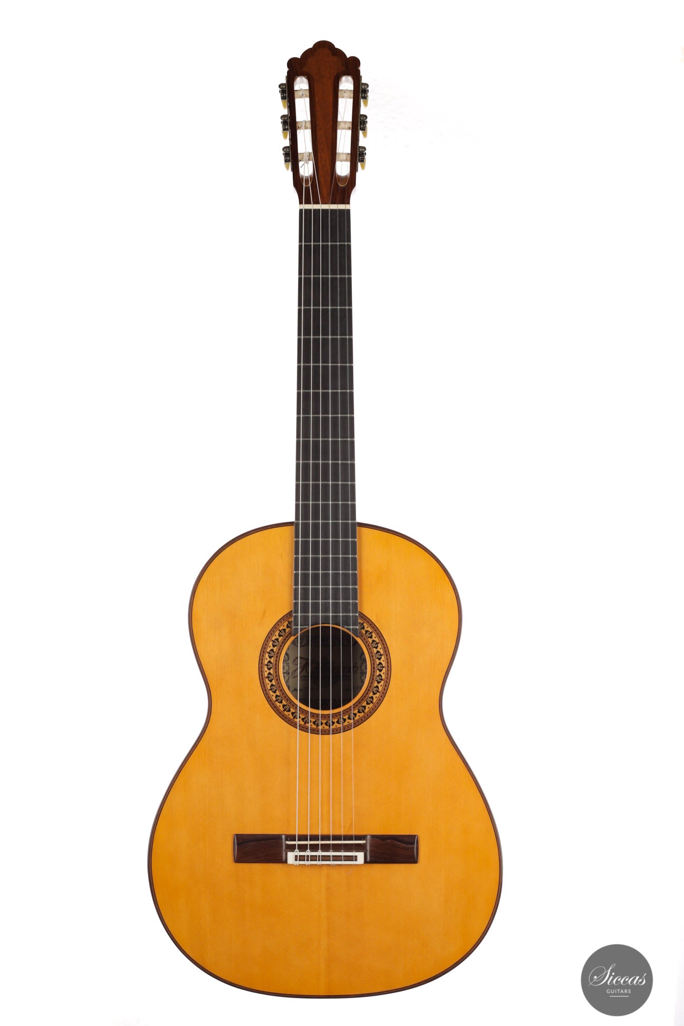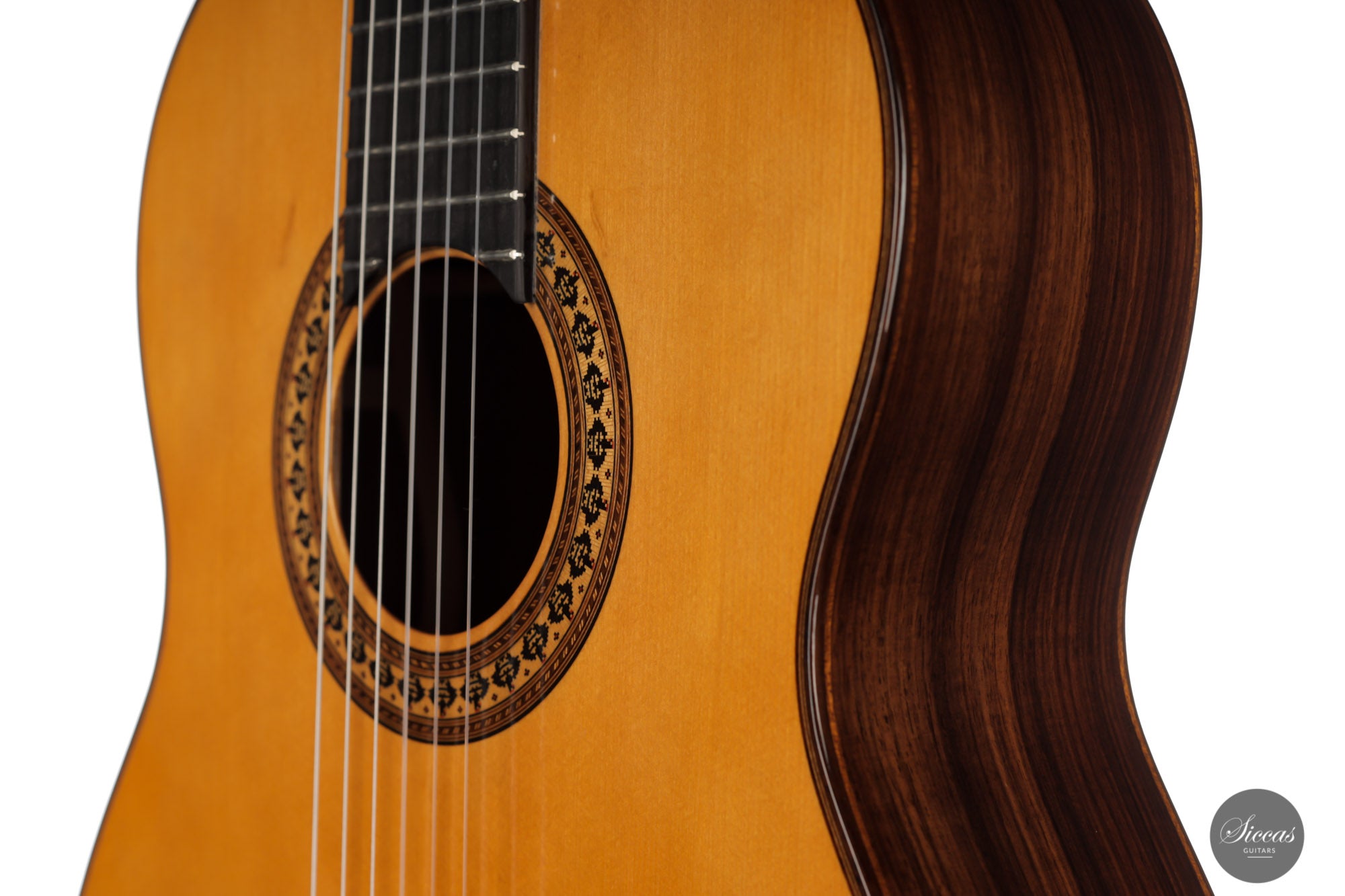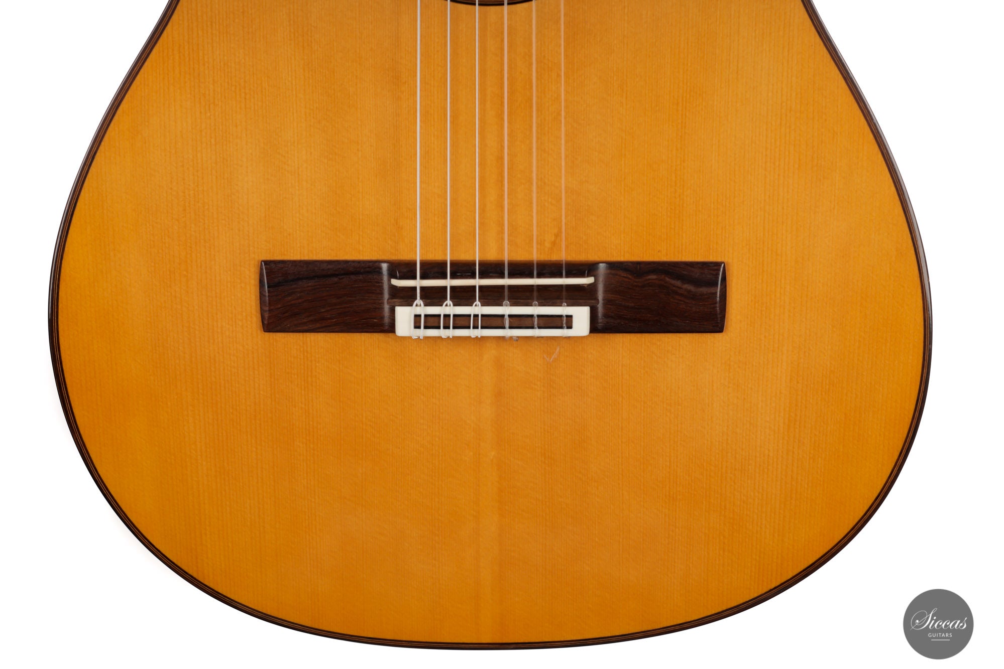 This great concert model made in 1976, number 337, is exceptionally well preserved. It is paired with its original Meinl case, an authentic brochure from Hannabach, and precious Landstorfer/Reischl tuners in perfect working condition. Flawlessly built, this guitar has the traditional Hannabach look with a particularly elaborated head plate. The sound is remarkably balanced and the sustain striking, especially on the first string. It is overall a lovely guitar, part of the rich tradition of German guitar making.