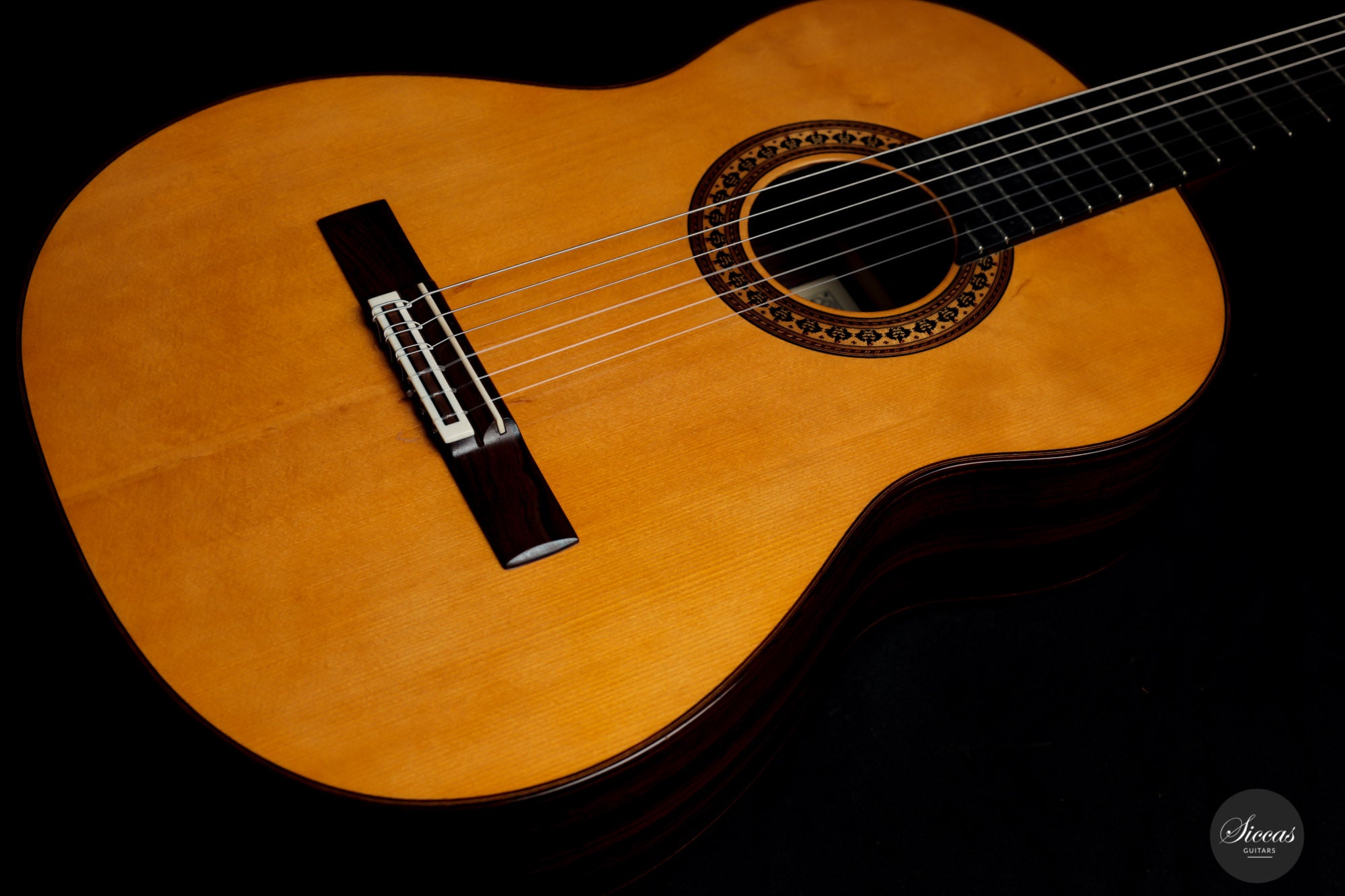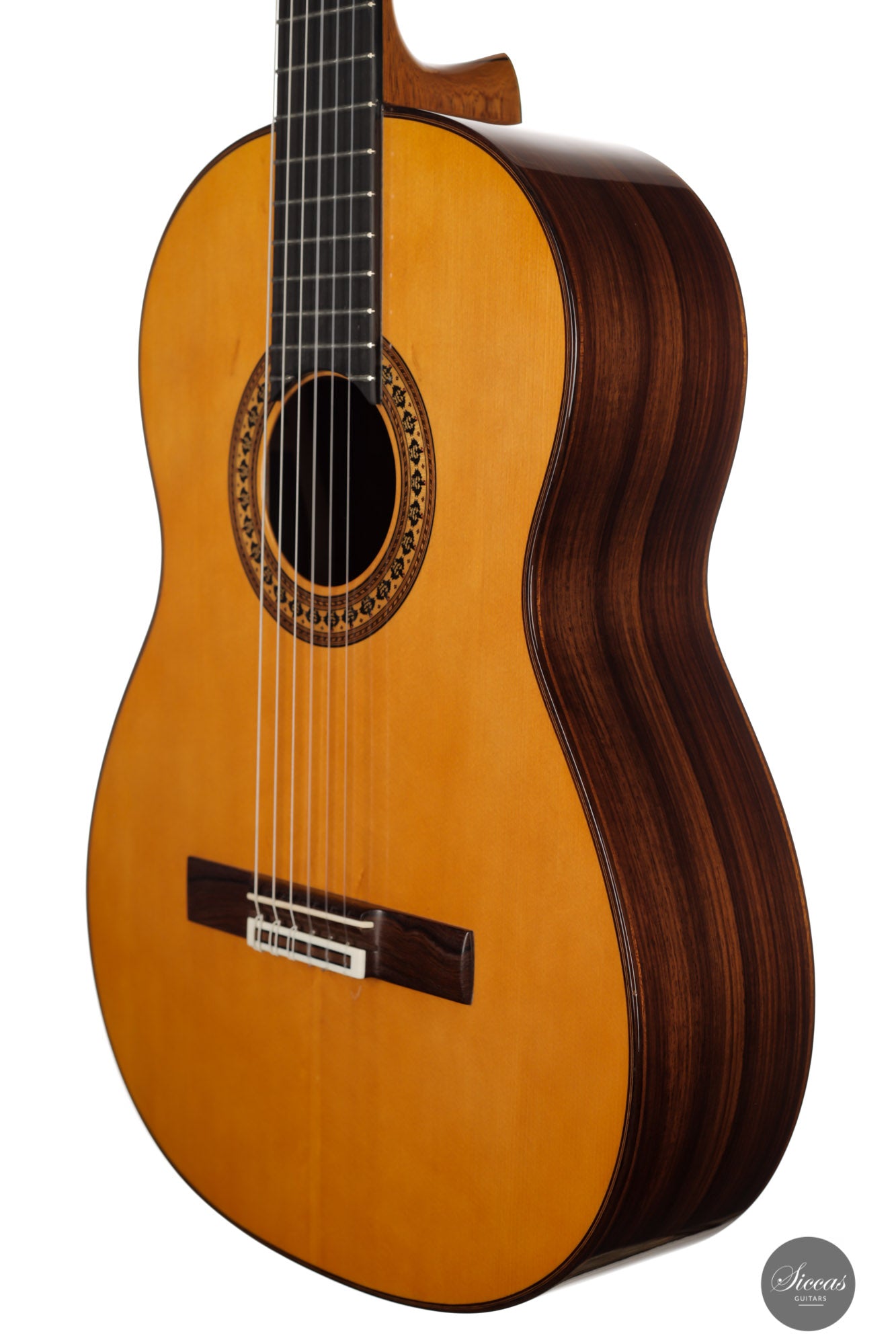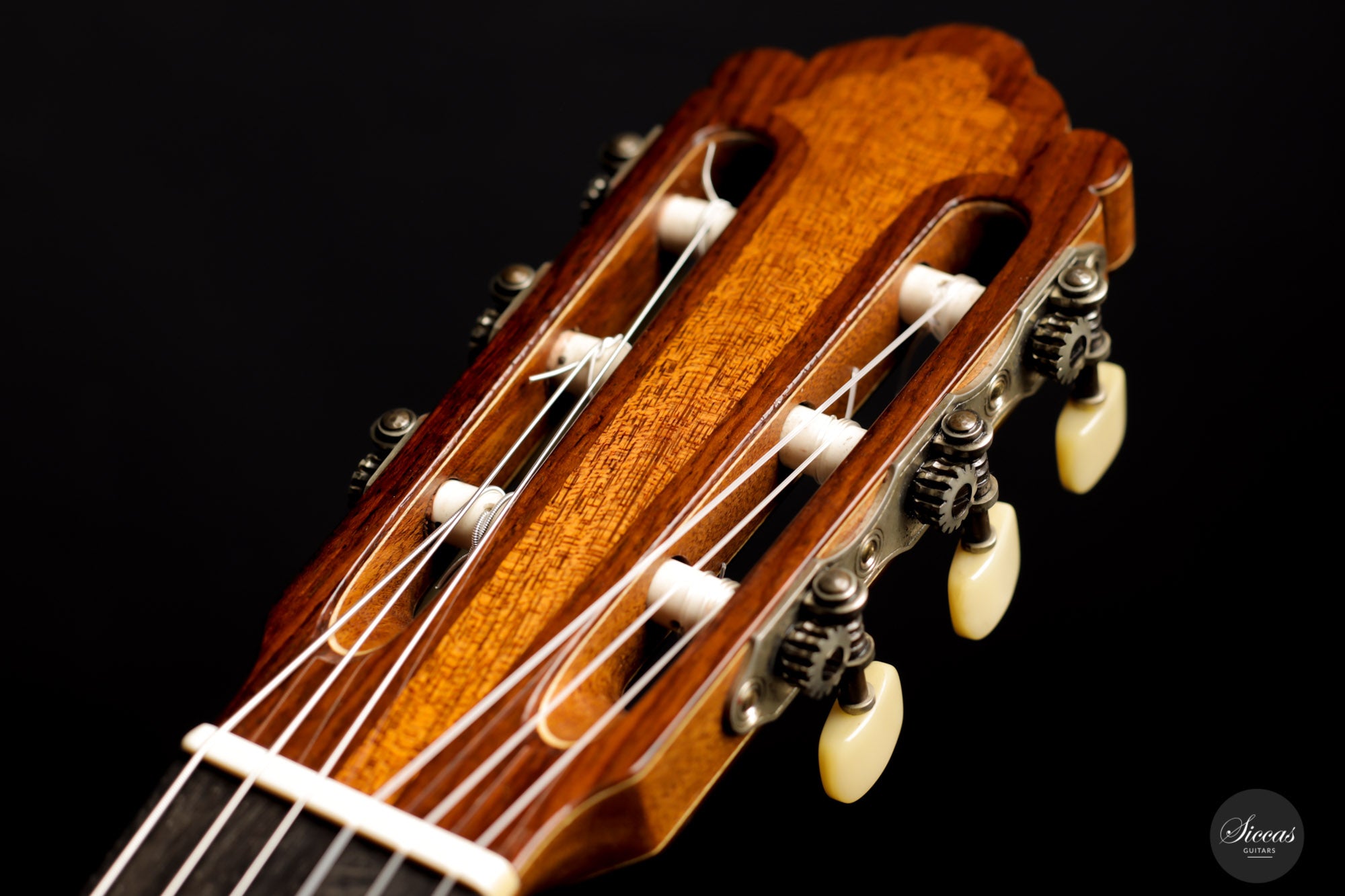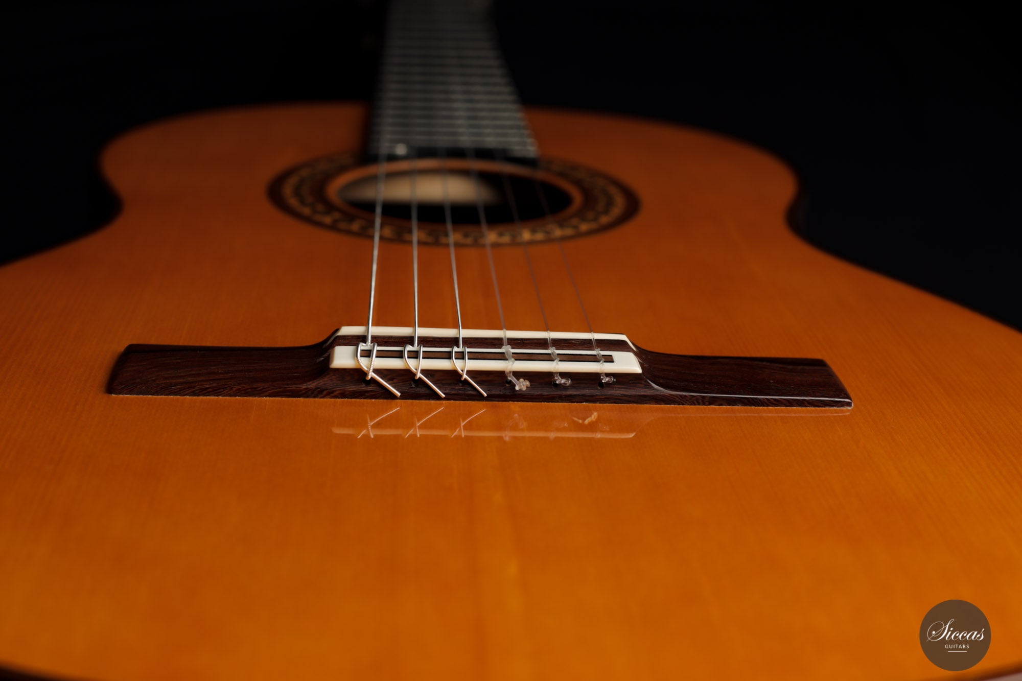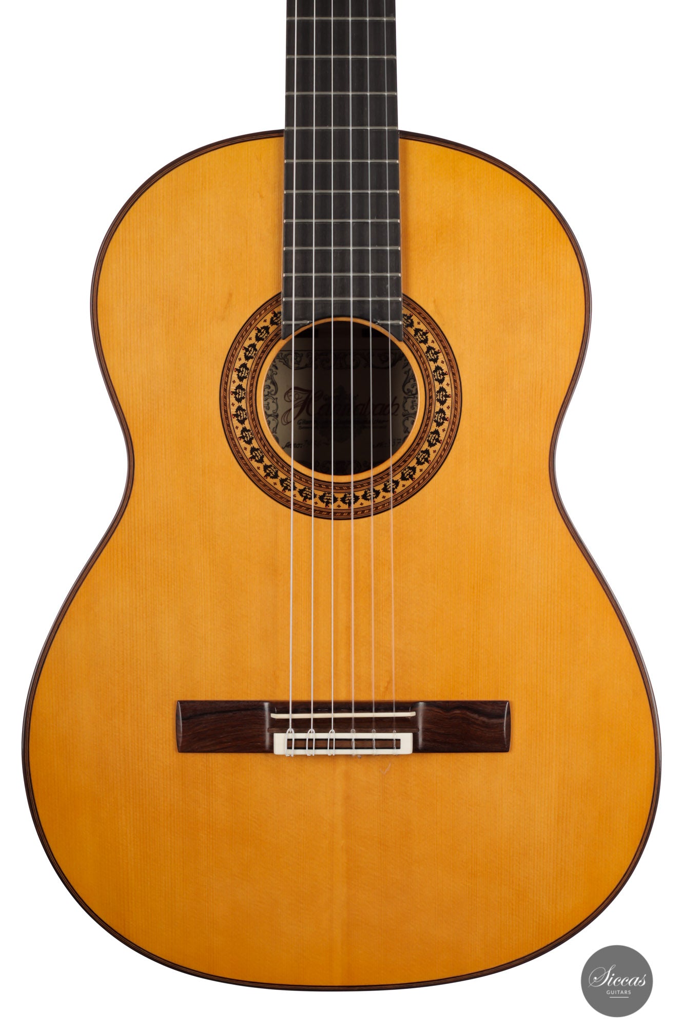 This great concert model made in 1976, number 337, is exceptionally well preserved. It is paired with its original Meinl case, an authentic brochure from Hannabach, and precious Landstorfer/Reischl tuners in perfect working condition. Flawlessly built, this guitar has the traditional Hannabach look with a particularly elaborated head plate. The sound is remarkably balanced and the sustain striking, especially on the first string. It is overall a lovely guitar, part of the rich tradition of German guitar making.