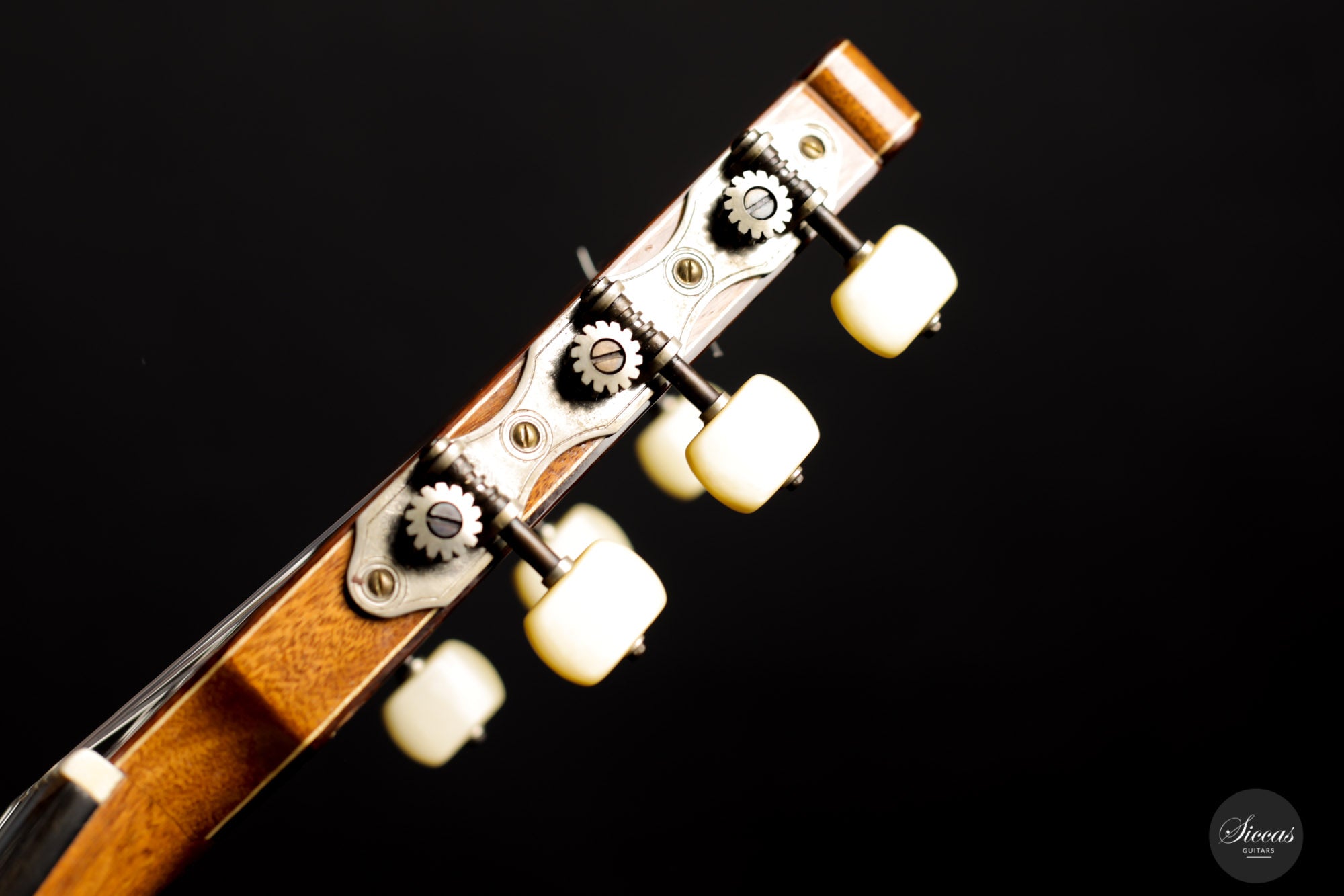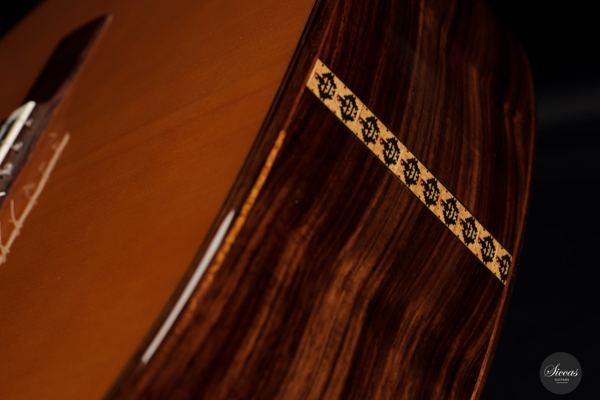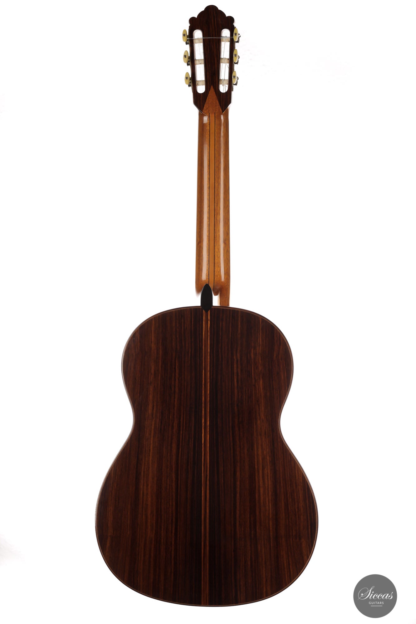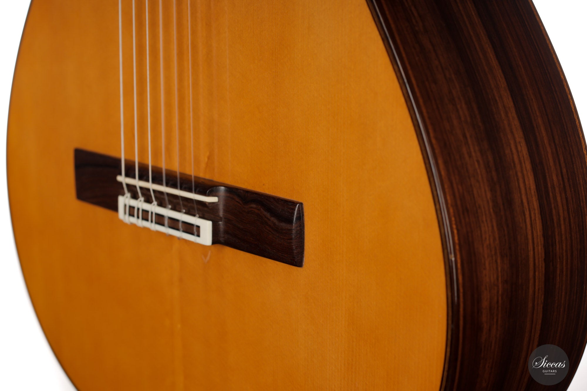 This great concert model made in 1976, number 337, is exceptionally well preserved. It is paired with its original Meinl case, an authentic brochure from Hannabach, and precious Landstorfer/Reischl tuners in perfect working condition. Flawlessly built, this guitar has the traditional Hannabach look with a particularly elaborated head plate. The sound is remarkably balanced and the sustain striking, especially on the first string. It is overall a lovely guitar, part of the rich tradition of German guitar making.