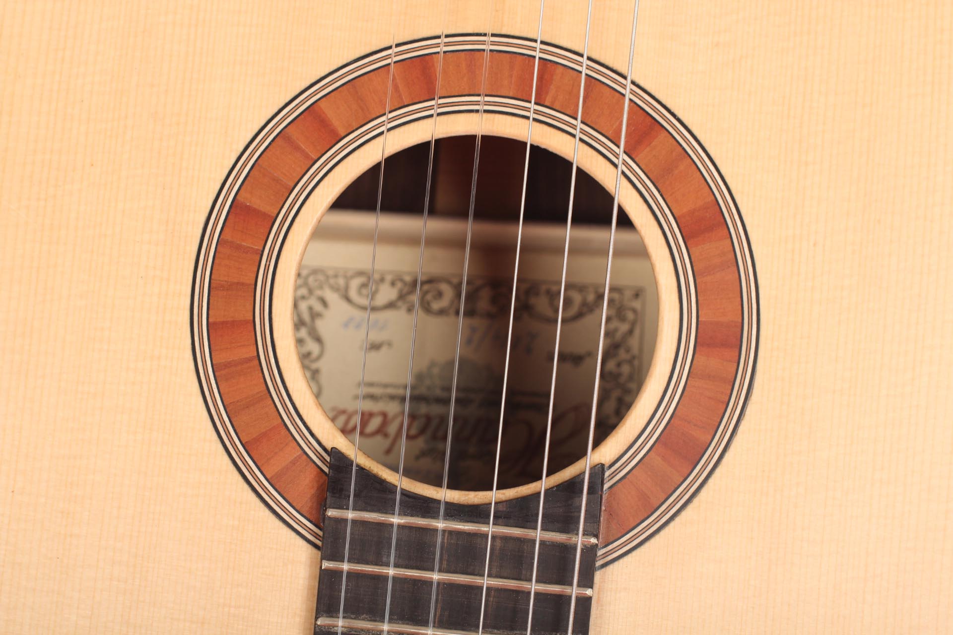 Wir präsentieren euch die letzte Gitarre, die der Meister vor seinem Tod gebaut hat. Es handelt sich hierbei um eine hübsche, kleine, energetische Terzgitarre mit kunstvoll geschnitzter Kopfplatte und einem direkten, klaren Klang. Die Decke ist aus Fichte, Boden und Zargen sind aus Indischem Palisander. Die Mechaniken sind von Rubner. Ein Hartschalenkoffer ist inklusive.