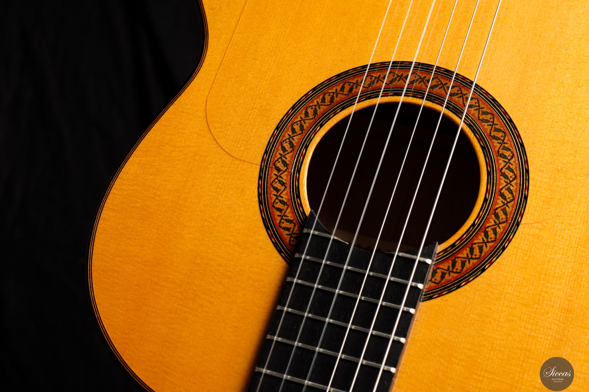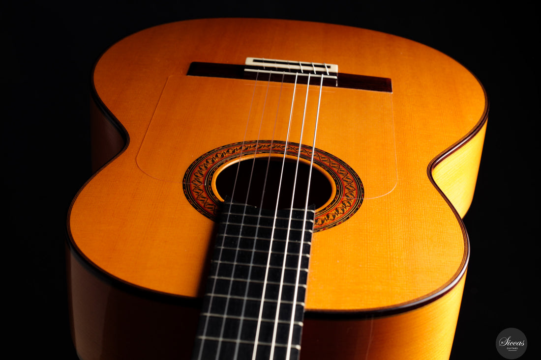 2021 Flamenca Blanca by Gerundino Fernández Hijo, with spruce top and cypress back and sides. Fast flamenco response, crisp attack, and rare lyrical sustain. Built in Almería with traditional pegs and French polish.