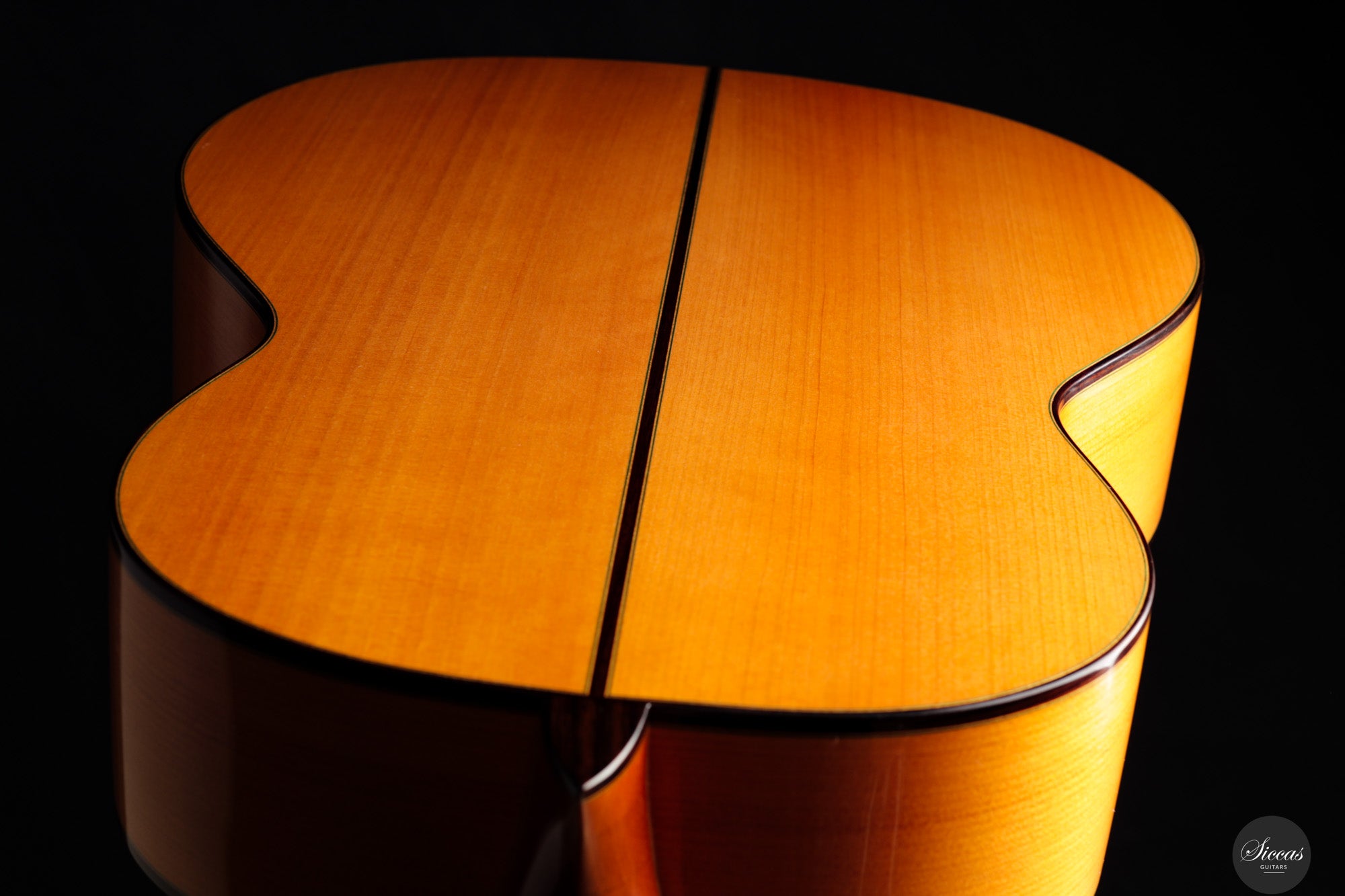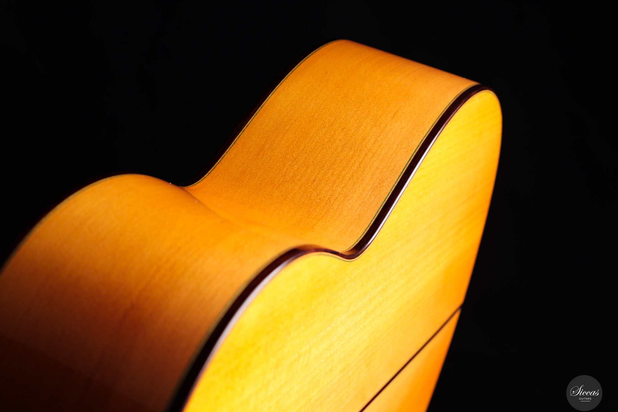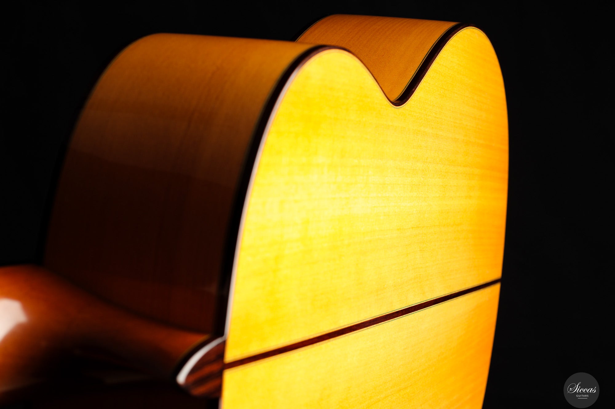 This 2021 Flamenca Blanca, built by Gerundino Fernández Hijo, feautures a spruce soundboard and cypress back and sides. It is traditionally constructed with peg tuners and finished in French polish. The voice is unmistakably flamenco: bright, crisp, and agile, with a fast attack and dry, percussive articulation. What distinguishes this instrument is its unusual lyrical sustain for a flamenco guitar, allowing phrases to unfold with expressive depth. The air resonance is slightly elevated, around G-sharp/A, adding to its responsiveness and tonal openness. The guitar balances immediate projection with elegance, ideal for both solo performance and traditional accompaniment.