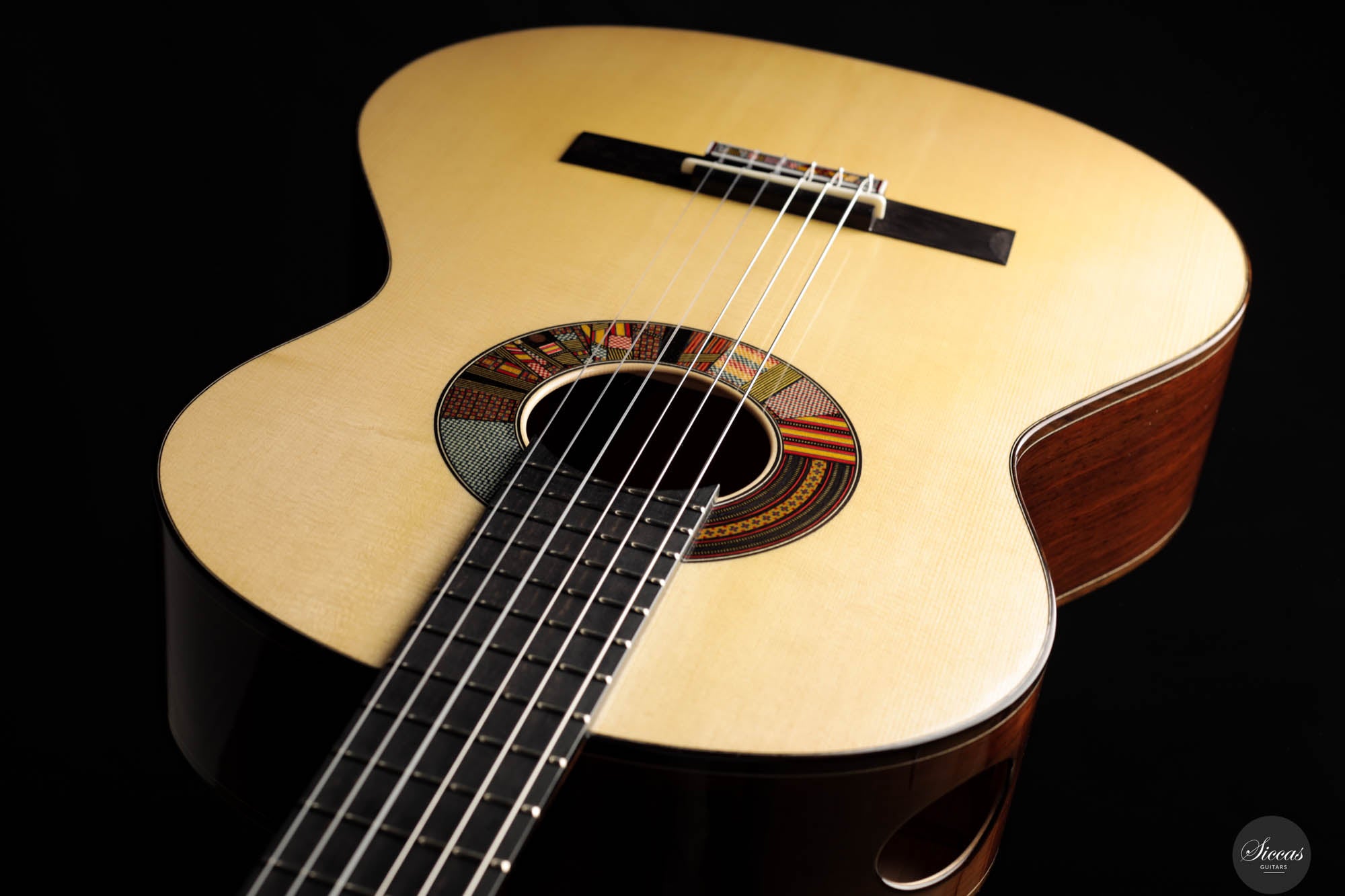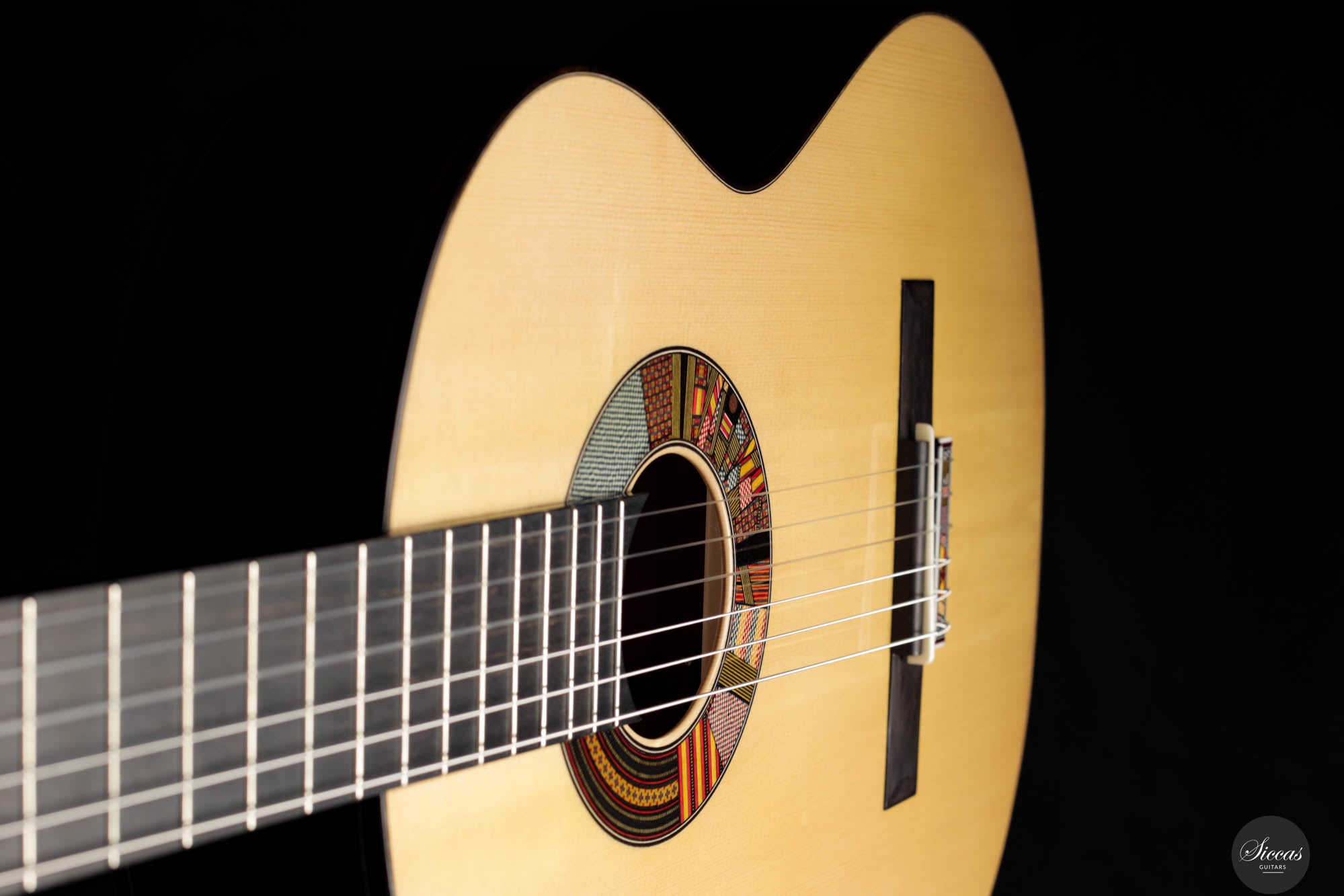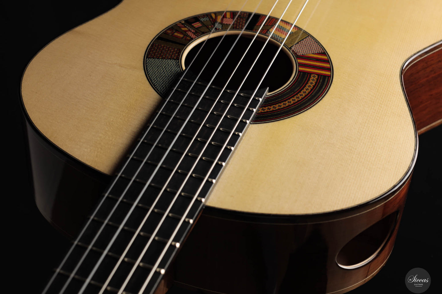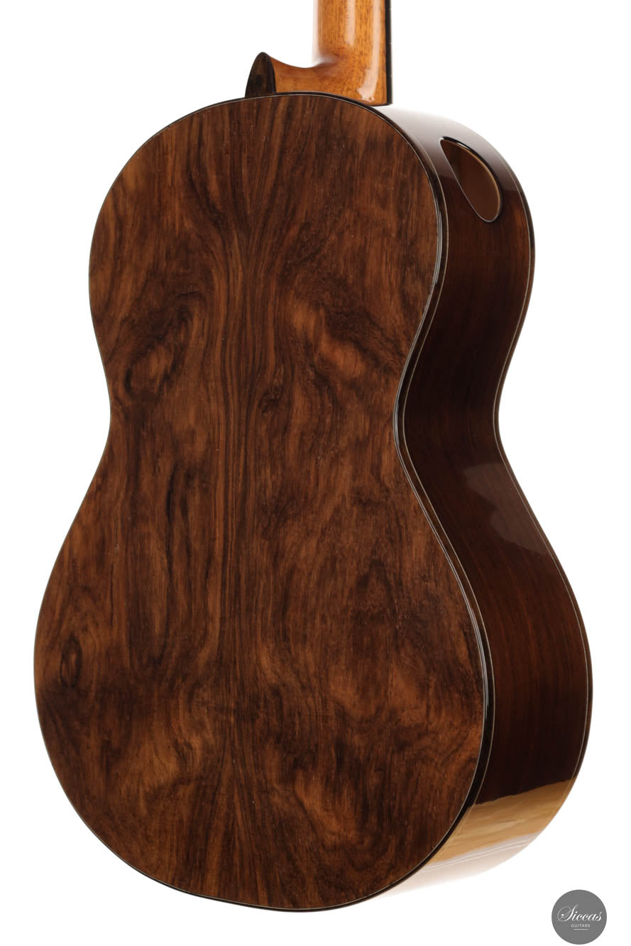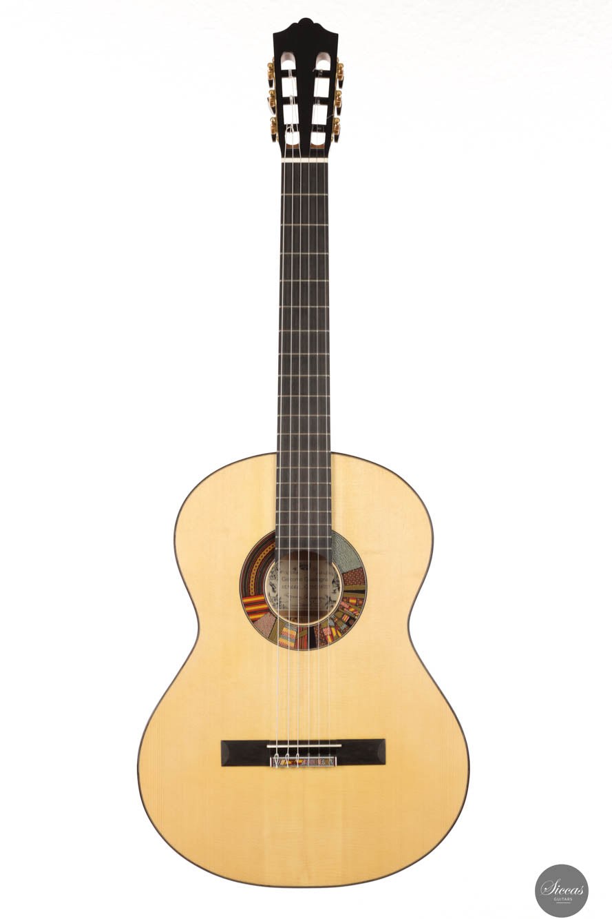 The REG 2024 Limited Edition guitar crafted by Giacomo merges impeccable artistry with superior acoustic qualities, making it a standout instrument capable of handling any concert setting. It boasts remarkable volume and projection, allowing musicians to fully explore its dynamic range while maintaining the organic, resonant quality characteristic of a traditional guitar. An innovative soundport enhances the player's auditory experience, providing immediate feedback on the sound produced, which enriches performance. Additionally, the aesthetic of this guitar is particularly striking, featuring a unique rosette composed of various designs Giacomo has utilized throughout his career. This detail not only adds visual appeal but also tells a story of the luthier's evolving artistic journey, making each performance with this guitar a visually and sonically captivating experience.
