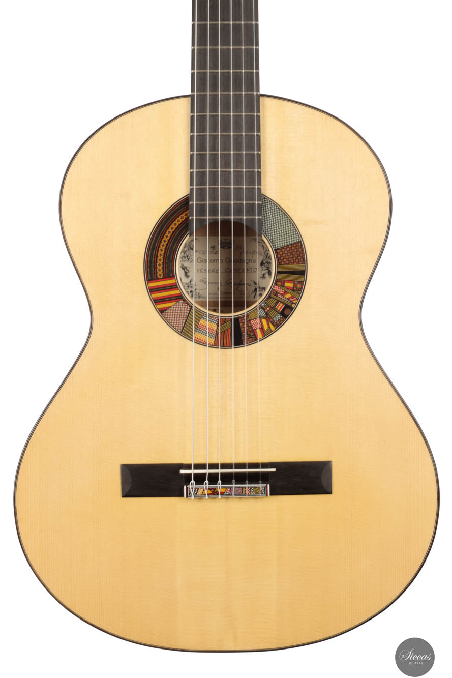 The "La Venere Concerto" guitar features a traditional 7-ray construction and is a fully original design by Giacomo Guadagna. He developed this model aiming for a perfect balance in sound, where neither the basses nor the highs dominate. Recently, Giacomo has adorned his "La Venere" with colorful, joyful details inspired by Sicilian artifacts and majolica, creating an instrument with a distinct personality that reflects his own. The "La Venere Concerto Limited Edition" includes special features: it has significant projection and volume due to its unique bracing arrangement and shape. It also has a soundport, enhancing the musician's ability to hear themselves during performances, and an adjustable saddle that allows for easy changes in string height, accommodating different musical preferences or preparing the guitar for a new owner without needing a luthier.