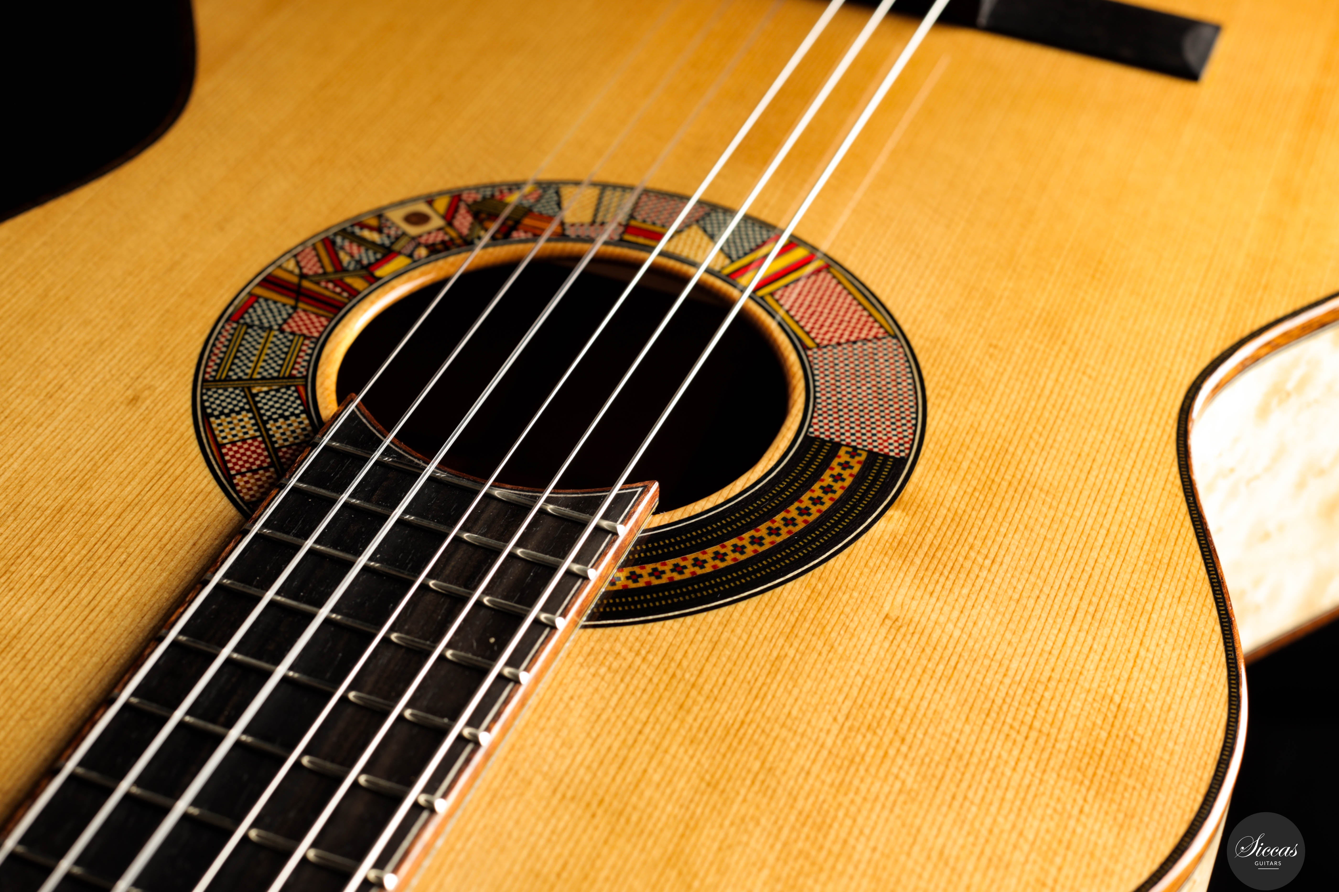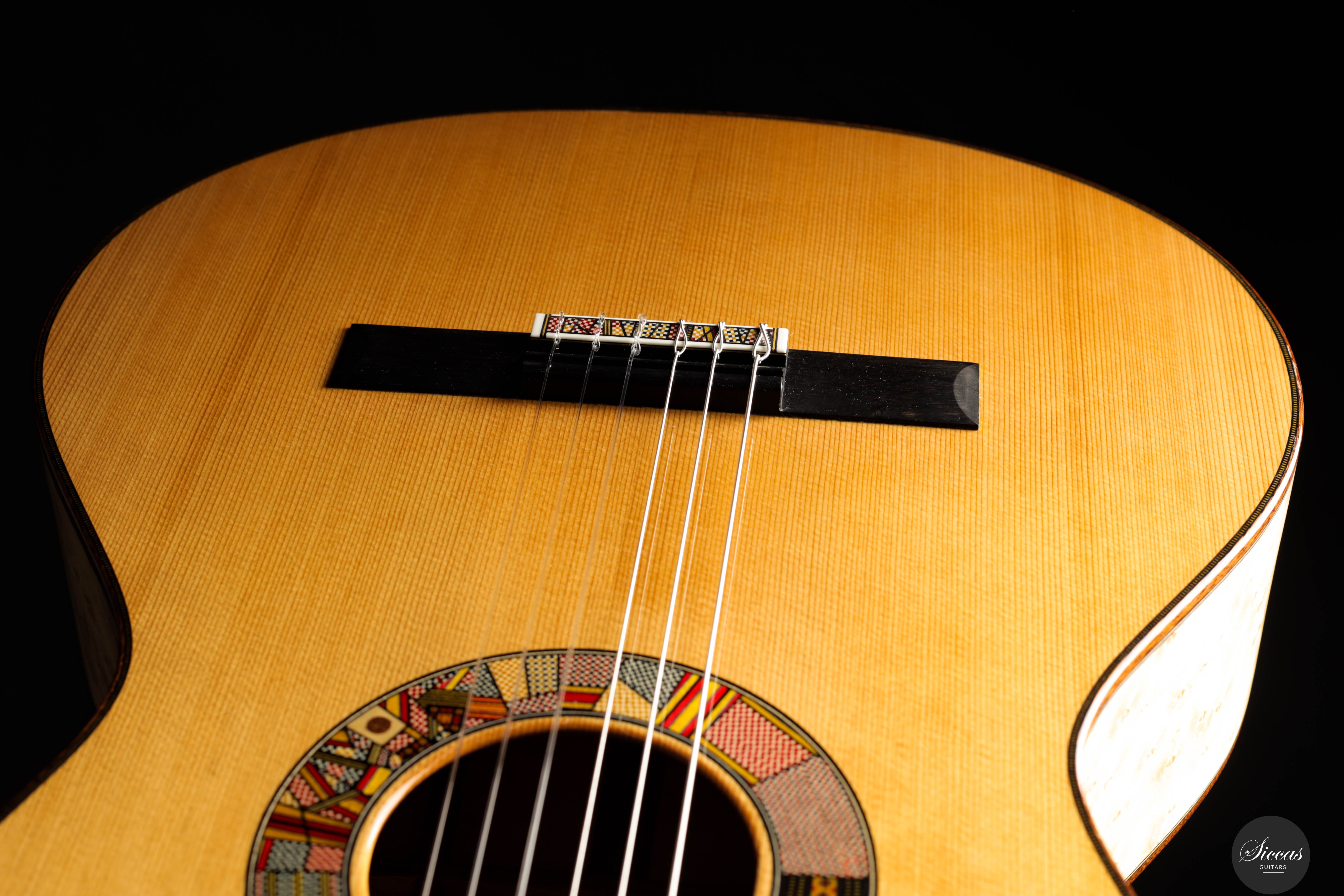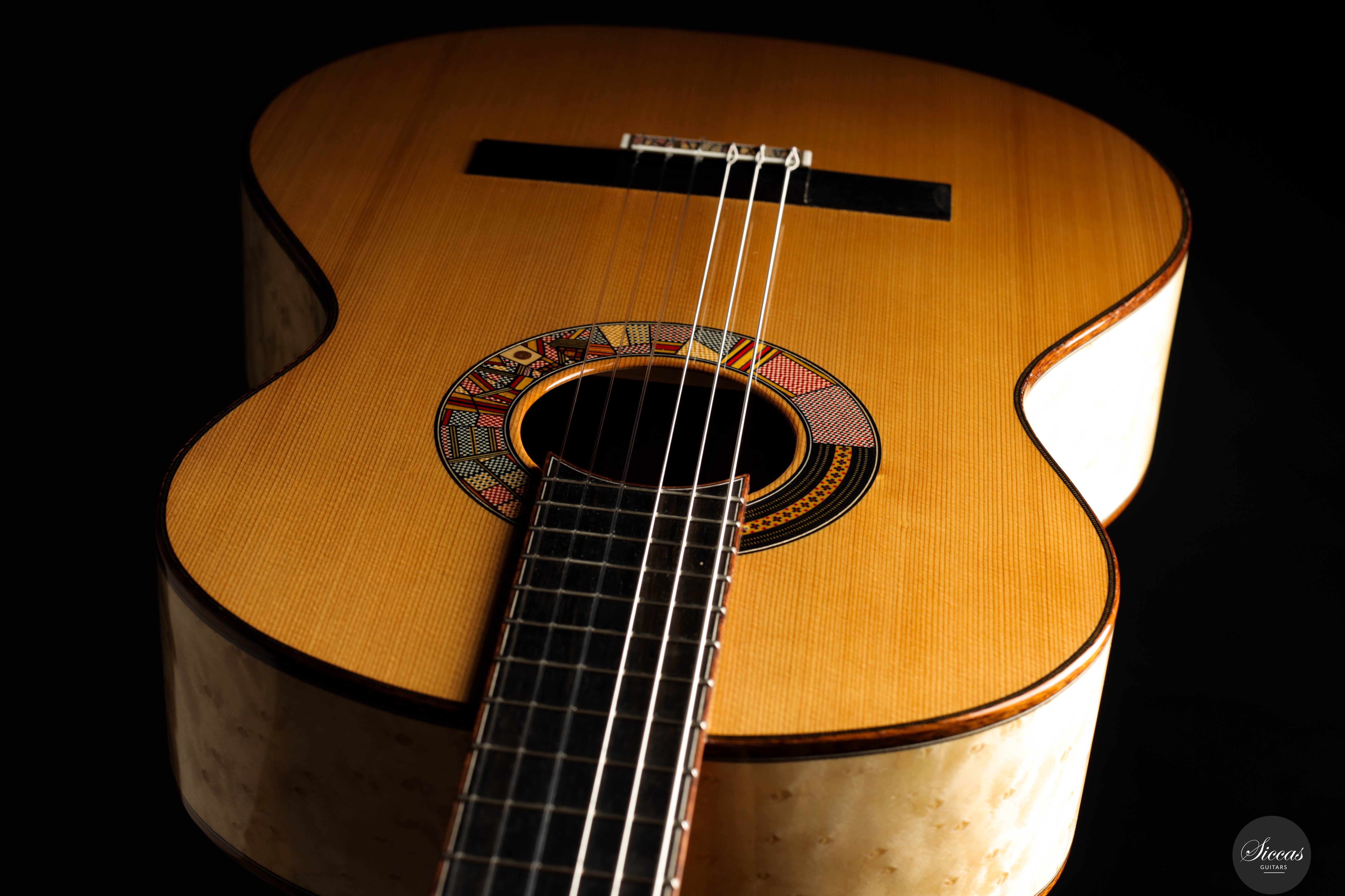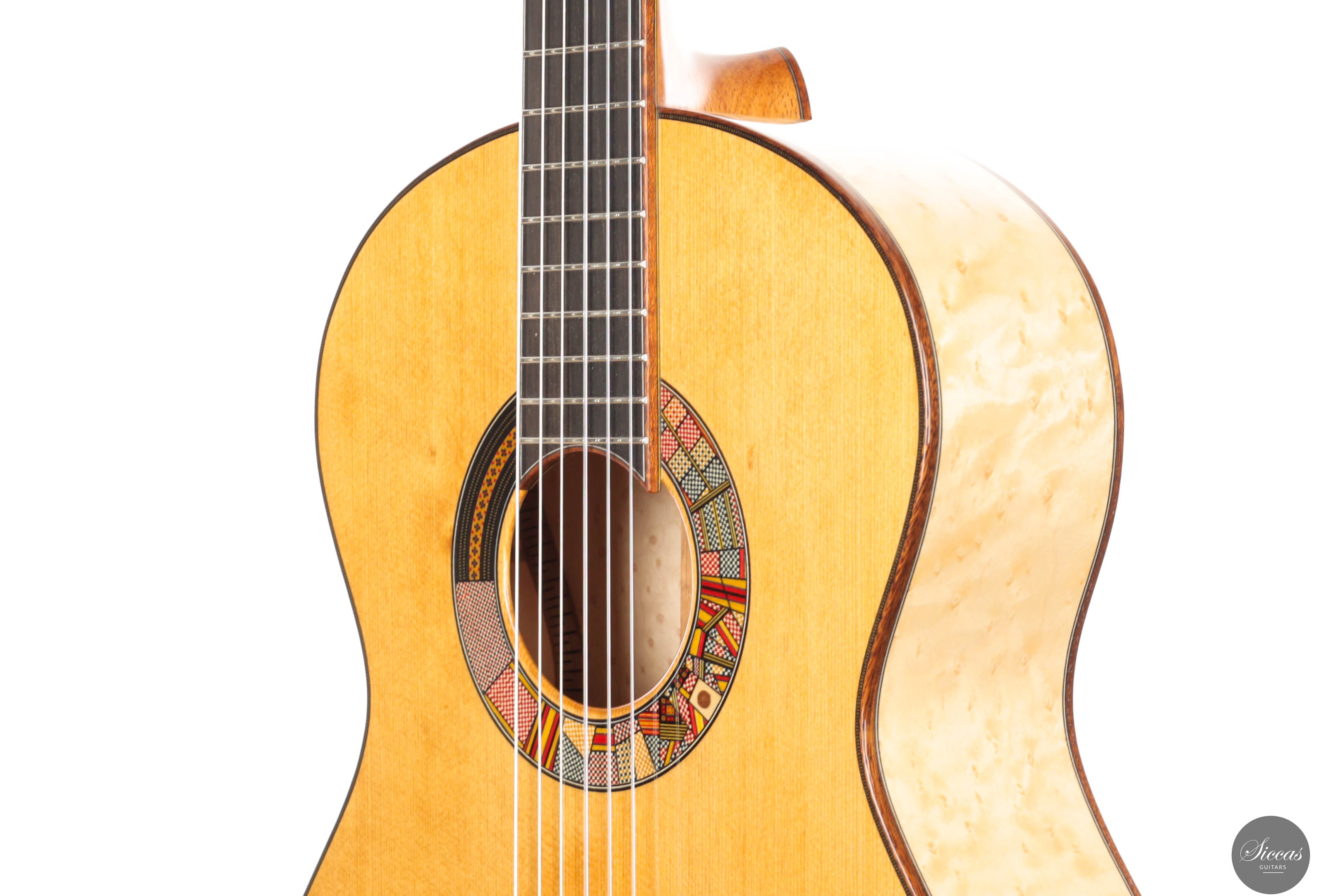 The “Venere Concerto” is a concert model entirely designed by Giacomo Guadagna. It features a traditional seven-fan bracing system and was developed to achieve a perfect tonal balance, where neither basses nor trebles dominate. This REG 2025 Limited Edition is equipped with a torrefied Italian spruce top and birdseye maple back and sides, creating a clear and resonant tone with excellent projection. Visually, the guitar stands out for its richly detailed aesthetic. The elaborate rosette is inspired by traditional Sicilian majolica (tin-glazed pottery) and features a mosaic-like composition, which is echoed in the tie block and fine purfling along the body and fretboard. The fretboard itself features a delicate purfling and binding, adding to the overall elegance of the instrument. The birdseye maple used for the back and sides serves as a final visual flourish — a vibrant, natural pattern that gives the instrument both character and individuality. With remarkable projection, tonal clarity, and a distinctly Mediterranean visual identity, this REG 2025 Limited Edition is a superb example of Giacomo Guadagna’s artistry.
