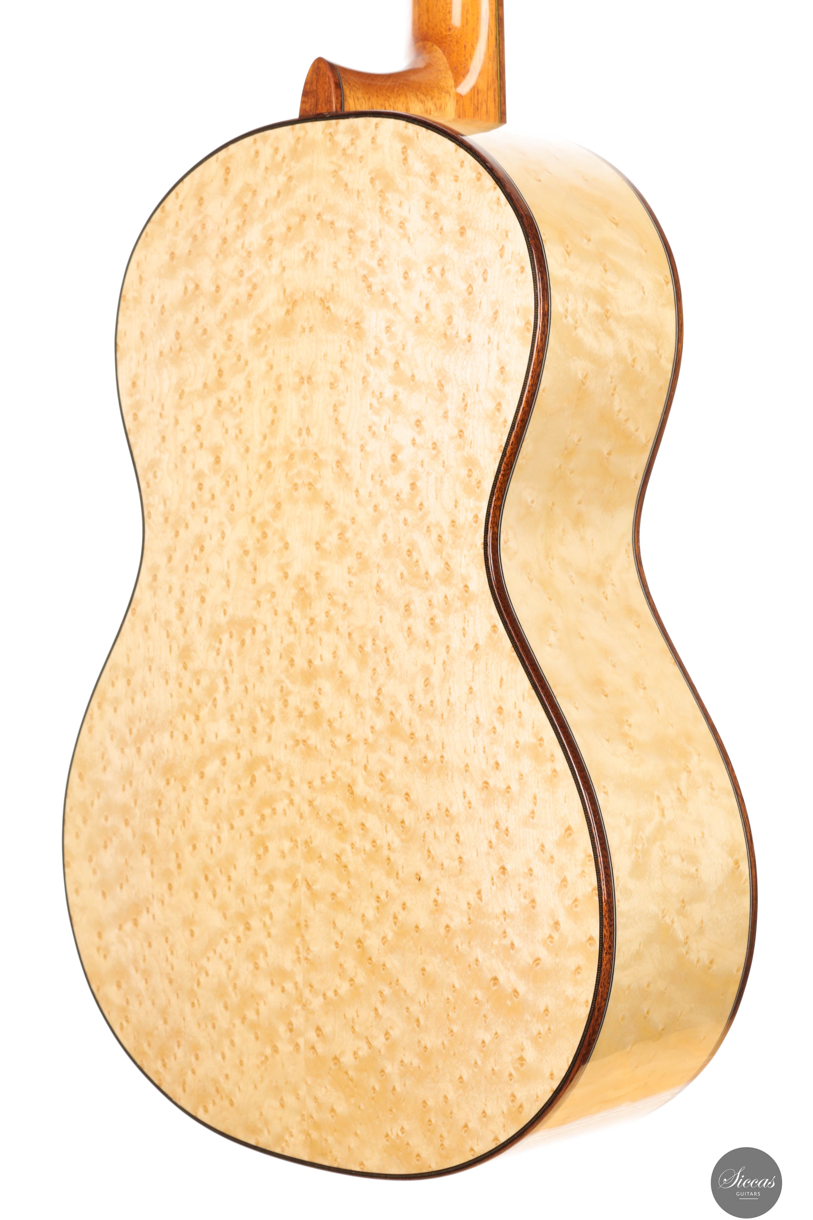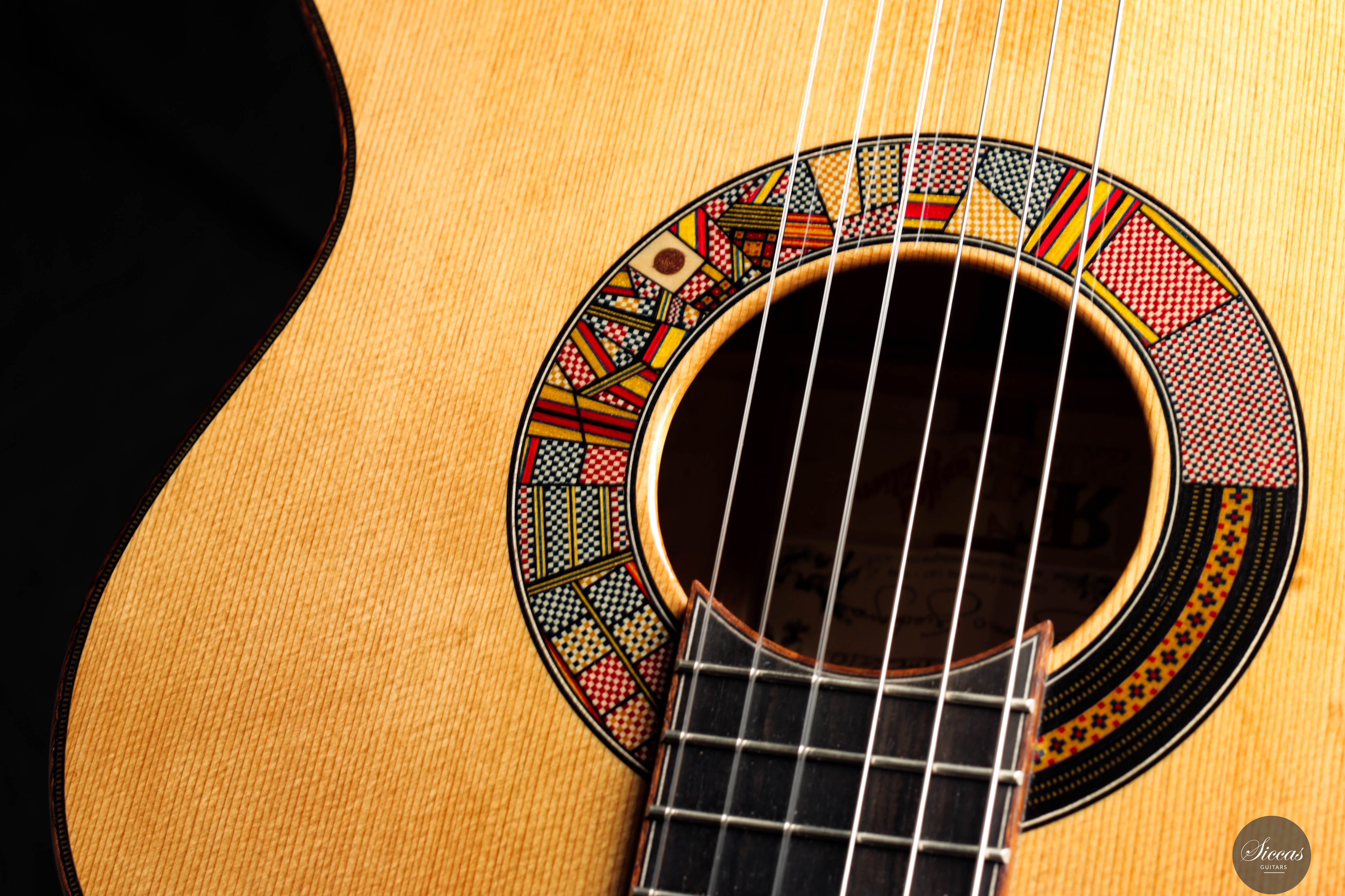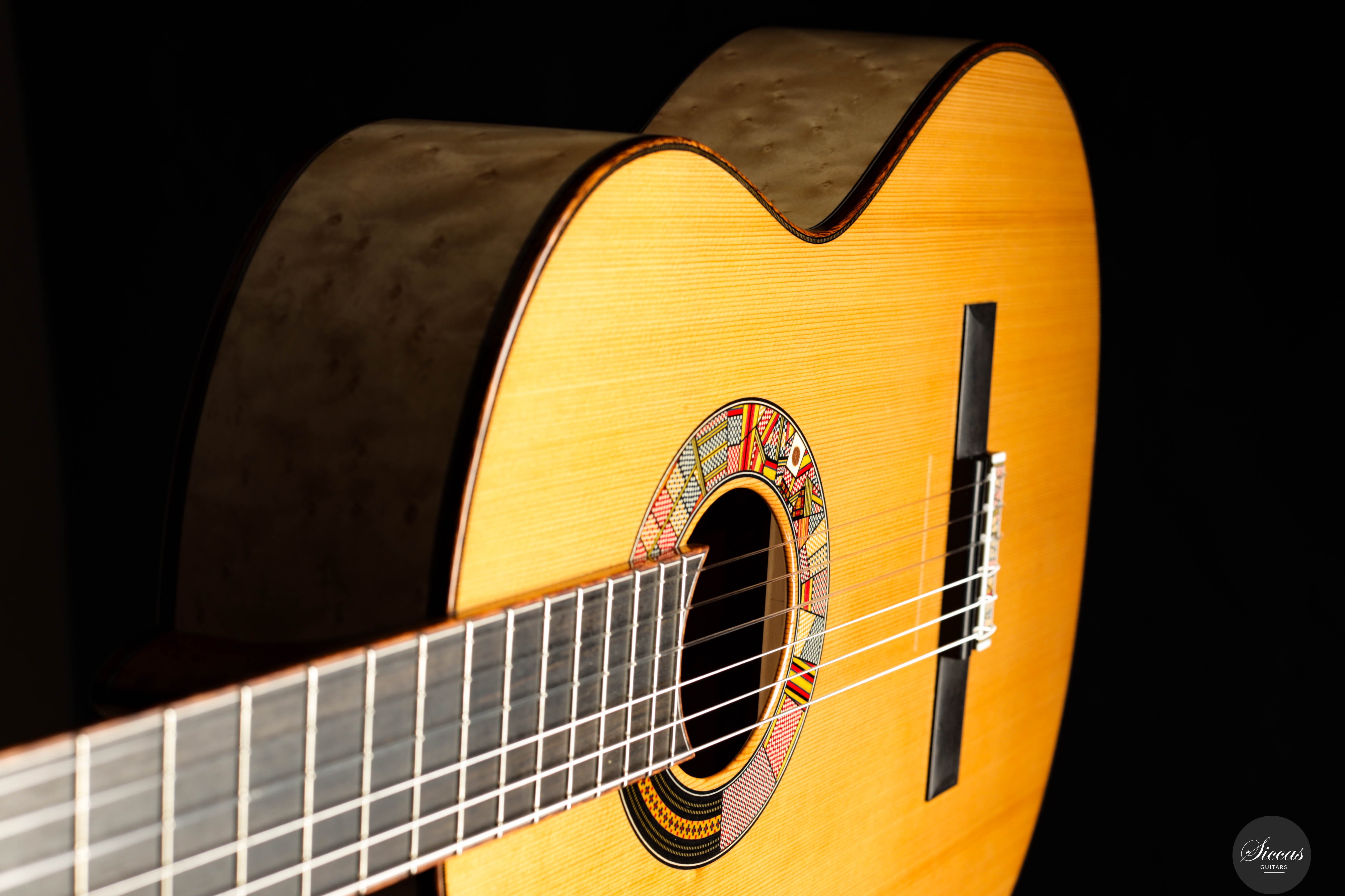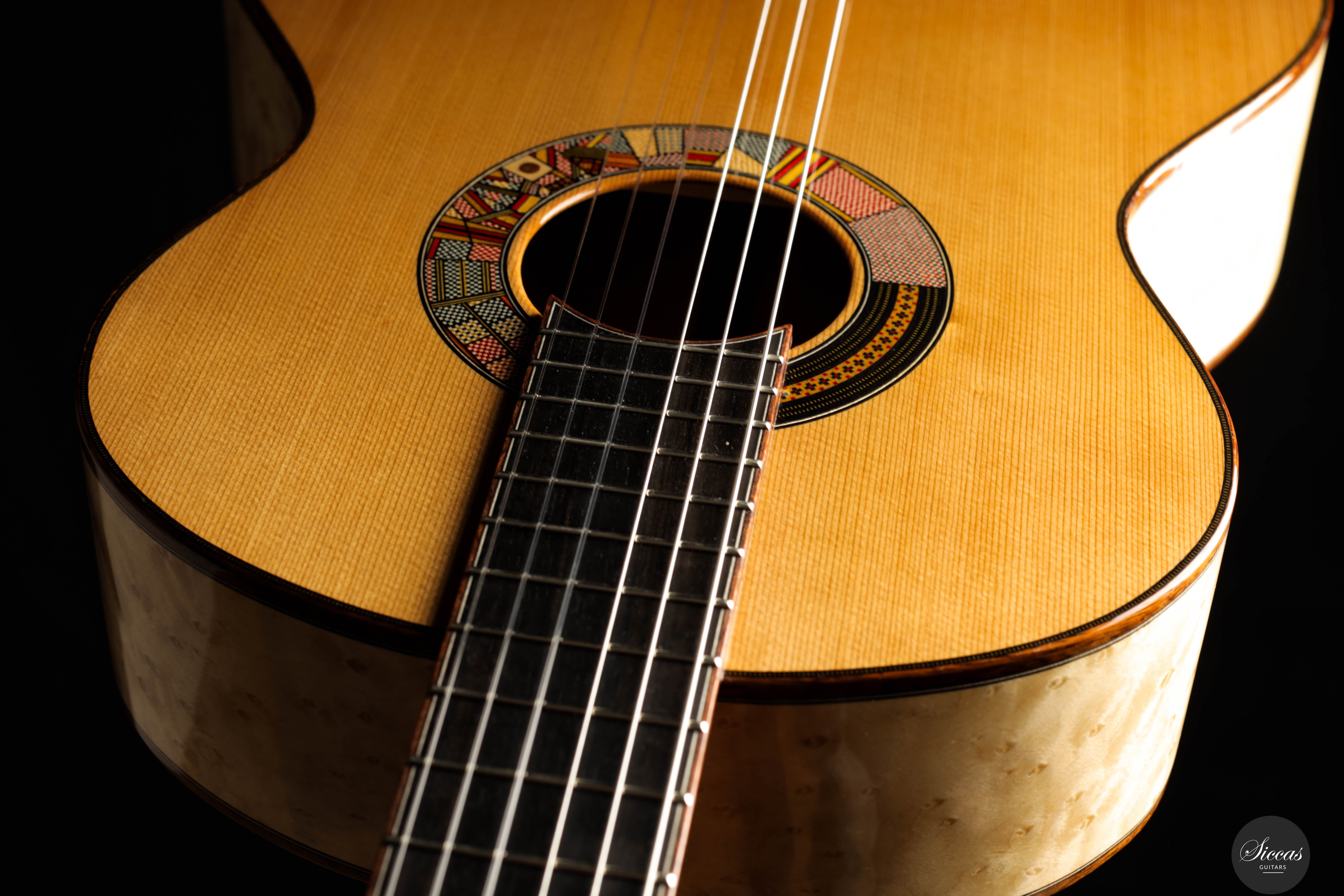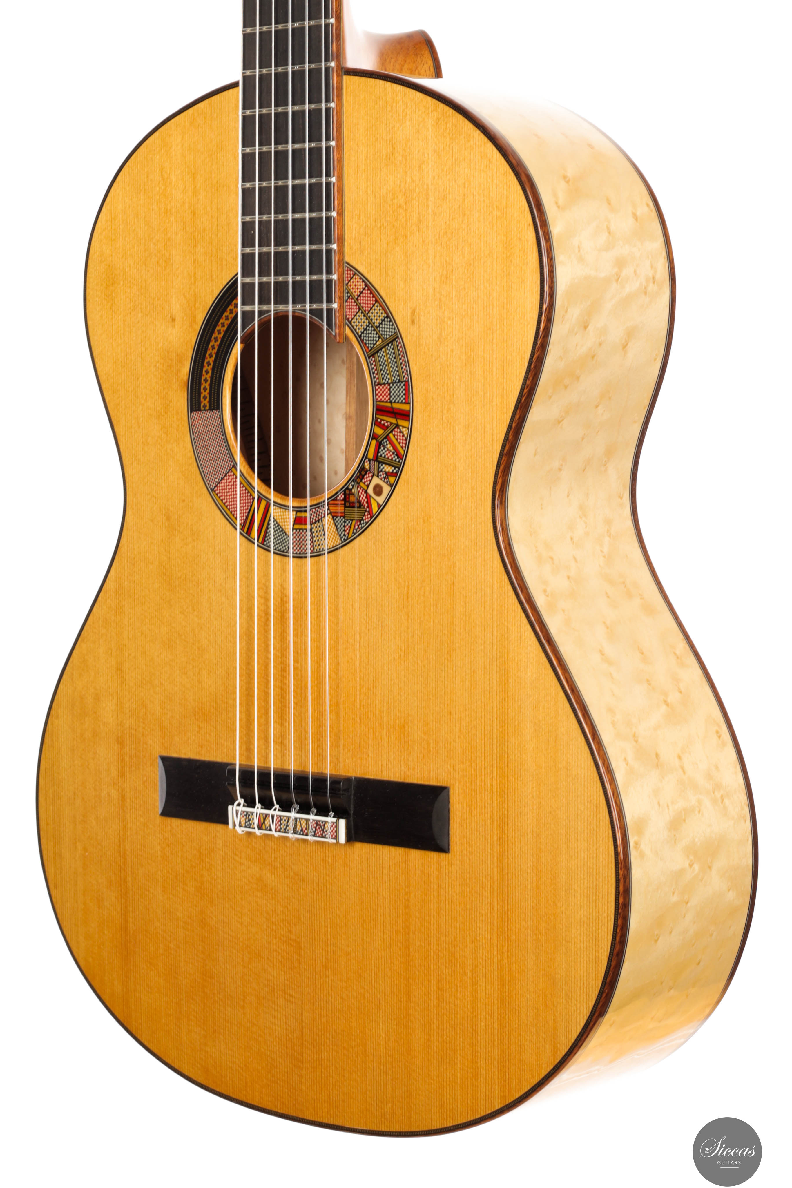 The “Venere Concerto” is a concert model entirely designed by Giacomo Guadagna. It features a traditional seven-fan bracing system and was developed to achieve a perfect tonal balance, where neither basses nor trebles dominate. This REG 2025 Limited Edition is equipped with a torrefied Italian spruce top and birdseye maple back and sides, creating a clear and resonant tone with excellent projection. Visually, the guitar stands out for its richly detailed aesthetic. The elaborate rosette is inspired by traditional Sicilian majolica (tin-glazed pottery) and features a mosaic-like composition, which is echoed in the tie block and fine purfling along the body and fretboard. The fretboard itself features a delicate purfling and binding, adding to the overall elegance of the instrument. The birdseye maple used for the back and sides serves as a final visual flourish — a vibrant, natural pattern that gives the instrument both character and individuality. With remarkable projection, tonal clarity, and a distinctly Mediterranean visual identity, this REG 2025 Limited Edition is a superb example of Giacomo Guadagna’s artistry.