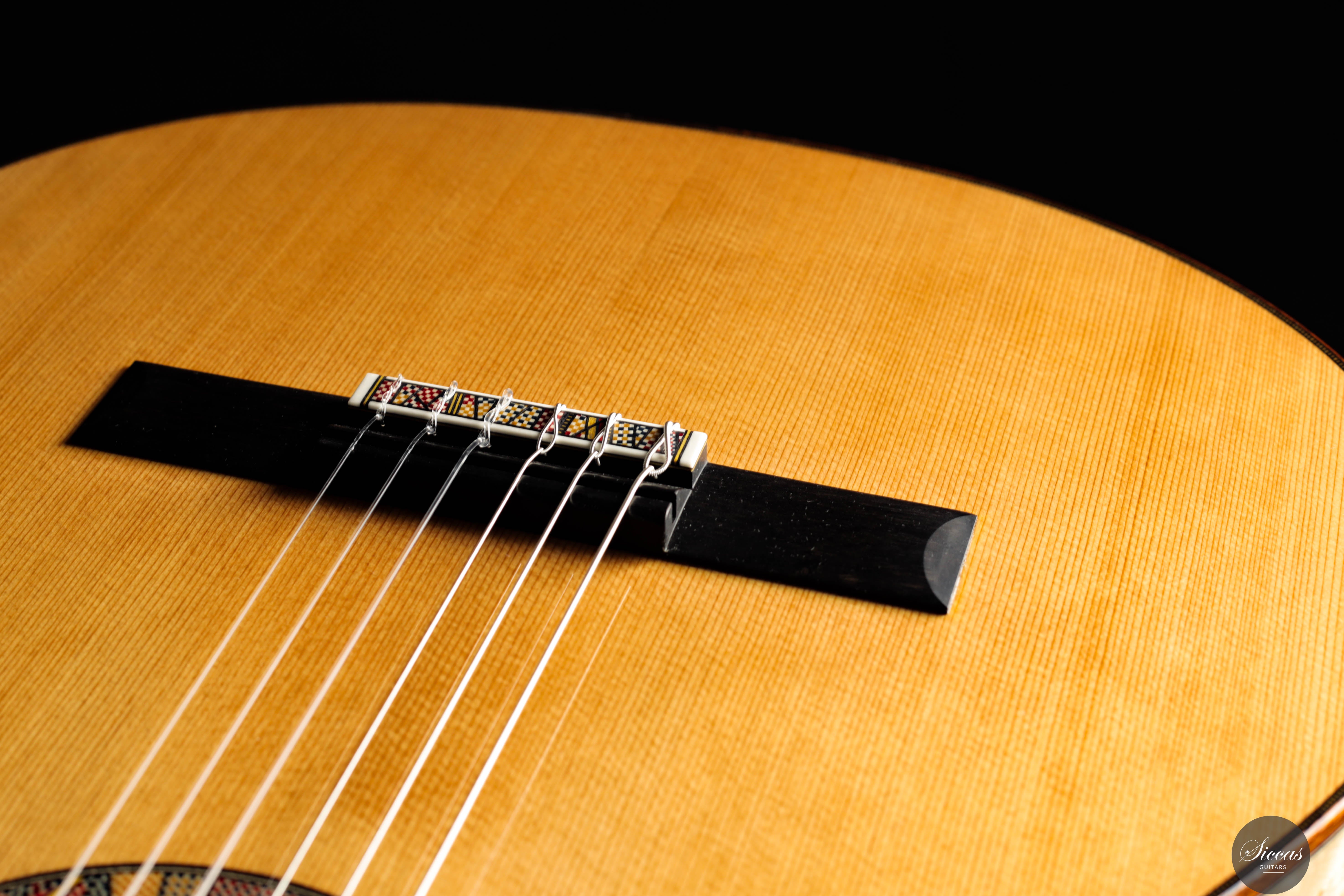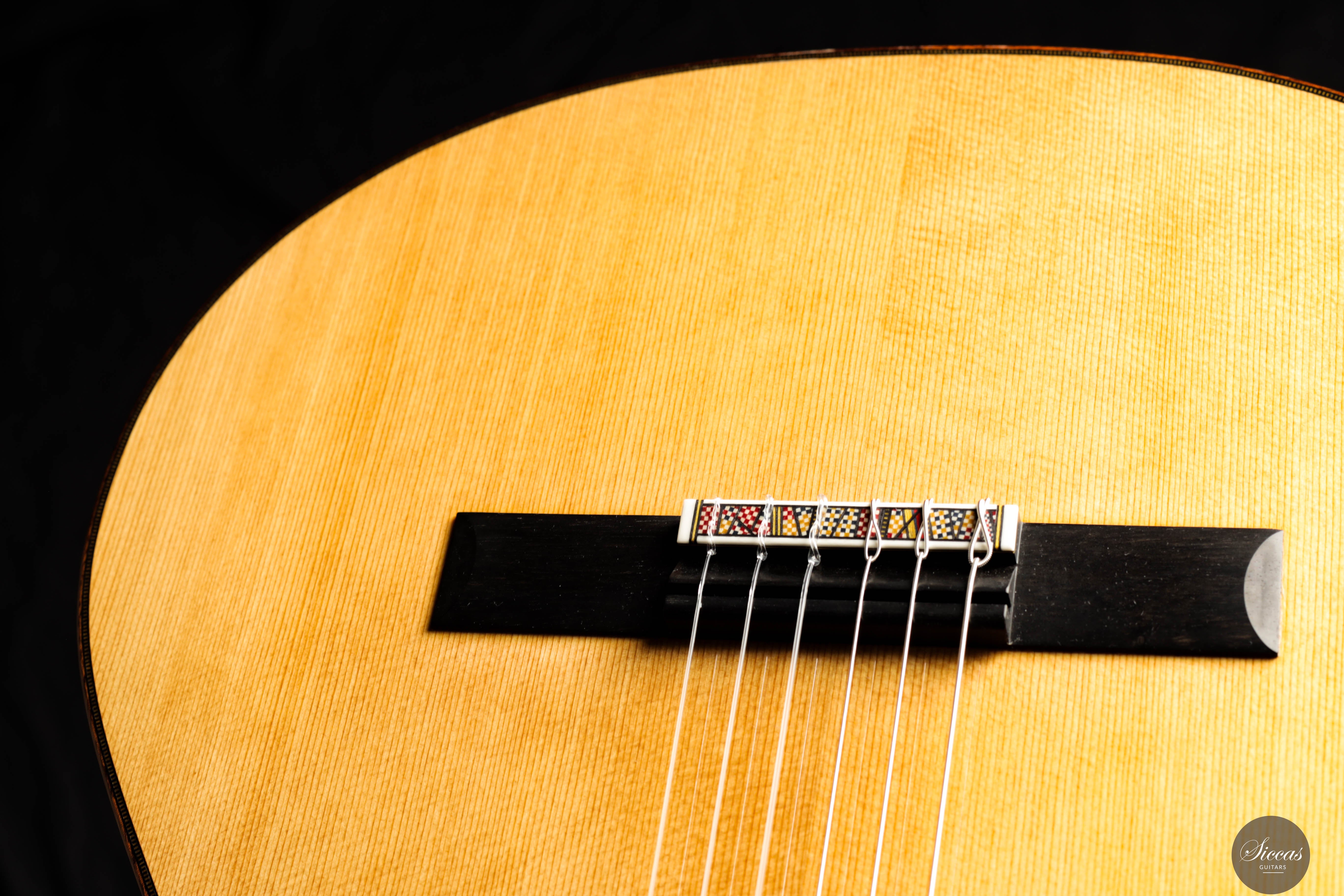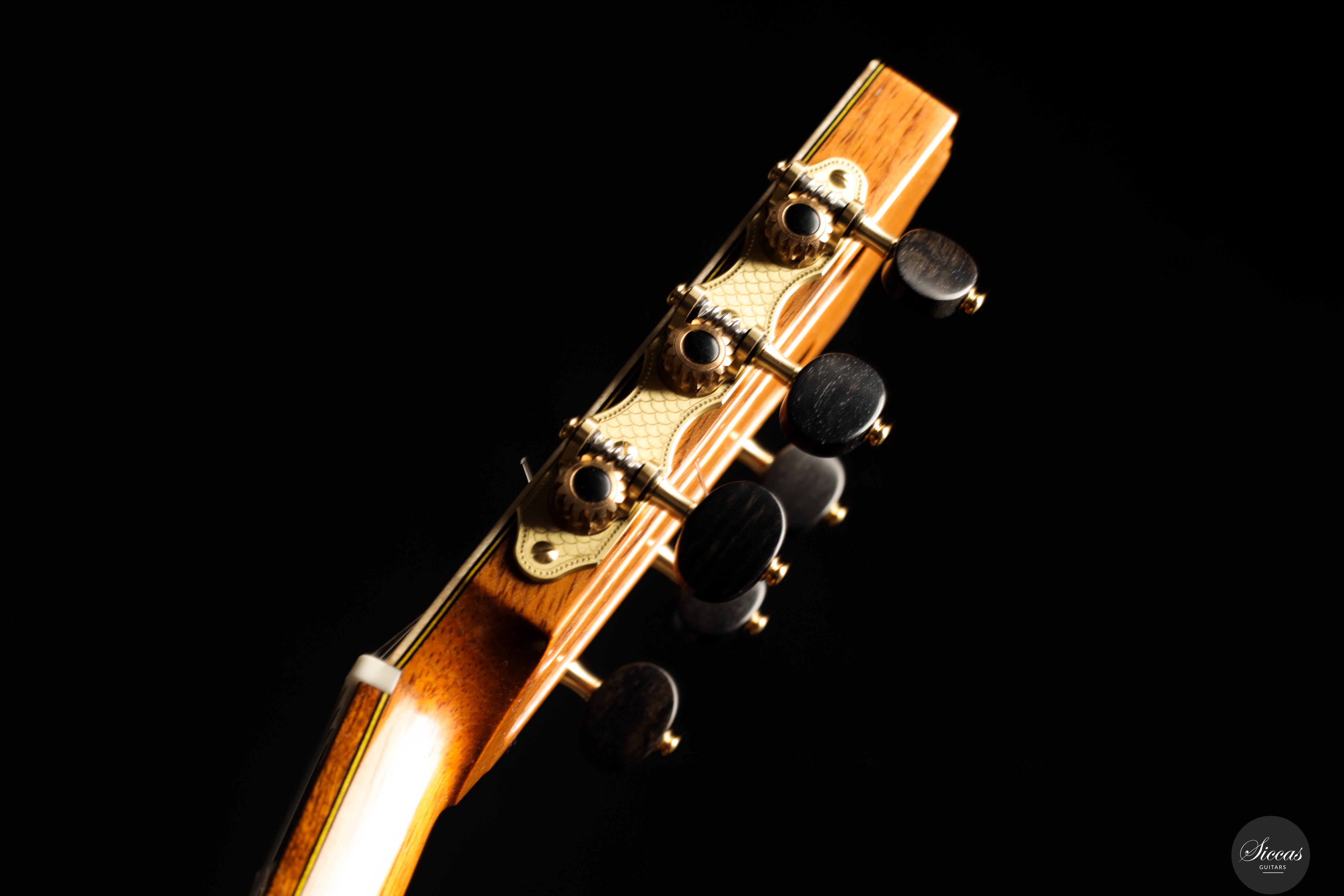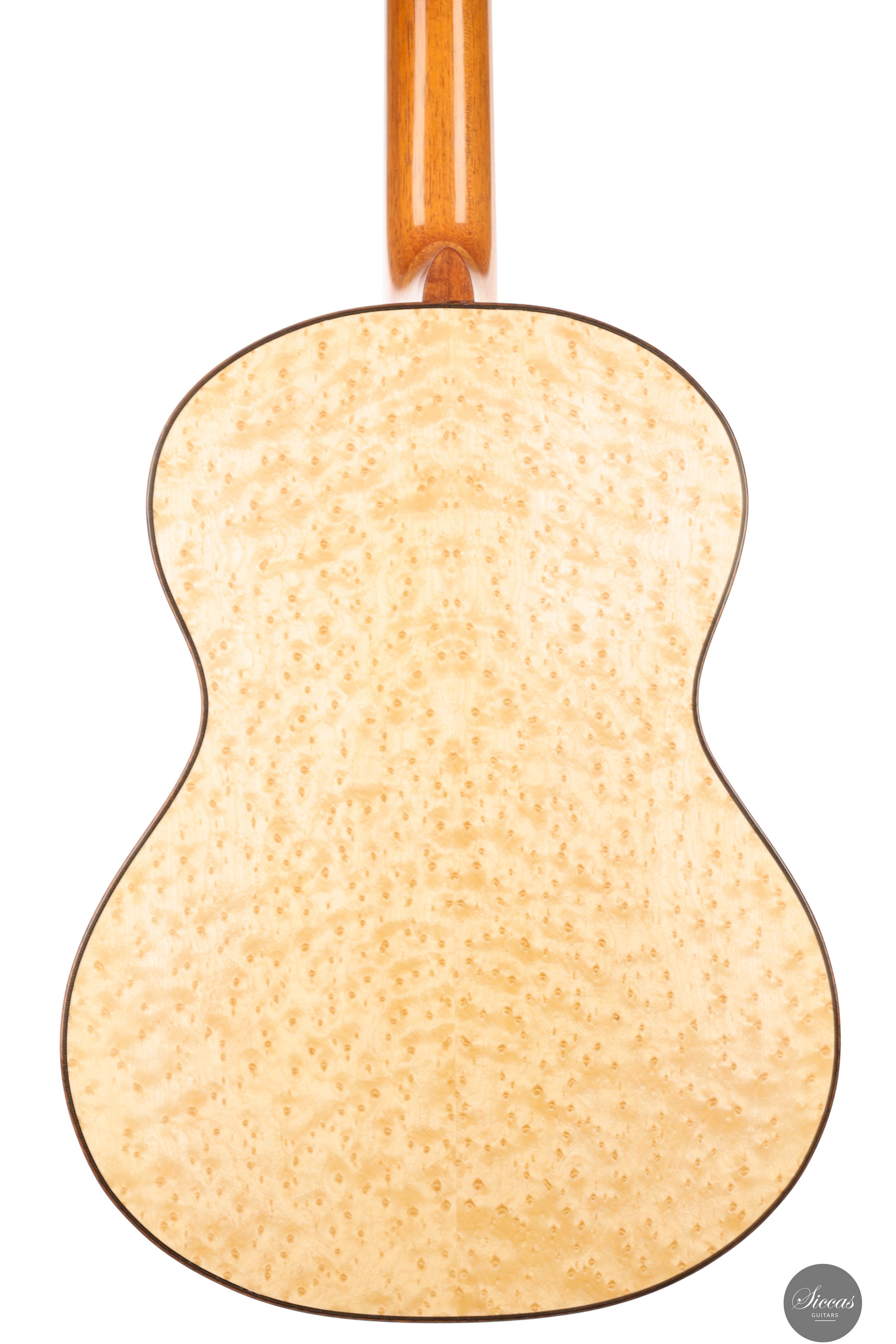 The “Venere Concerto” is a concert model entirely designed by Giacomo Guadagna. It features a traditional seven-fan bracing system and was developed to achieve a perfect tonal balance, where neither basses nor trebles dominate. This REG 2025 Limited Edition is equipped with a torrefied Italian spruce top and birdseye maple back and sides, creating a clear and resonant tone with excellent projection. Visually, the guitar stands out for its richly detailed aesthetic. The elaborate rosette is inspired by traditional Sicilian majolica (tin-glazed pottery) and features a mosaic-like composition, which is echoed in the tie block and fine purfling along the body and fretboard. The fretboard itself features a delicate purfling and binding, adding to the overall elegance of the instrument. The birdseye maple used for the back and sides serves as a final visual flourish — a vibrant, natural pattern that gives the instrument both character and individuality. With remarkable projection, tonal clarity, and a distinctly Mediterranean visual identity, this REG 2025 Limited Edition is a superb example of Giacomo Guadagna’s artistry.