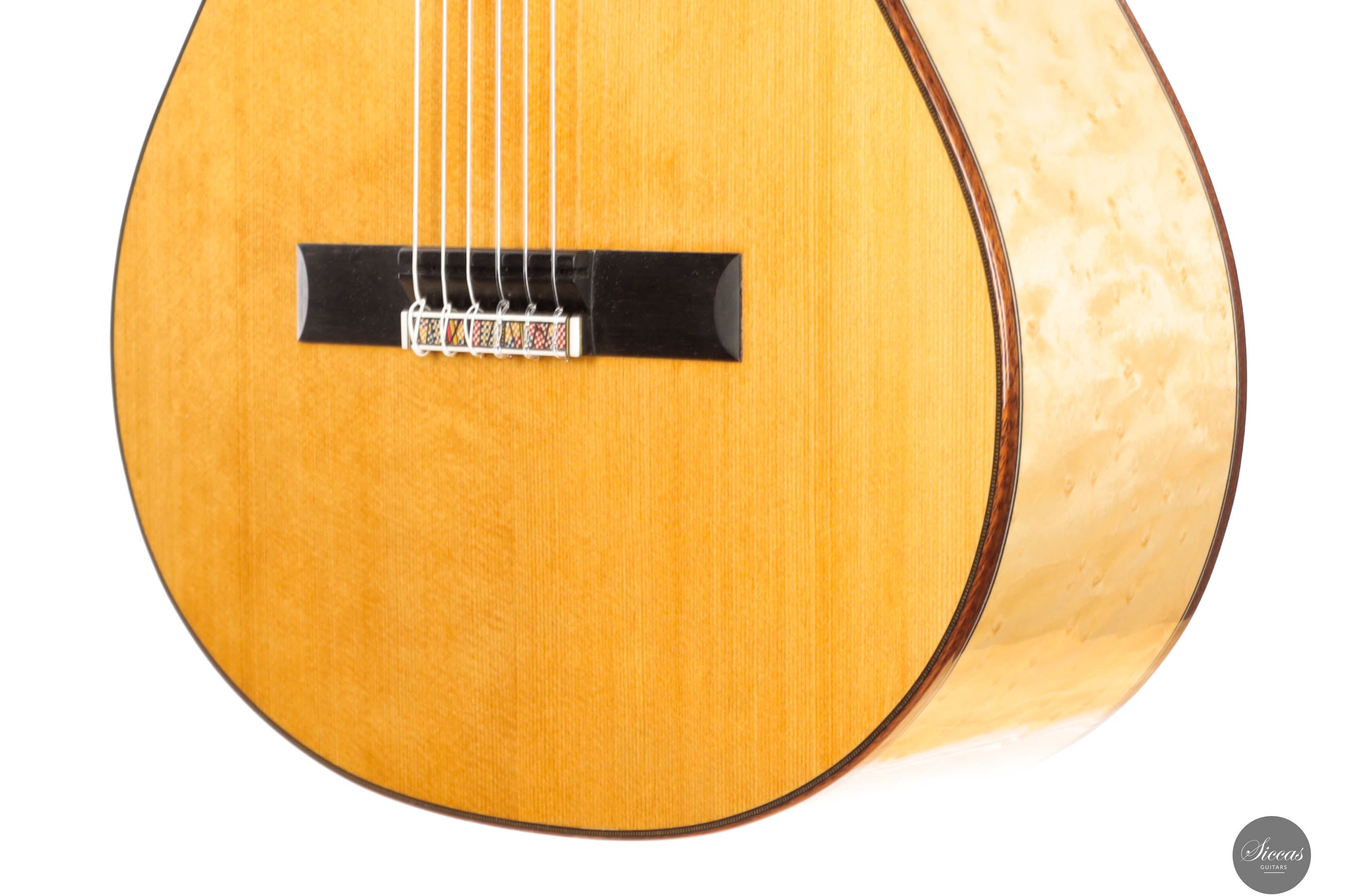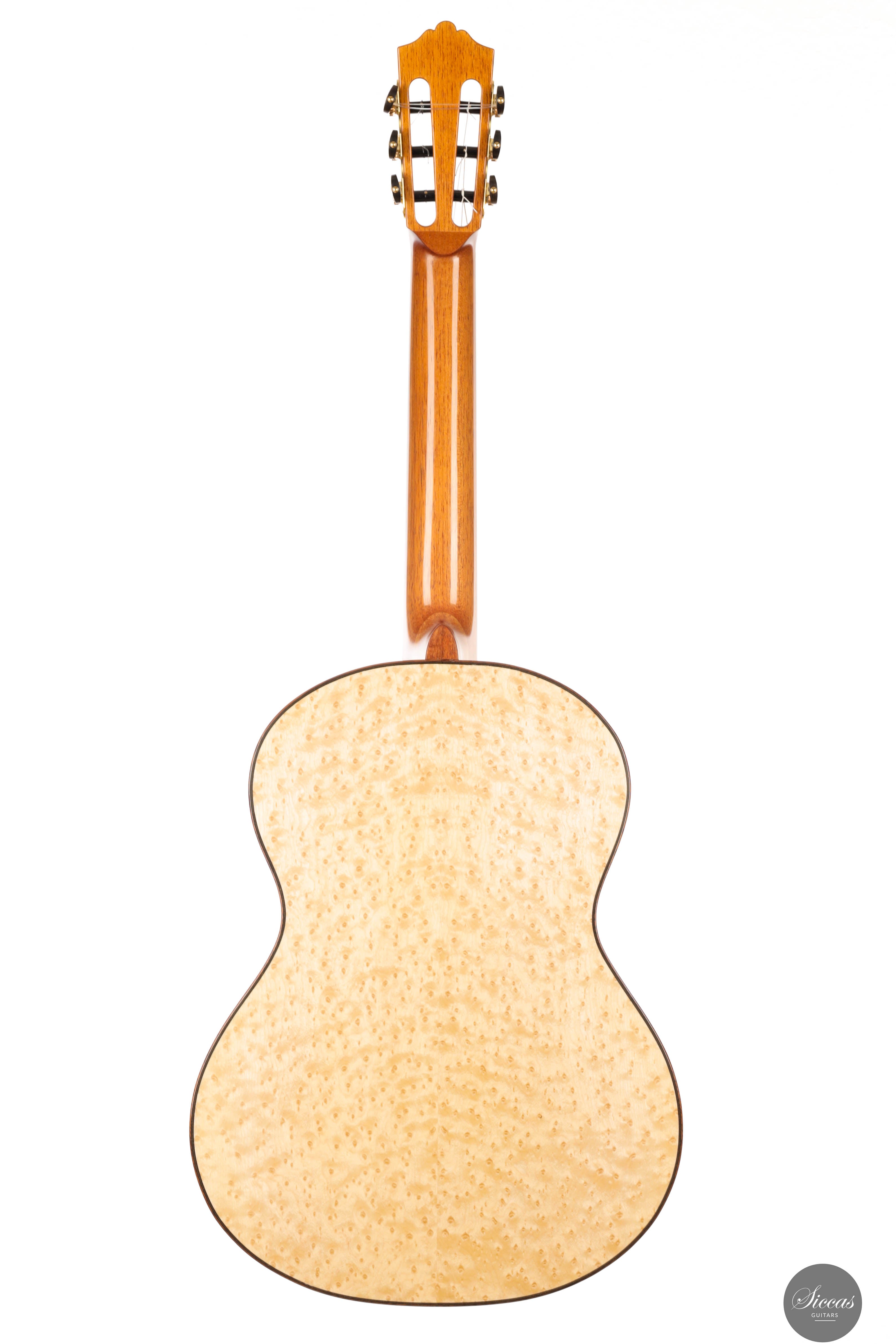 The Giacomo Guadagna “Venere Concerto” REG 2025 Limited Edition is a concert guitar that blends traditional craftsmanship with a distinctive Mediterranean character. Built with a torrefied Italian spruce top and birdseye maple back and sides, it offers a clear, resonant voice with excellent projection and tonal balance across all registers. The seven-fan bracing supports both depth and clarity, ensuring neither bass nor treble dominates. A richly decorated rosette inspired by Sicilian majolica sets the visual tone, echoed in the tie block, purfling, and fretboard detailing. The striking maple grain further enhances its individuality, making this guitar a refined expression of Guadagna’s artistic vision.