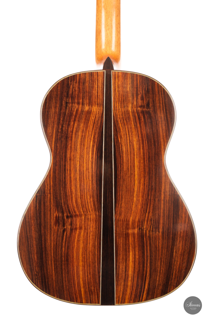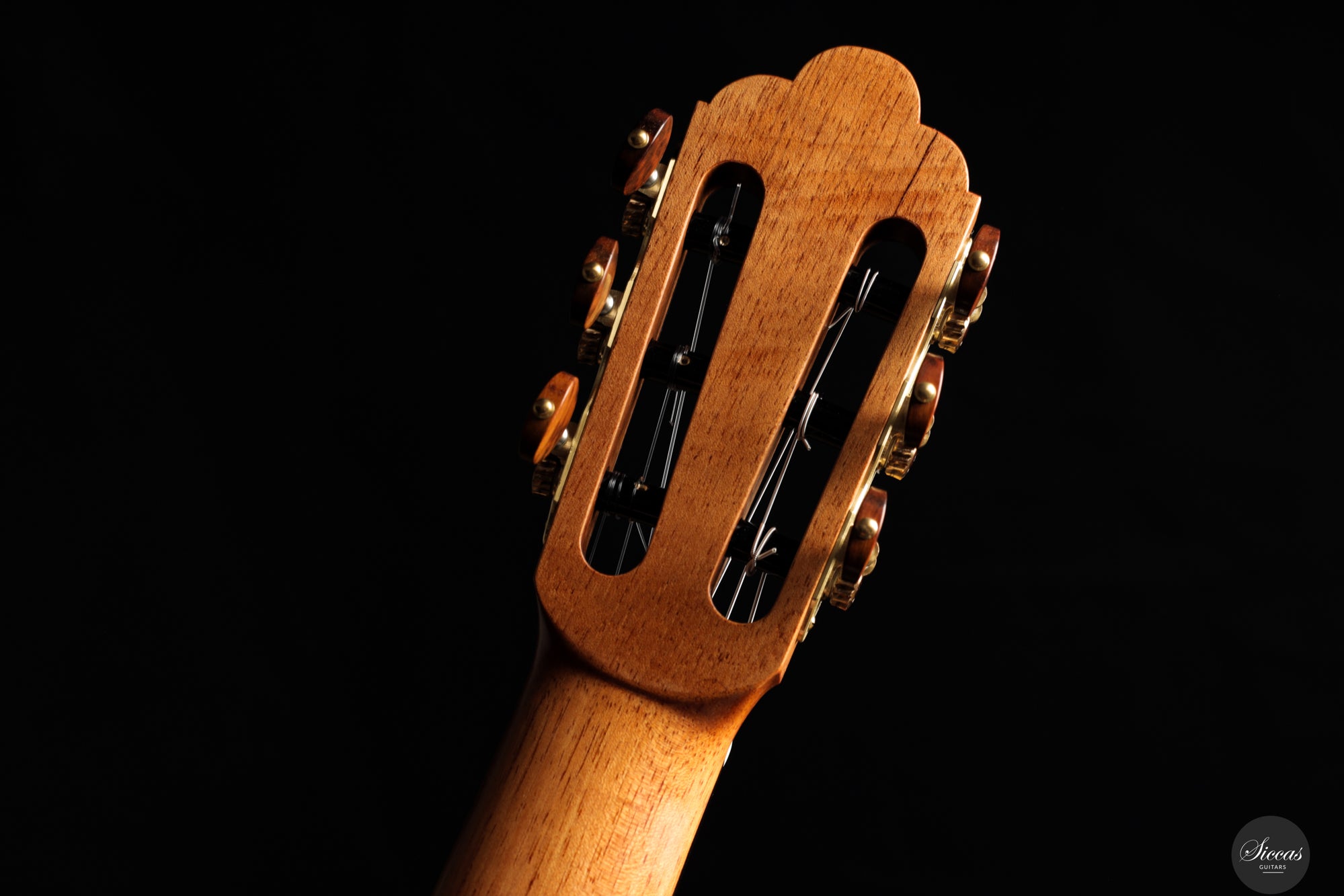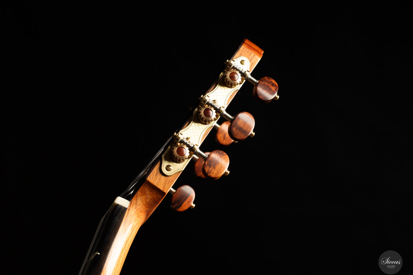 This 2025 instrument, labeled “Alcione,” belongs to Nannoni’s contemporary model line. The name Alcione refers to Greek mythology and the myth of the Pleiades, seven sisters transformed into stars to guide fishermen, a symbolic connection between music, light, and navigation. The guitar is built entirely in wood, following Nannoni’s long-established lattice concept. In this case, the bracing consists of five traditional bars combined with four additional, very thin struts rotated 180 degrees and placed underneath, a design that enhances both resonance and structural efficiency. The soundboard is made of spruce, paired with cocobolo for the back and sides, producing a rich blend of brightness and depth. With an air resonance between F sharp and G and a weight of only 1560 grams, the guitar responds quickly while maintaining a warm, singing character. The French polish finish brings out the elegance of the tonewoods, while the neck and ebony fingerboard ensure stability and comfort. The guitar is fitted with Alessi tuning machines, featuring finely engraved “fish scale” motifs, adding a touch of artistry to the overall aesthetic. With its refined construction, unique bracing concept, and contemporary character, this Nannoni Alcione offers a compelling balance of modern playability and traditional tonal beauty.