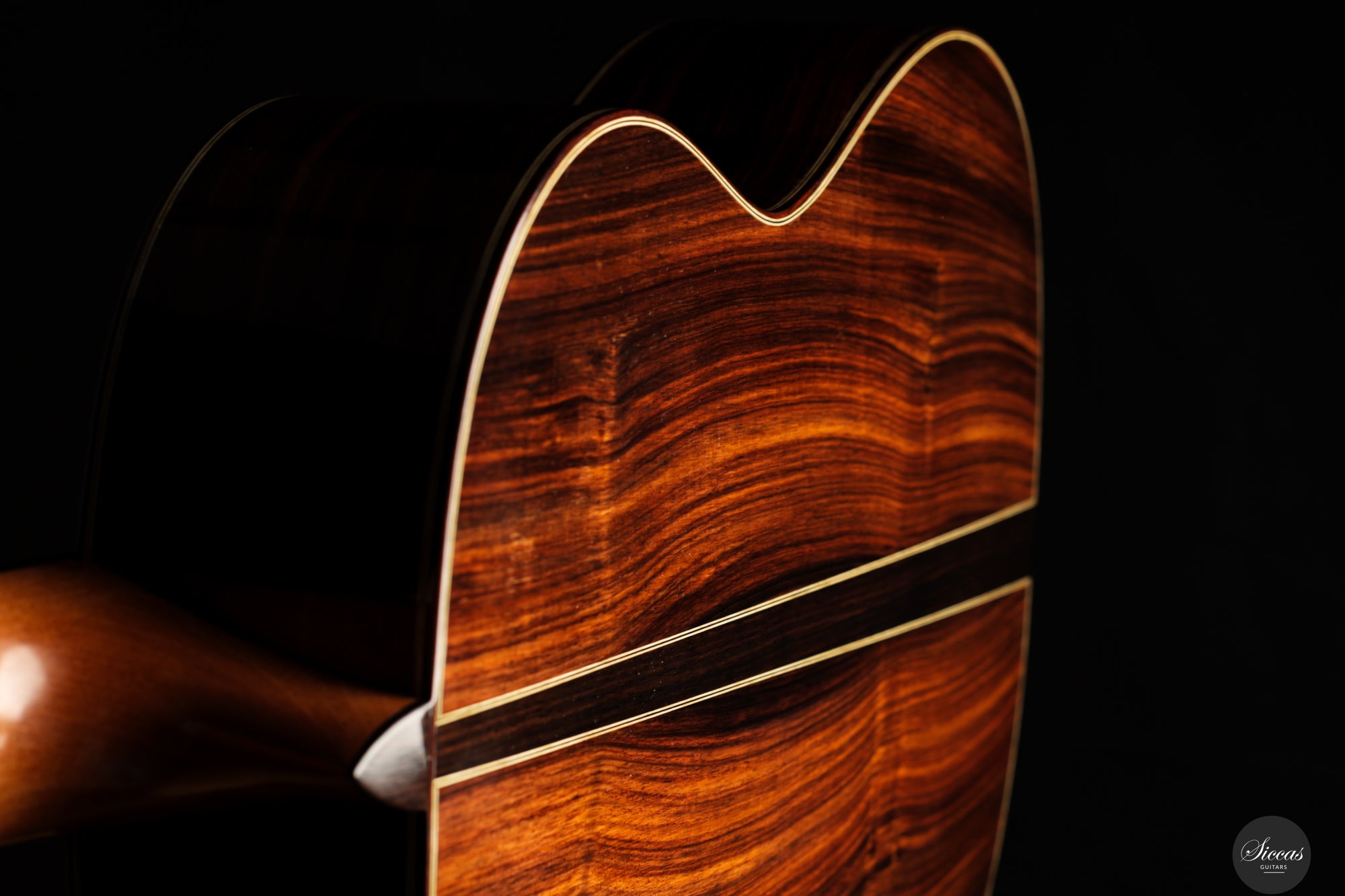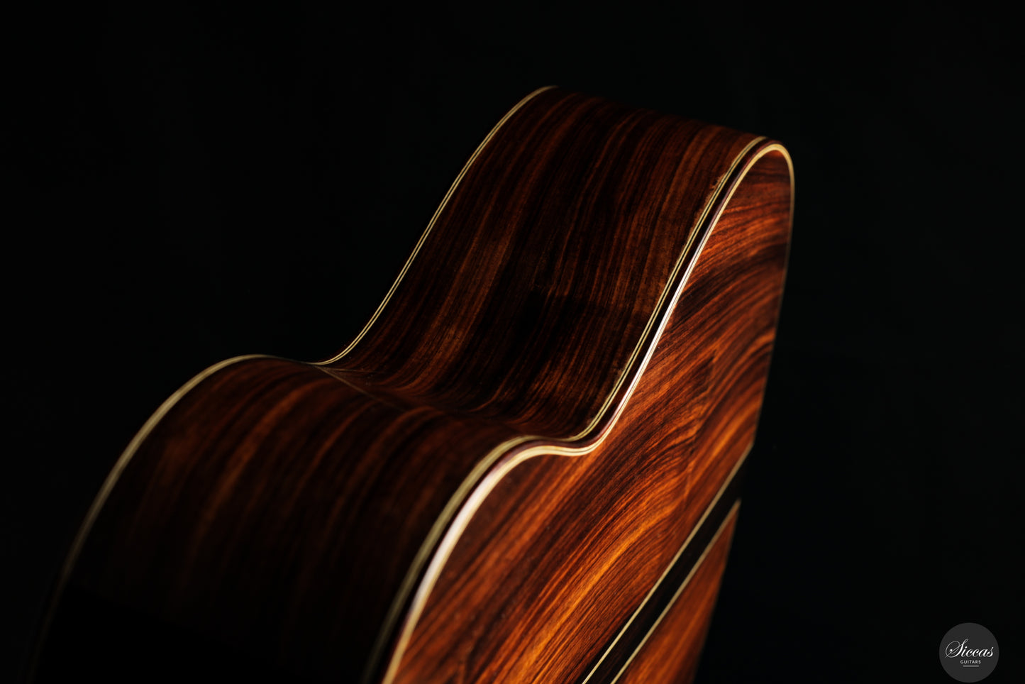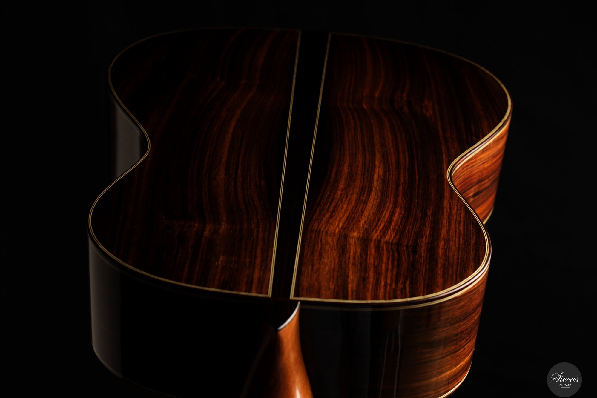This 2025 instrument, labeled “Alcione,” belongs to Nannoni’s contemporary model line. The name Alcione refers to Greek mythology and the myth of the Pleiades, seven sisters transformed into stars to guide fishermen, a symbolic connection between music, light, and navigation. The guitar is built entirely in wood, following Nannoni’s long-established lattice concept. In this case, the bracing consists of five traditional bars combined with four additional, very thin struts rotated 180 degrees and placed underneath, a design that enhances both resonance and structural efficiency. The soundboard is made of spruce, paired with cocobolo for the back and sides, producing a rich blend of brightness and depth. With an air resonance between F sharp and G and a weight of only 1560 grams, the guitar responds quickly while maintaining a warm, singing character. The French polish finish brings out the elegance of the tonewoods, while the neck and ebony fingerboard ensure stability and comfort. The guitar is fitted with Alessi tuning machines, featuring finely engraved “fish scale” motifs, adding a touch of artistry to the overall aesthetic. With its refined construction, unique bracing concept, and contemporary character, this Nannoni Alcione offers a compelling balance of modern playability and traditional tonal beauty.