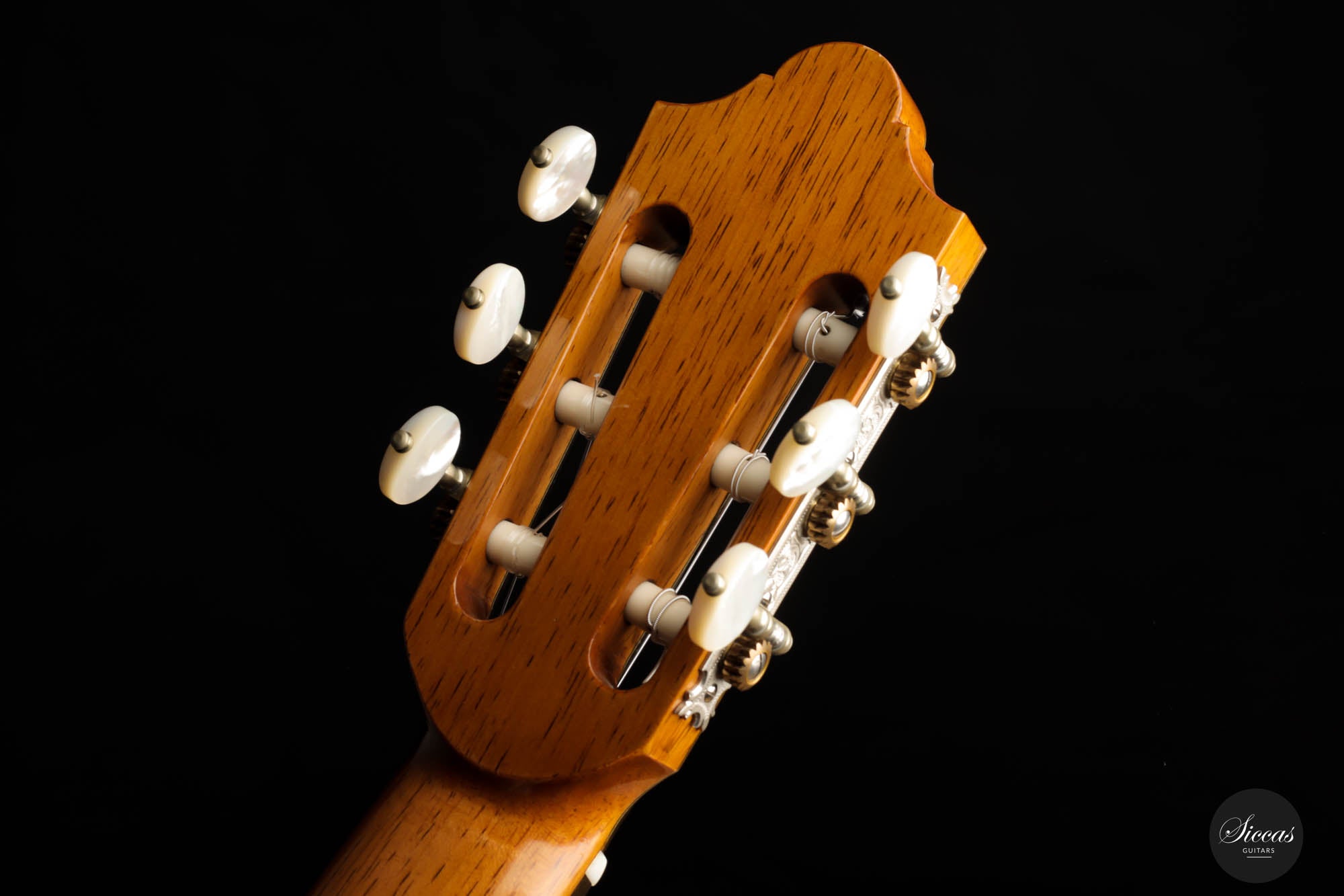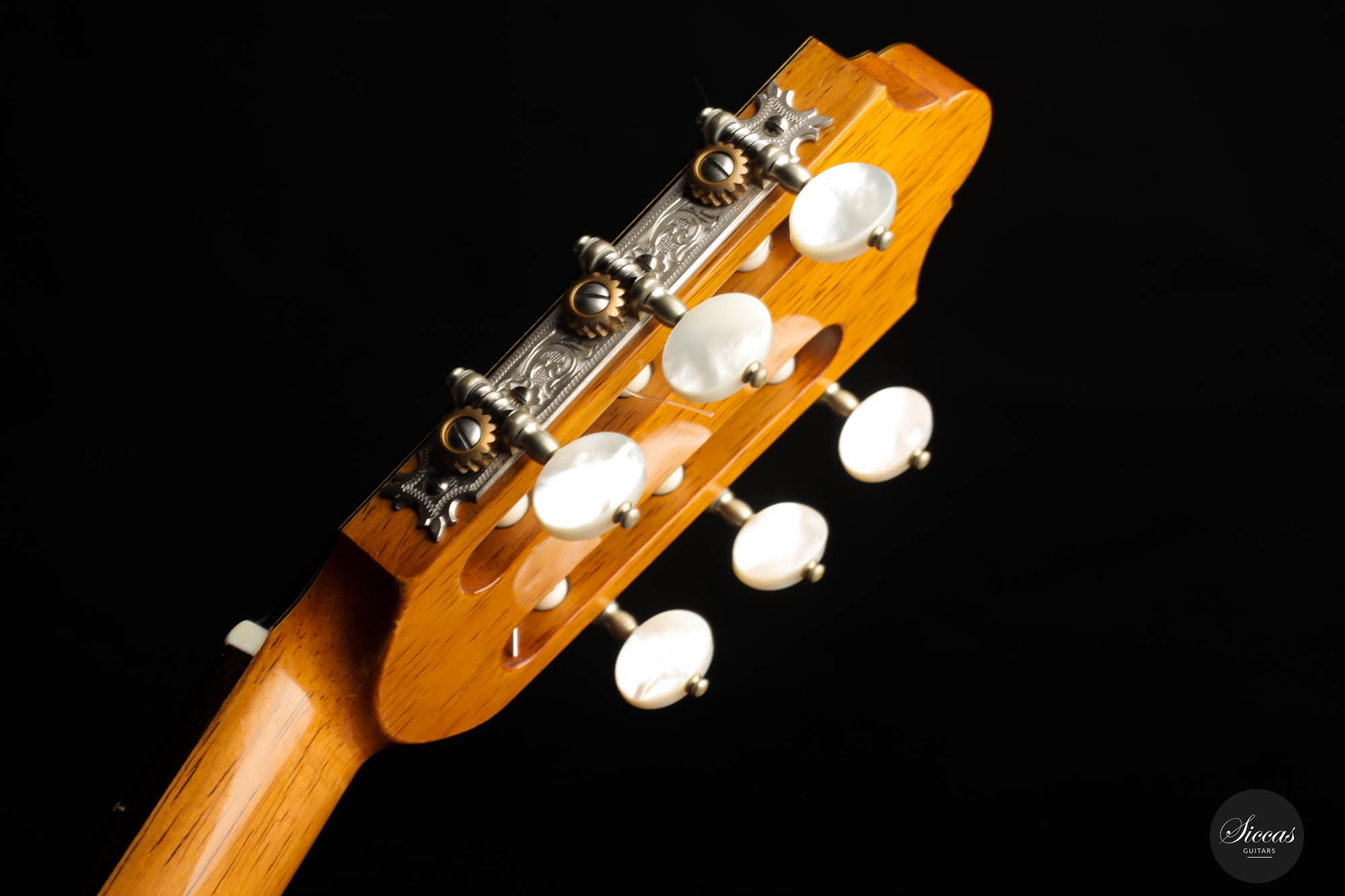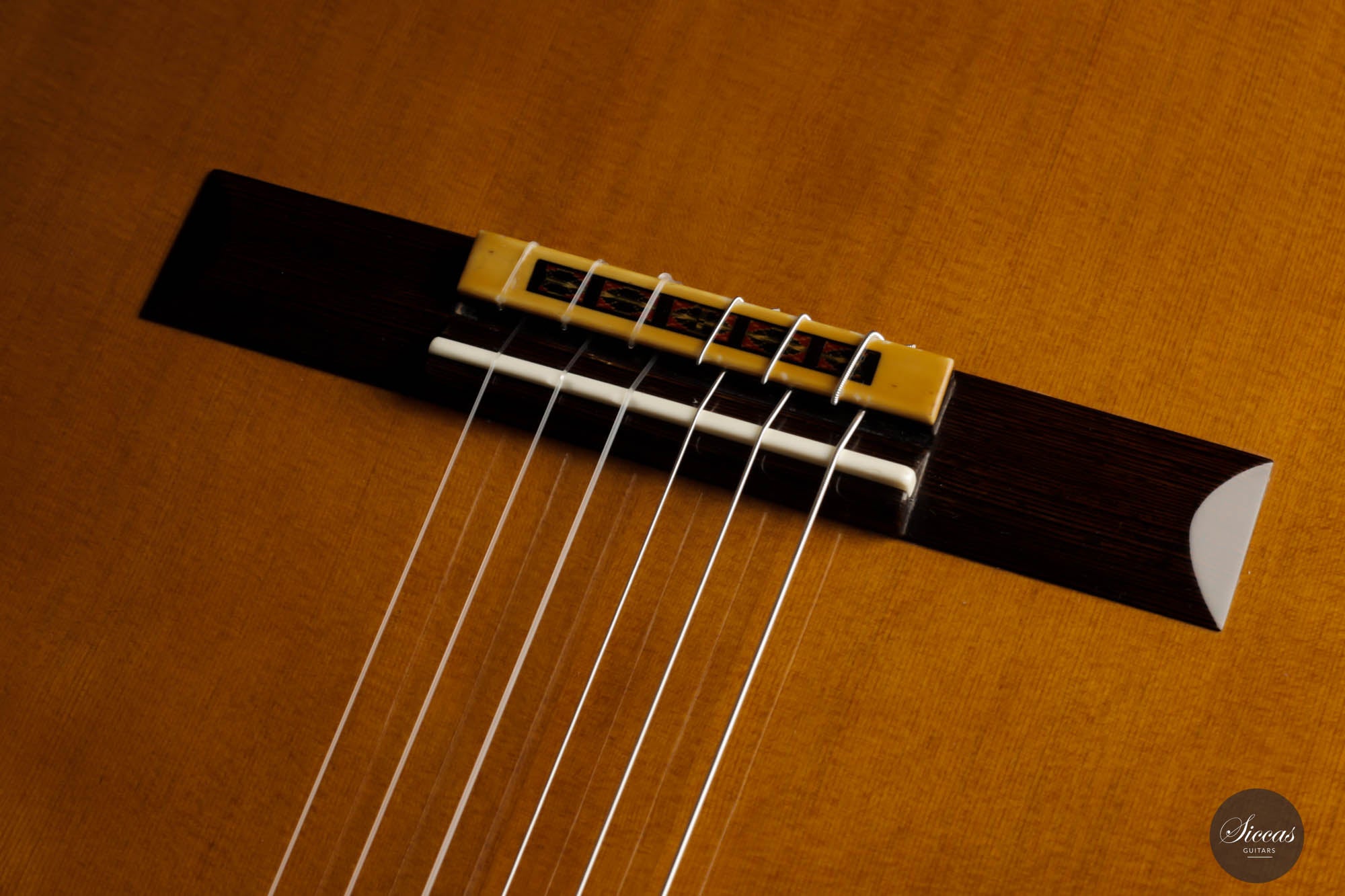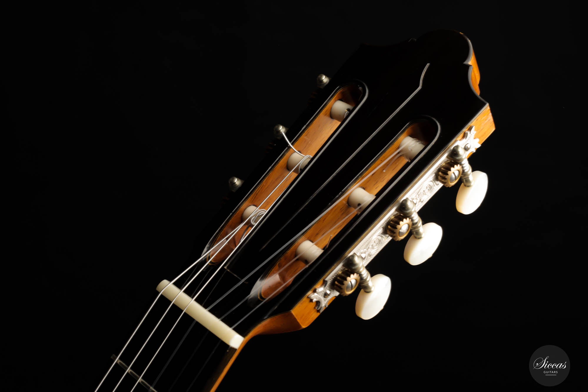 Furthermore, this guitar was colored the same way Daniel Friederich sometimes used to do, making the guitar look a bit more vintage. The rosette is also picked up in the inlay work on the bridge, just a lovely detail with a flawless design. A tricky part of the building process is the execution of the head plate arrow and the elevations around the tuning holes. Giovanni indeed hit the mark with this task. As a pre-loved instrument, this guitar is in beautiful condition with only some minor nail marks. This instrument is a concert guitar full of vibrant sonority in all the voices. Moreover, this instrument represents Daniel Friederich’s guitars in every possible way.
