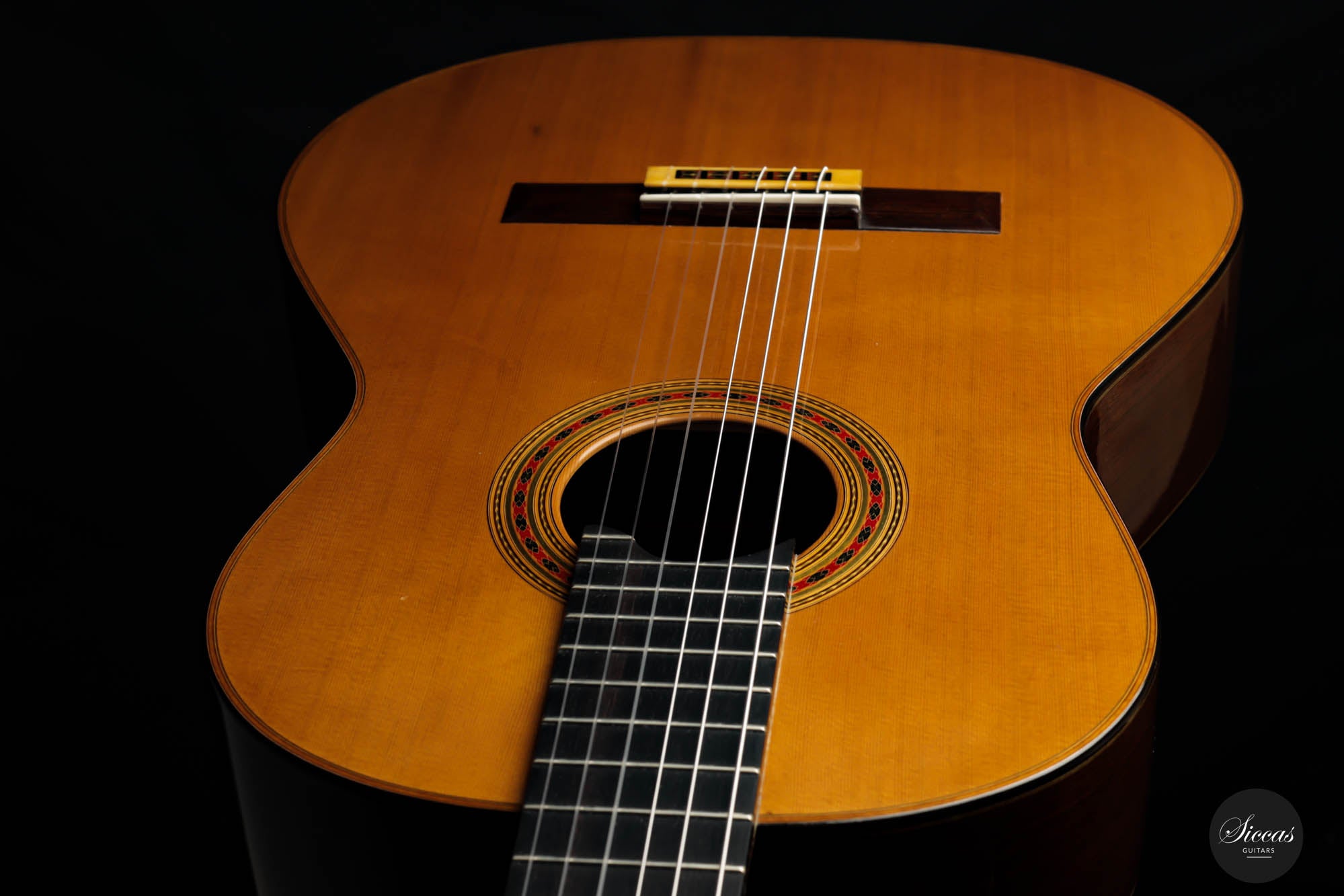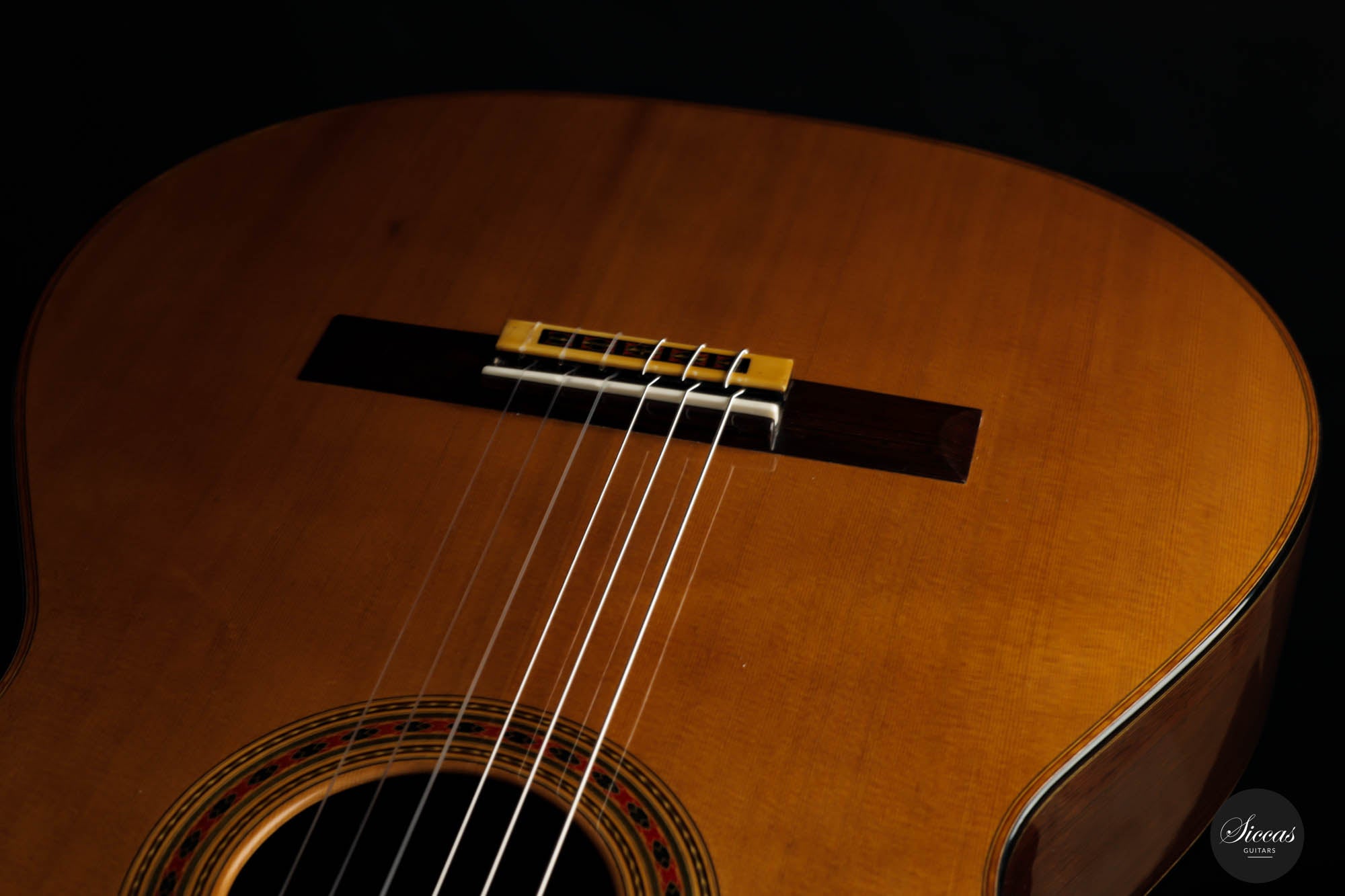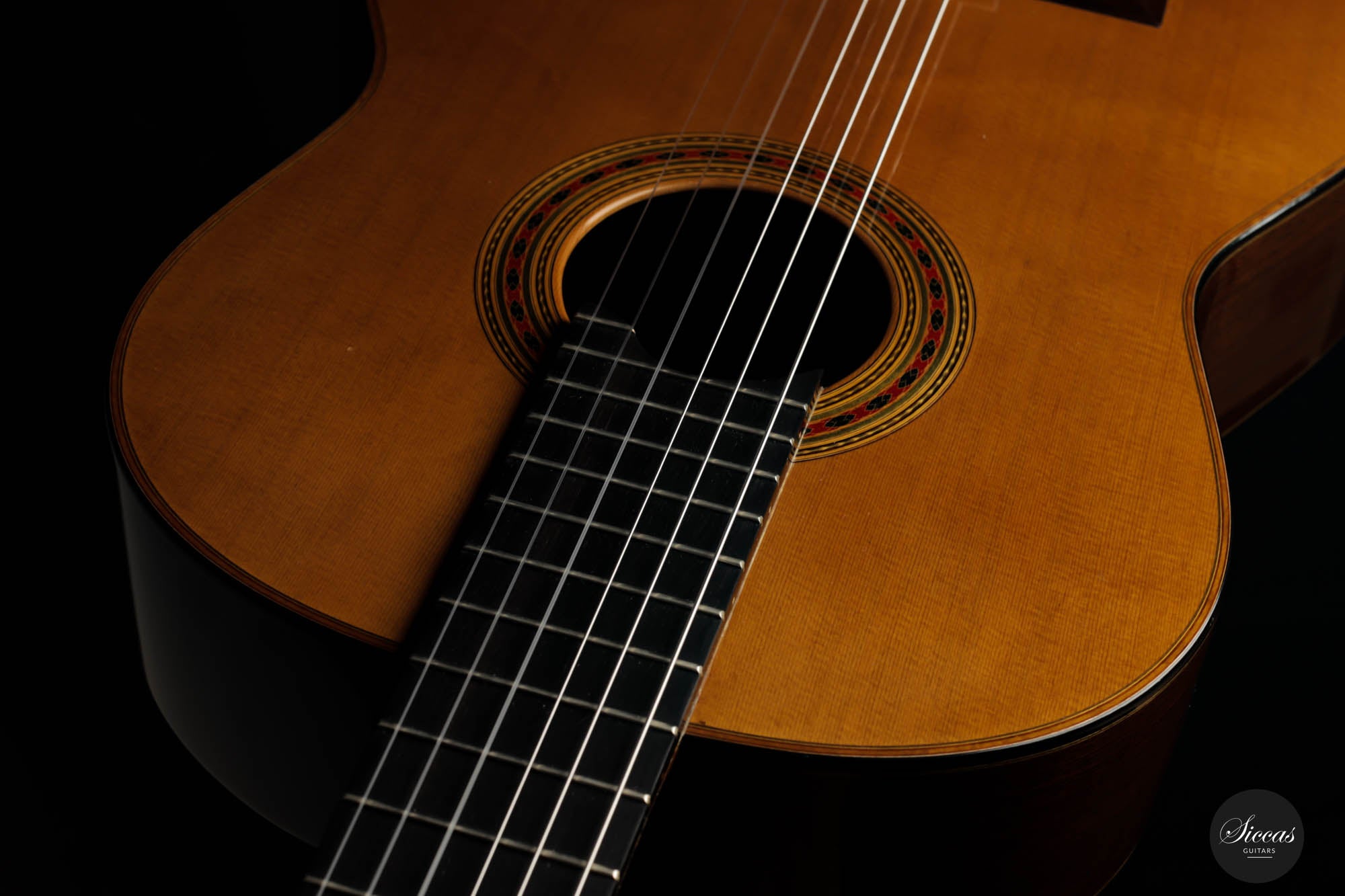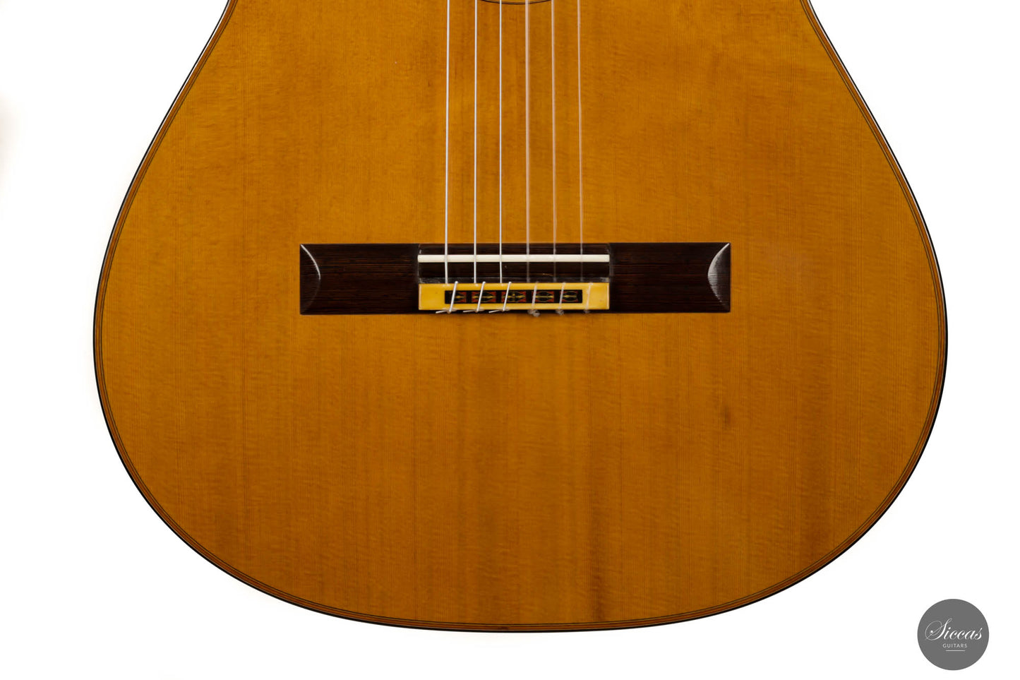 Furthermore, this guitar was colored the same way Daniel Friederich sometimes used to do, making the guitar look a bit more vintage. The rosette is also picked up in the inlay work on the bridge, just a lovely detail with a flawless design. A tricky part of the building process is the execution of the head plate arrow and the elevations around the tuning holes. Giovanni indeed hit the mark with this task. As a pre-loved instrument, this guitar is in beautiful condition with only some minor nail marks. This instrument is a concert guitar full of vibrant sonority in all the voices. Moreover, this instrument represents Daniel Friederich’s guitars in every possible way.