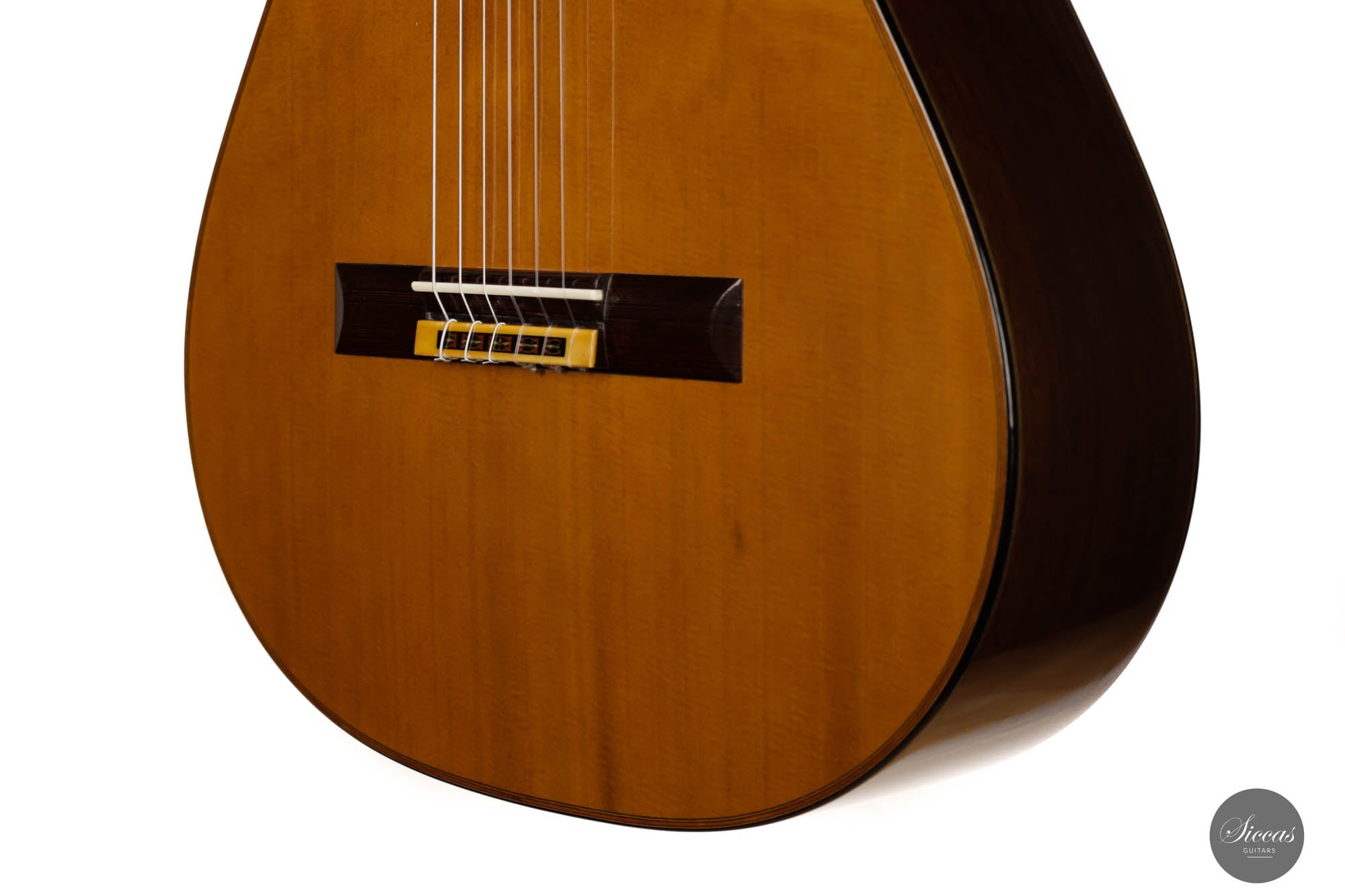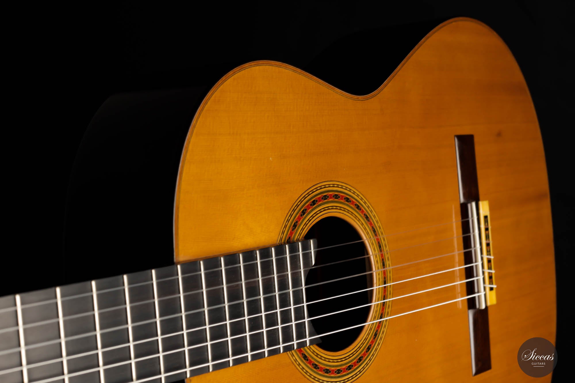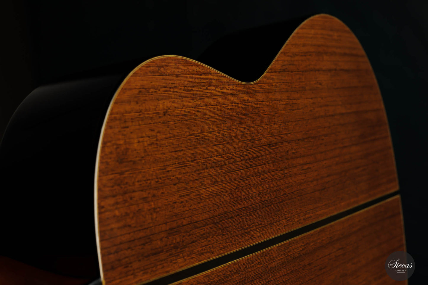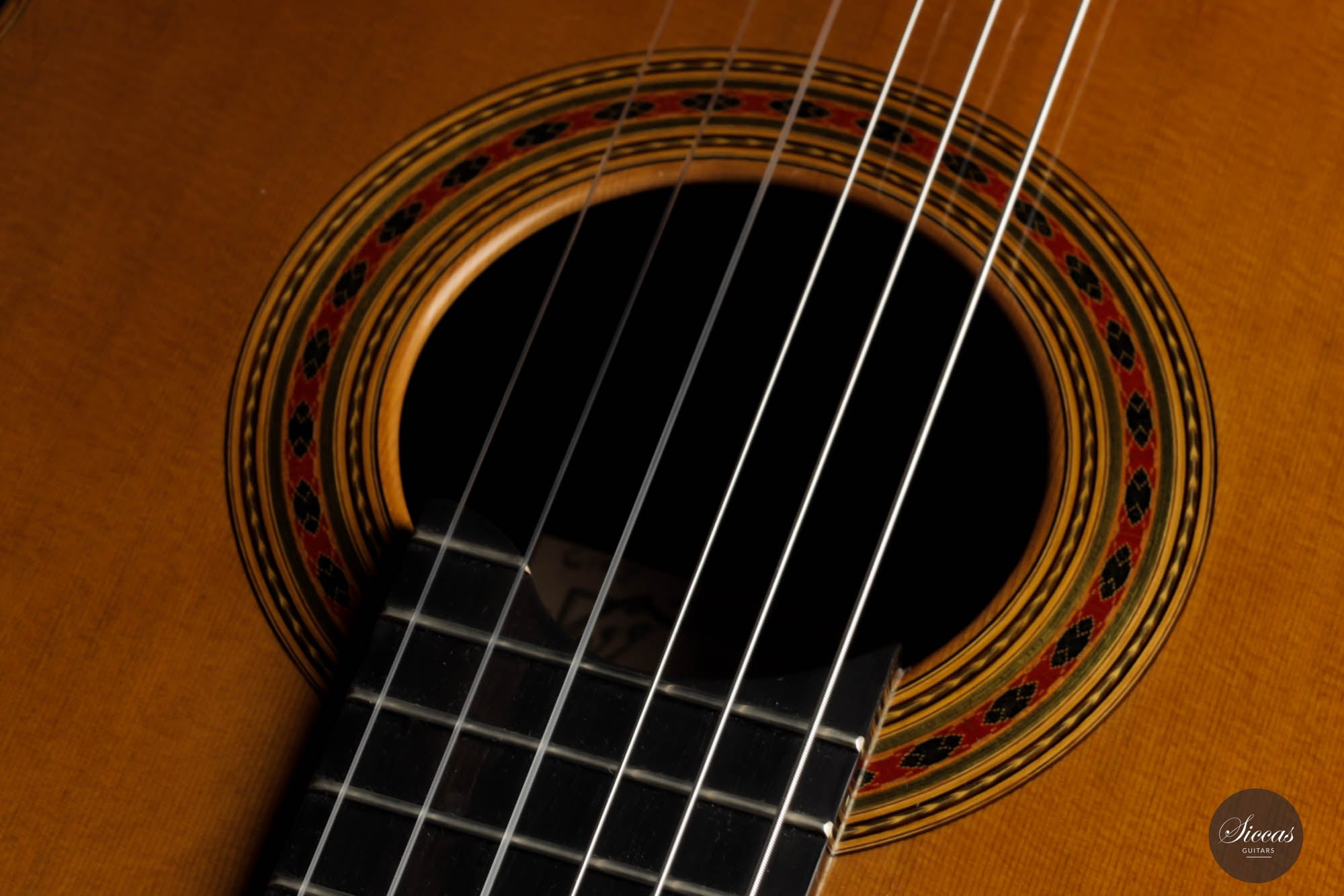 Furthermore, this guitar was colored the same way Daniel Friederich sometimes used to do, making the guitar look a bit more vintage. The rosette is also picked up in the inlay work on the bridge, just a lovely detail with a flawless design. A tricky part of the building process is the execution of the head plate arrow and the elevations around the tuning holes. Giovanni indeed hit the mark with this task. As a pre-loved instrument, this guitar is in beautiful condition with only some minor nail marks. This instrument is a concert guitar full of vibrant sonority in all the voices. Moreover, this instrument represents Daniel Friederich’s guitars in every possible way.