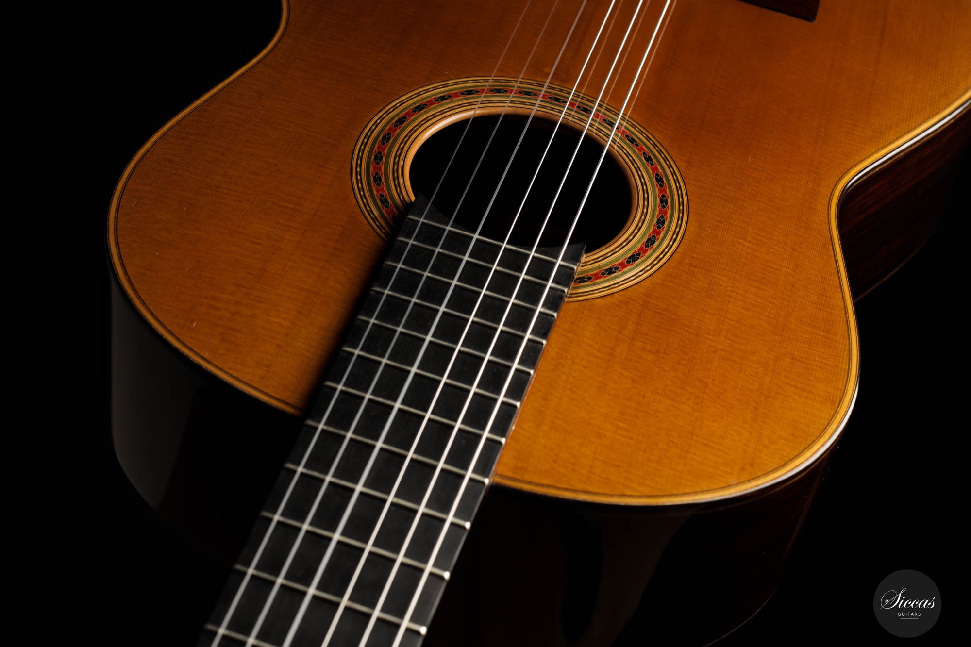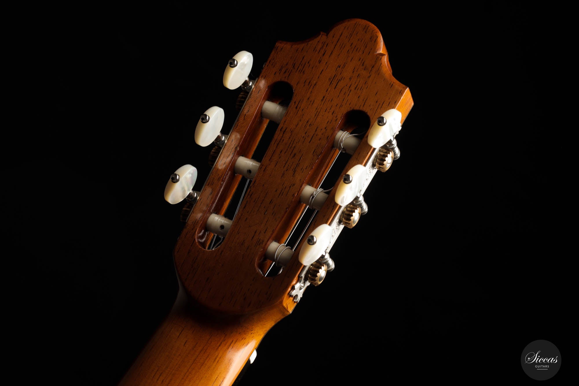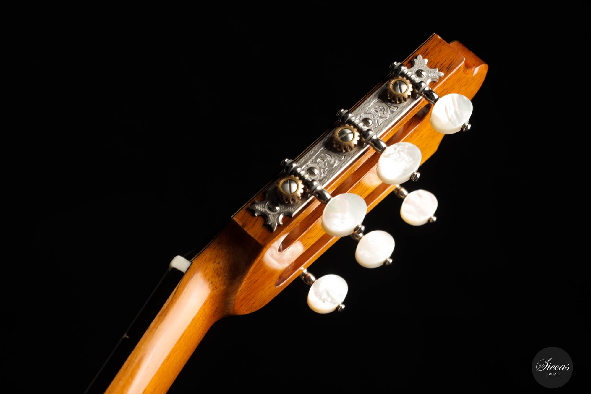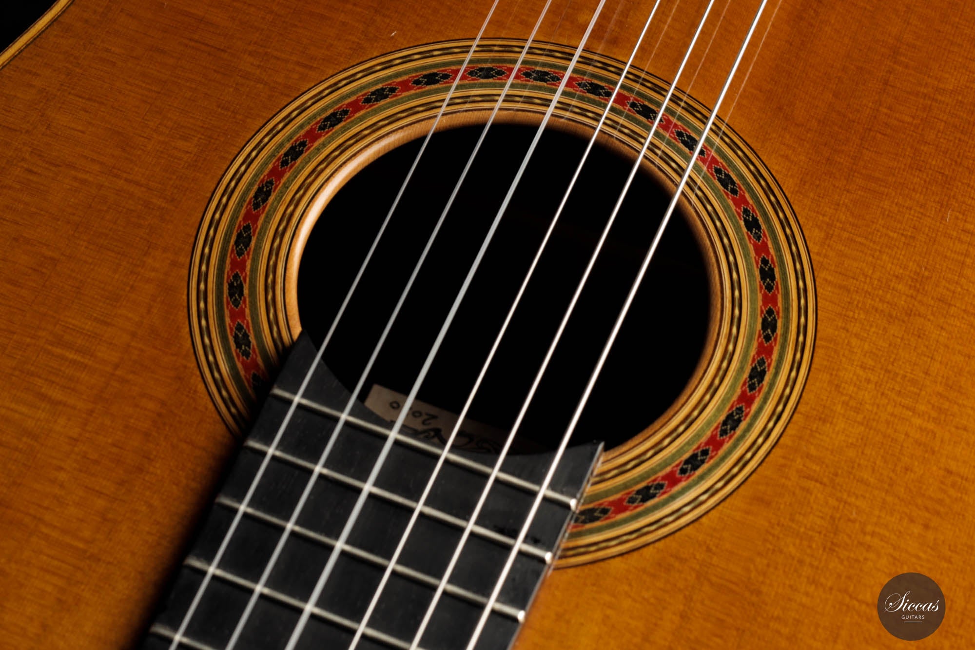 Furthermore, this guitar was colored the same way Daniel Friederich sometimes used to do, making the guitar look a bit more vintage. The rosette is also picked up in the inlay work on the bridge, just a lovely detail with a flawless design. A tricky part of the building process is the execution of the head plate arrow and the elevations around the tuning holes. Giovanni indeed hit the mark with this task. As a pre-loved instrument, this guitar is in beautiful condition with only some minor nail marks. This instrument is a concert guitar full of vibrant sonority in all the voices. Moreover, this instrument represents Daniel Friederich's guitars in every possible way.
