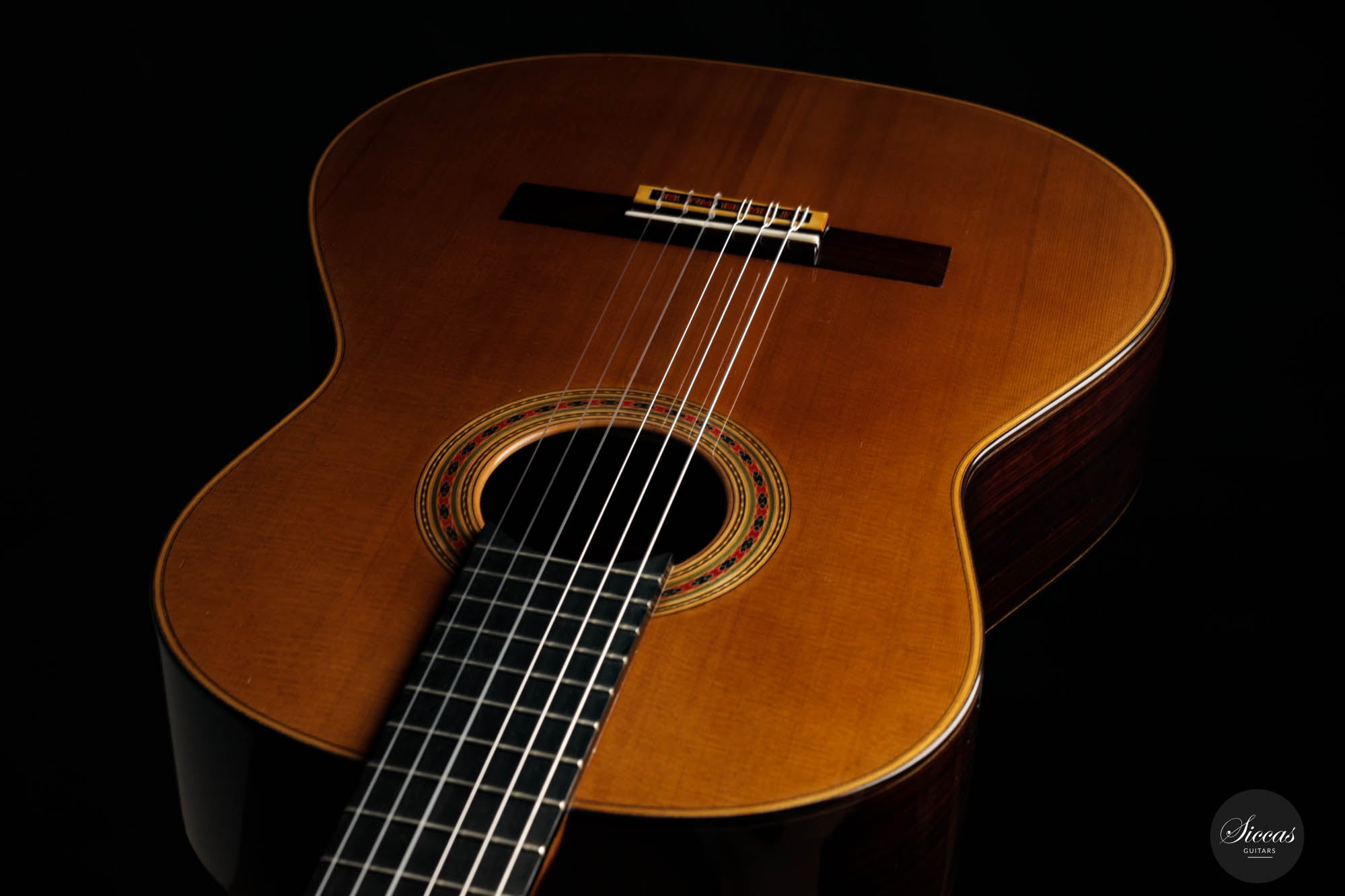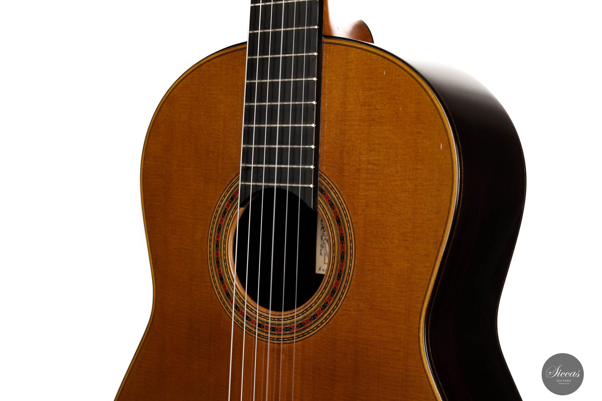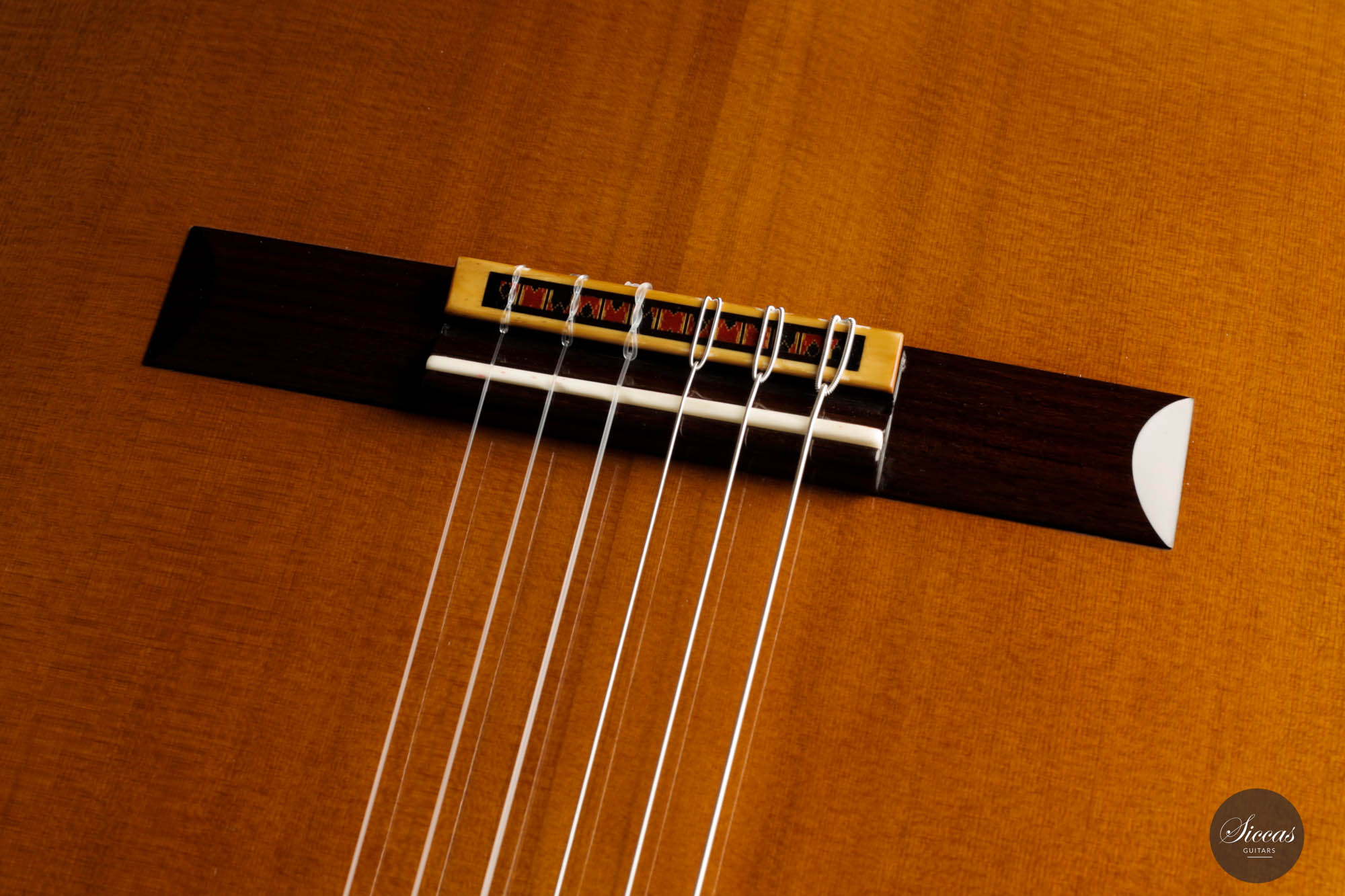 Furthermore, this guitar was colored the same way Daniel Friederich sometimes used to do, making the guitar look a bit more vintage. The rosette is also picked up in the inlay work on the bridge, just a lovely detail with a flawless design. A tricky part of the building process is the execution of the head plate arrow and the elevations around the tuning holes. Giovanni indeed hit the mark with this task. As a pre-loved instrument, this guitar is in beautiful condition with only some minor nail marks. This instrument is a concert guitar full of vibrant sonority in all the voices. Moreover, this instrument represents Daniel Friederich's guitars in every possible way.