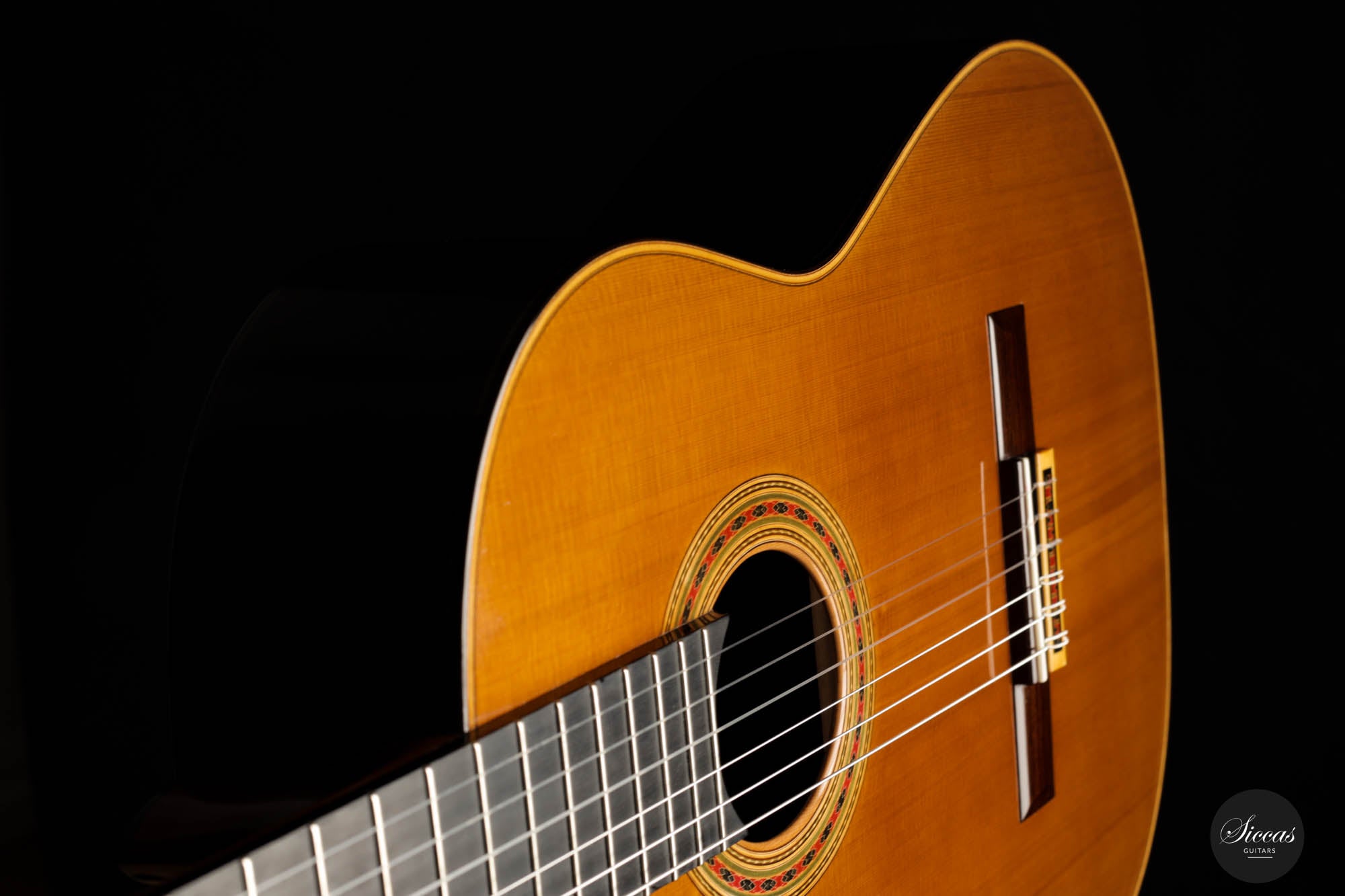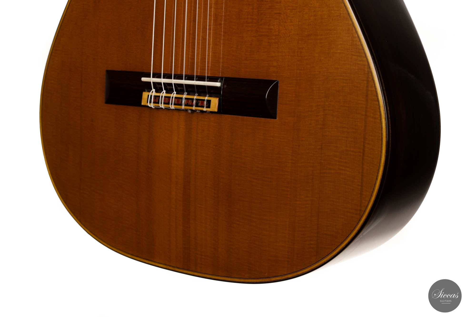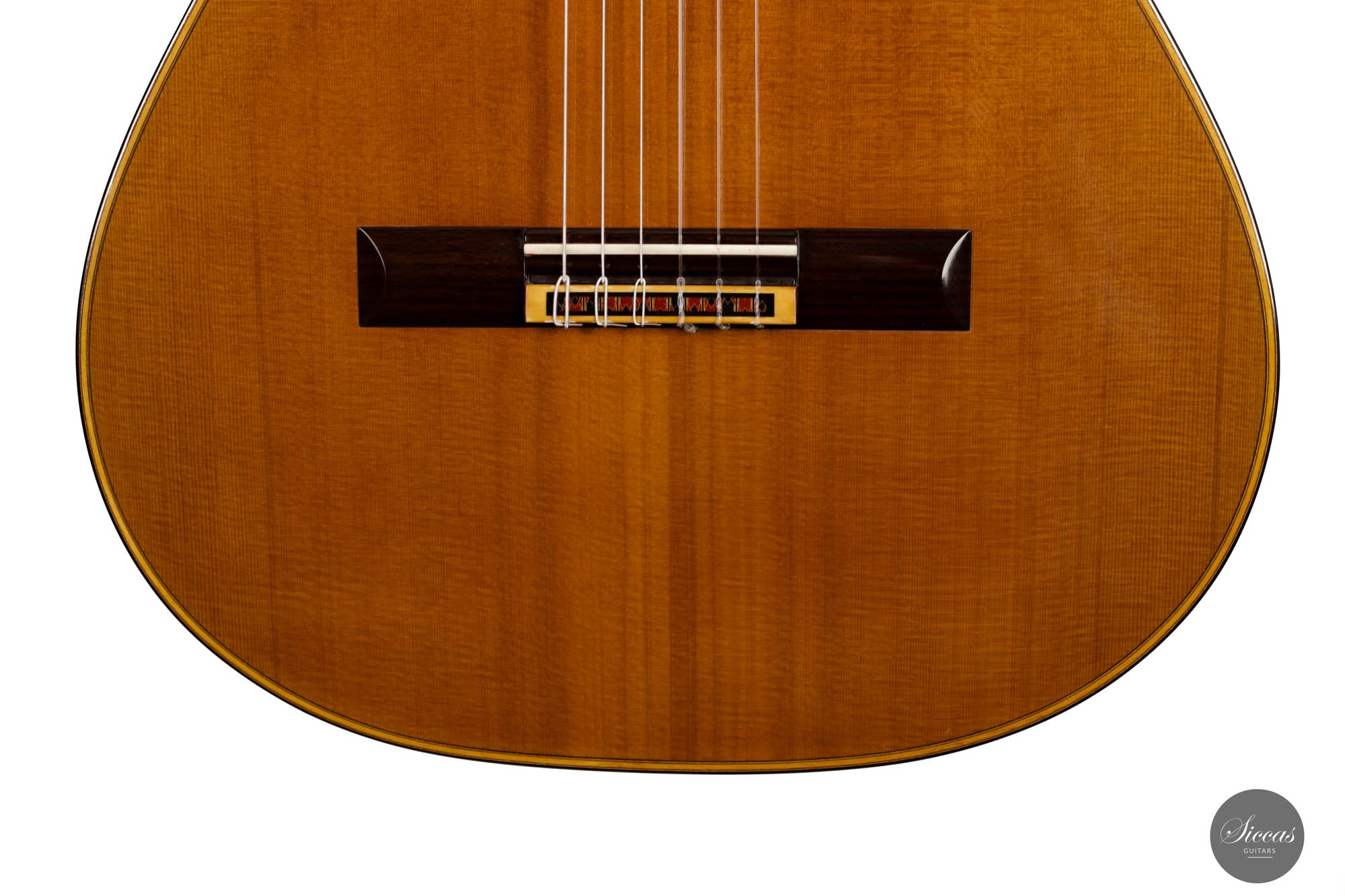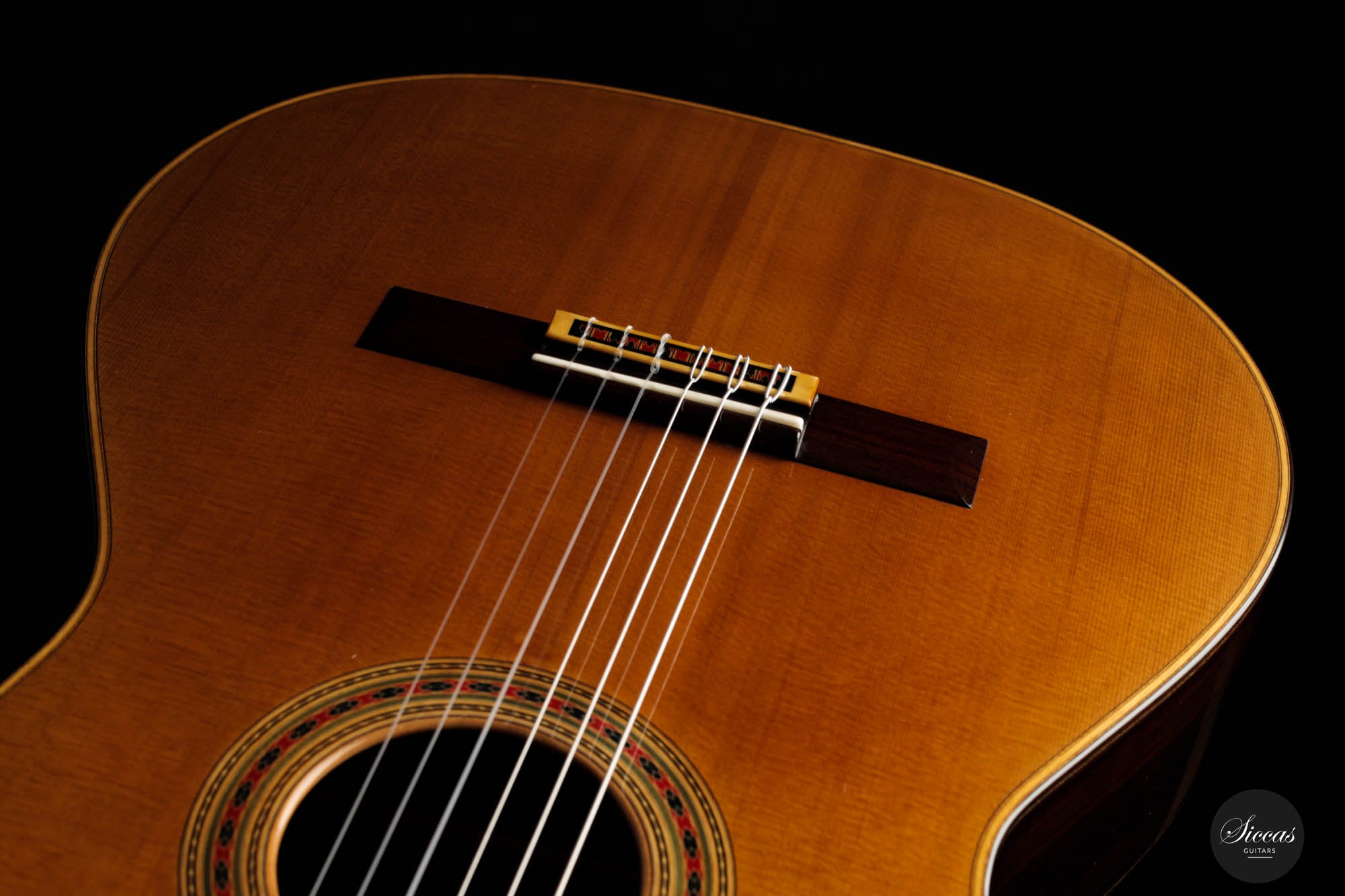Furthermore, this guitar was colored the same way Daniel Friederich sometimes used to do, making the guitar look a bit more vintage. The rosette is also picked up in the inlay work on the bridge, just a lovely detail with a flawless design. A tricky part of the building process is the execution of the head plate arrow and the elevations around the tuning holes. Giovanni indeed hit the mark with this task. As a pre-loved instrument, this guitar is in beautiful condition with only some minor nail marks. This instrument is a concert guitar full of vibrant sonority in all the voices. Moreover, this instrument represents Daniel Friederich's guitars in every possible way.