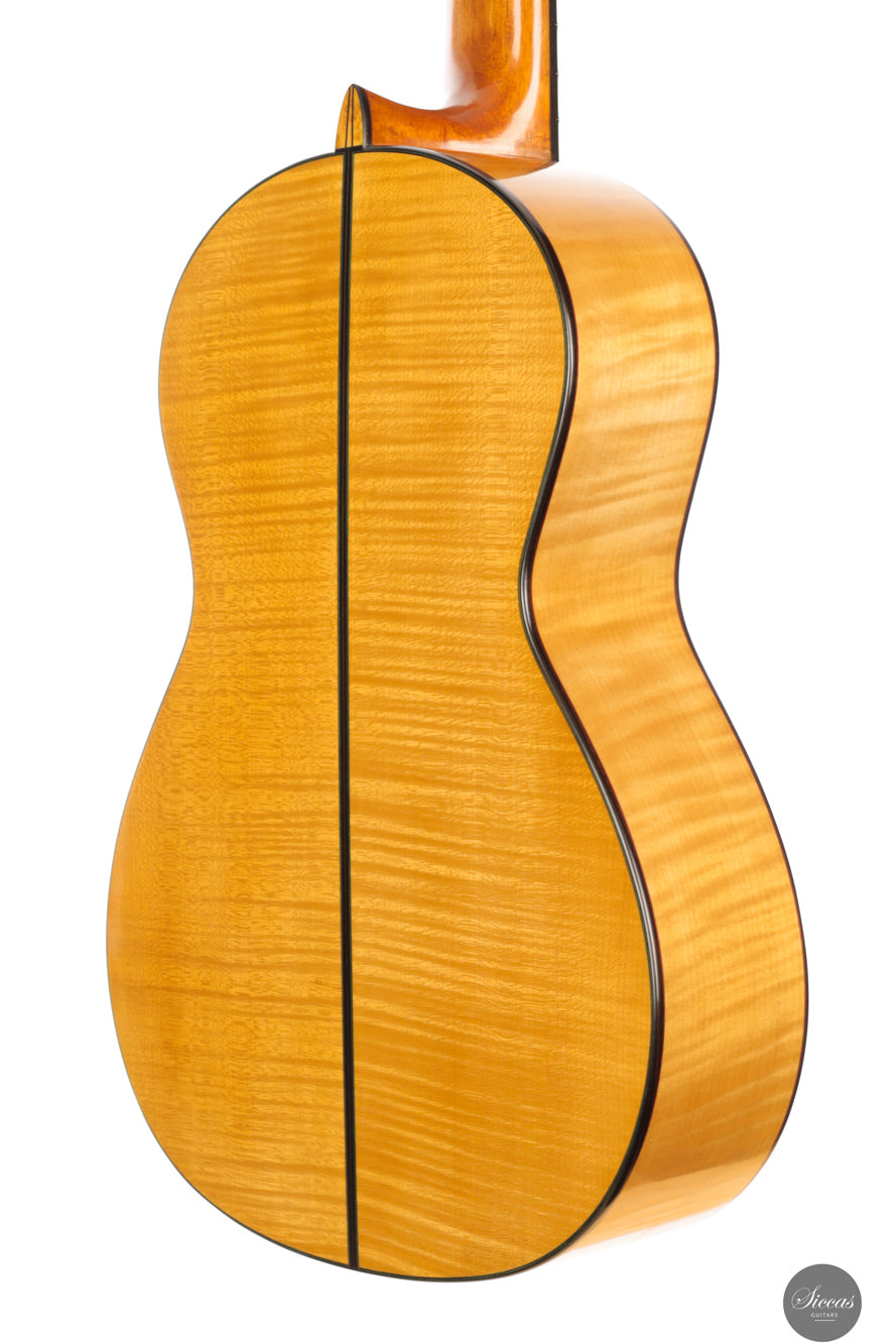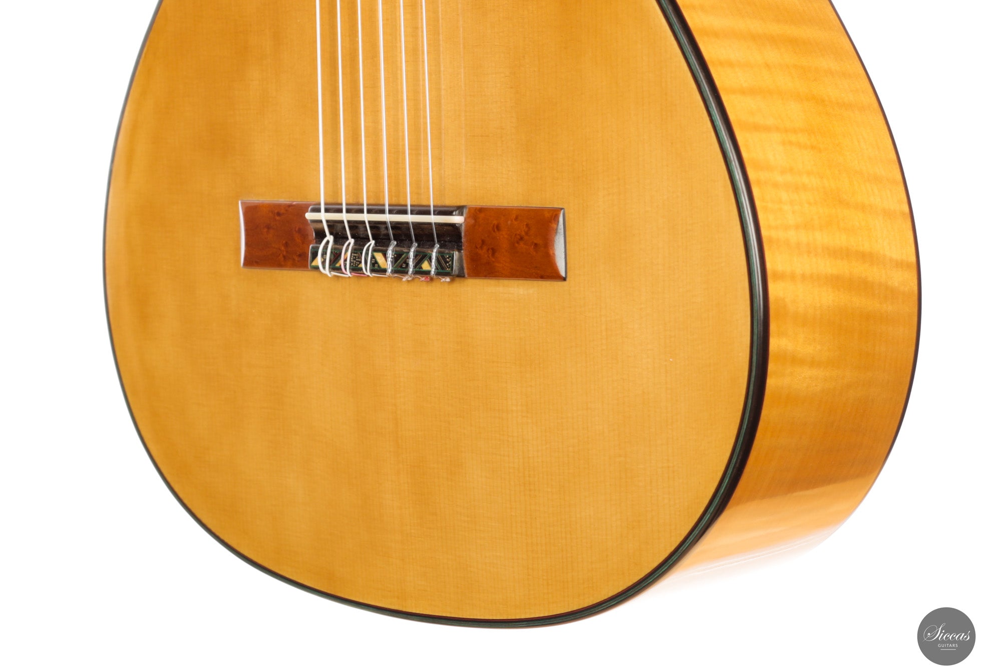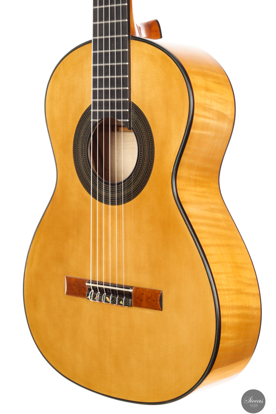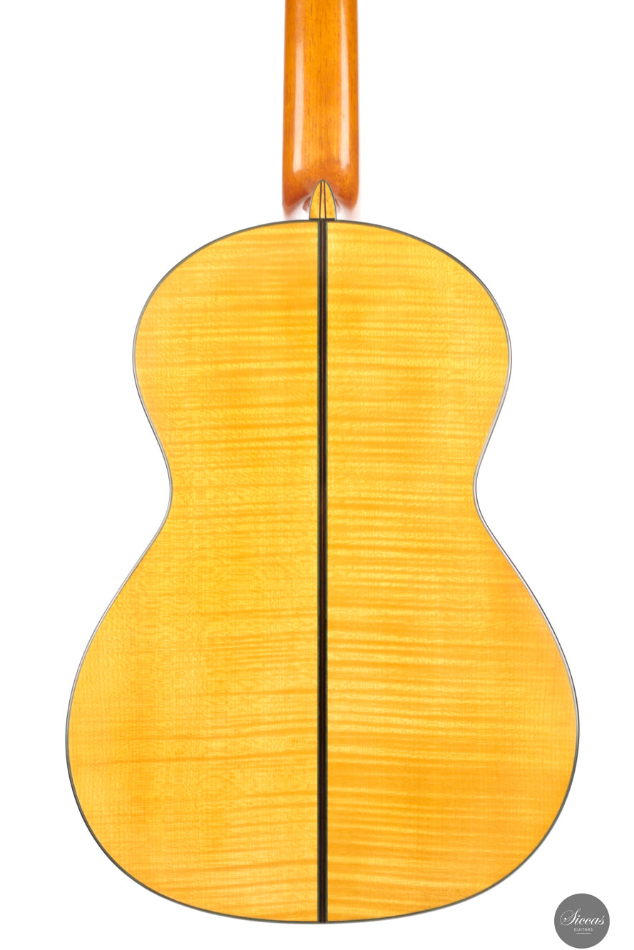 This 2023 guitar by Giovanni Tacchi is a superb example of Torres-inspired construction, combining historical sensitivity with refined lutherie. The spruce soundboard is finely tuned for a tone that is both intimate and expansive, while the flamed maple back and sides contribute to the instrument’s elegant visual presence and bright, lyrical voice. WhatsApp Image 2025 09 30 at 10.27.03 AM 10 e1759936567607 WhatsApp Image 2025 09 30 at 10.27.03 AM 4 Tonally, this guitar offers extraordinary nuance and depth. The sound is rich, with strong fundamentals and remarkable clarity across the registers. The separation between the voices is precise, and the balance between singing trebles and resonant basses creates a sonority that is both modern and reminiscent of early Spanish instruments. A key tonal contributor is the bridge, crafted from highly figured maple burl, not the typical straight-grained maple such as flamed or birdseye, but a rare burl cut that produces swirling, cloud-like figures, both visually stunning and acoustically responsive. The guitar features thoughtful design elements for today’s concert guitarist: a 12-hole tie block for enhanced string angle, a 650 mm scale, and a comfortable neck profile. The maple strip set into the headstock veneer is a subtle and tasteful visual accent, echoing the overall craftsmanship. Finished entirely in traditional French polish, the guitar weighs just 1300 grams, exceptionally light for a modern concert instrument. This finish not only enhances the visual warmth of the tonewoods but also preserves their acoustic liveliness. The result is a guitar of remarkable sensitivity, perfect for discerning players in search of a lyrical and expressive voice.Condition