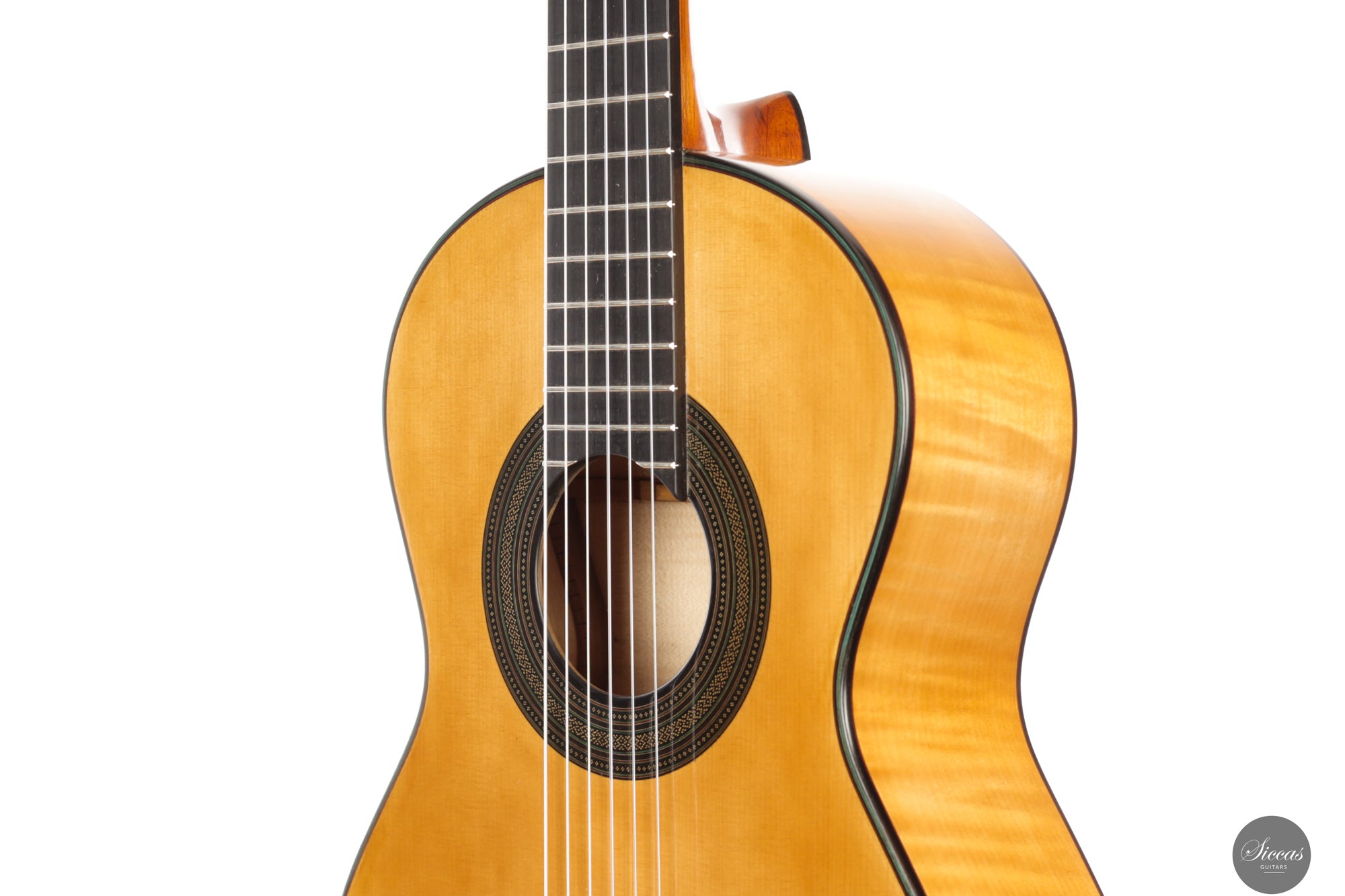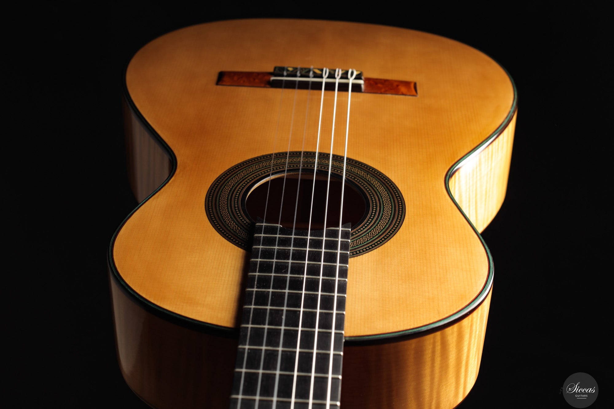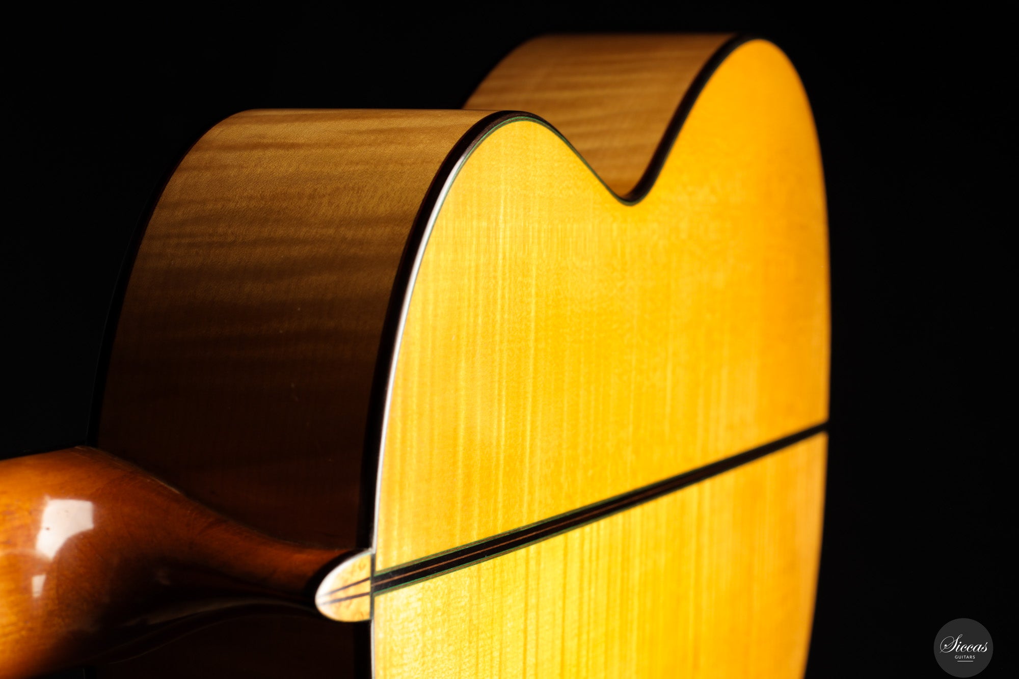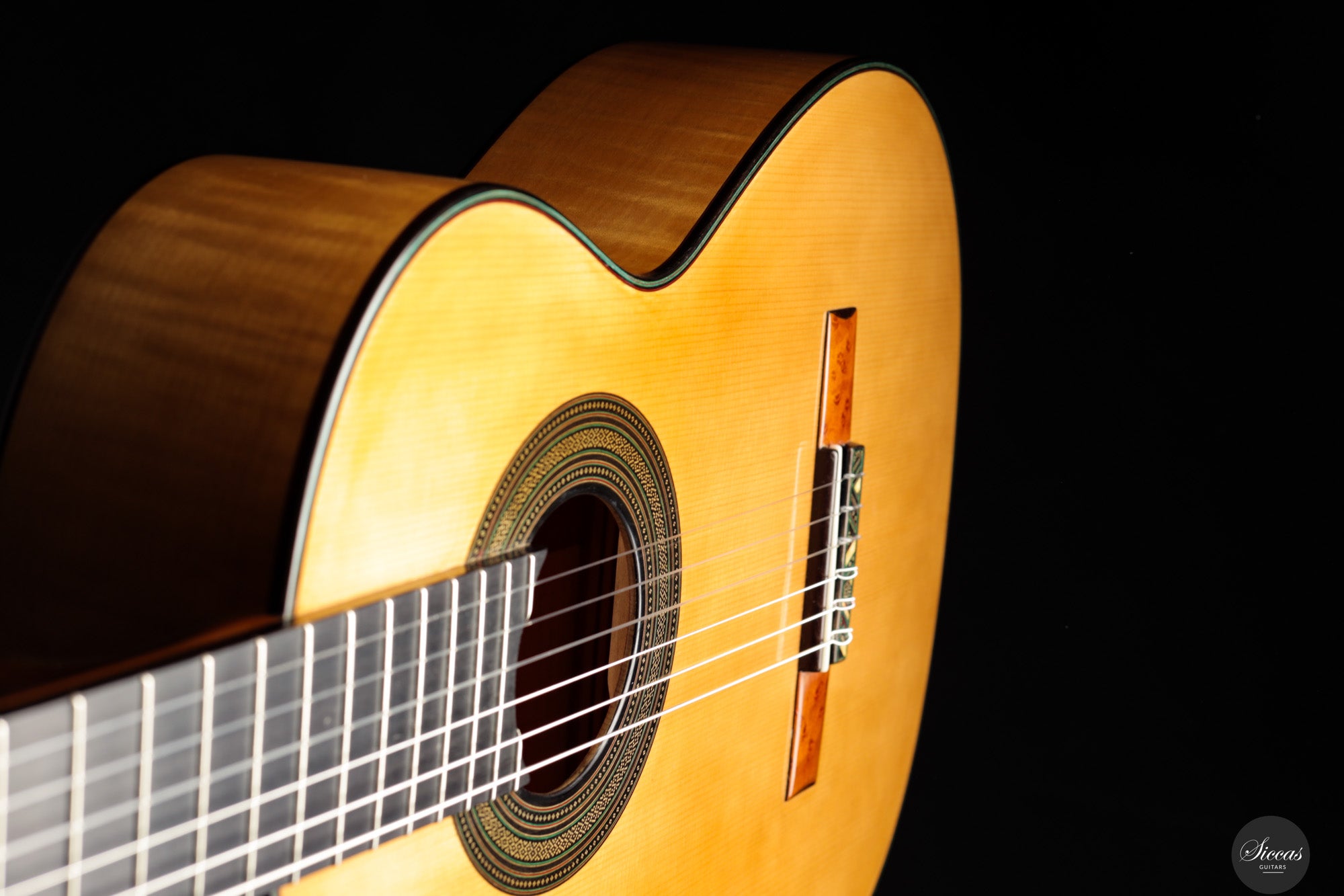 This 2023 guitar by Giovanni Tacchi is a superb example of Torres-inspired construction, combining historical sensitivity with refined lutherie. The spruce soundboard is finely tuned for a tone that is both intimate and expansive, while the flamed maple back and sides contribute to the instrument’s elegant visual presence and bright, lyrical voice. WhatsApp Image 2025 09 30 at 10.27.03 AM 10 e1759936567607 WhatsApp Image 2025 09 30 at 10.27.03 AM 4 Tonally, this guitar offers extraordinary nuance and depth. The sound is rich, with strong fundamentals and remarkable clarity across the registers. The separation between the voices is precise, and the balance between singing trebles and resonant basses creates a sonority that is both modern and reminiscent of early Spanish instruments. A key tonal contributor is the bridge, crafted from highly figured maple burl, not the typical straight-grained maple such as flamed or birdseye, but a rare burl cut that produces swirling, cloud-like figures, both visually stunning and acoustically responsive. The guitar features thoughtful design elements for today’s concert guitarist: a 12-hole tie block for enhanced string angle, a 650 mm scale, and a comfortable neck profile. The maple strip set into the headstock veneer is a subtle and tasteful visual accent, echoing the overall craftsmanship. Finished entirely in traditional French polish, the guitar weighs just 1300 grams, exceptionally light for a modern concert instrument. This finish not only enhances the visual warmth of the tonewoods but also preserves their acoustic liveliness. The result is a guitar of remarkable sensitivity, perfect for discerning players in search of a lyrical and expressive voice.Condition