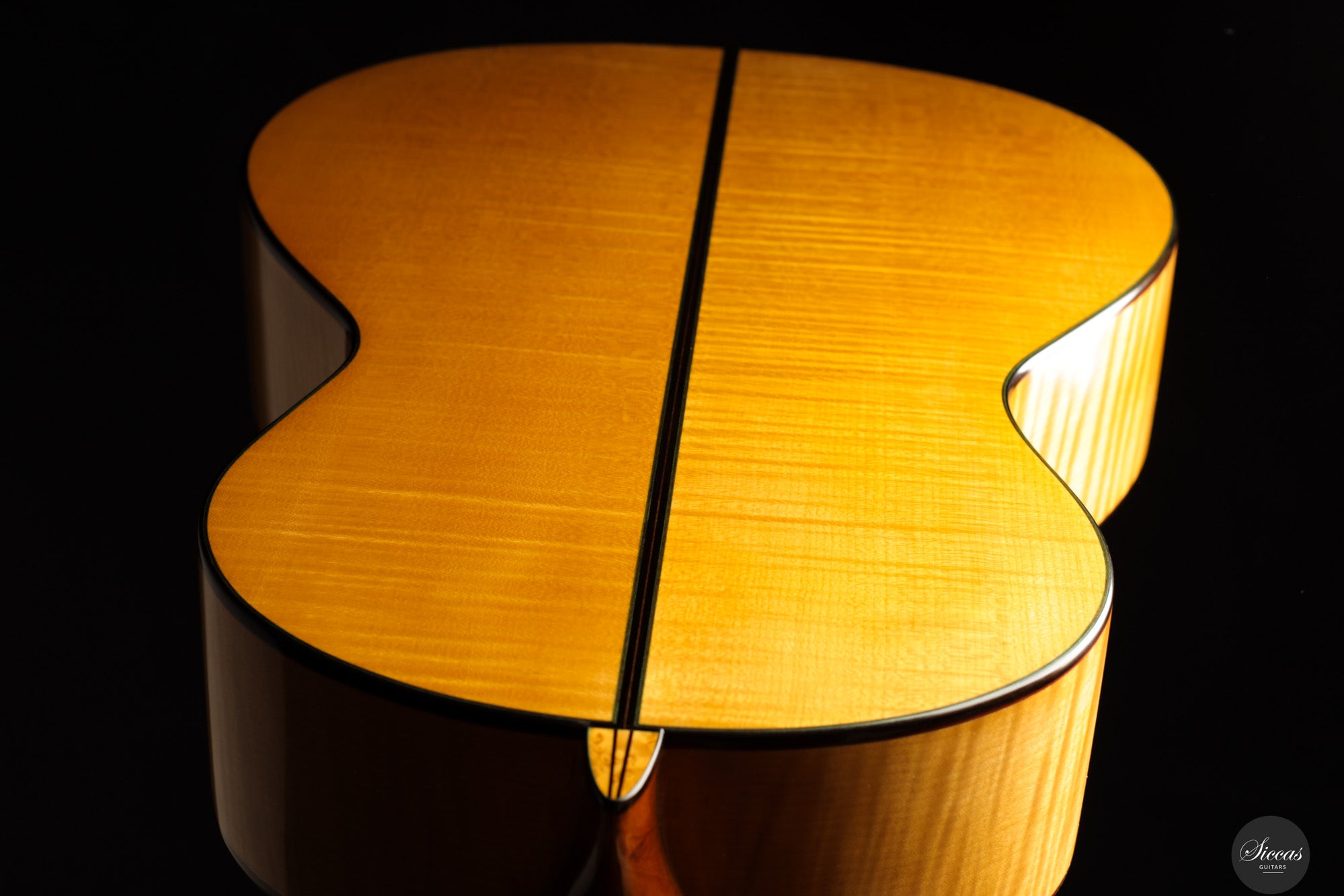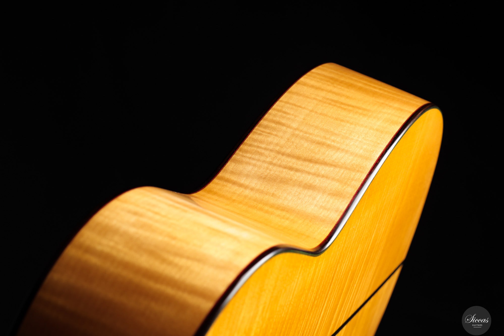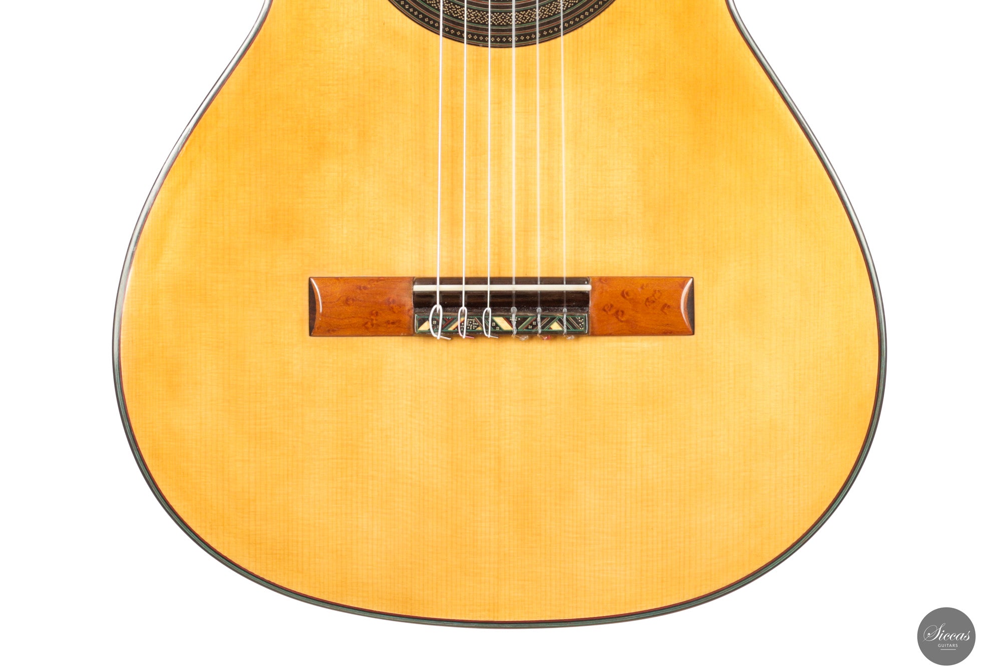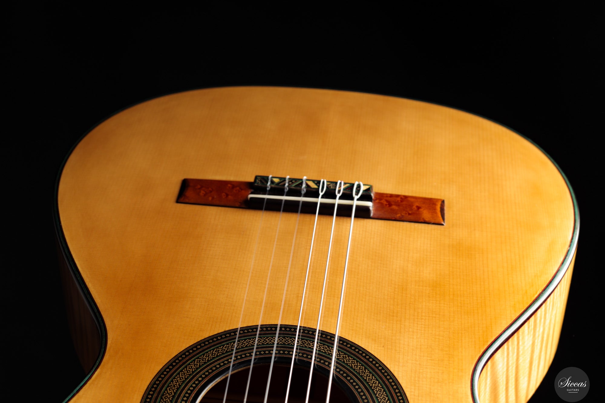 This 2023 guitar by Giovanni Tacchi is a superb example of Torres-inspired construction, combining historical sensitivity with refined lutherie. The spruce soundboard is finely tuned for a tone that is both intimate and expansive, while the flamed maple back and sides contribute to the instrument’s elegant visual presence and bright, lyrical voice. WhatsApp Image 2025 09 30 at 10.27.03 AM 10 e1759936567607 WhatsApp Image 2025 09 30 at 10.27.03 AM 4 Tonally, this guitar offers extraordinary nuance and depth. The sound is rich, with strong fundamentals and remarkable clarity across the registers. The separation between the voices is precise, and the balance between singing trebles and resonant basses creates a sonority that is both modern and reminiscent of early Spanish instruments. A key tonal contributor is the bridge, crafted from highly figured maple burl, not the typical straight-grained maple such as flamed or birdseye, but a rare burl cut that produces swirling, cloud-like figures, both visually stunning and acoustically responsive. The guitar features thoughtful design elements for today’s concert guitarist: a 12-hole tie block for enhanced string angle, a 650 mm scale, and a comfortable neck profile. The maple strip set into the headstock veneer is a subtle and tasteful visual accent, echoing the overall craftsmanship. Finished entirely in traditional French polish, the guitar weighs just 1300 grams, exceptionally light for a modern concert instrument. This finish not only enhances the visual warmth of the tonewoods but also preserves their acoustic liveliness. The result is a guitar of remarkable sensitivity, perfect for discerning players in search of a lyrical and expressive voice.Condition