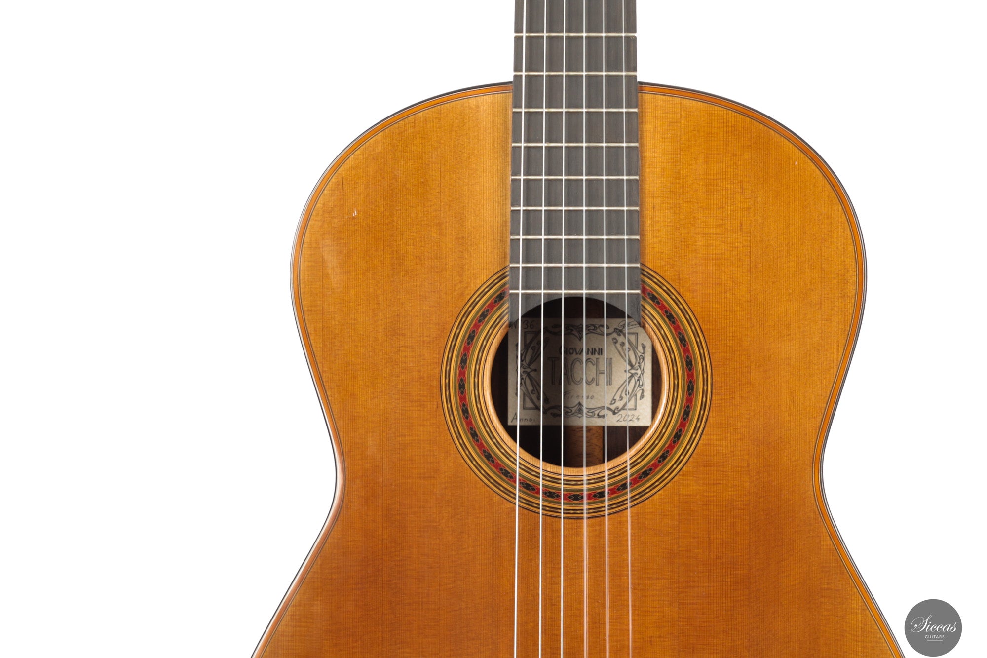 This 2024 instrument titled “Daniel Friederich” No. 36 reflects Giovanni Tacchi’s deep study of the Friederich aesthetic and his own refined interpretation of that tradition. Built in traditional style with a cedar top and Indian rosewood back and sides, it measures 650 mm in scale length and presents an architecture designed for concert‑level performance. The finish is a classic French polish and the nut width is 51.5 mm.