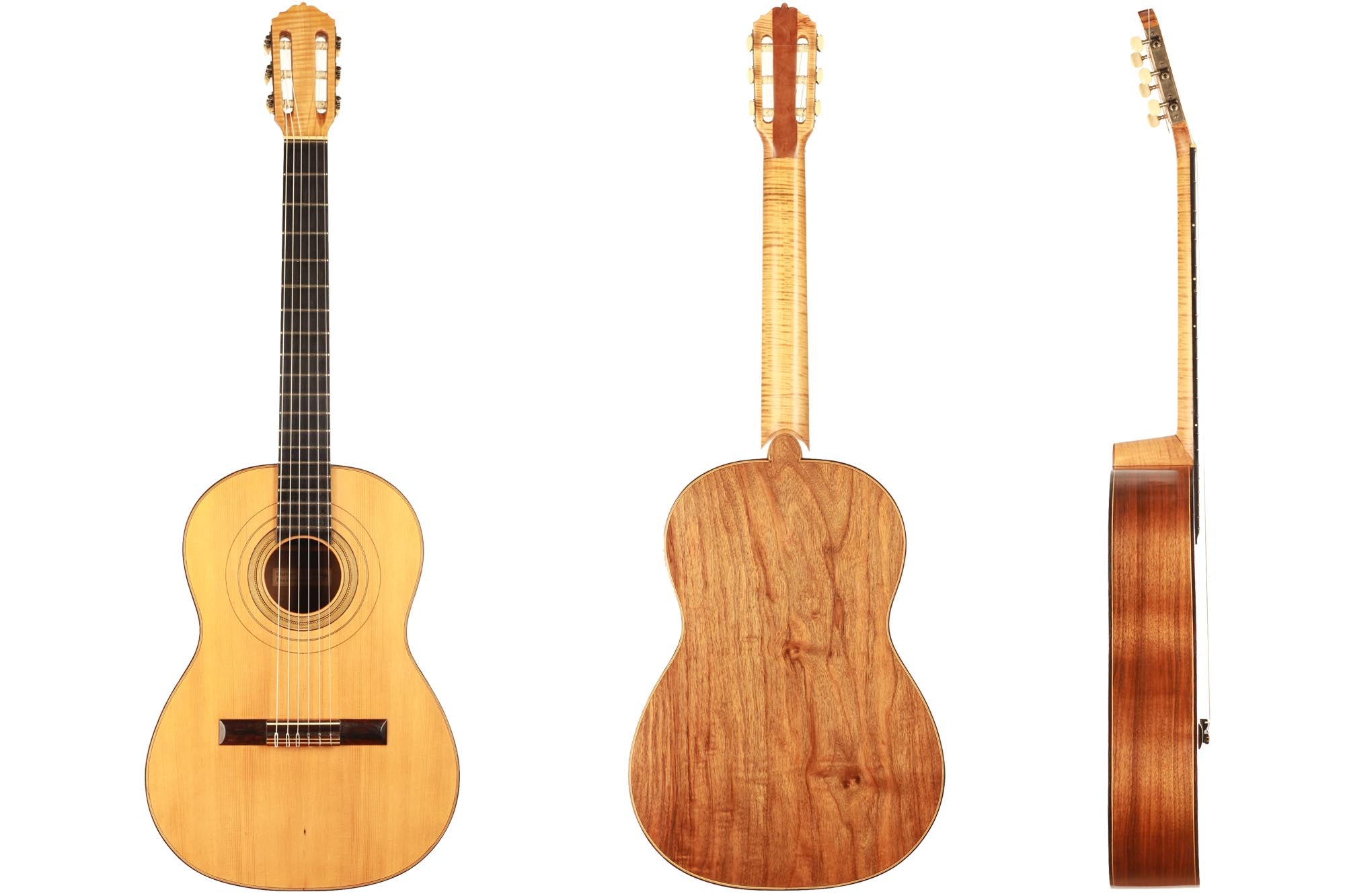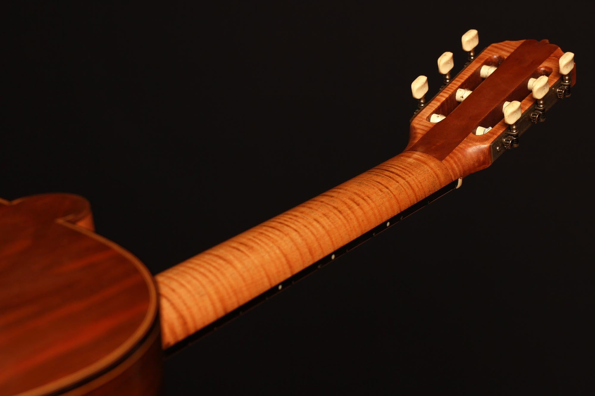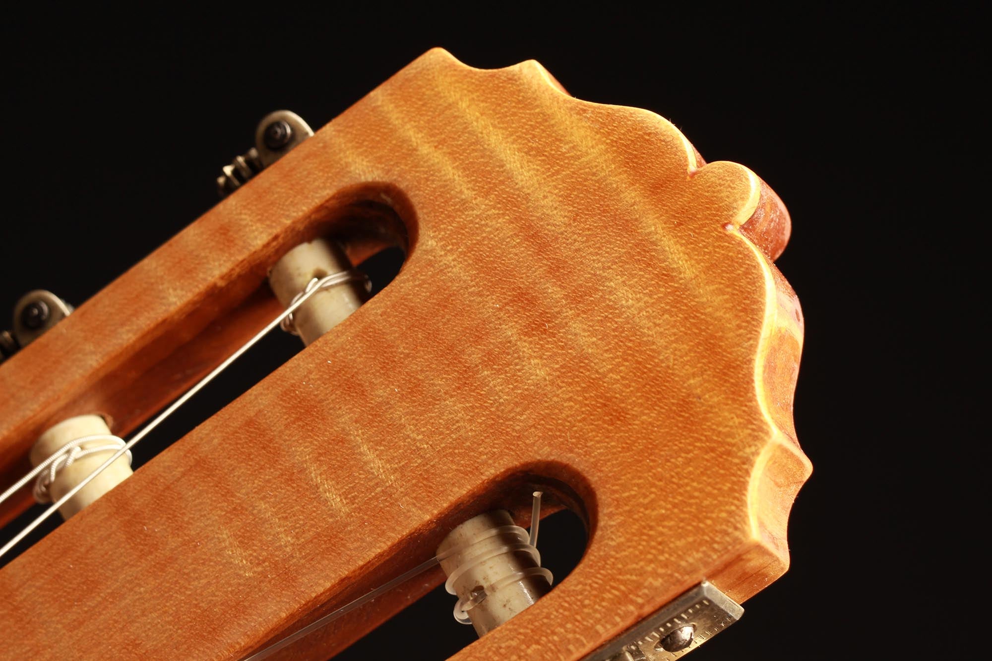 This beautiful instrument made in 1954 is in great condition with no cracks nor repairs. The woods chosen for this guitar are very interesting: the one-piece walnut back and the maple neck were two rare features at this time. Furthermore, the maple neck is a subtle reminder of Lecchi’s violin-maker education.