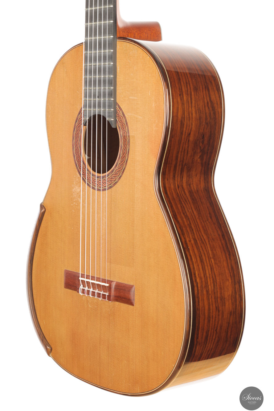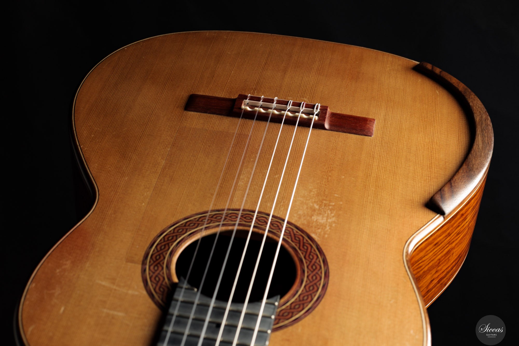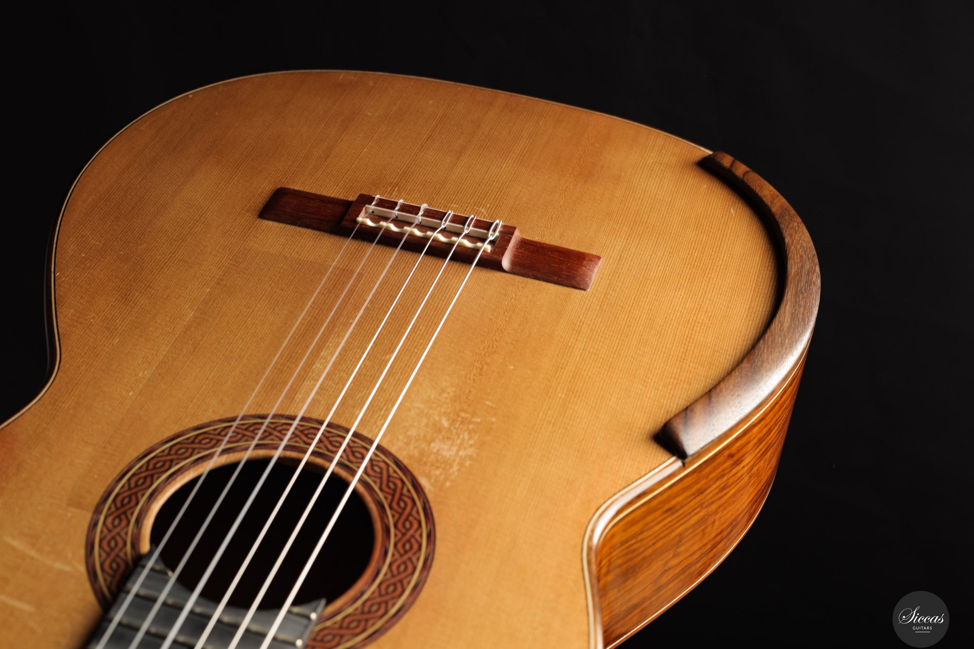 The guitar is in excellent condition with no cracks or repairs. It shows only standard signs of use, with some visible playing marks on the top, typical for a concert guitar of this age that has been actively but carefully played.