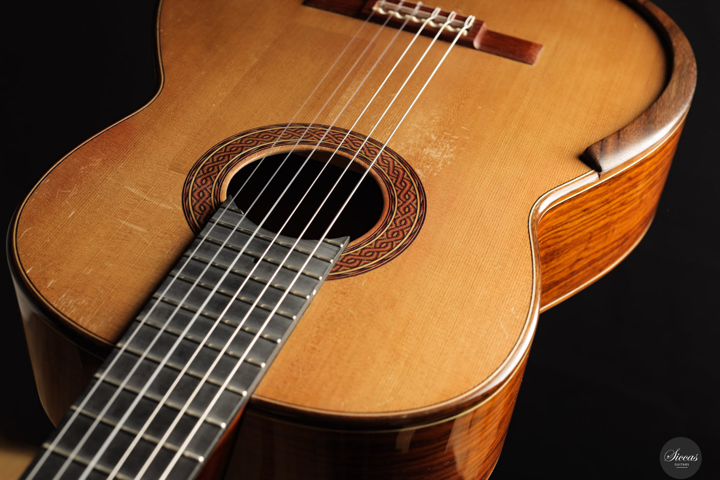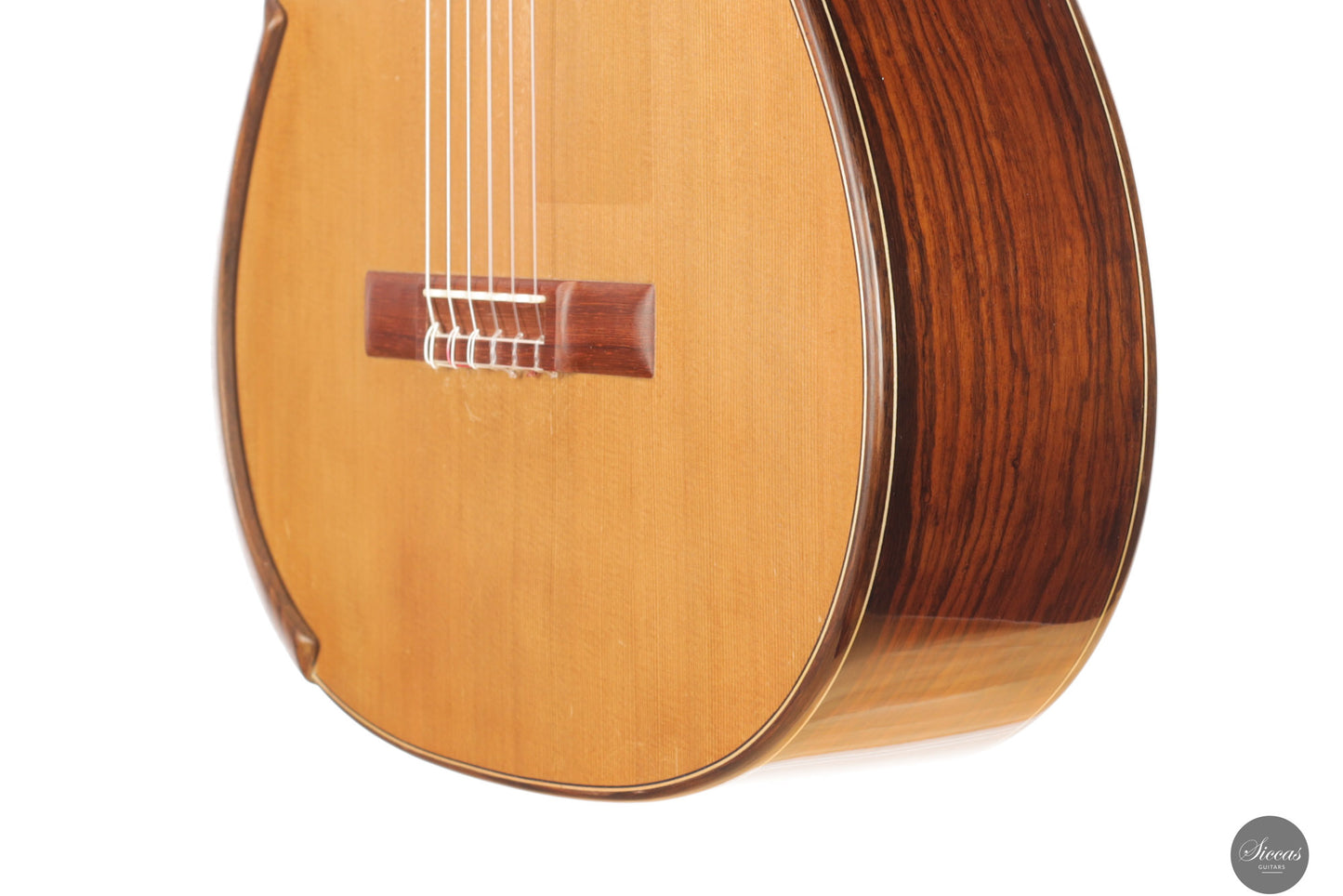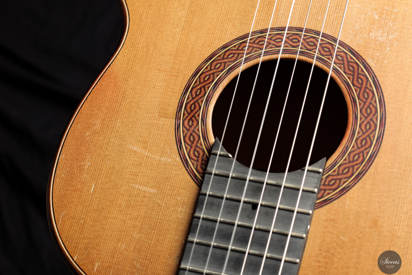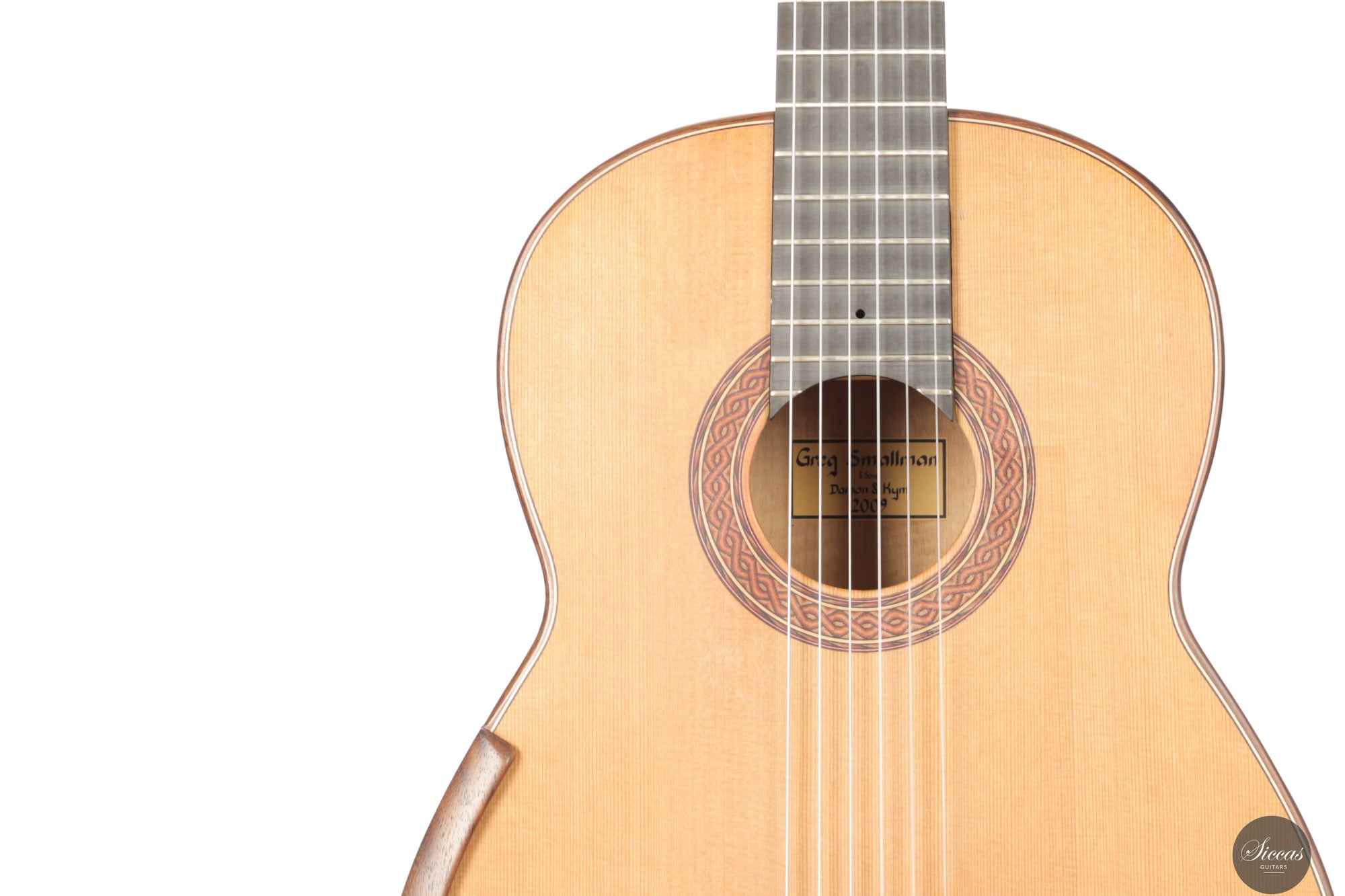Built in 2009, this guitar is a fine example of the Smallman legacy. It features a cedar soundboard supported by a carbon-reinforced lattice bracing system, paired with rosewood back and sides. The body is doubled, creating a rigid shell that enhances projection and stability, while the light top construction responds with minimal effort from the player. The lacquer finish ensures durability while maintaining the guitar’s visual elegance.