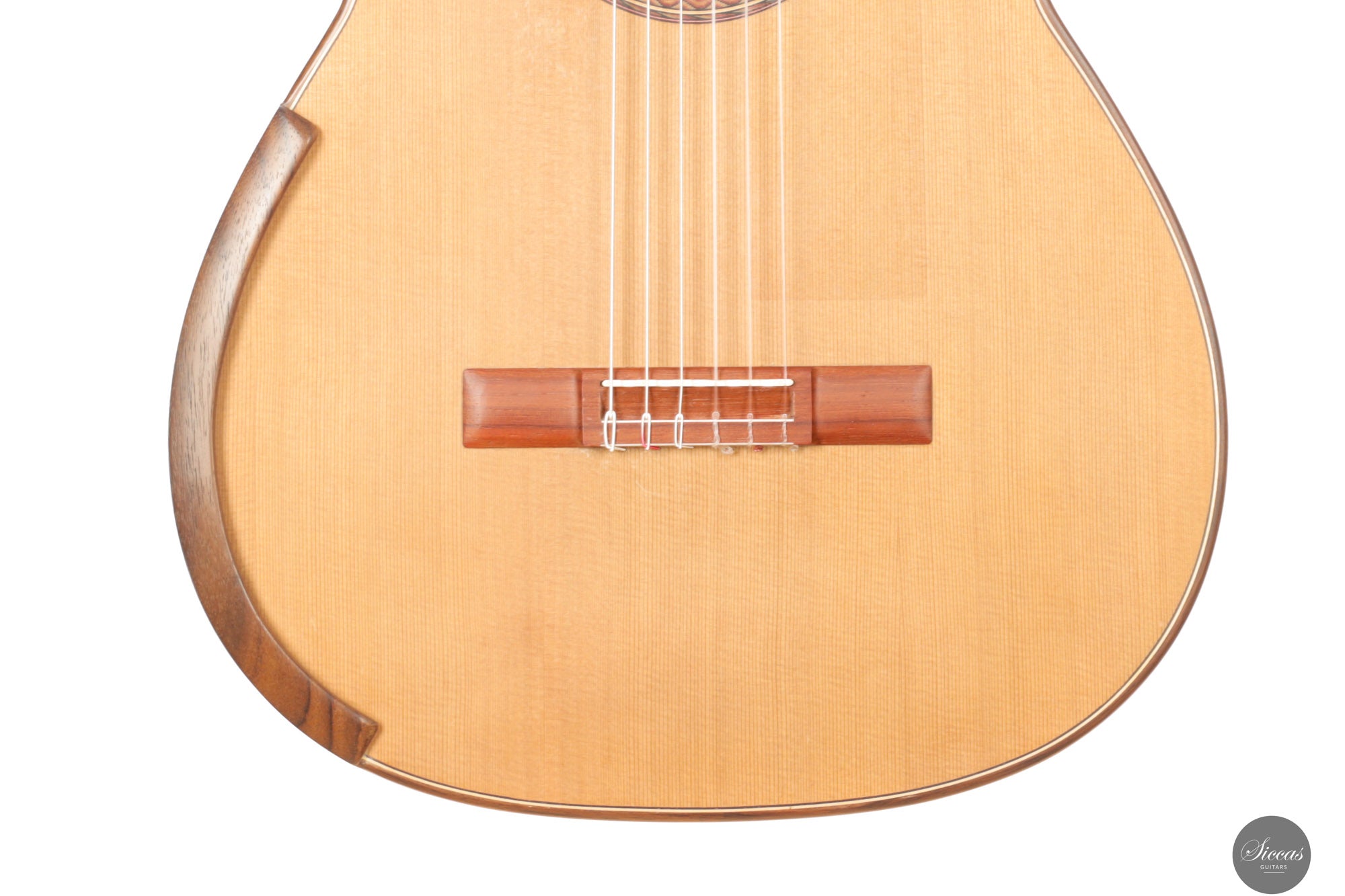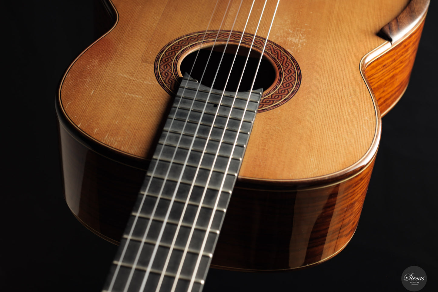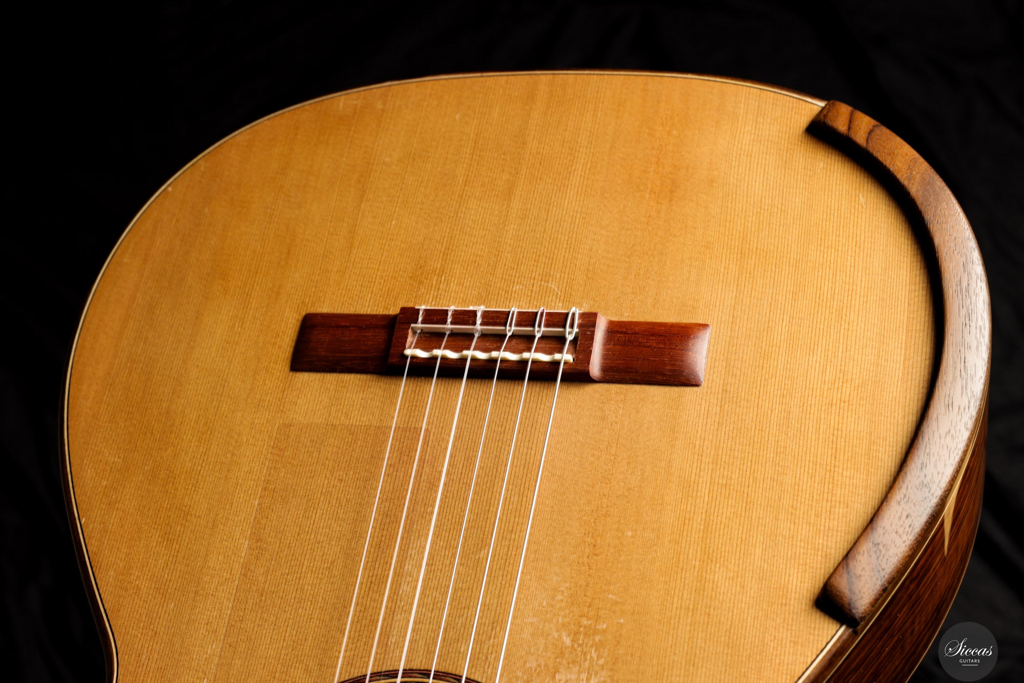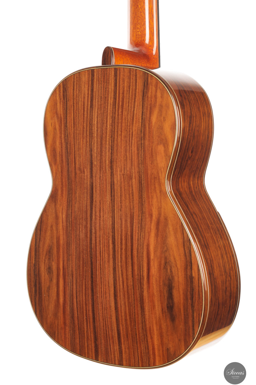 Built in 2009, this guitar is a fine example of the Smallman legacy. It features a cedar soundboard supported by a carbon-reinforced lattice bracing system, paired with rosewood back and sides. The body is doubled, creating a rigid shell that enhances projection and stability, while the light top construction responds with minimal effort from the player. The lacquer finish ensures durability while maintaining the guitar’s visual elegance.