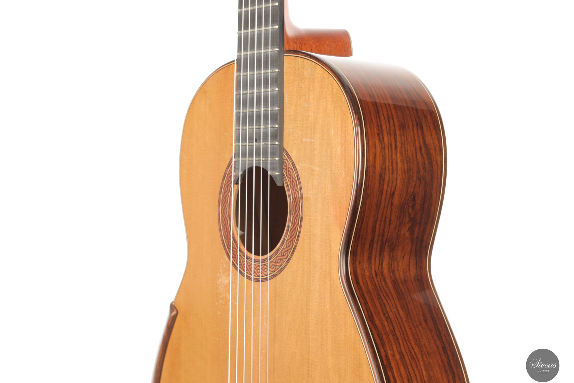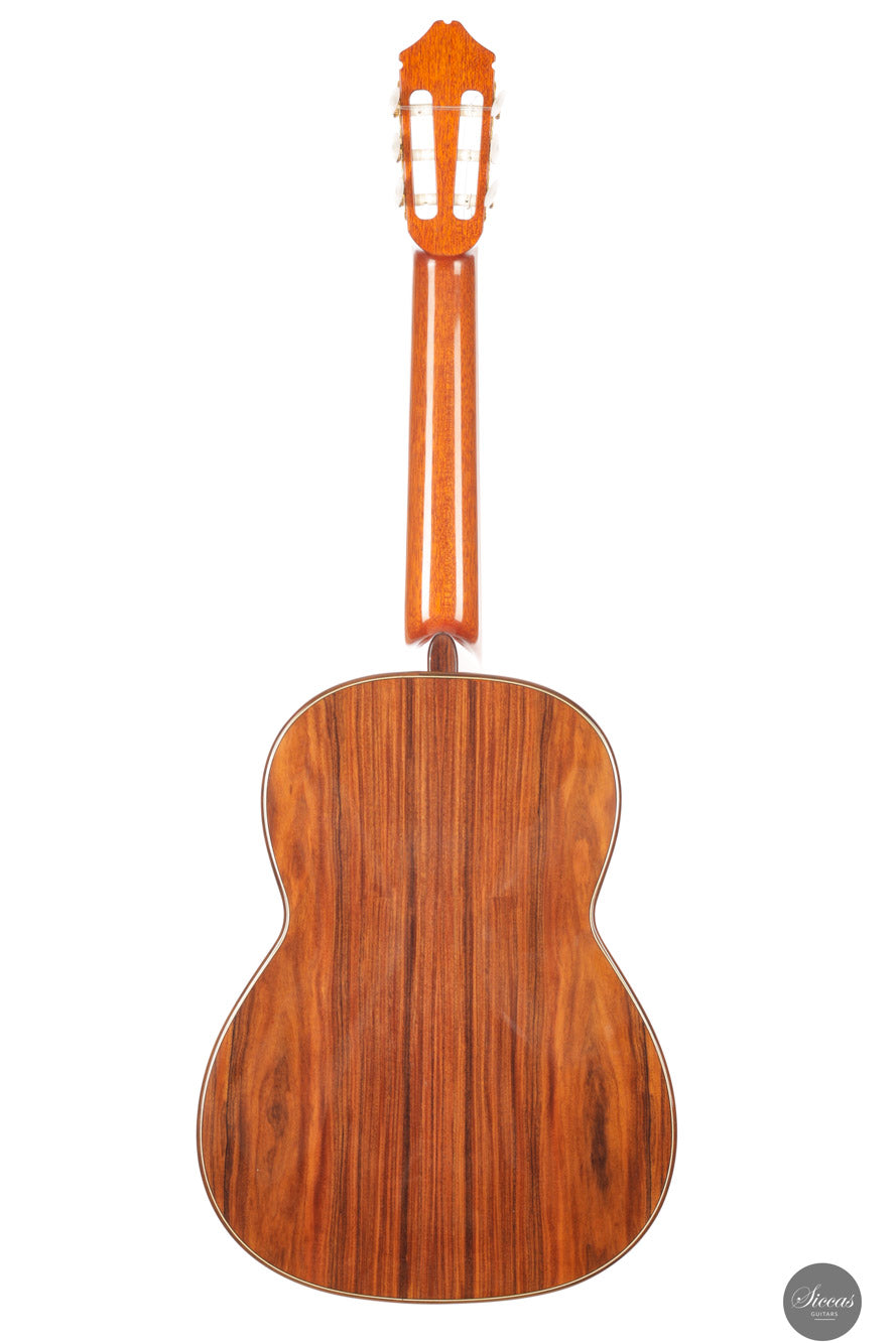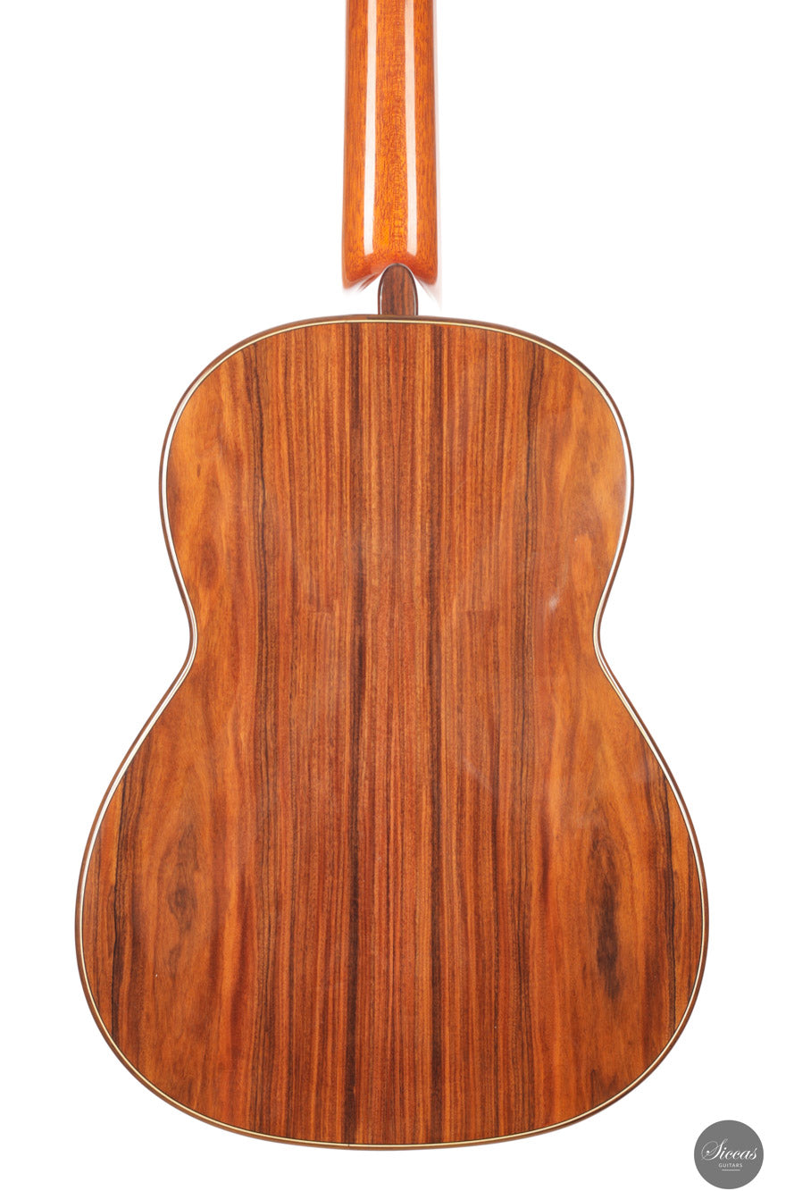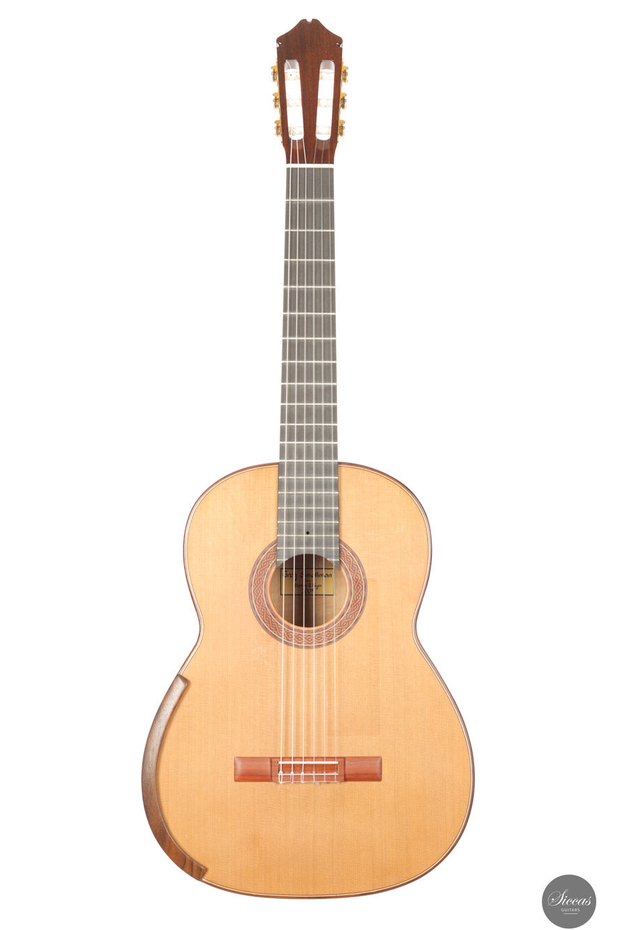 Built in 2009, this guitar is a fine example of the Smallman legacy. It features a cedar soundboard supported by a carbon-reinforced lattice bracing system, paired with rosewood back and sides. The body is doubled, creating a rigid shell that enhances projection and stability, while the light top construction responds with minimal effort from the player. The lacquer finish ensures durability while maintaining the guitar’s visual elegance.