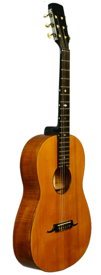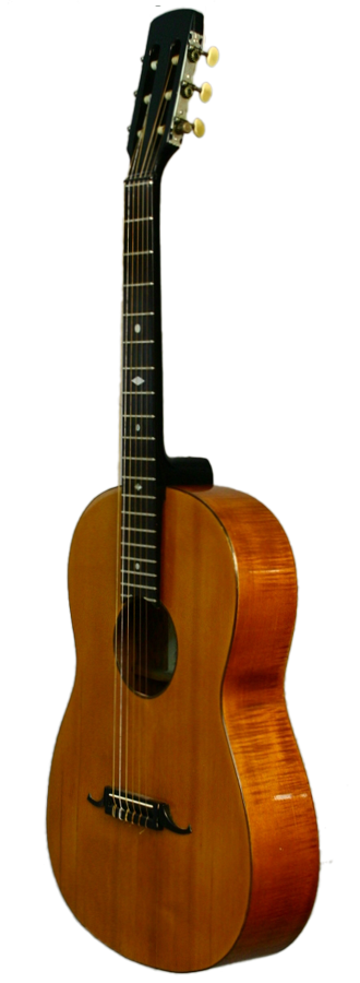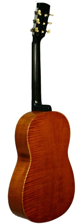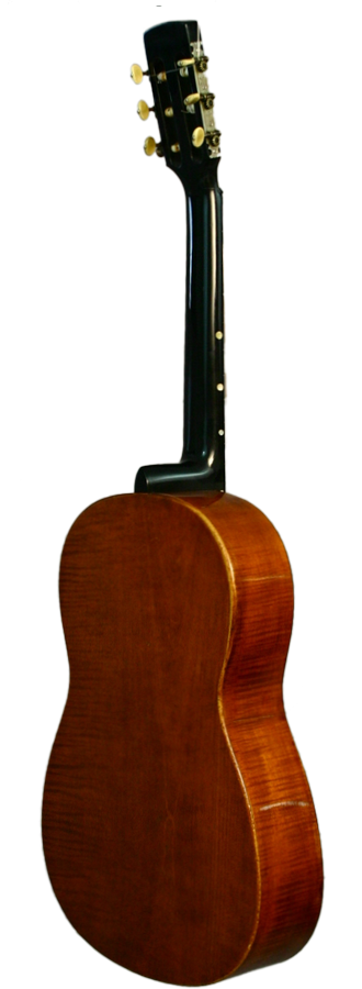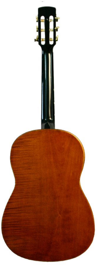 Hans Raab, who was a representative of the Munich School, constructed this concert guitar in 1925. The guitar’s top is made of spruce wood and is framed by a dark purfling like the sound hole as well. The bridge is shaped in the form of a moustache. The two-piece back and the ribs are made of flamed maple. The head is connected with the neck with a mortise joint. The neck is varnished black and the fingerboard is attached to the top.