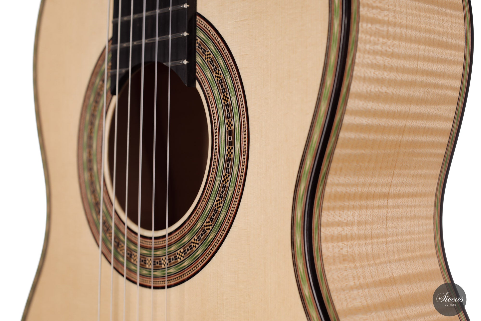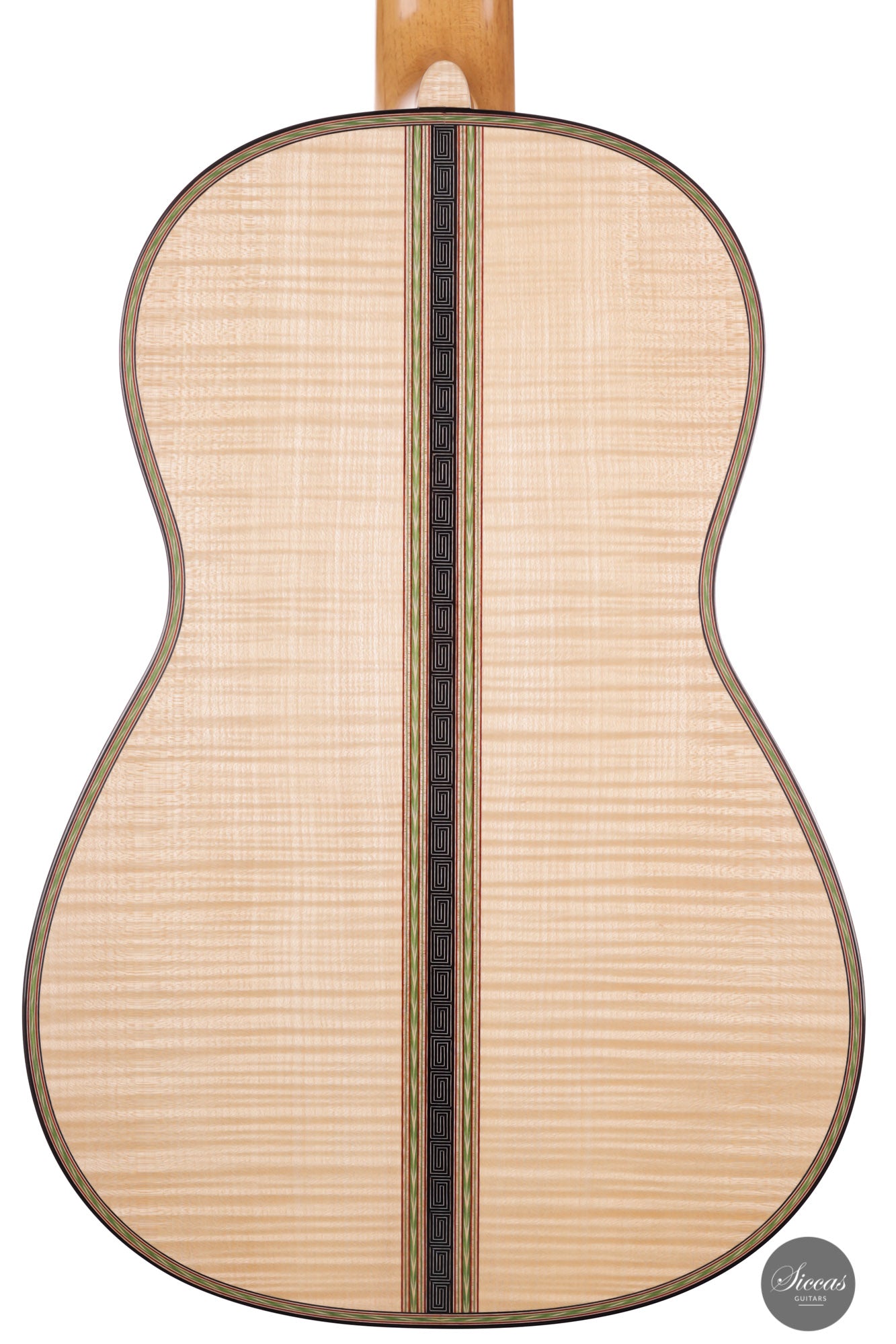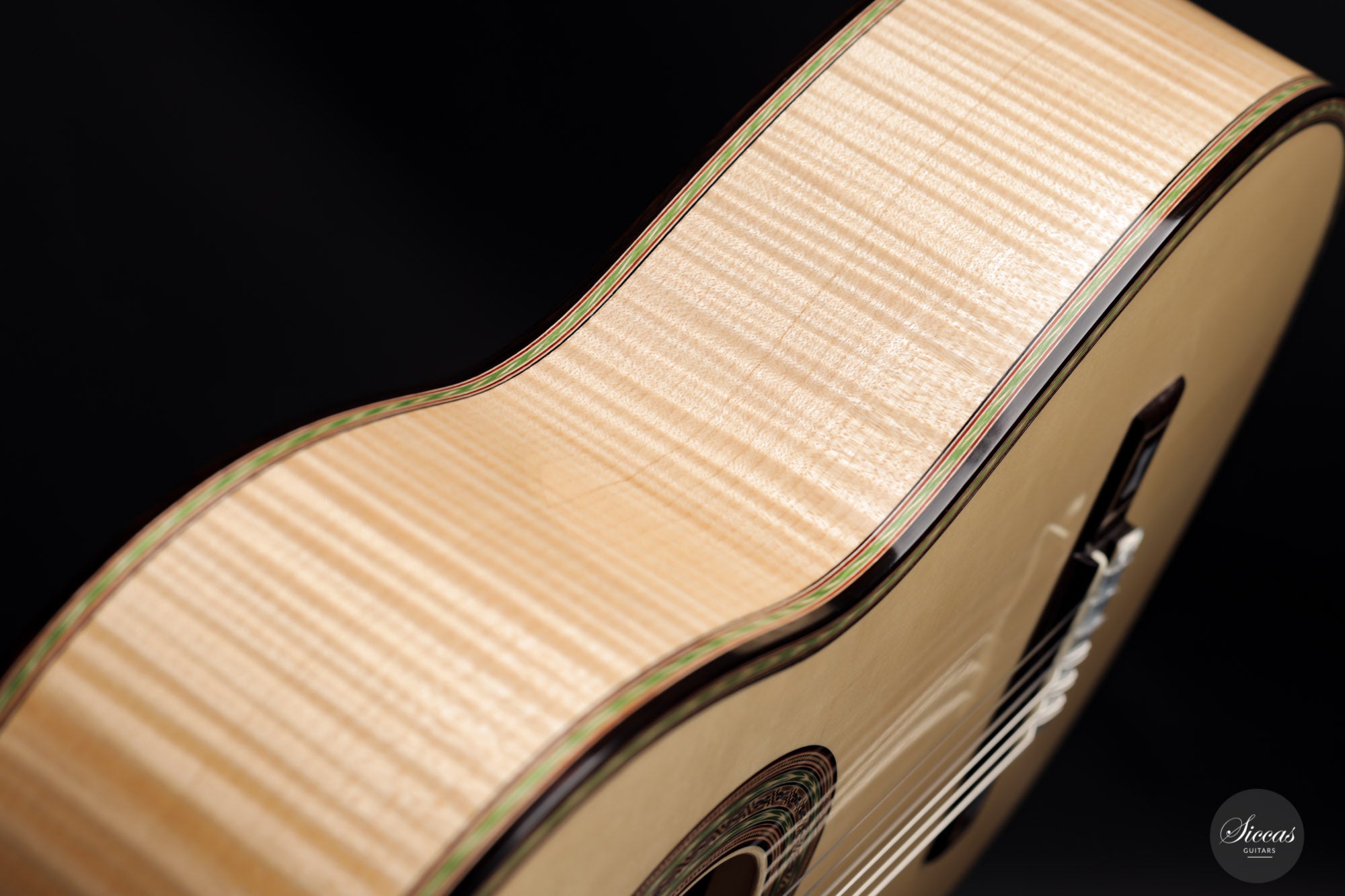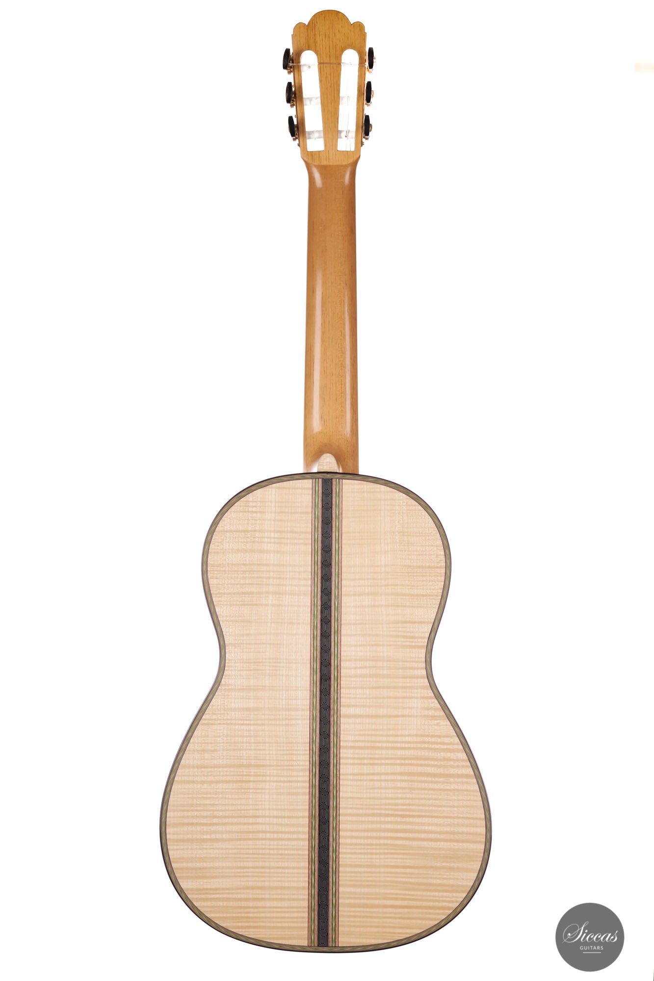 This lovely guitar comes straight from Hans’ workshop and displays wonderful craftsmanship. It is a replica of the guitar built by Antonio de Torres in 1864, during his first epoch, and referenced as the FE 17. Its lightweight spruce top, smaller body, and slightly shorter scale make it particularly ergonomic and easy to play. The luxuriant marquetry and stunning flamed maple back and sides also give it an elegant and authentic look. With a singing first string and vigorous brilliant basses, it projects easily and the tone color range is impressive. Honestly, this guitar sounds much bigger than it is.