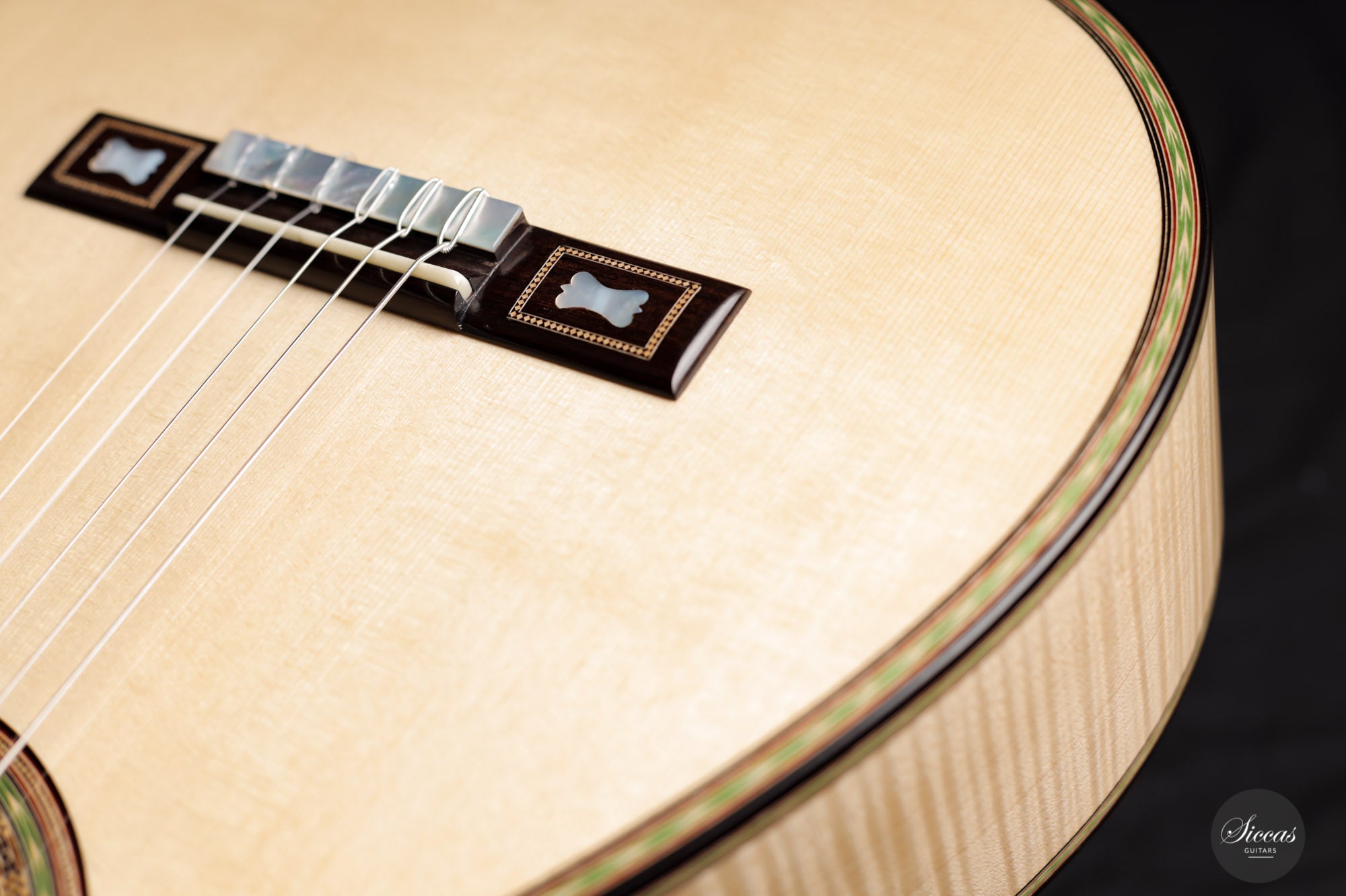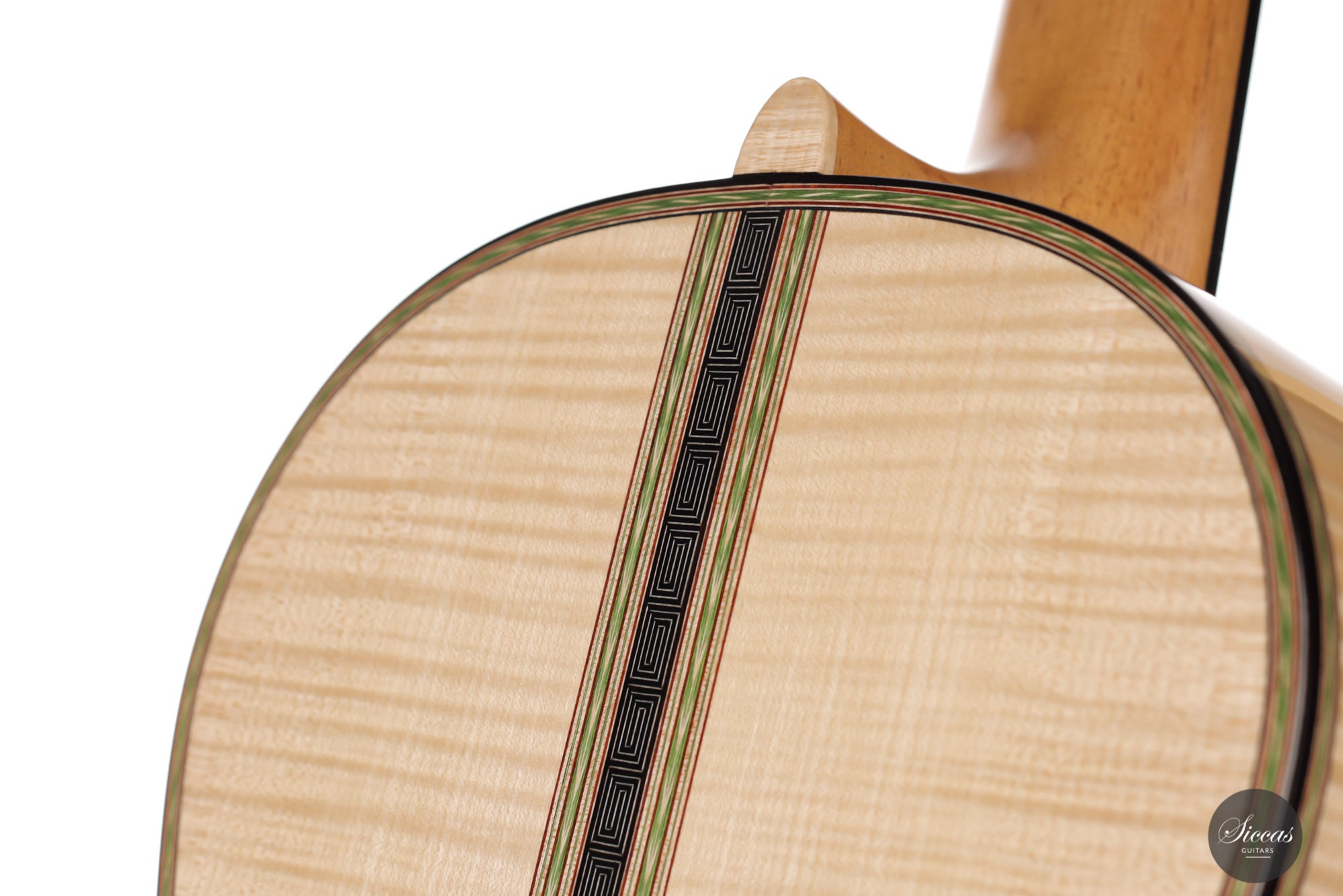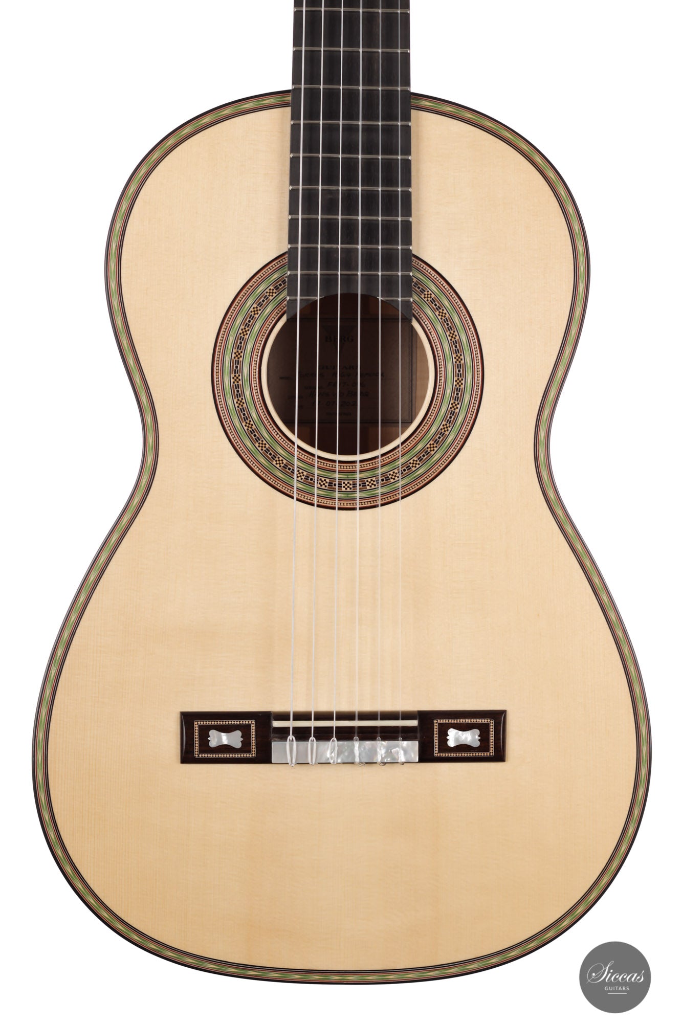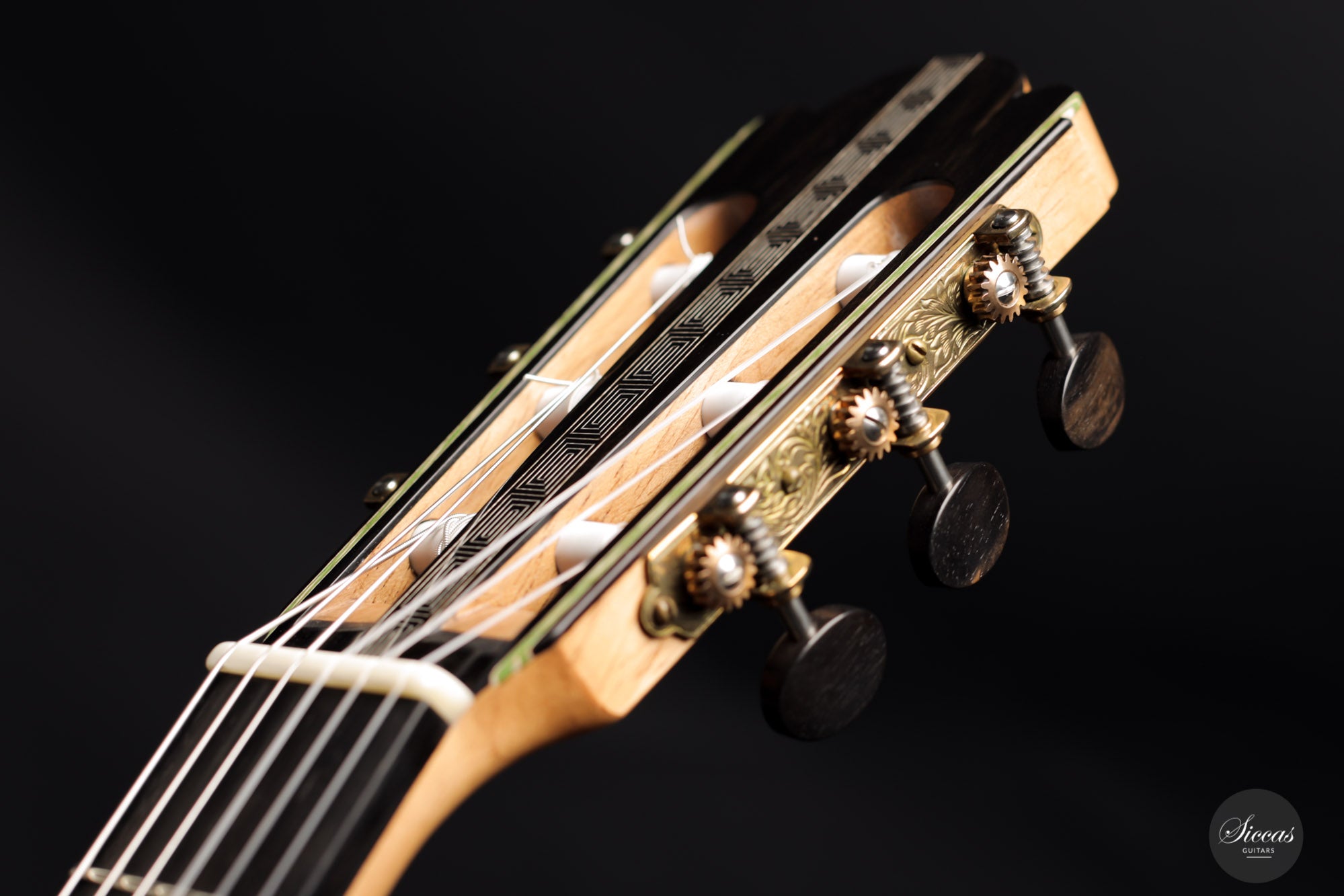 This lovely guitar comes straight from Hans’ workshop and displays wonderful craftsmanship. It is a replica of the guitar built by Antonio de Torres in 1864, during his first epoch, and referenced as the FE 17. Its lightweight spruce top, smaller body, and slightly shorter scale make it particularly ergonomic and easy to play. The luxuriant marquetry and stunning flamed maple back and sides also give it an elegant and authentic look. With a singing first string and vigorous brilliant basses, it projects easily and the tone color range is impressive. Honestly, this guitar sounds much bigger than it is.