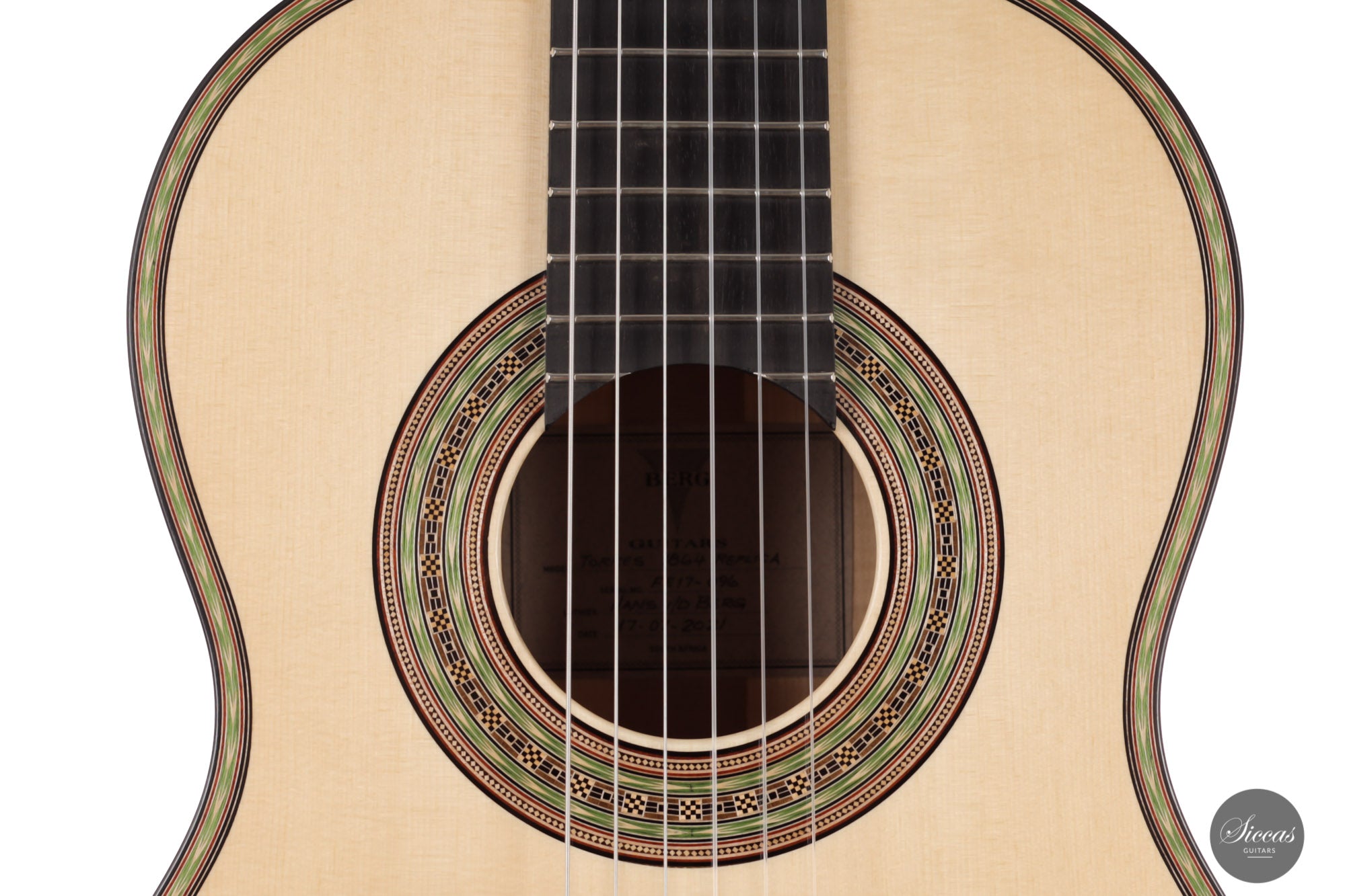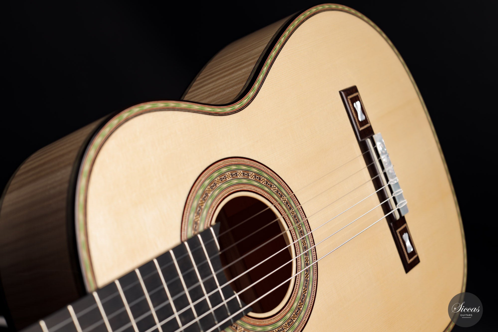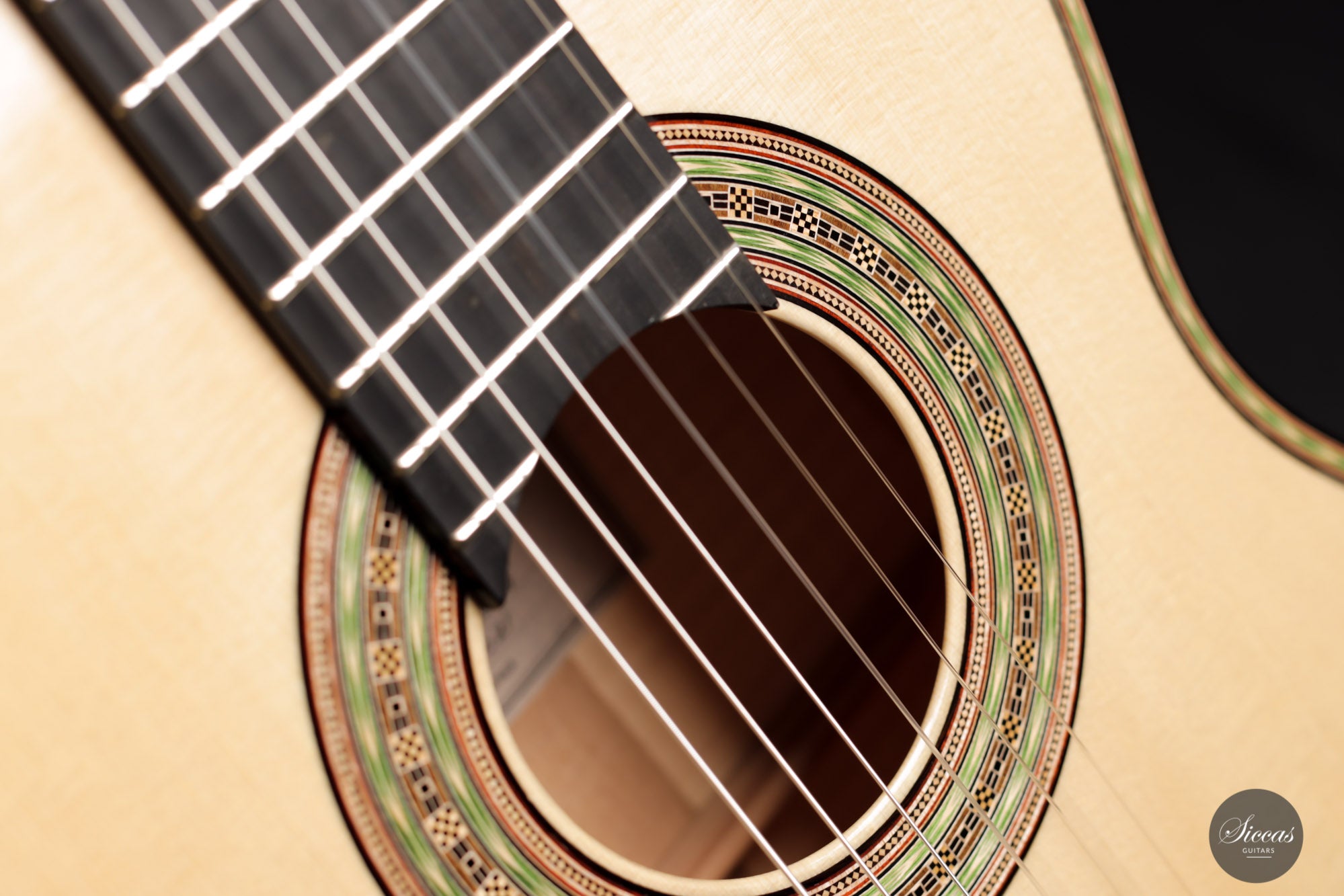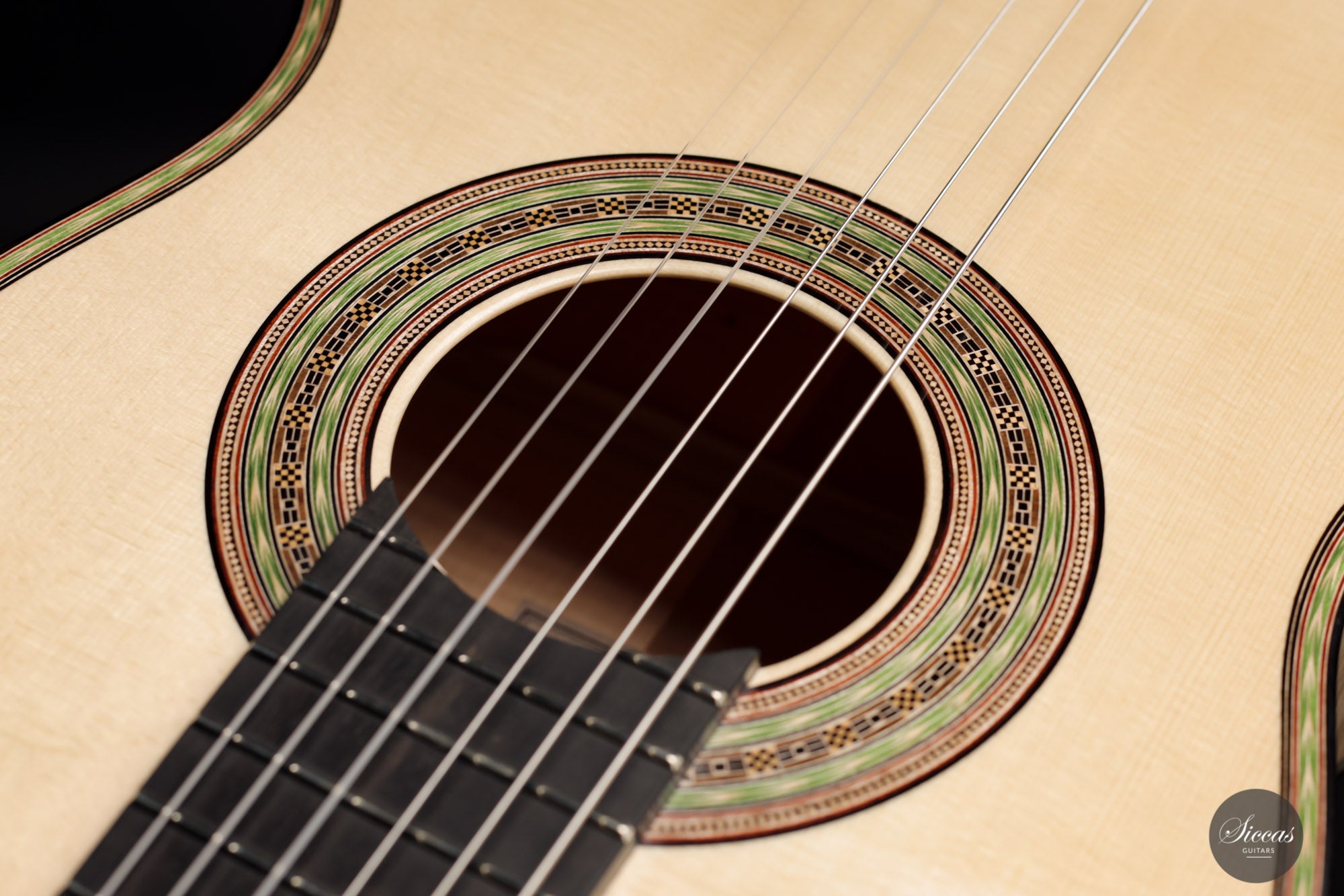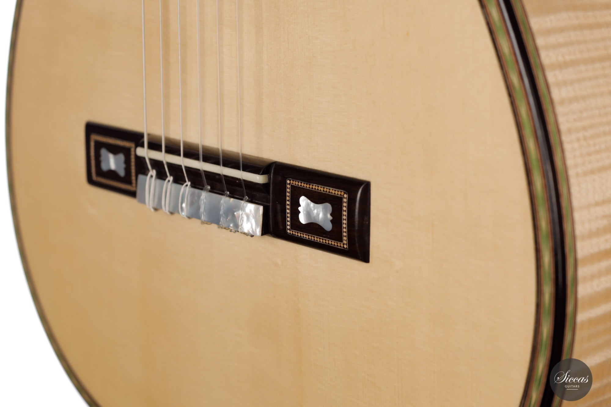 This lovely guitar comes straight from Hans’ workshop and displays wonderful craftsmanship. It is a replica of the guitar built by Antonio de Torres in 1864, during his first epoch, and referenced as the FE 17. Its lightweight spruce top, smaller body, and slightly shorter scale make it particularly ergonomic and easy to play. The luxuriant marquetry and stunning flamed maple back and sides also give it an elegant and authentic look. With a singing first string and vigorous brilliant basses, it projects easily and the tone color range is impressive. Honestly, this guitar sounds much bigger than it is.
