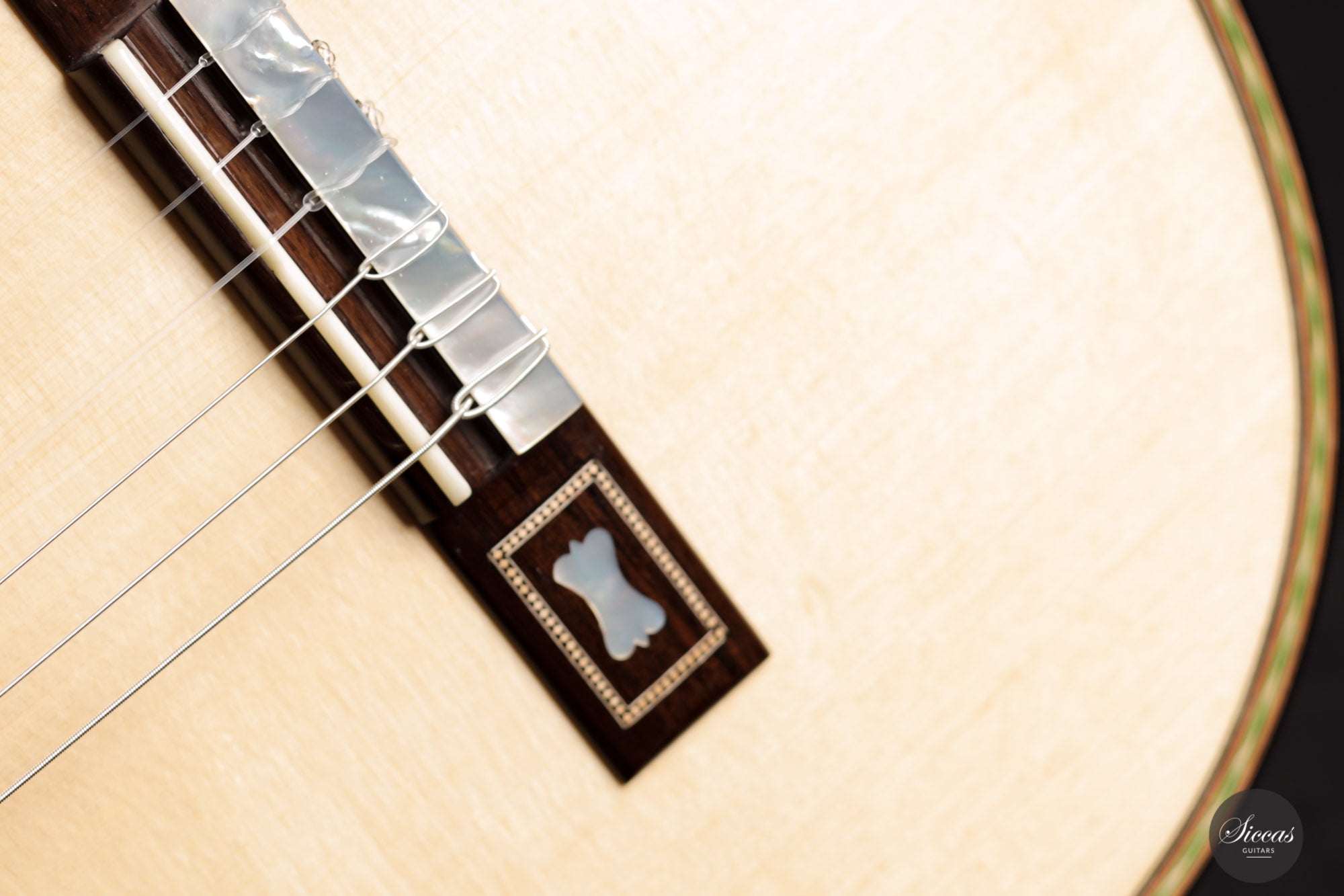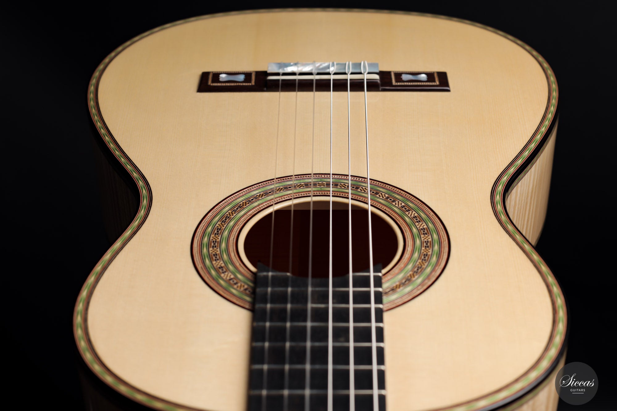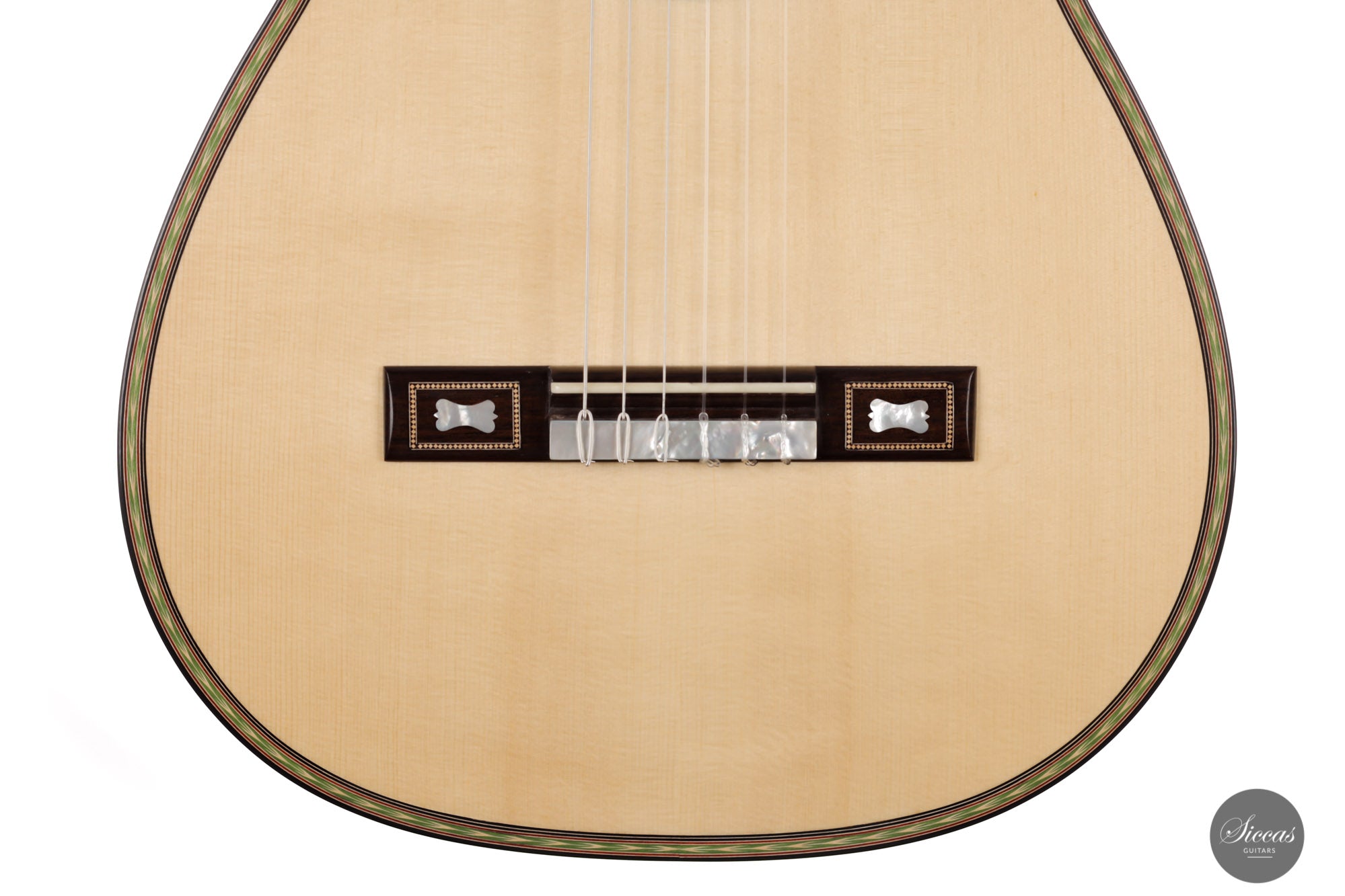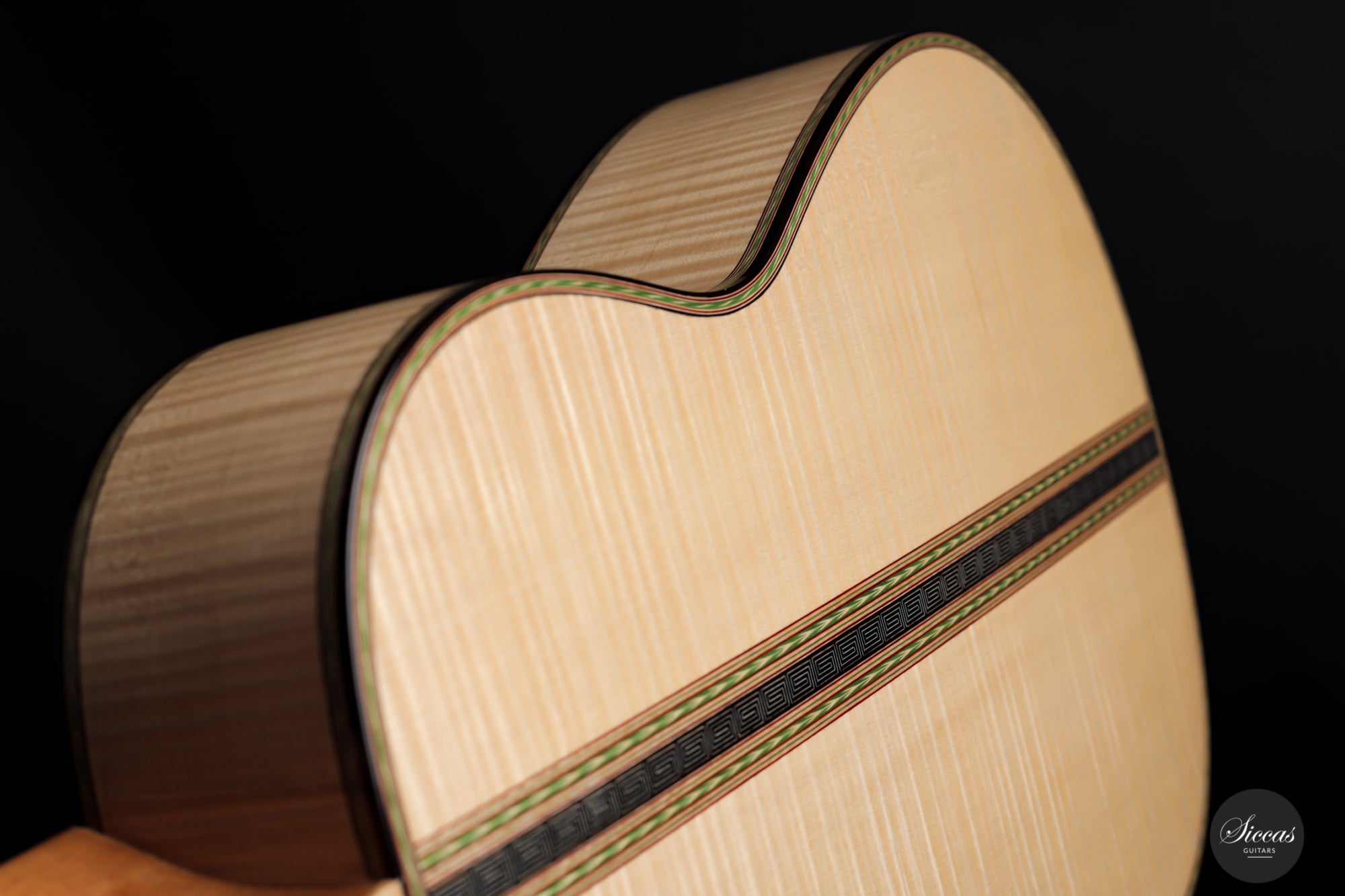 This lovely guitar comes straight from Hans’ workshop and displays wonderful craftsmanship. It is a replica of the guitar built by Antonio de Torres in 1864, during his first epoch, and referenced as the FE 17. Its lightweight spruce top, smaller body, and slightly shorter scale make it particularly ergonomic and easy to play. The luxuriant marquetry and stunning flamed maple back and sides also give it an elegant and authentic look. With a singing first string and vigorous brilliant basses, it projects easily and the tone color range is impressive. Honestly, this guitar sounds much bigger than it is.