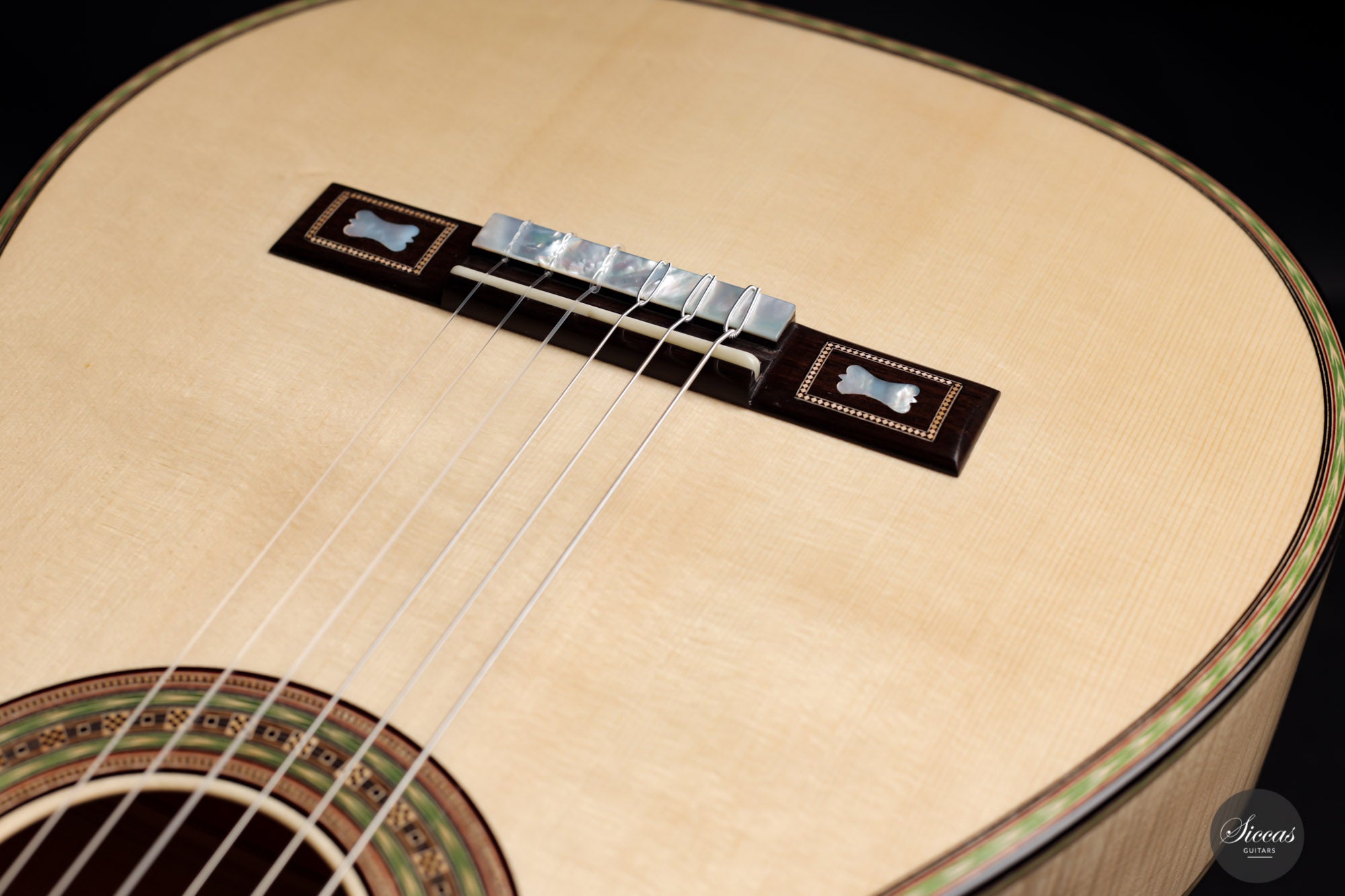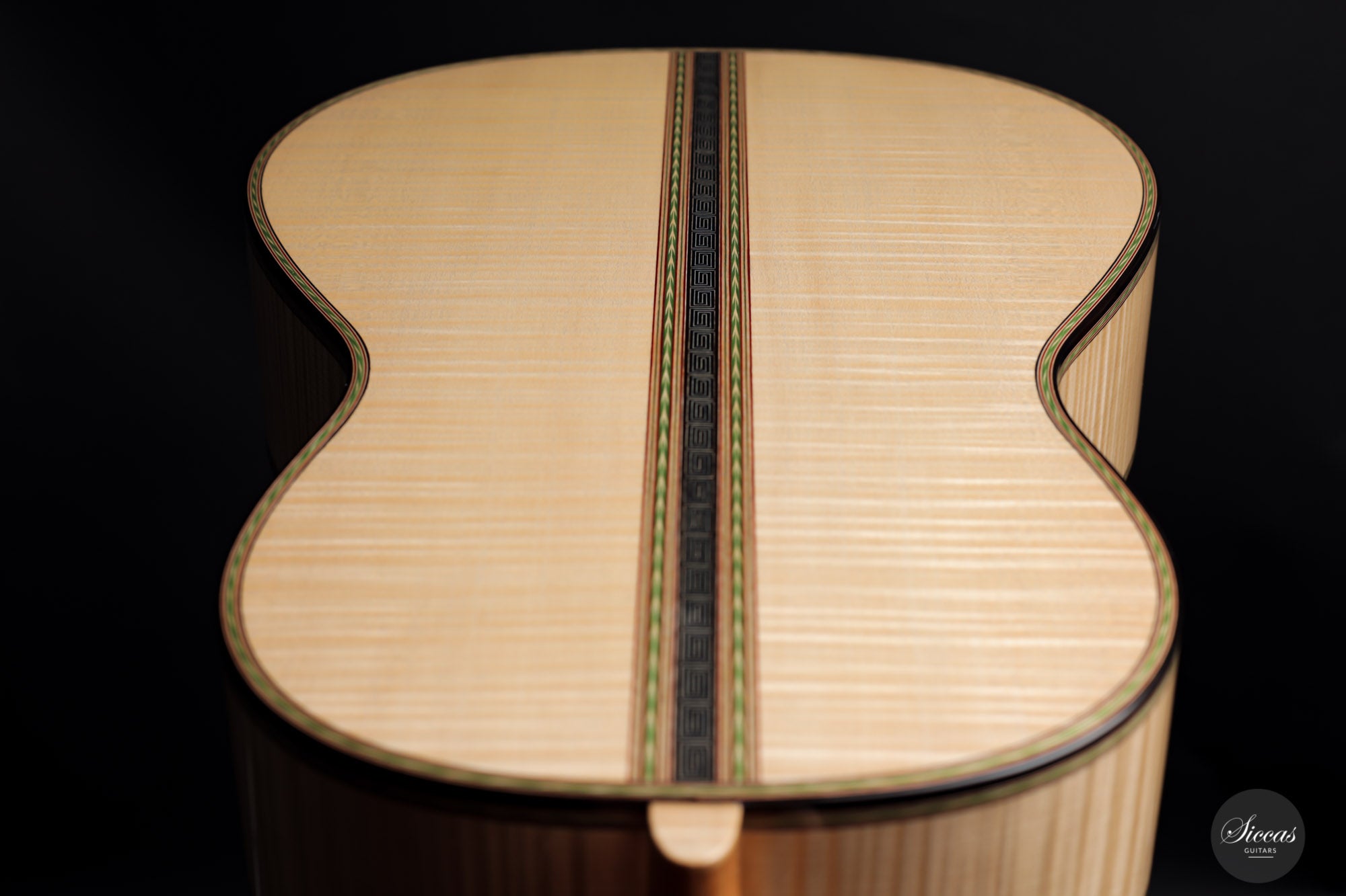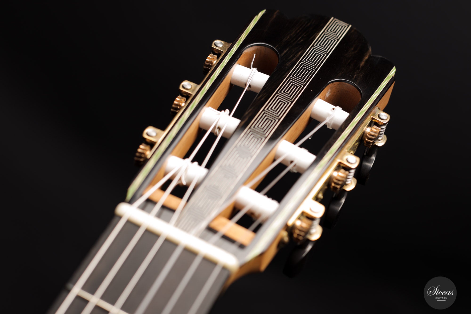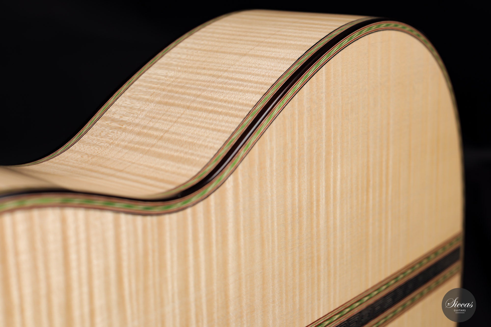 This lovely guitar comes straight from Hans’ workshop and displays wonderful craftsmanship. It is a replica of the guitar built by Antonio de Torres in 1864, during his first epoch, and referenced as the FE 17. Its lightweight spruce top, smaller body, and slightly shorter scale make it particularly ergonomic and easy to play. The luxuriant marquetry and stunning flamed maple back and sides also give it an elegant and authentic look. With a singing first string and vigorous brilliant basses, it projects easily and the tone color range is impressive. Honestly, this guitar sounds much bigger than it is.