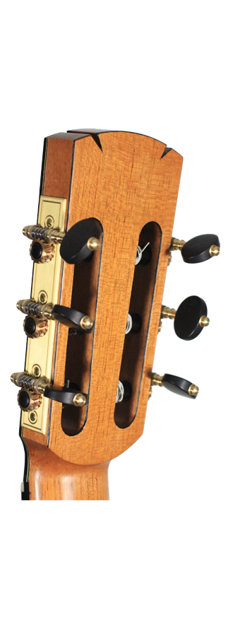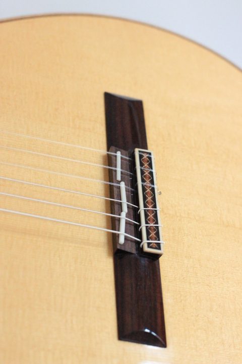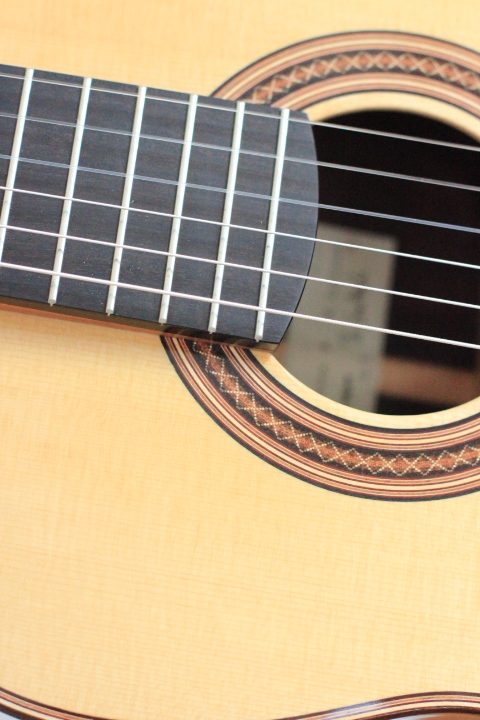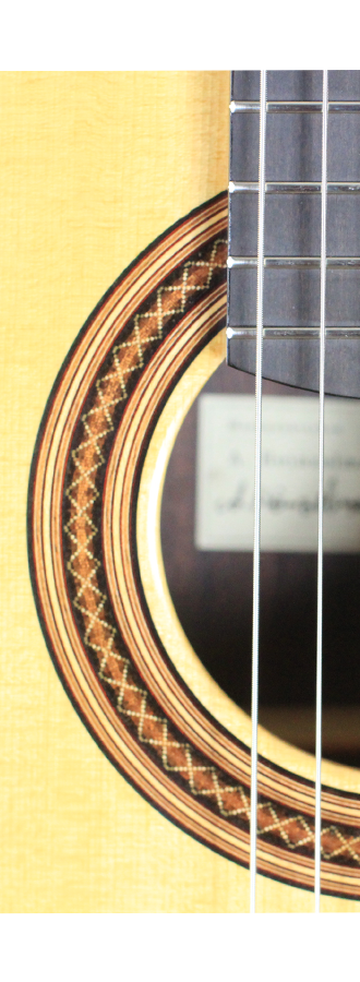 Adrian Heinzelmann and Benaja Leutzsch belong to the most aspiring luthiers in Germany. In this guitar many own ideas were included, i.e. the bridge consisting of a three-piece bone inlay. The top is made of fine-grained spruce with an embedded and magnificently decorated rosette. Back and sides are made of Madagascar rosewood. The fingerboard is raised above the top. Neck and head are made of cedro. The guitar is refined with shellac polish. The machine heads are by Alessi.