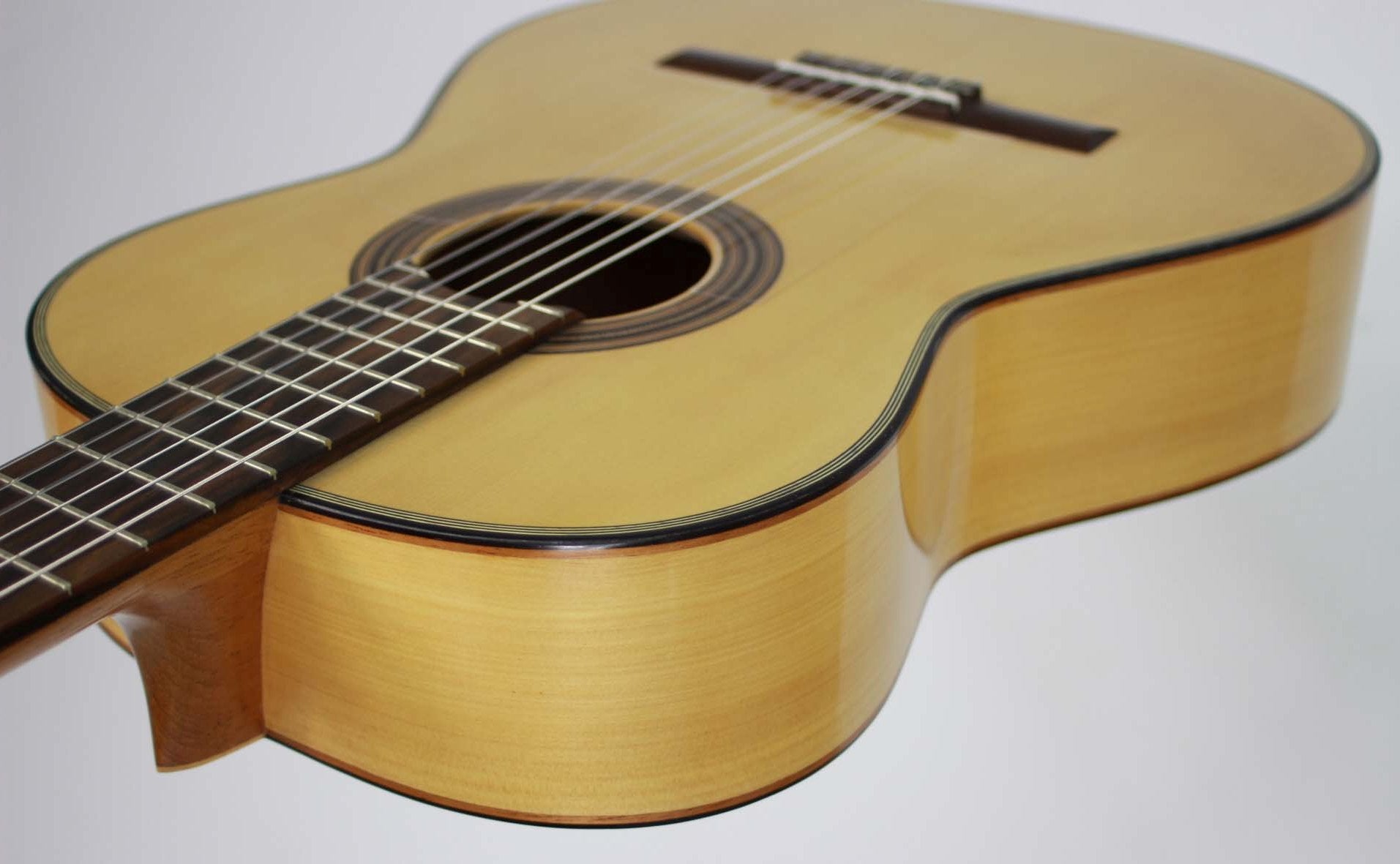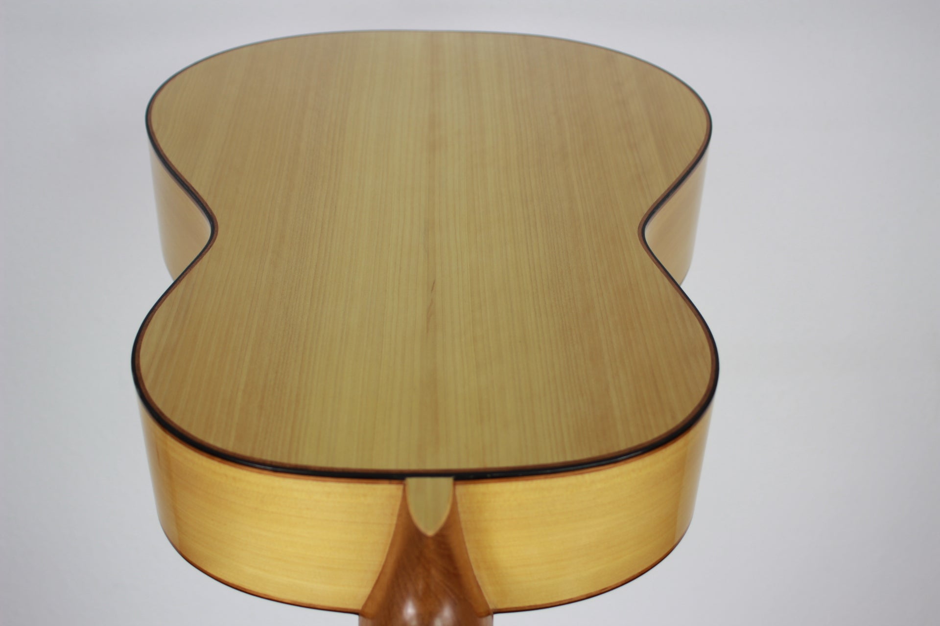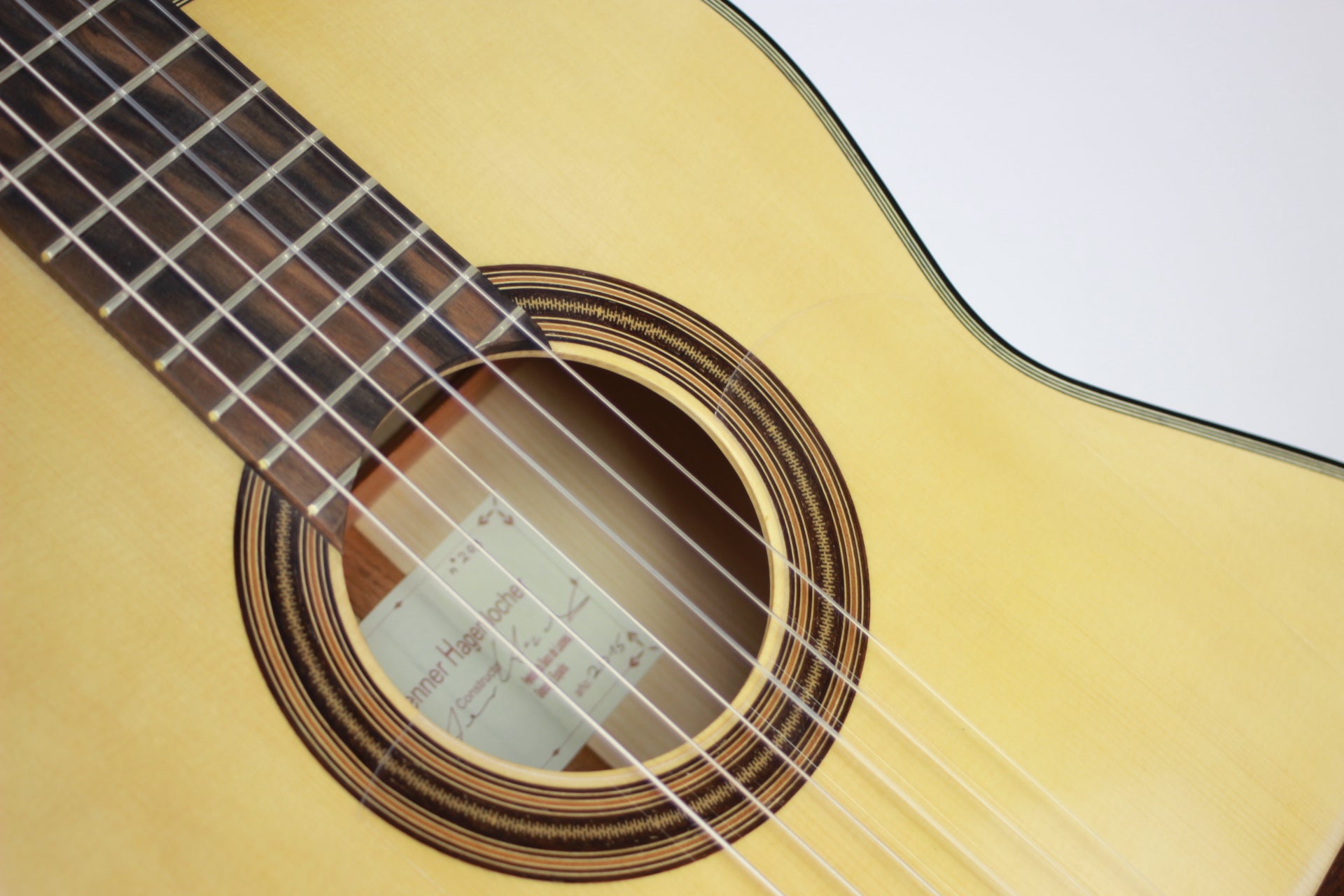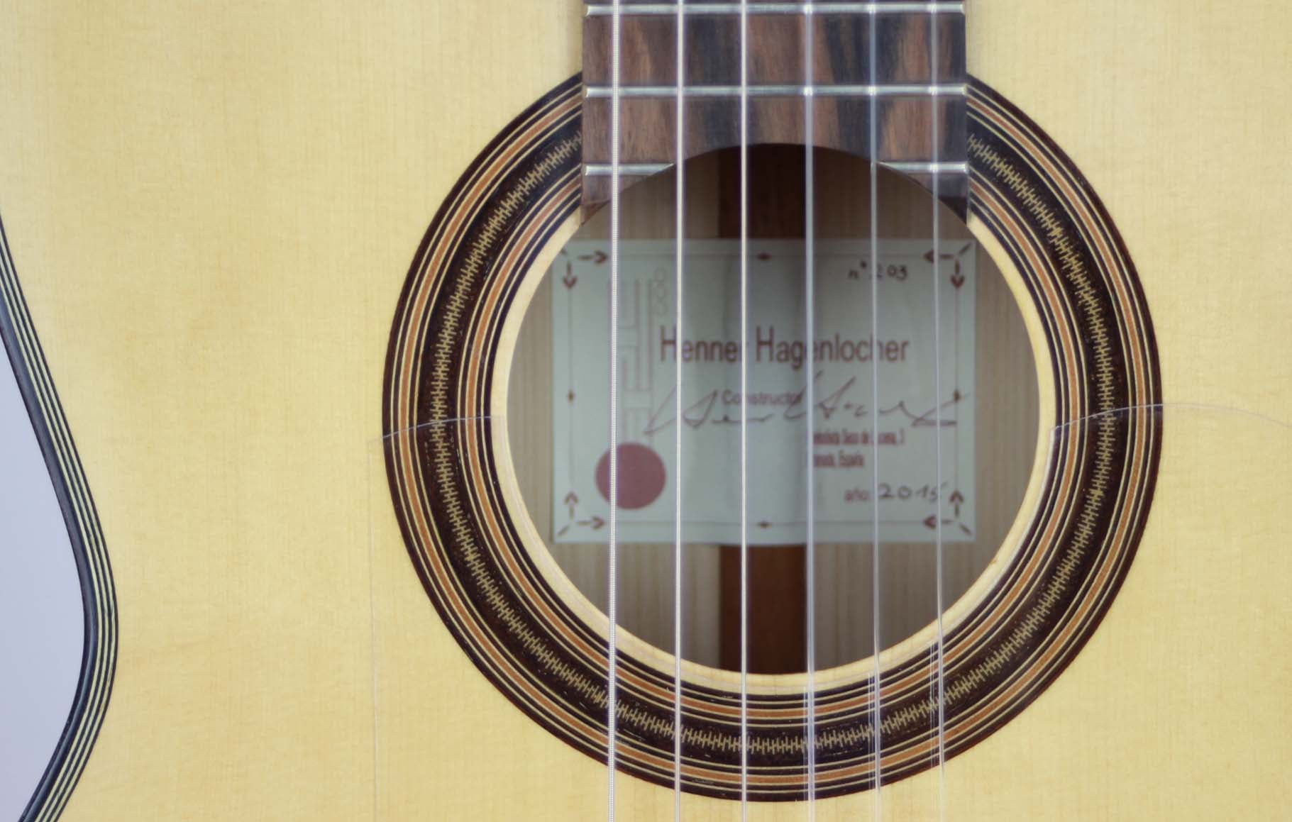 Henner Hagenlocher began building guitars in Hamburg in 1990 in the workshop of luthier Michael Wichmann. When he started his main focus was to study guitars by Torres. During this time he focused to build copies of these maker but also to develop his own models. After this period in Hamburg, he studied Music-Technology at the Guildhall University in London, where he studied the construction of Spanish guitars but also other stringed instruments. After he had completed his studies, he remained another year in London until he moved to Granada. In 1996 he opened there, in Calle Guadarrama 3, his own workshop. There he studied a lot about the granadinian style of guitar construction and learned a lot from other luthiers like Antonio Marin Montero. This brand-new guitar was brought last week by Henner in our shop. The top is made of finest spruce, the back and sides are made of cypress. The sound is very clear and crisp and it reacts very fast. Body resonance is around F#. The tuning machines are by Fustero.