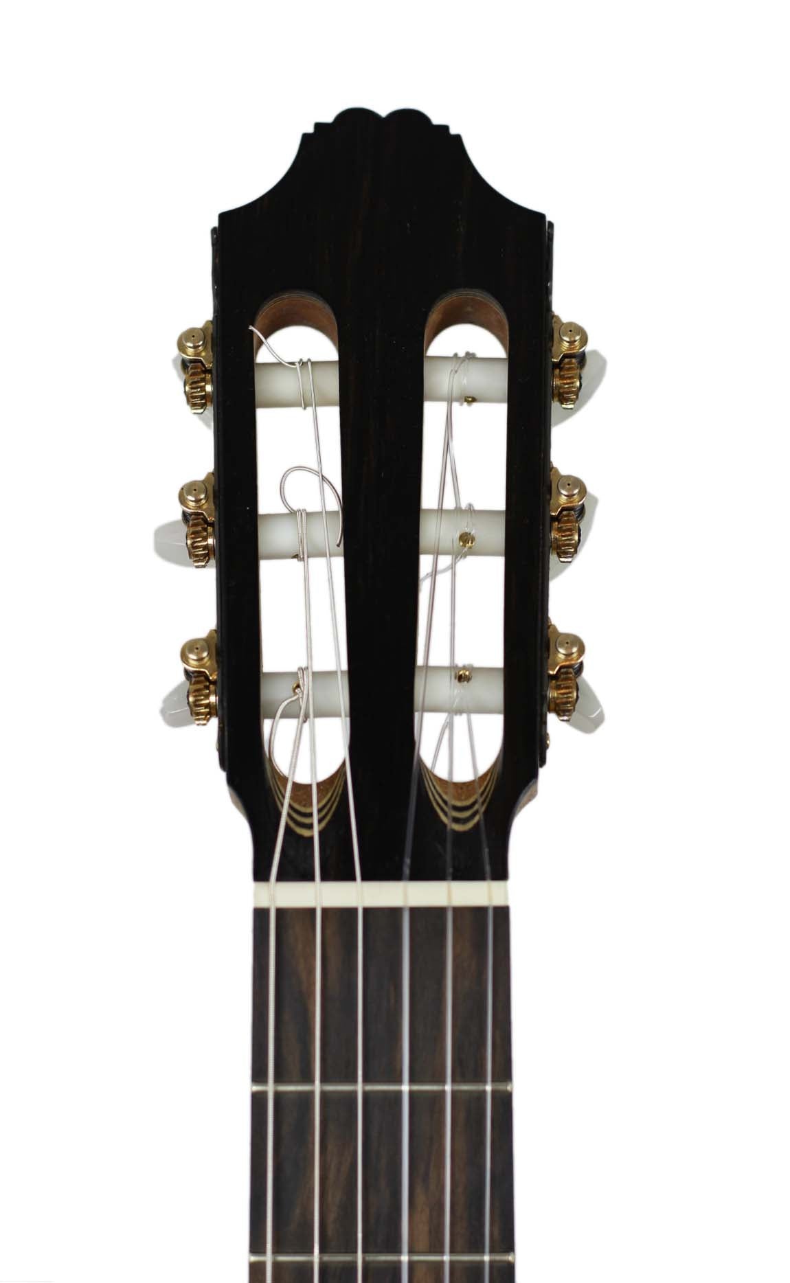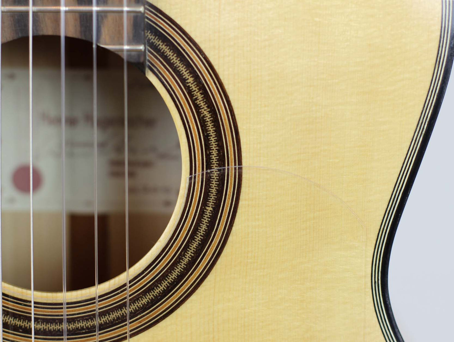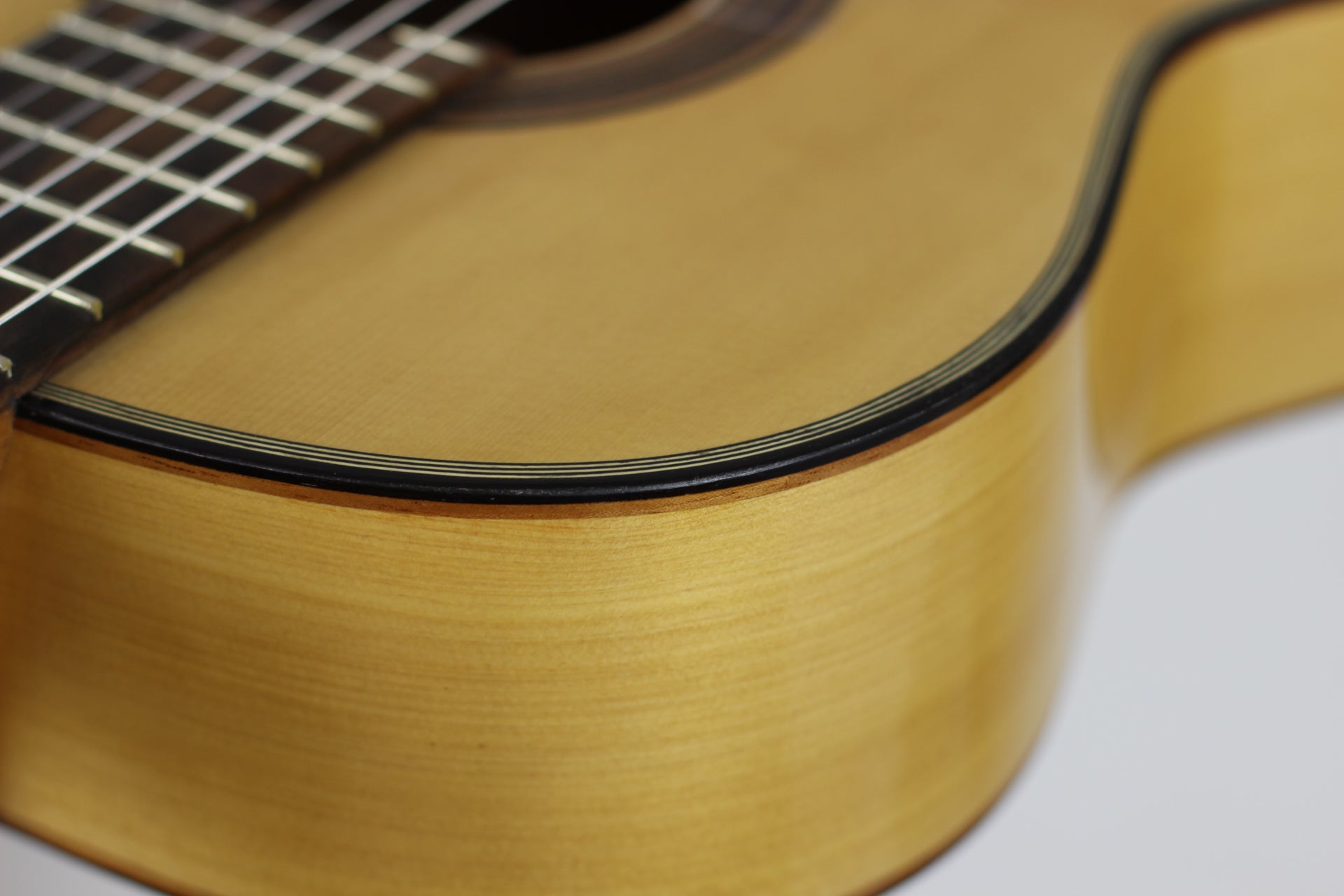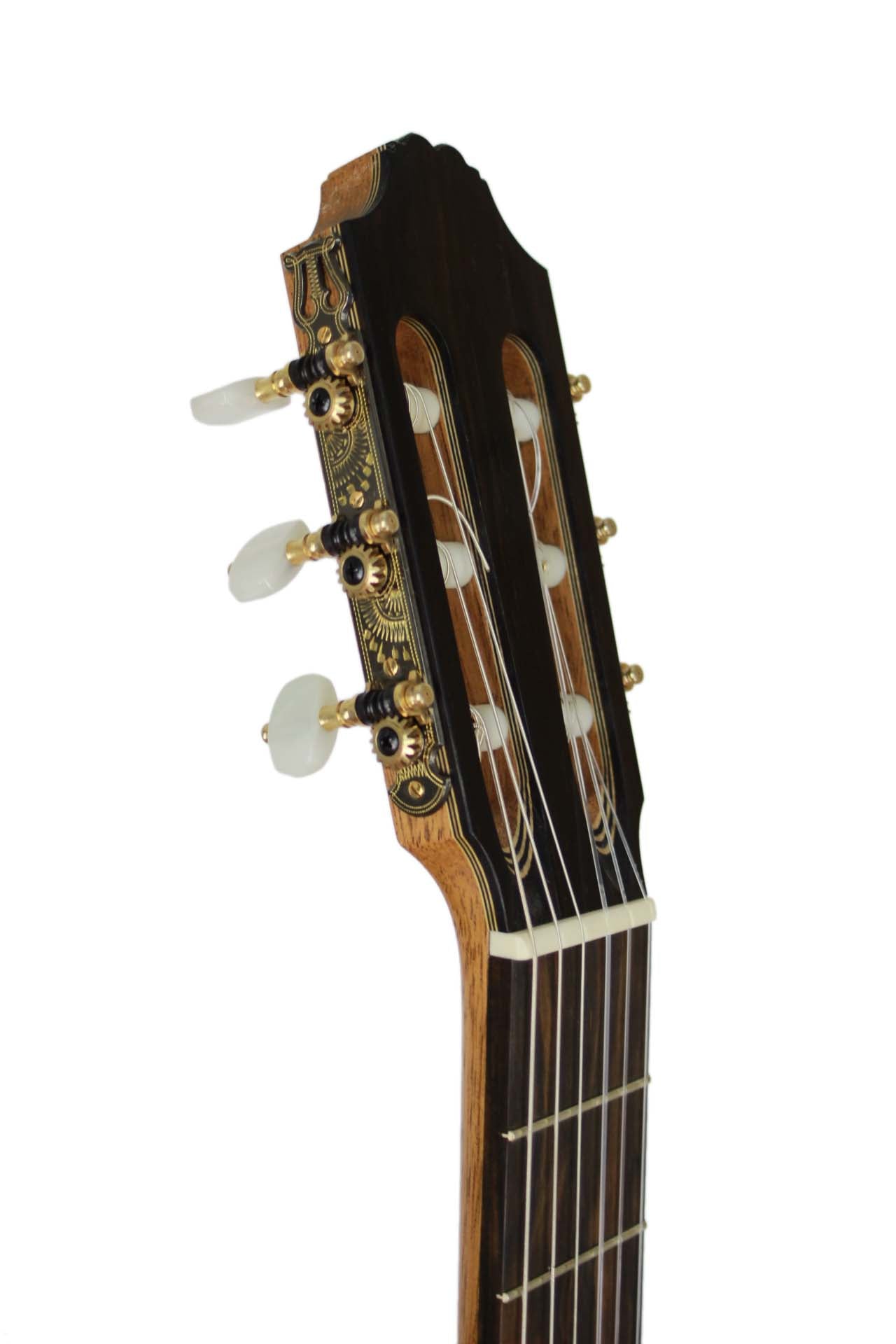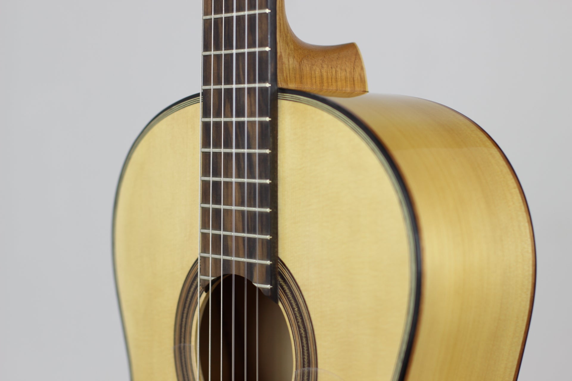 Henner Hagenlocher began building guitars in Hamburg in 1990 in the workshop of luthier Michael Wichmann. When he started his main focus was to study guitars by Torres. During this time he focused to build copies of these maker but also to develop his own models. After this period in Hamburg, he studied Music-Technology at the Guildhall University in London, where he studied the construction of Spanish guitars but also other stringed instruments. After he had completed his studies, he remained another year in London until he moved to Granada. In 1996 he opened there, in Calle Guadarrama 3, his own workshop. There he studied a lot about the granadinian style of guitar construction and learned a lot from other luthiers like Antonio Marin Montero. This brand-new guitar was brought last week by Henner in our shop. The top is made of finest spruce, the back and sides are made of cypress. The sound is very clear and crisp and it reacts very fast. Body resonance is around F#. The tuning machines are by Fustero.