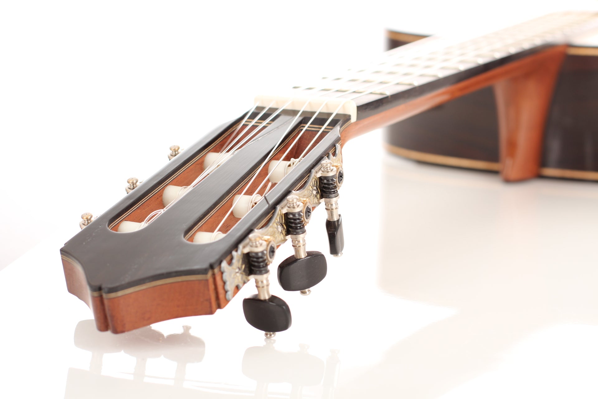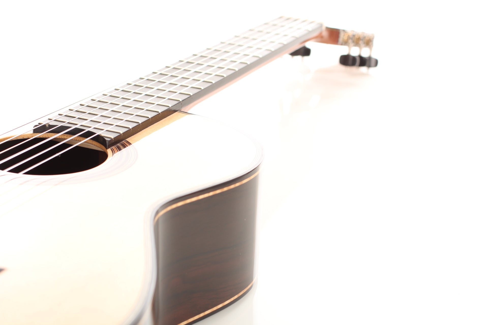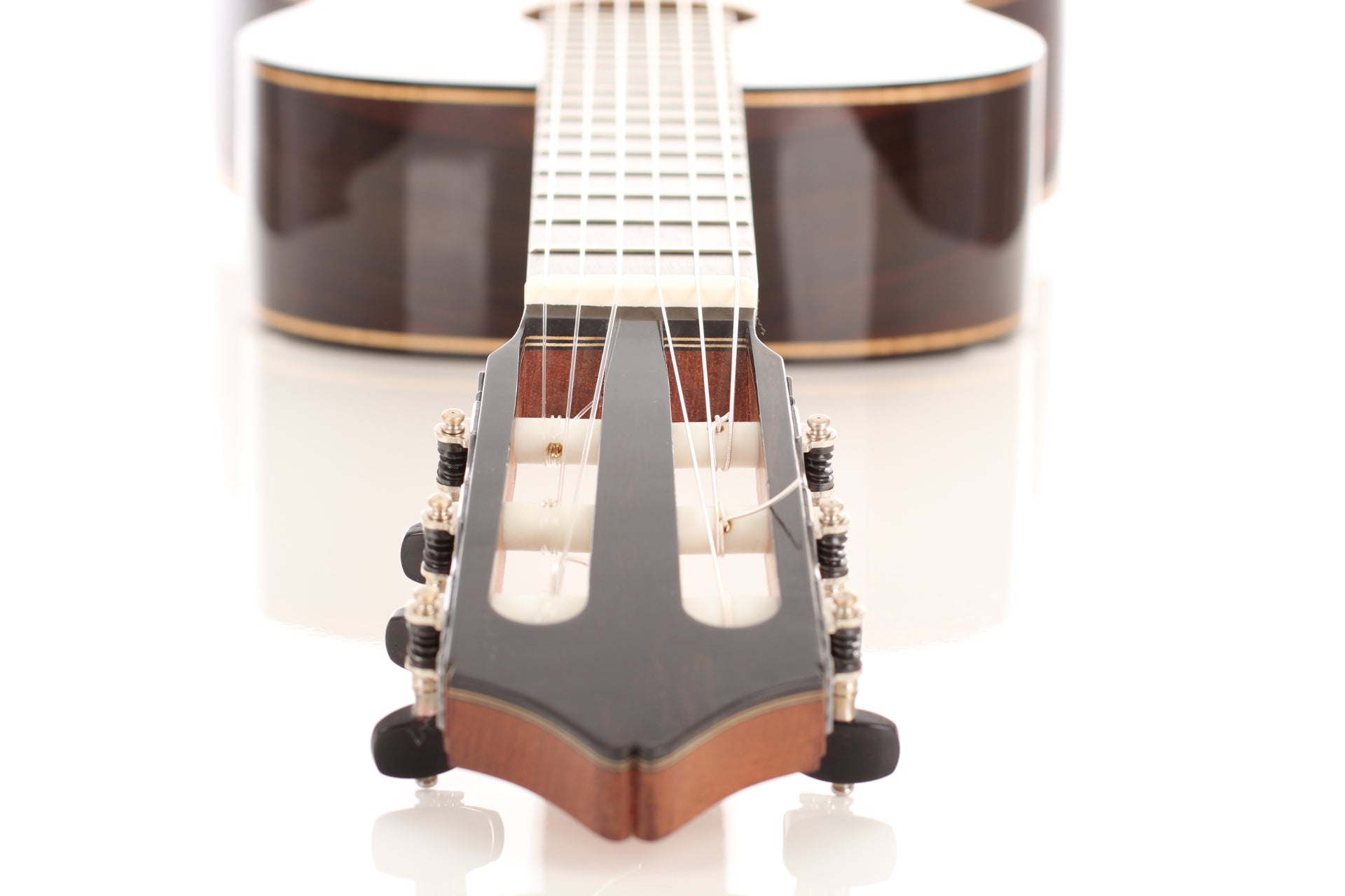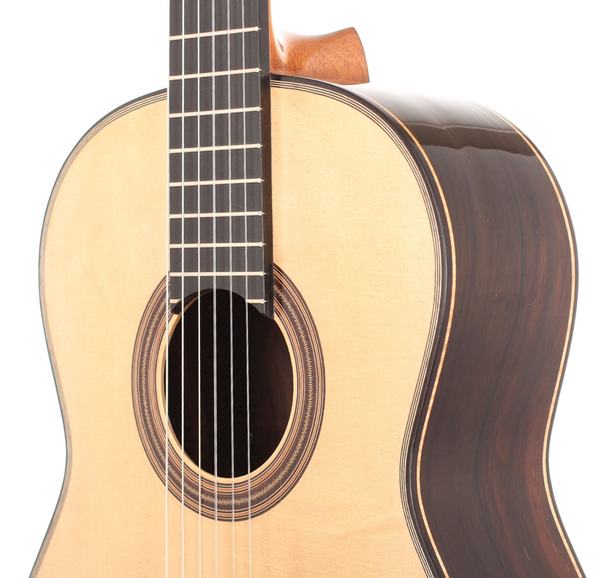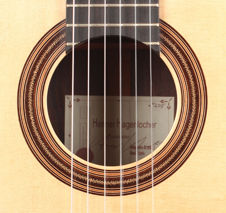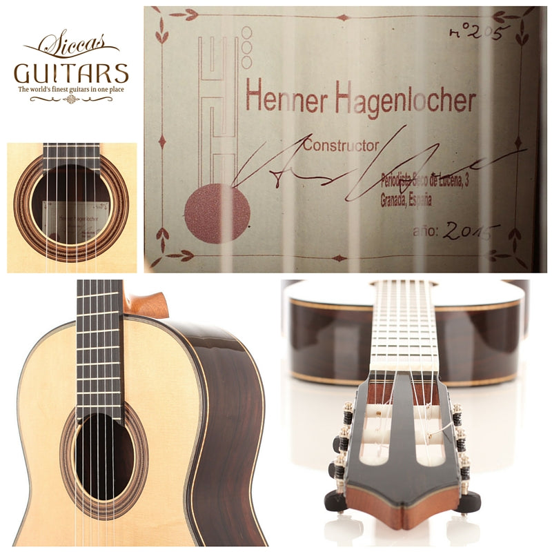 Henner Hagenlocher began building guitars in Hamburg in 1990 in the workshop of luthier Michael Wichmann. When he started his main focus was to study guitars by Torres. During this time he focused to build copies but also to develop his own models. After this period in Hamburg, he studied Music-Technology at the Guildhall University in London, where he studied the construction of Spanish guitars but also other stringed instruments. After he had completed his studies, he remained another year in London until he moved to Granada. In 1996 he opened there, in Calle Guadarrama 3, his own workshop. There he studied a lot about the granadinian style of guitar construction and learned a lot from other luthiers like Antonio Marin Montero. The top is made of finest spruce, the back and sides are made of rosewood. The sound is very clear and crisp and it reacts very fast. Body resonance is around F#. The tuning machines are made by Fustero.