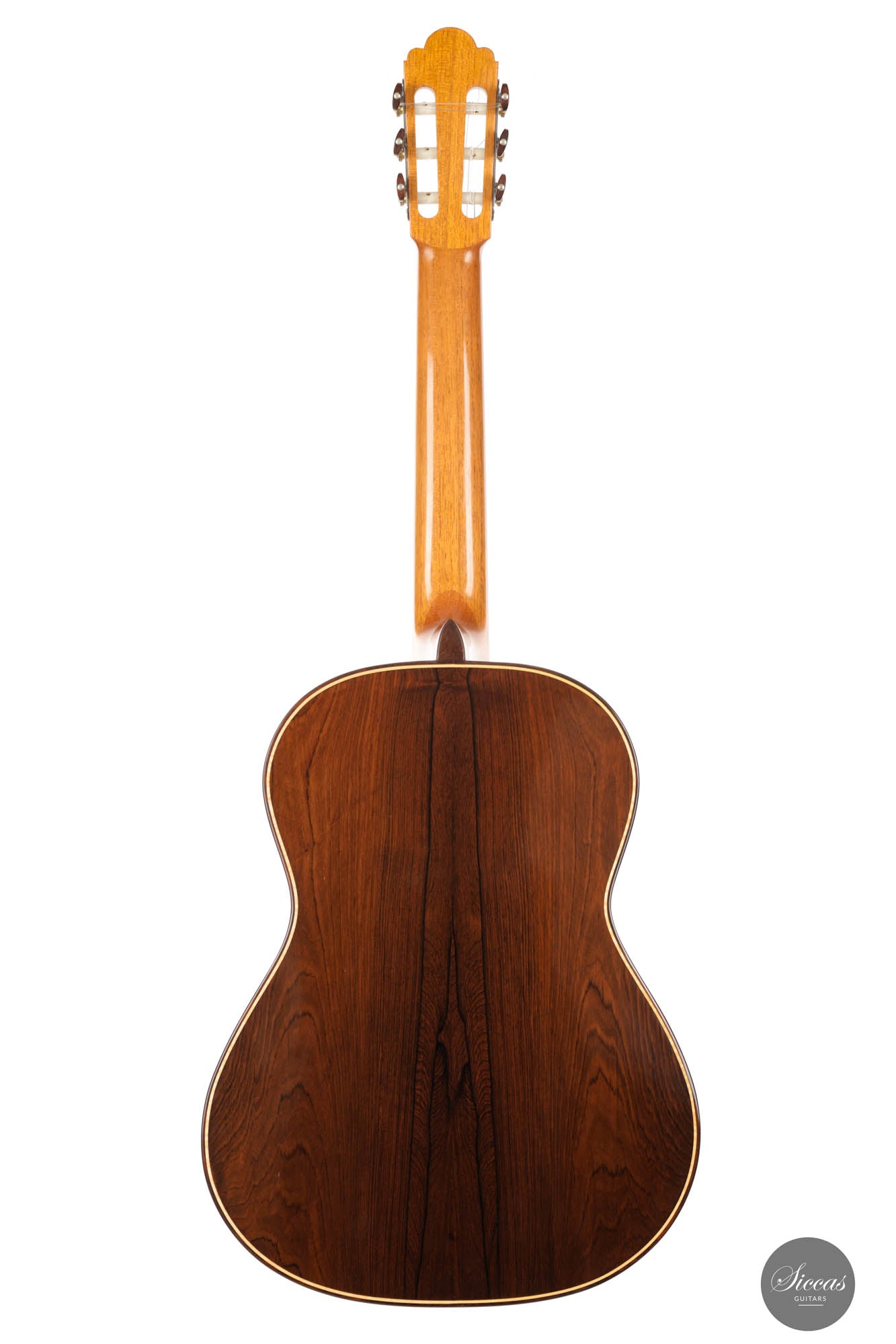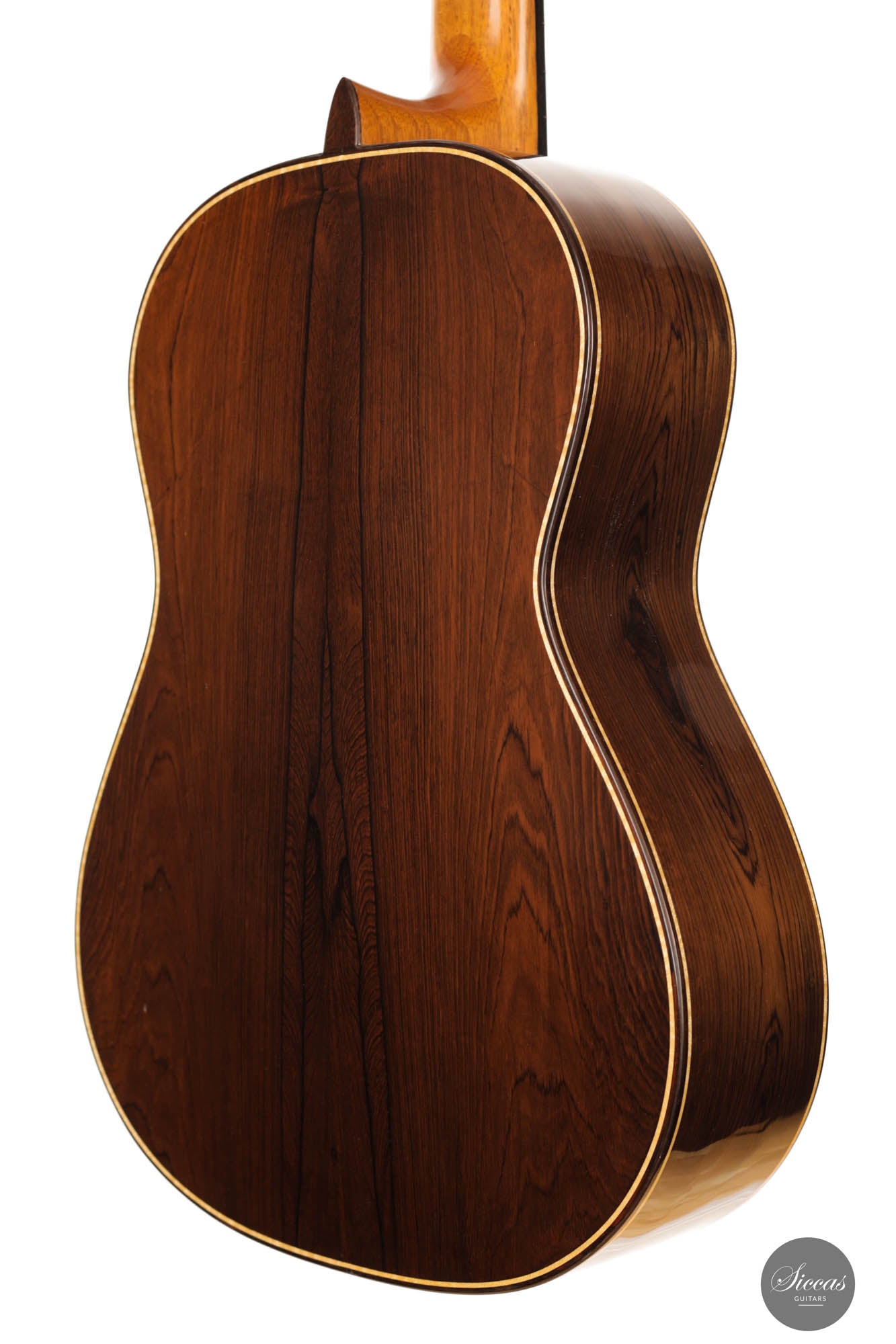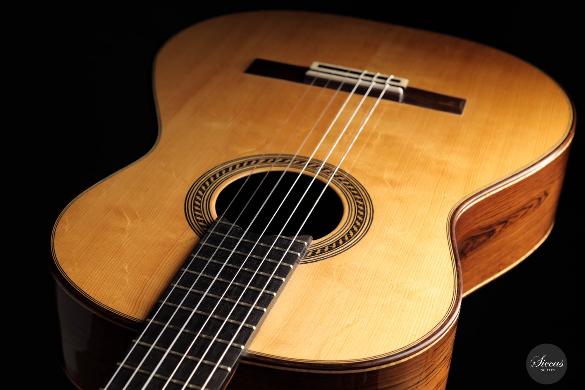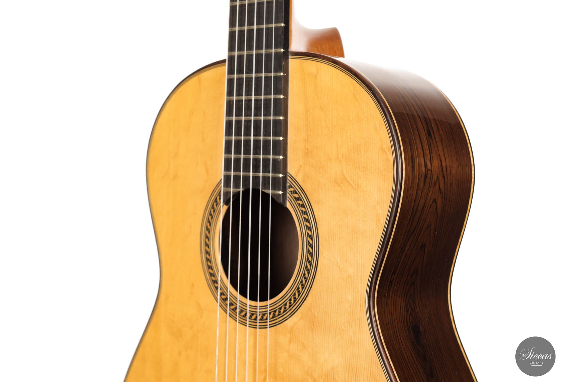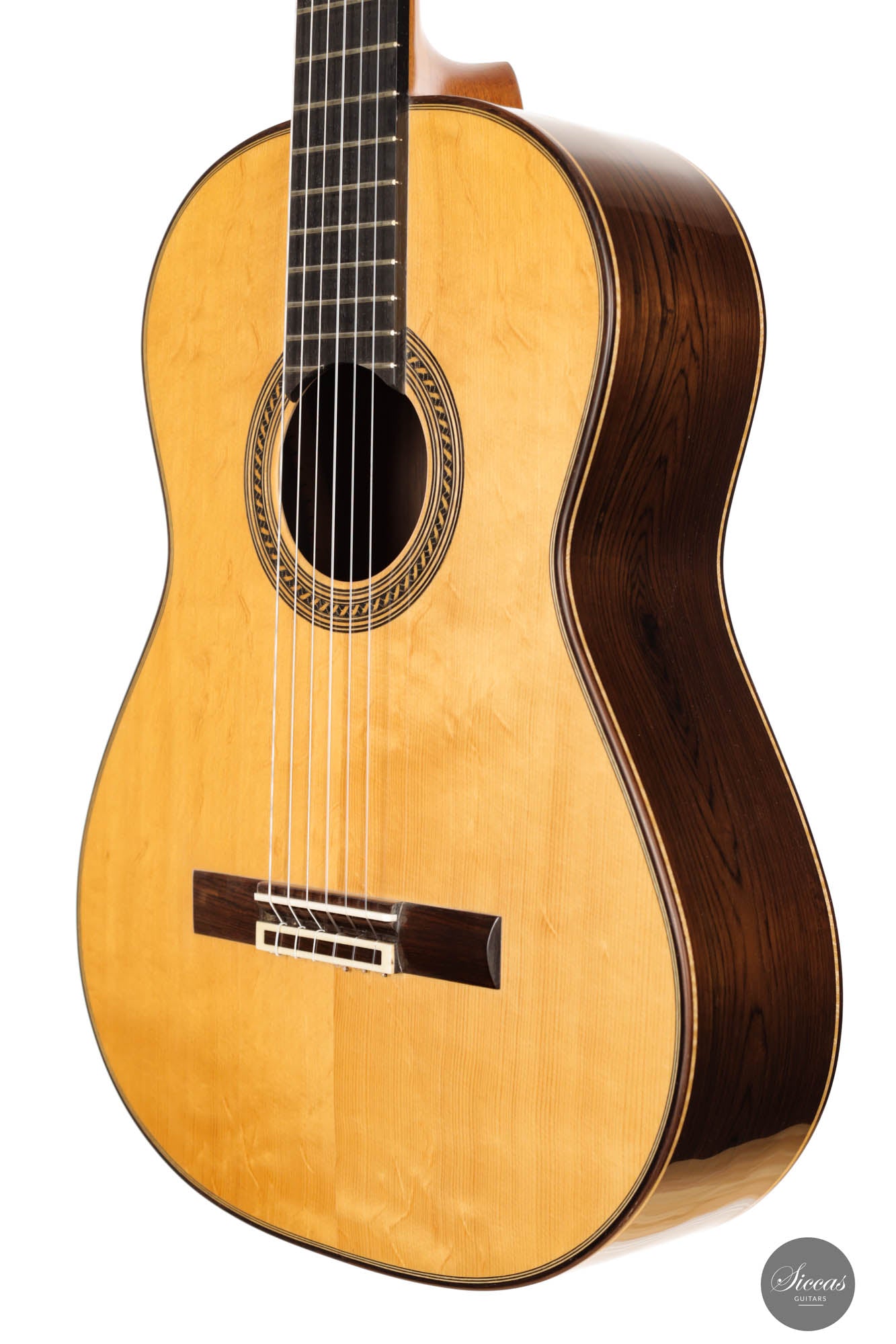 This breathtaking guitar is more than just wood and strings; it's a symphony of history, homage, and unparalleled craftsmanship. The three-lobes head gracefully nods to Torres, while its bear-claw spruce top whispers tales of delicate artistry. The Amazon rosewood, with its mesmerizing patterns, flows across the back and sides, creating a visual concert that's as compelling as its sound. Adorned with top-tier Fustero tuners, its every detail sings of precision.