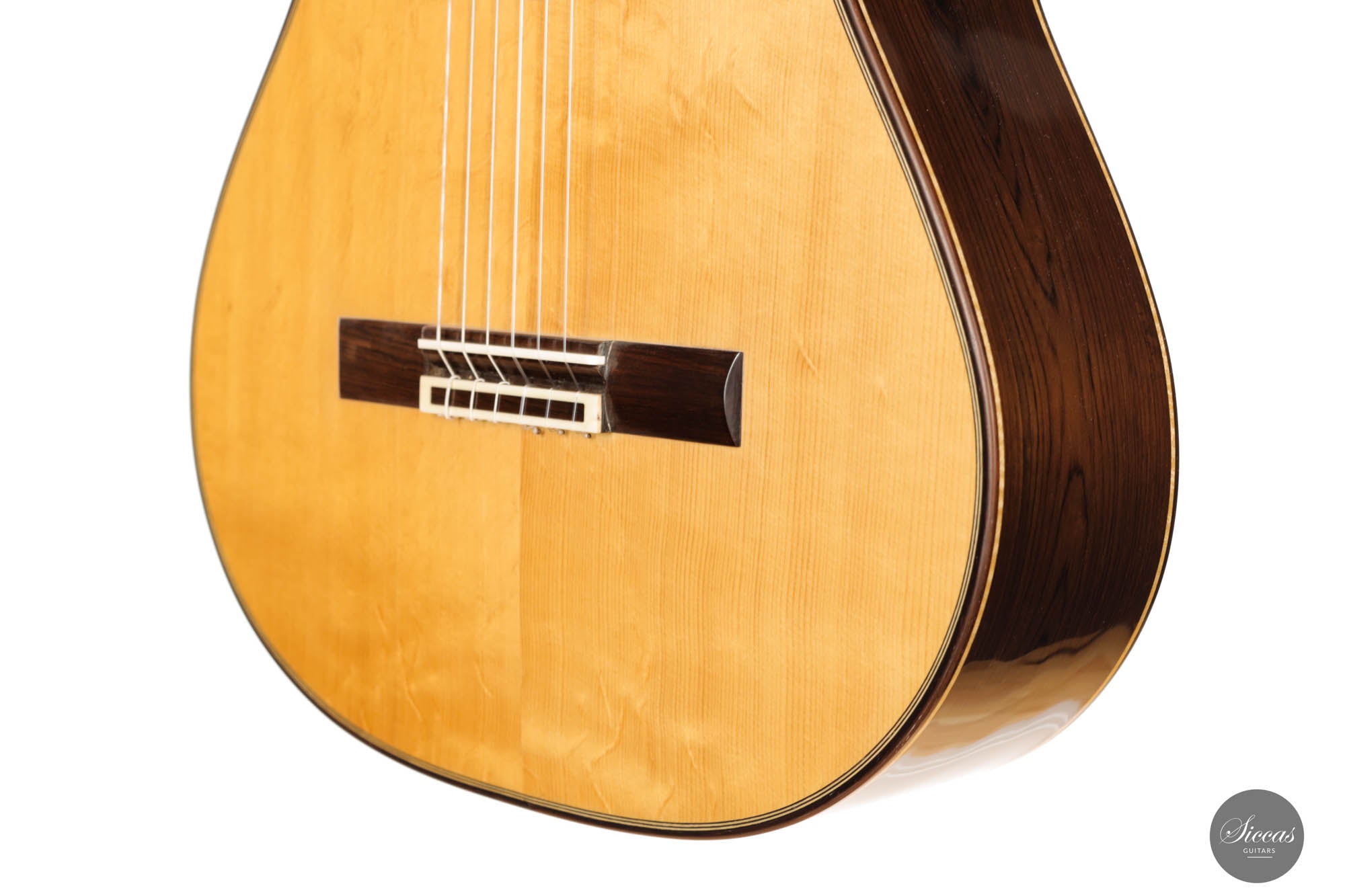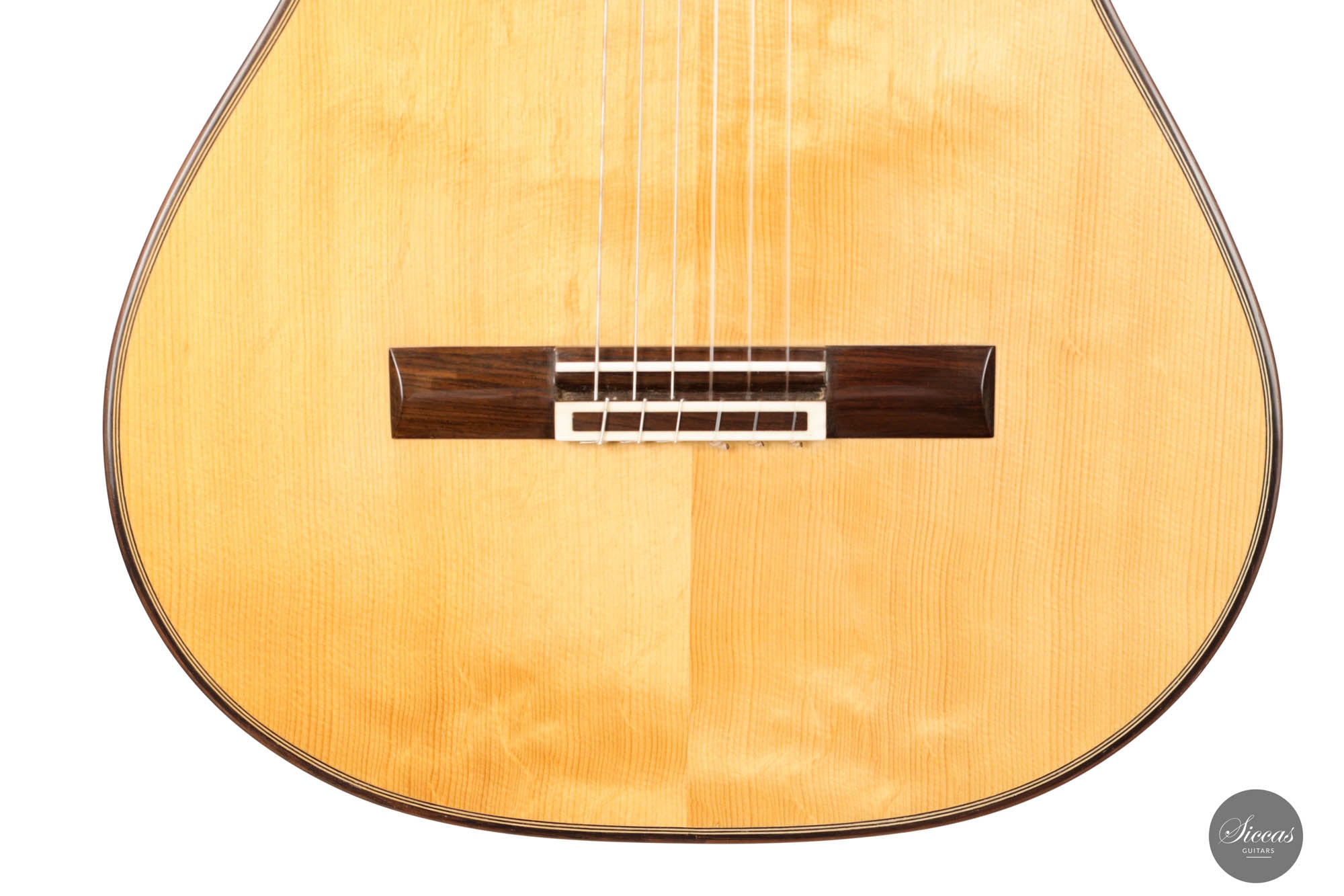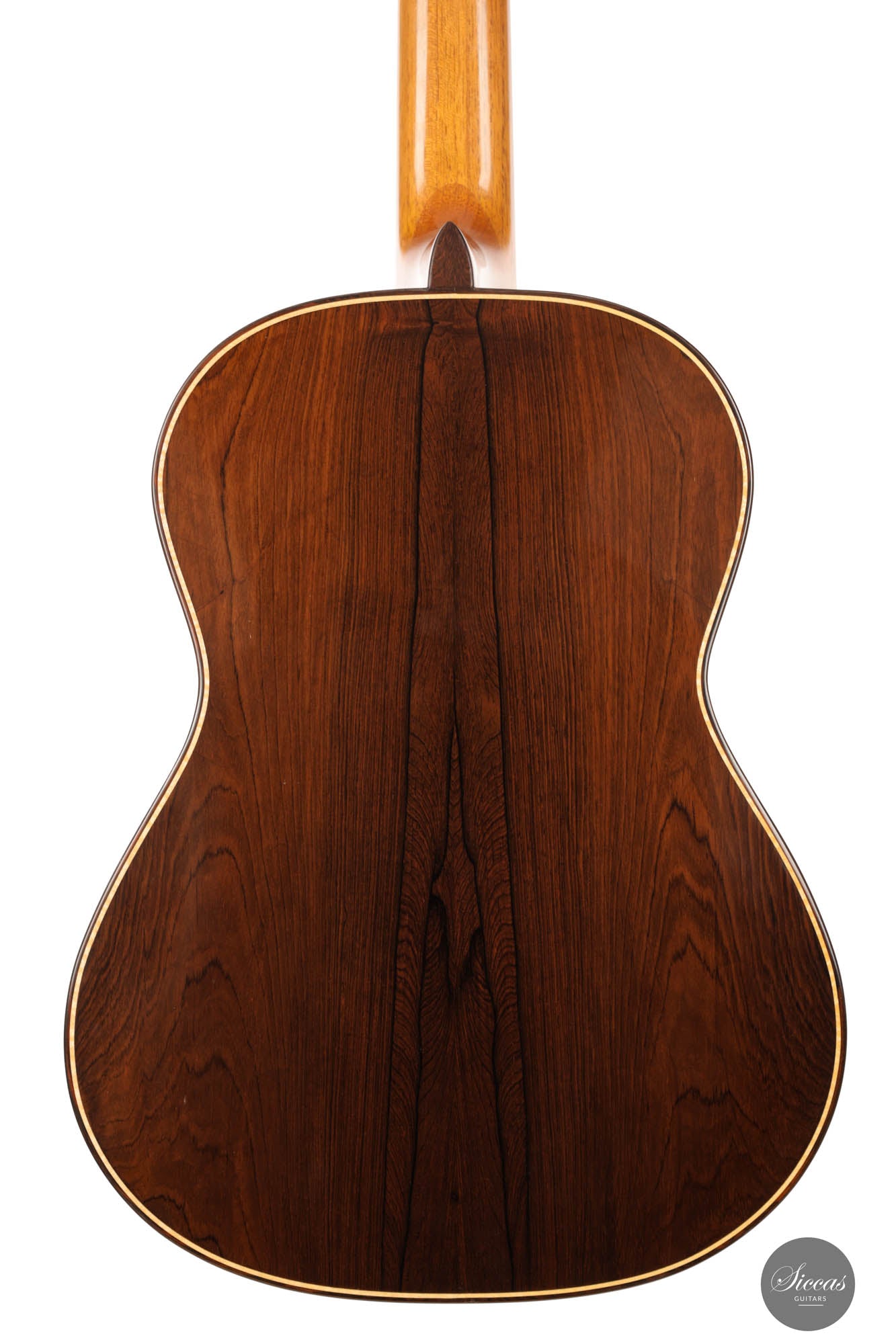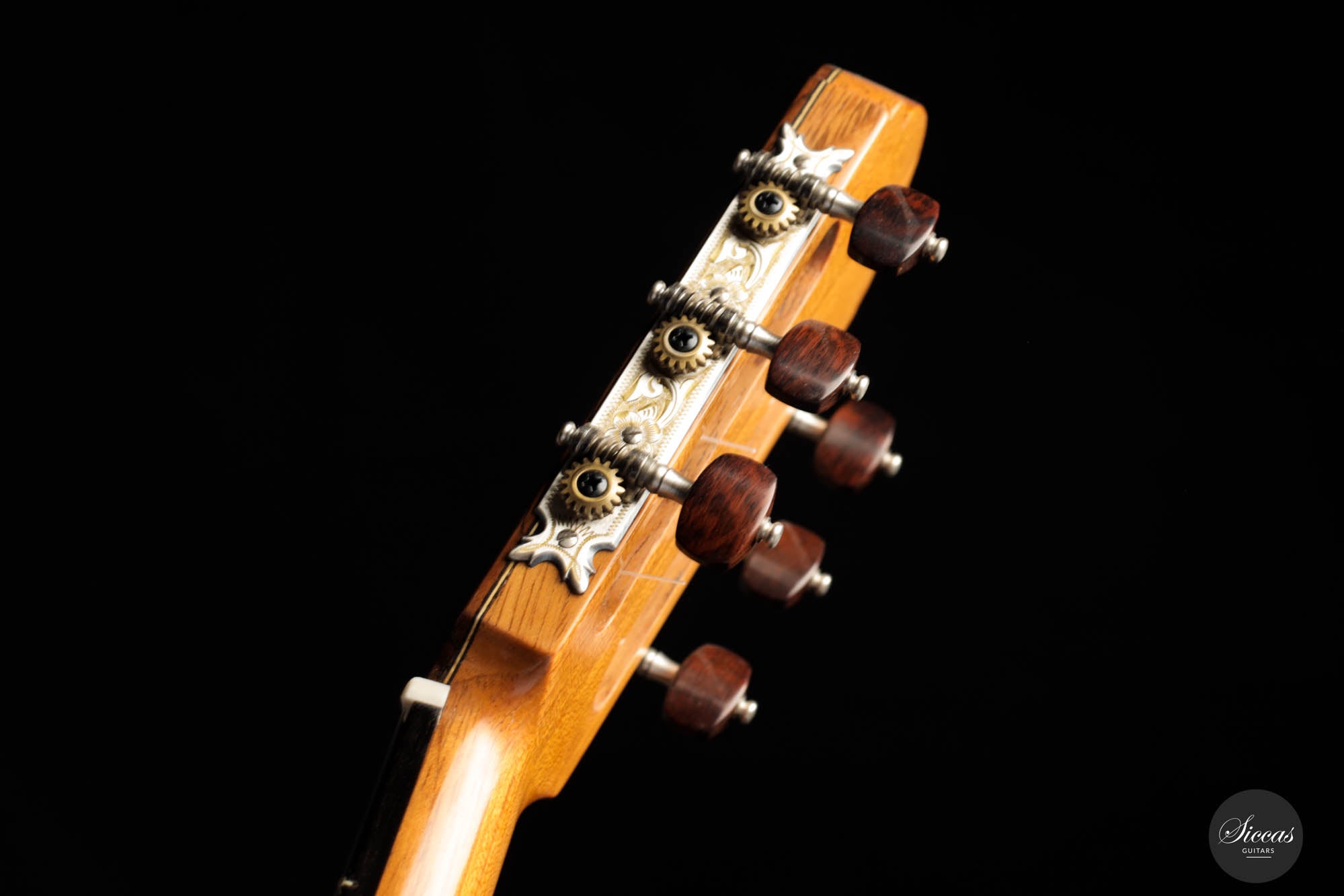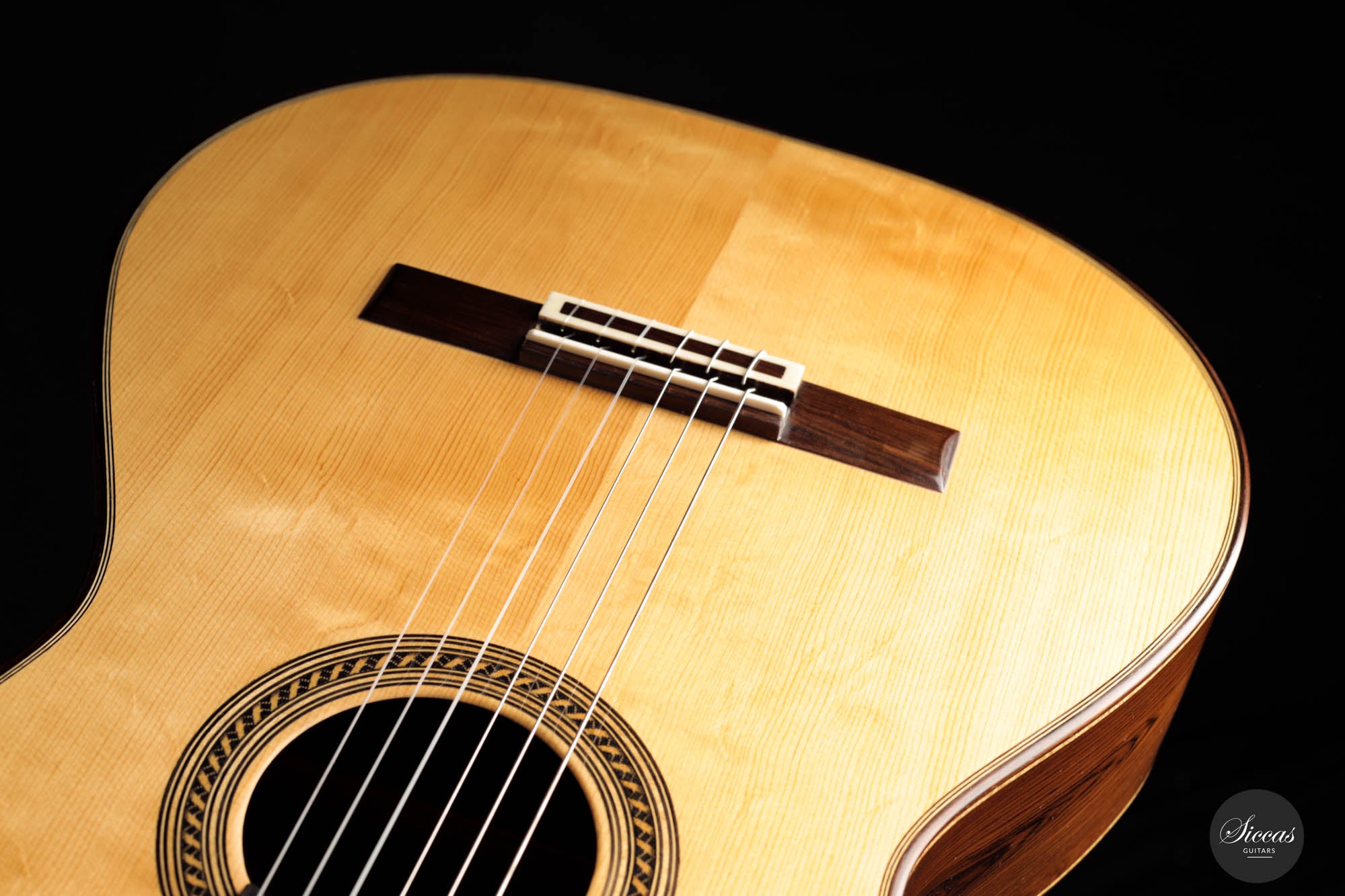 This breathtaking guitar is more than just wood and strings; it's a symphony of history, homage, and unparalleled craftsmanship. The three-lobes head gracefully nods to Torres, while its bear-claw spruce top whispers tales of delicate artistry. The Amazon rosewood, with its mesmerizing patterns, flows across the back and sides, creating a visual concert that's as compelling as its sound. Adorned with top-tier Fustero tuners, its every detail sings of precision.