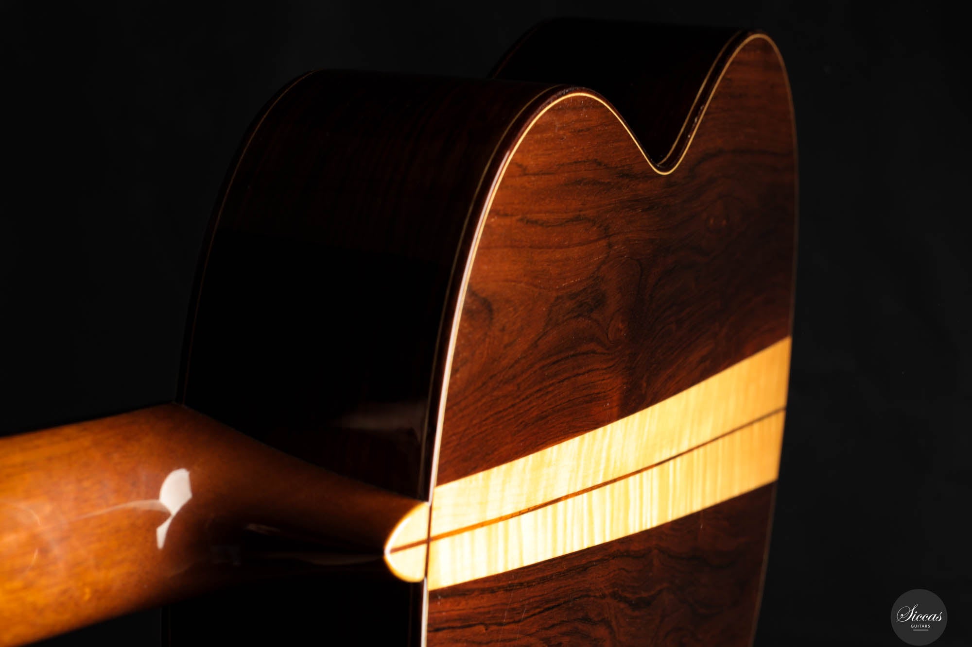 As a pre-loved instrument, this guitar is in very good condition, with no structural issues on the soundboard. The Brazilian rosewood back has one repaired crack, which is quite common with this tonewood and does not affect the acoustic qualities in any way.