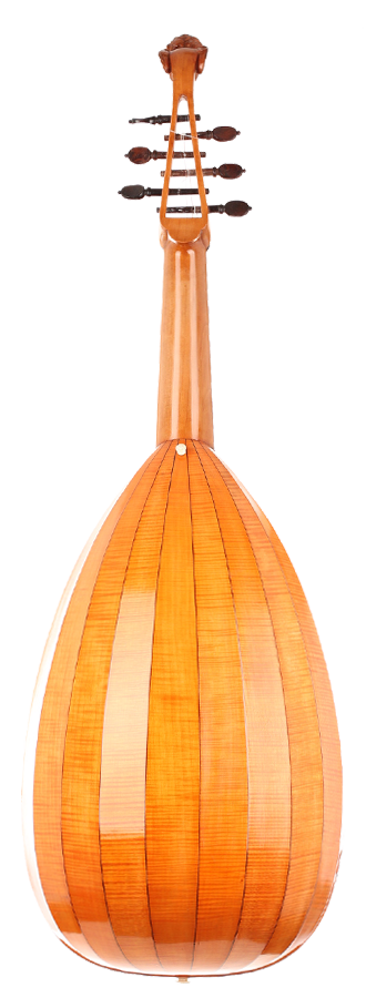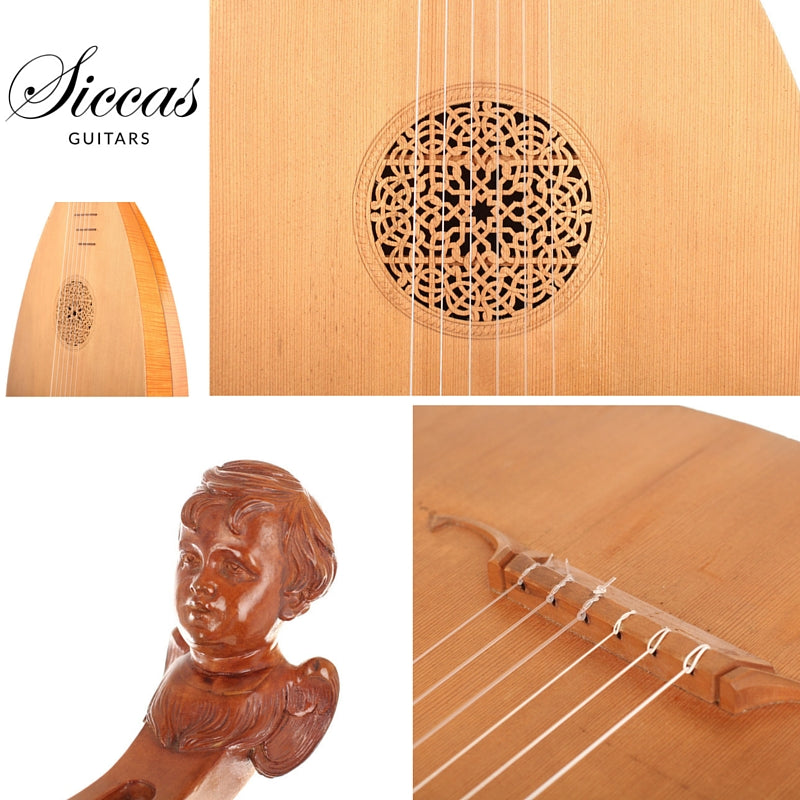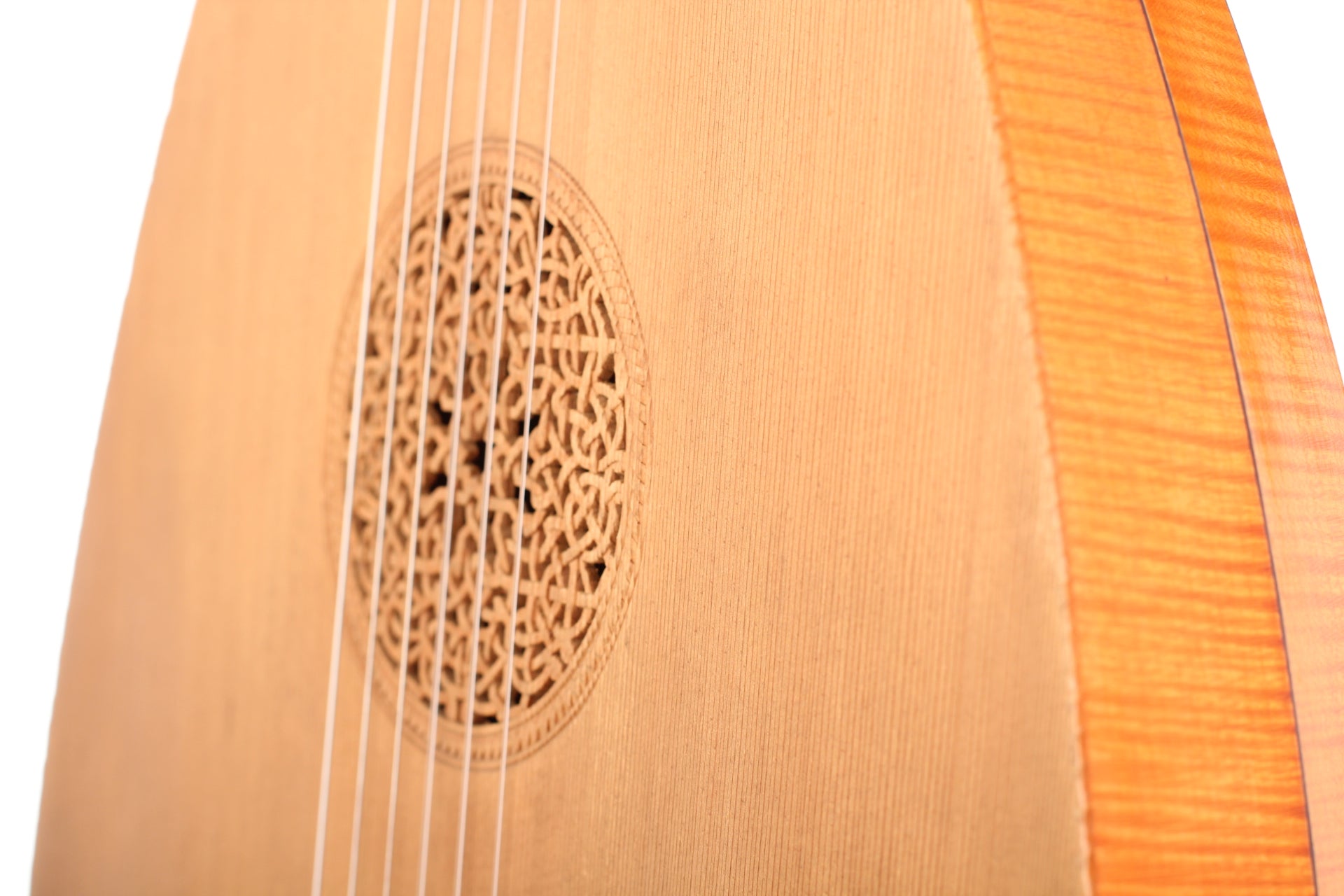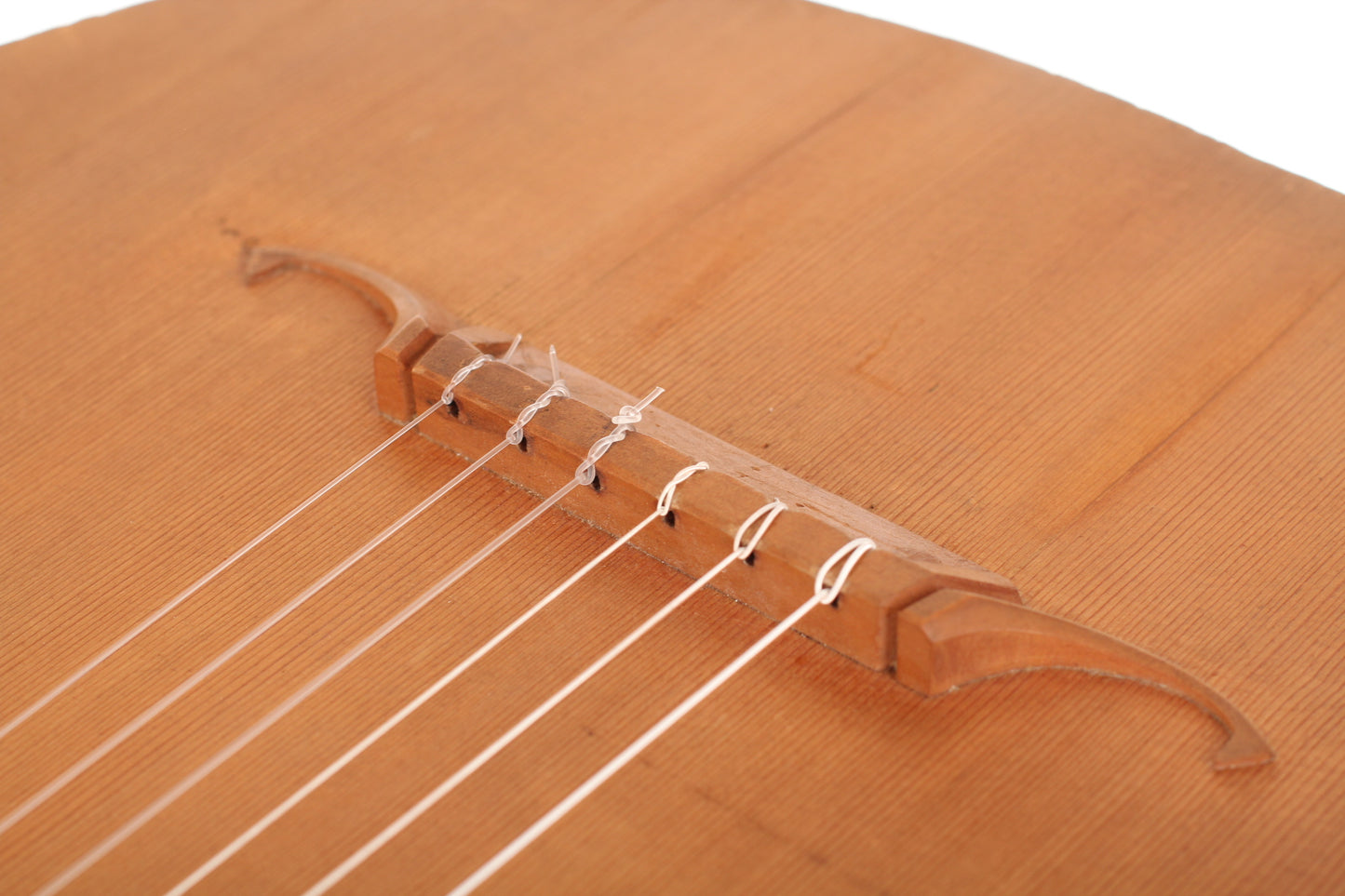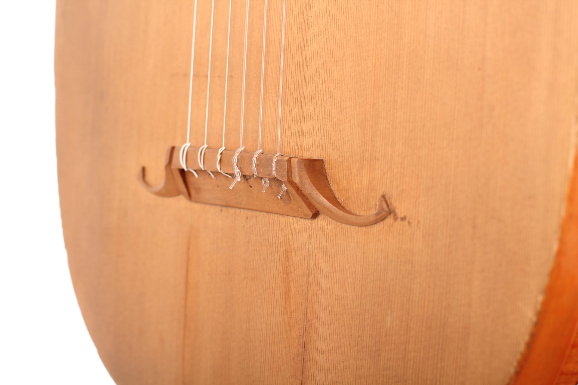 This is a very rare lute that was made in 1913 by Hauser ® I. The top of this lute is made of spruce and the back is made of maple. Overall condition is good, there are only some little marks on the top and two well repaired cracks below the brdige. The original case is included.