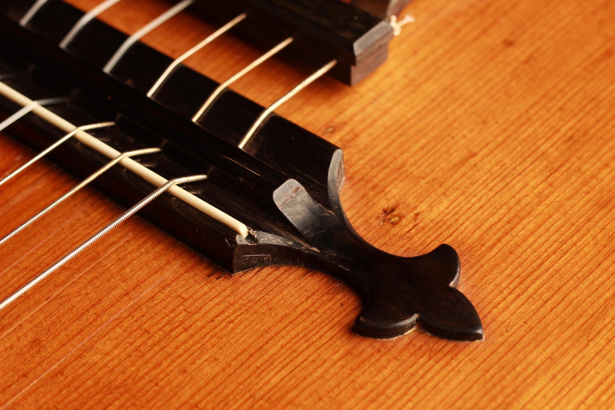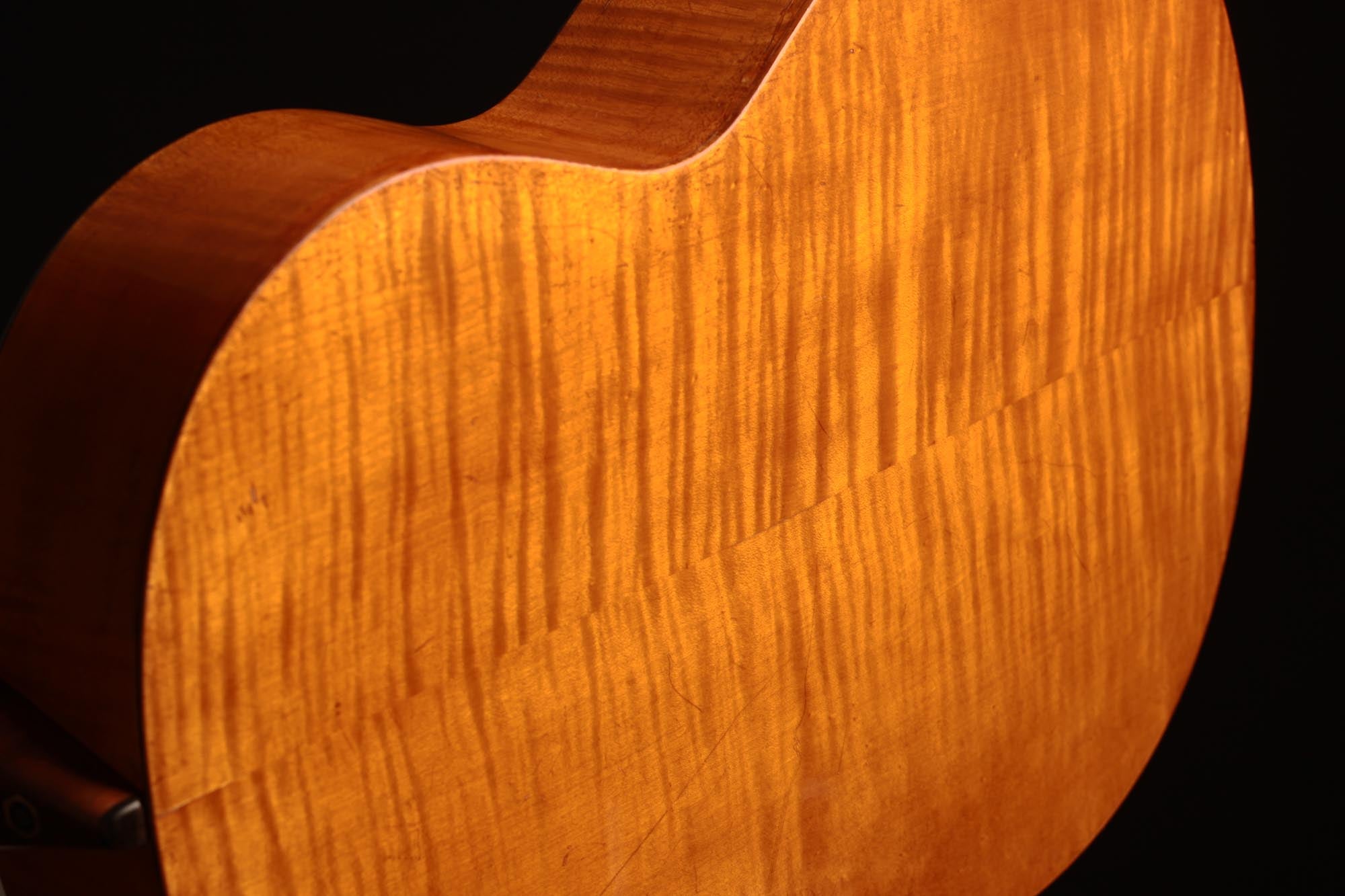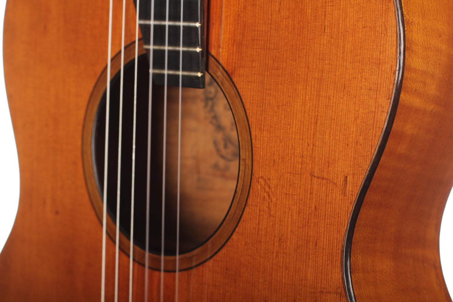 The inboard tuners, made by Landsdorfer, provide comfortable tuning of the instrument. The big body has the measurements of a concert guitar similar to big Spanish concert models. The top is made of German Alpine Spruce, while the back and sides are made of maple. Another feature is the tailpiece. The guitar is in good condition for its age, and has only few repaired and stable cracks on the top. Only minor signs of playing are visible. A hard-shell case is included.