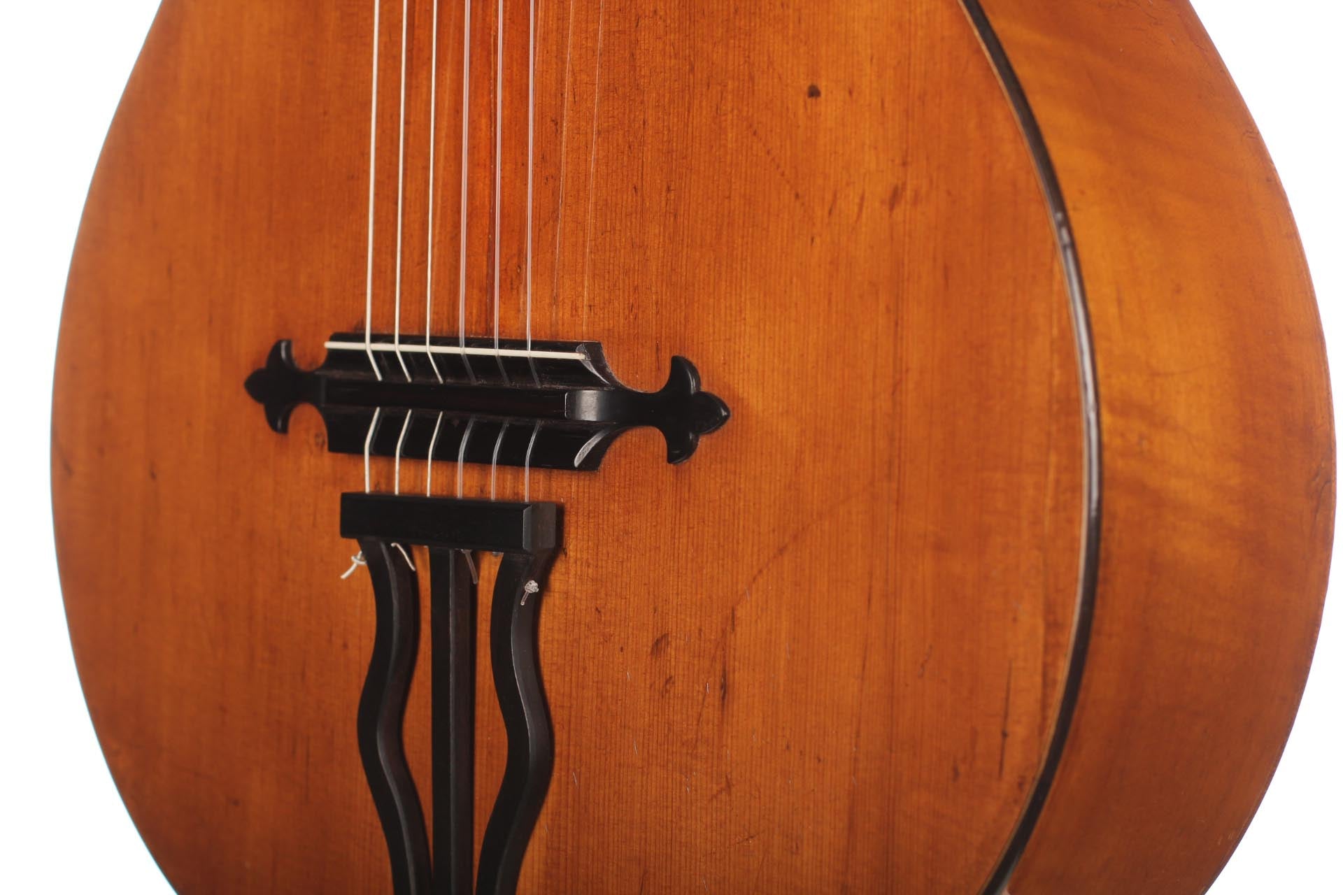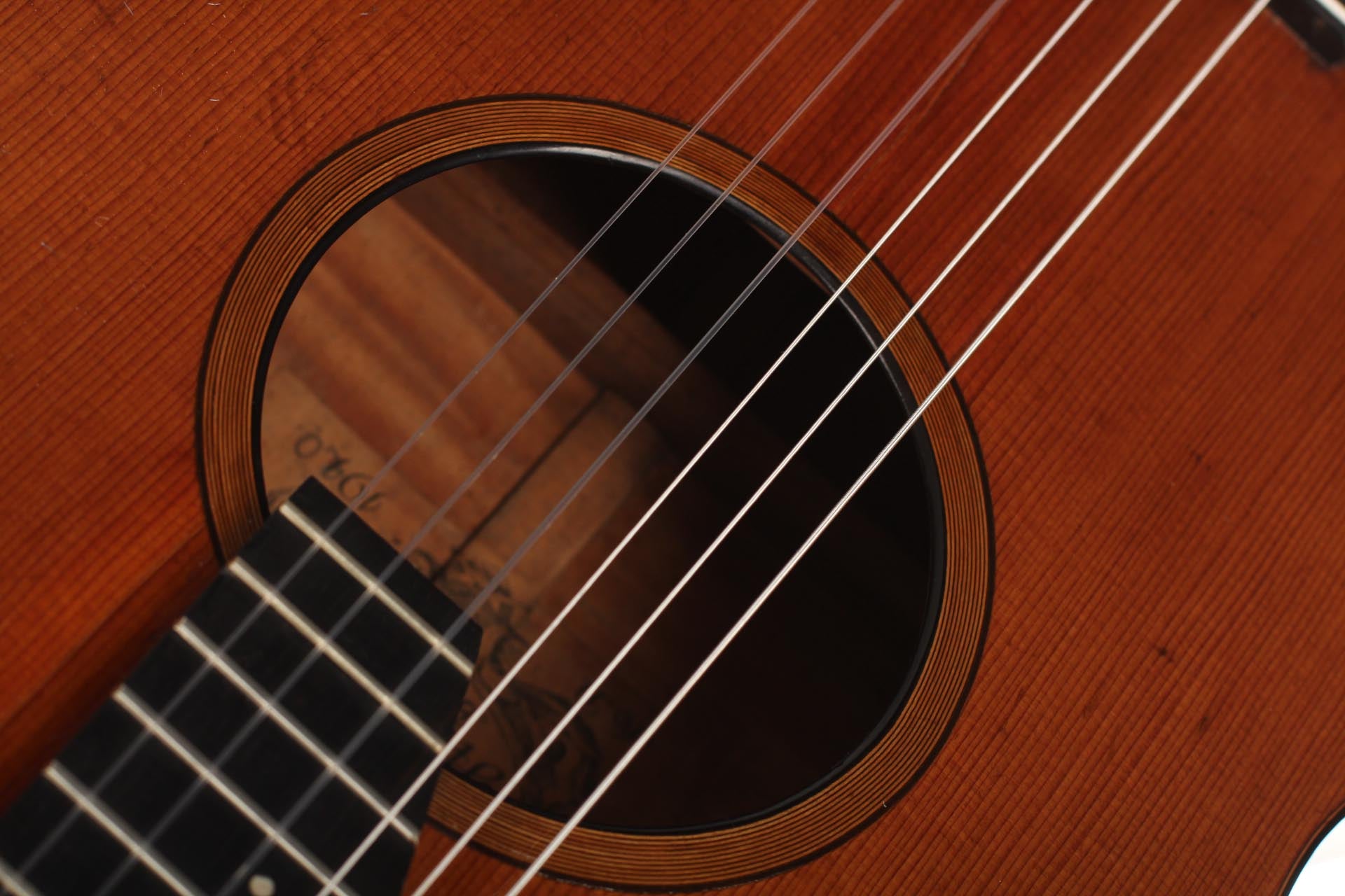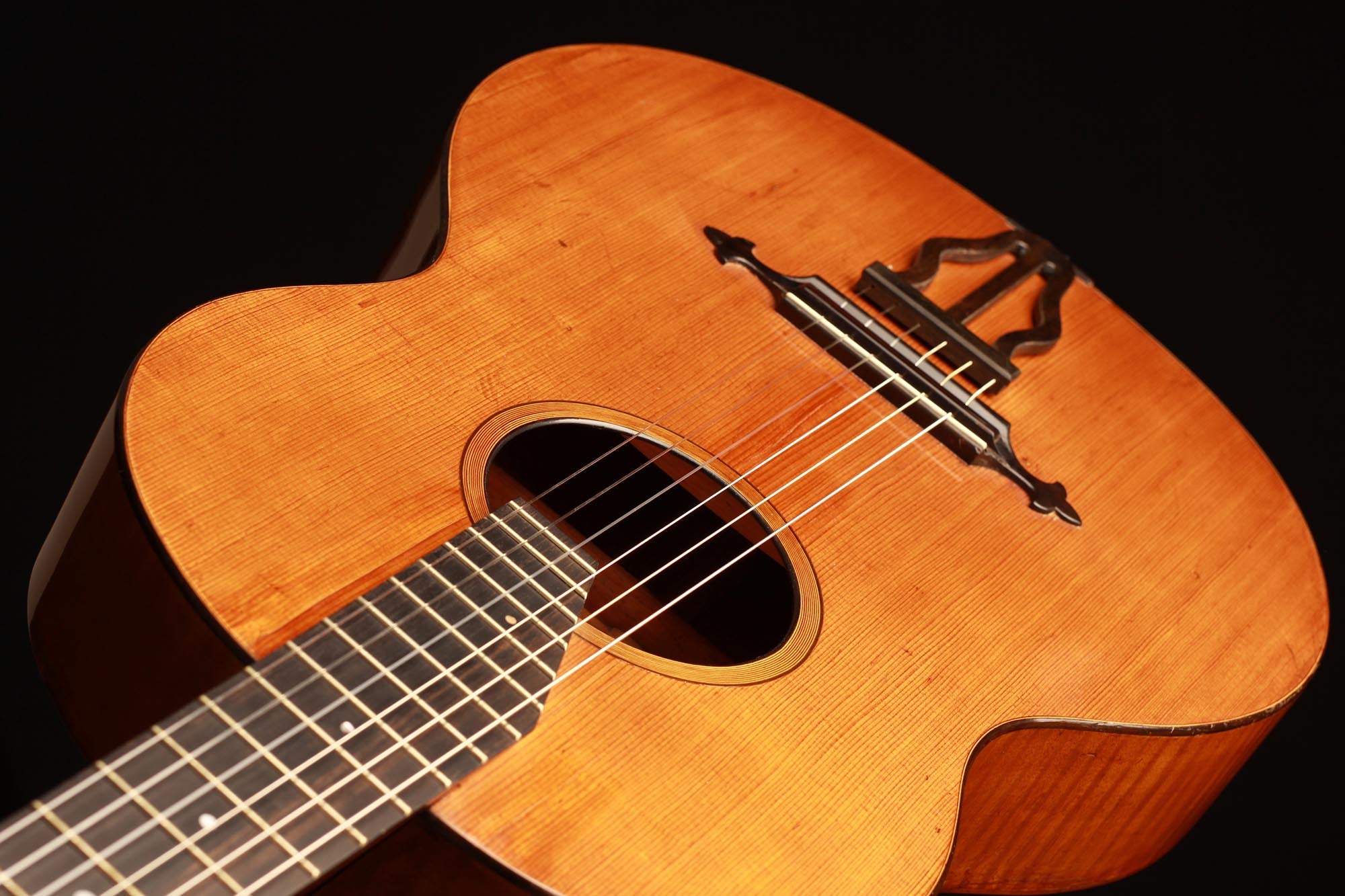 The inboard tuners, made by Landsdorfer, provide comfortable tuning of the instrument. The big body has the measurements of a concert guitar similar to big Spanish concert models. The top is made of German Alpine Spruce, while the back and sides are made of maple. Another feature is the tailpiece. The guitar is in good condition for its age, and has only few repaired and stable cracks on the top. Only minor signs of playing are visible. A hard-shell case is included.