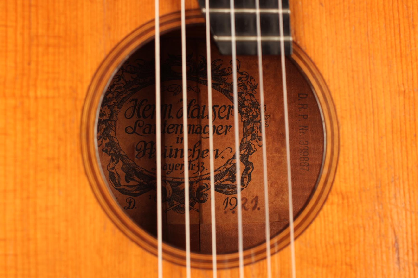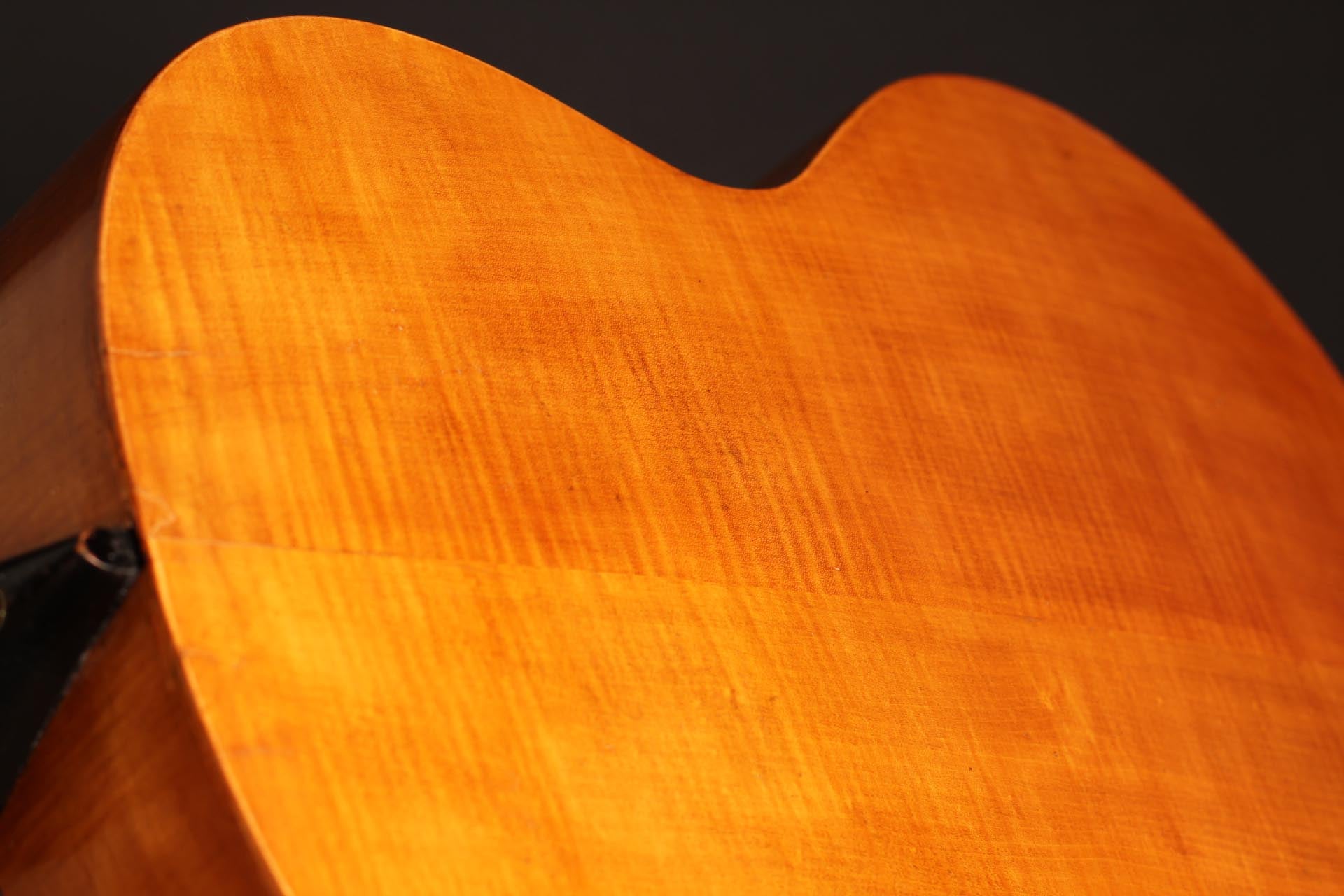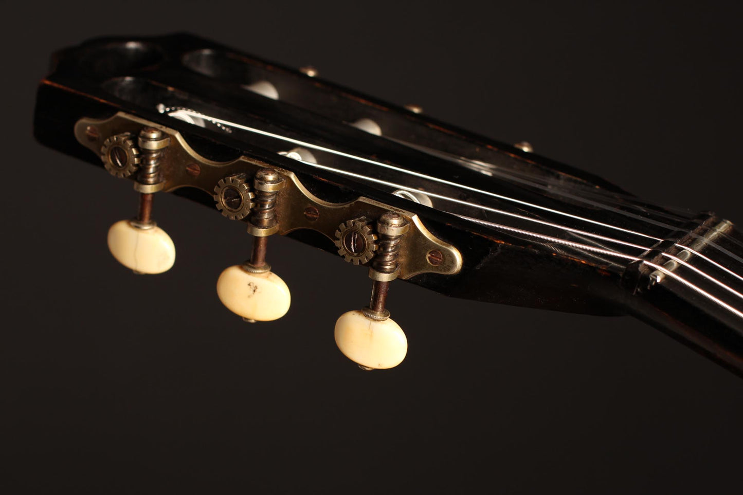 This guitar was built in 1921, it is a rare romantic model with a Patented top (D.R.P. Nr.339867). This guitar is in great condition. It is wearing its original Landstorfer tuning machines, has immaculate back and sides and a few well repaired cracks on the top. This guitar sounds marvellously good and has a crystal-clear tone. The transparency and clearness in the harmonies are striking. This guitar has an adjustable neck and is perfectly setup. It is very easy to play, especially for the left hand, what is a great quality for an instrument of this age.